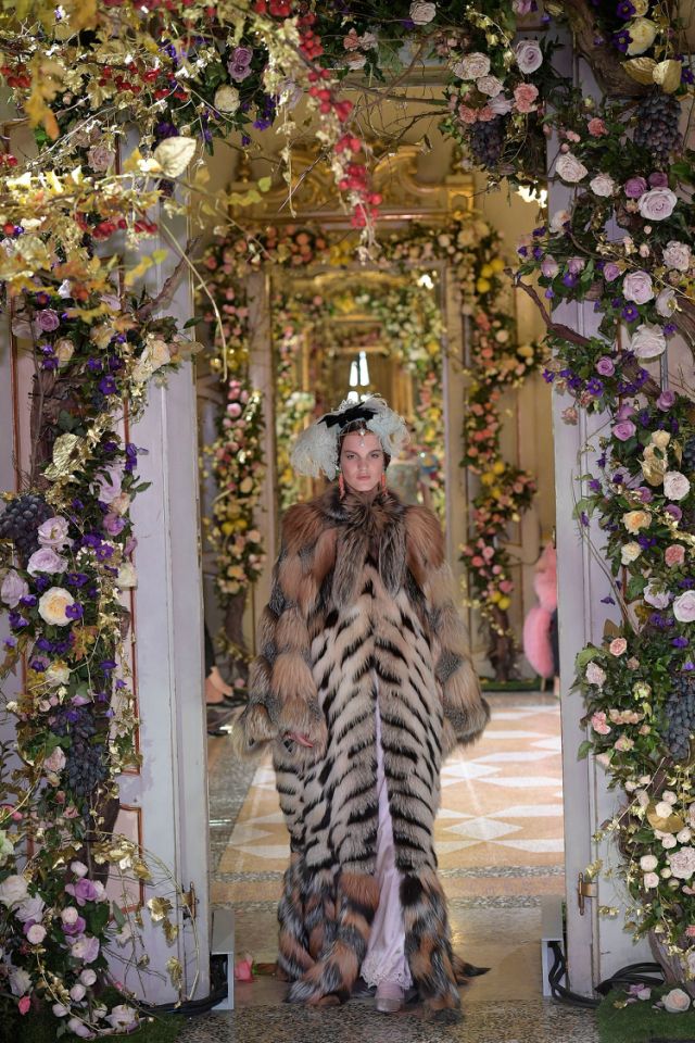 Девушки выходили в роскошный зал с зеркальными панелями в пышных платьях, декорированных вышивкой, жемчугом и кружевами, в головных уборах итальянских купцов и вельмож, с картинами в золоченых рамах в прическах и в качестве аксессуаров. Одна из моделей вышла на подиум в платье из меха, на котором воспроизведено полотно Доменико Гирландайо "Портрет Джованны Торнабуони", а "Три грации" Рафаэля украсили шелковое платье в пол.