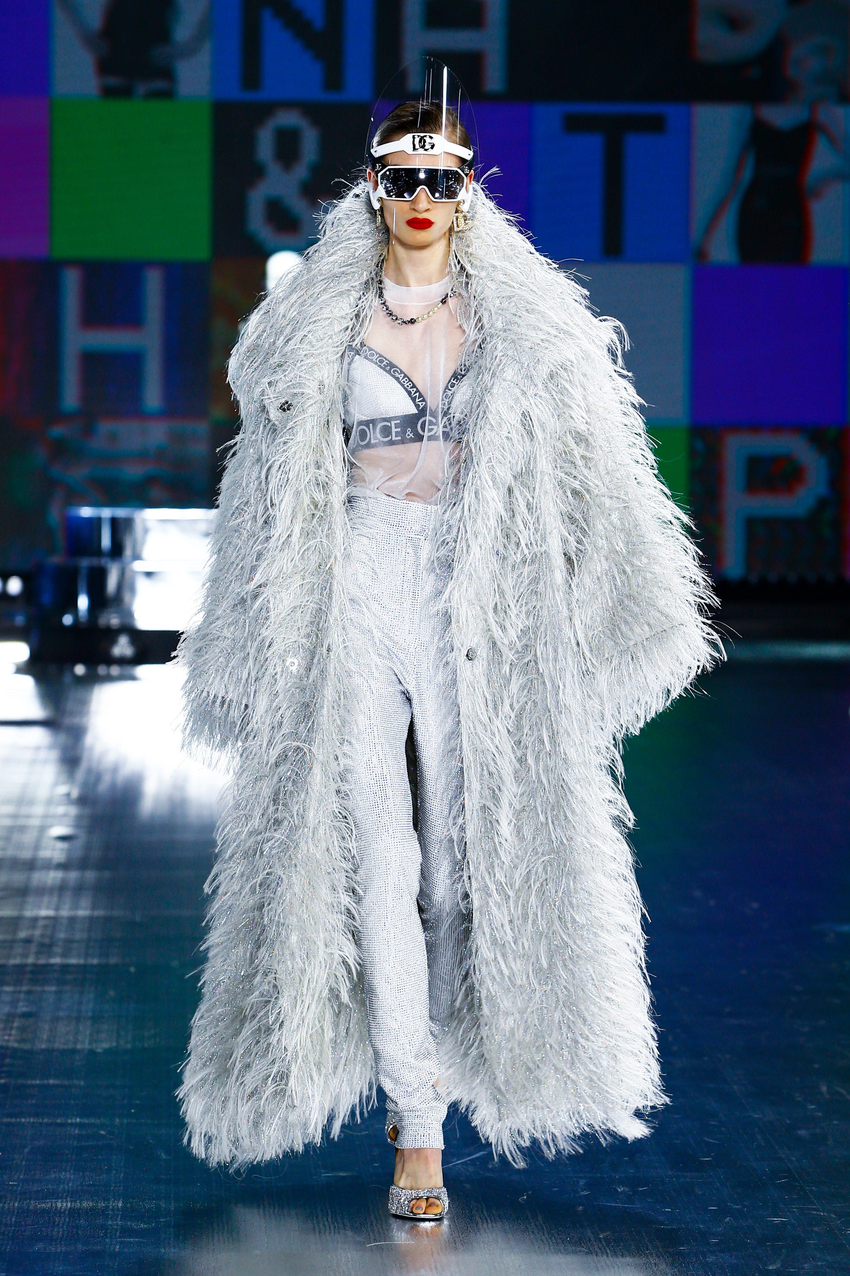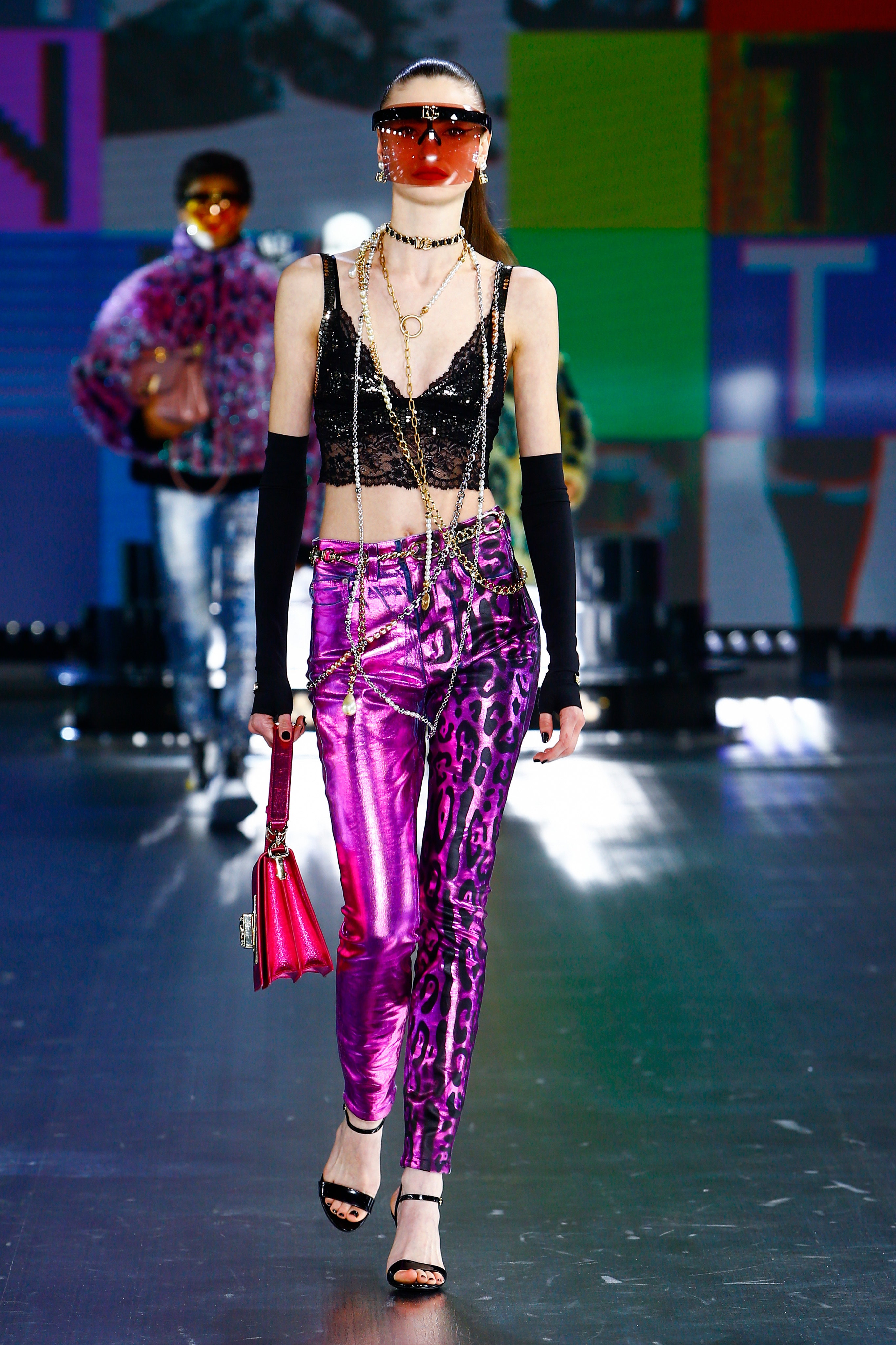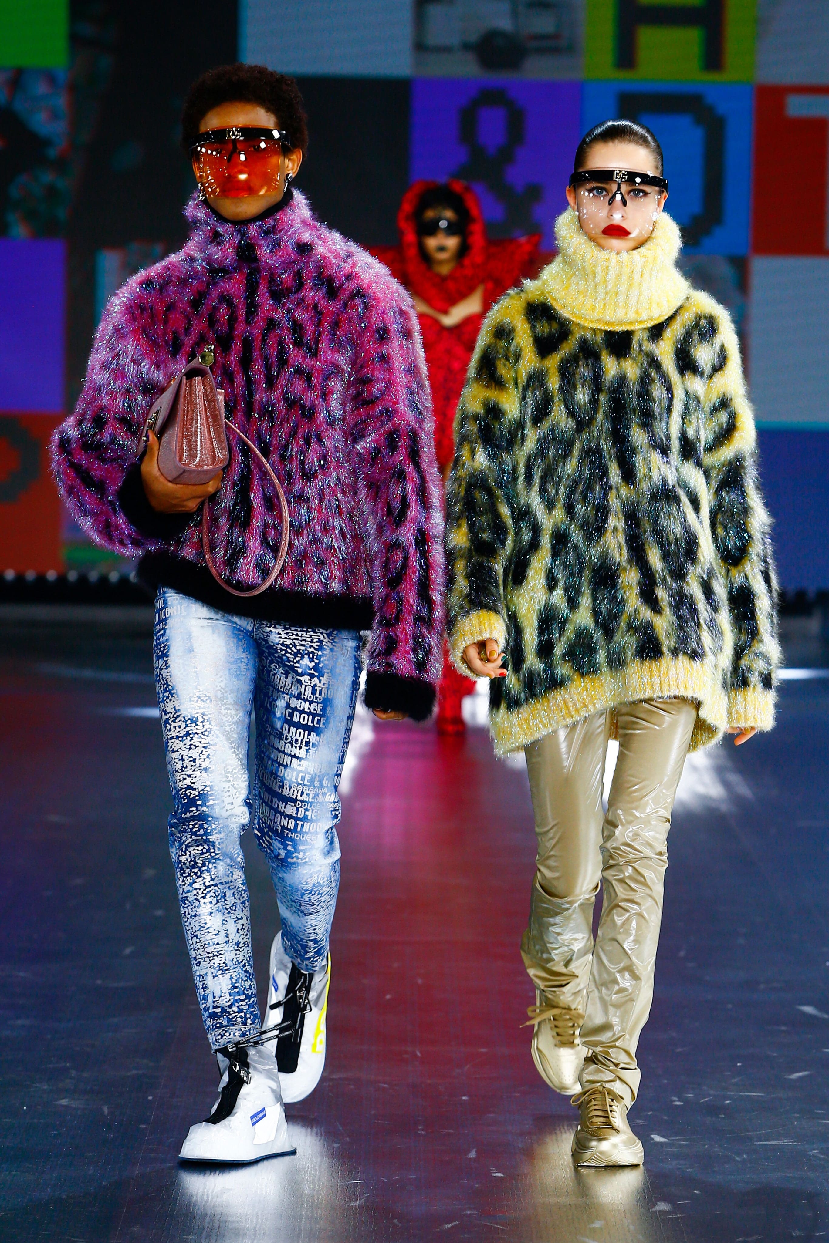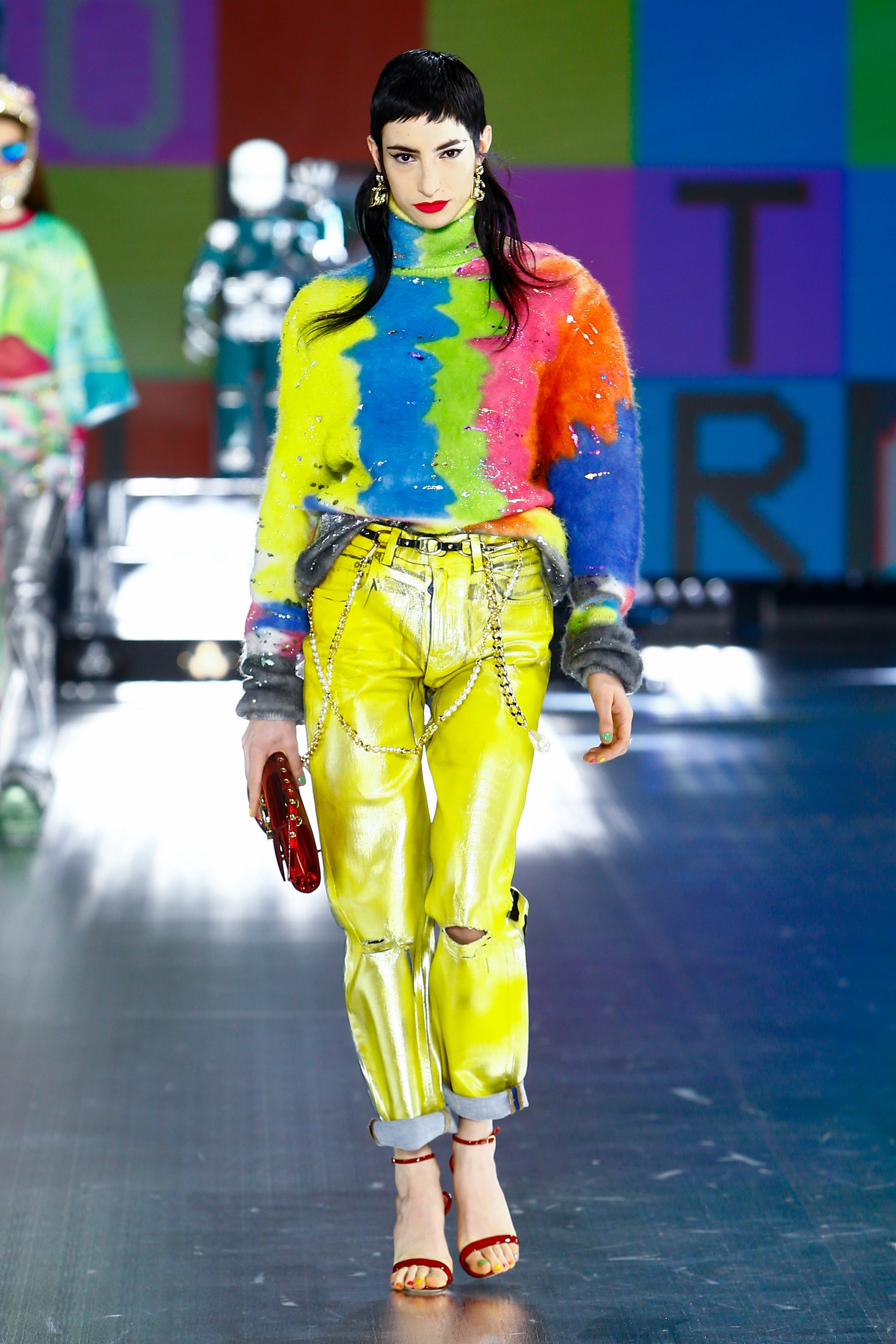 В новой реальности Dolce & Gabbana, которая многих поразила, элементы хип-хопа сплетаются со стилями гранж и панк, а привычный для модного дома гламур становится кислотным. В неоновых брючных костюмах, пестрых шубах и сияющих платьях с острыми плечами могли бы ходить персонажи произведений Филипа Дика — прародителя жанра киберпанк. Вместе с моделями на подиуме также показались роботы-модники, увешанные сумками и брелоками с фирменными логотипами бренда.