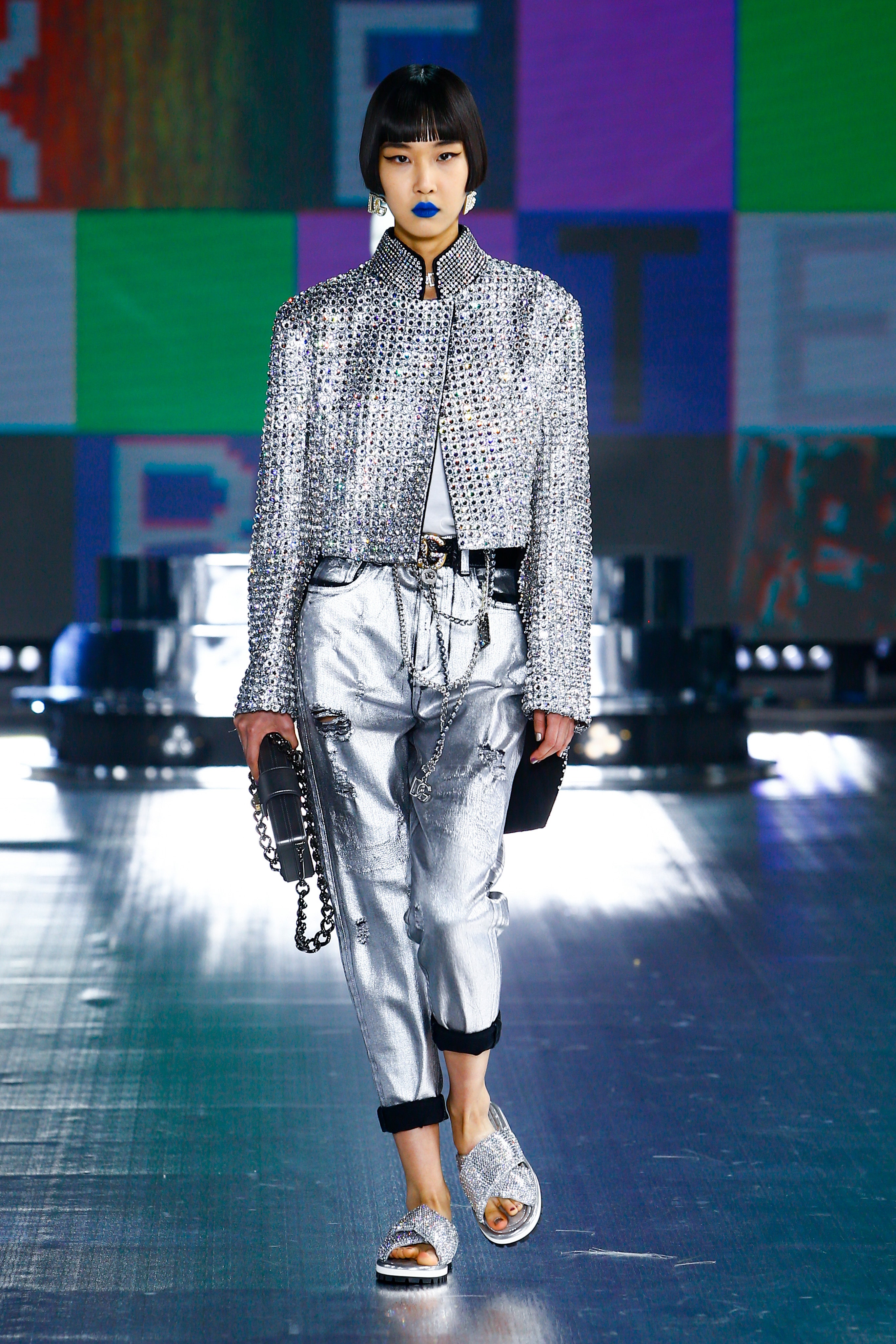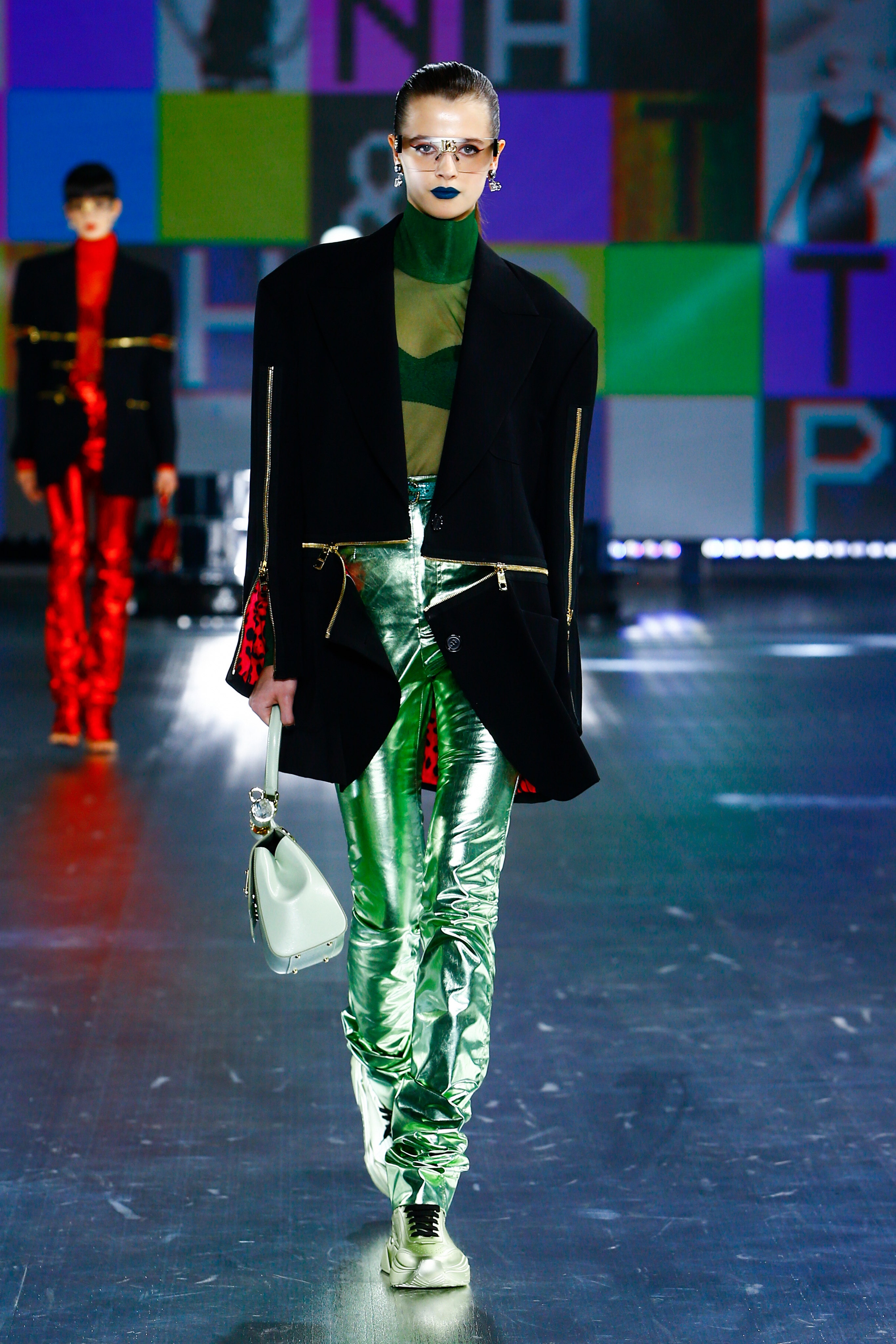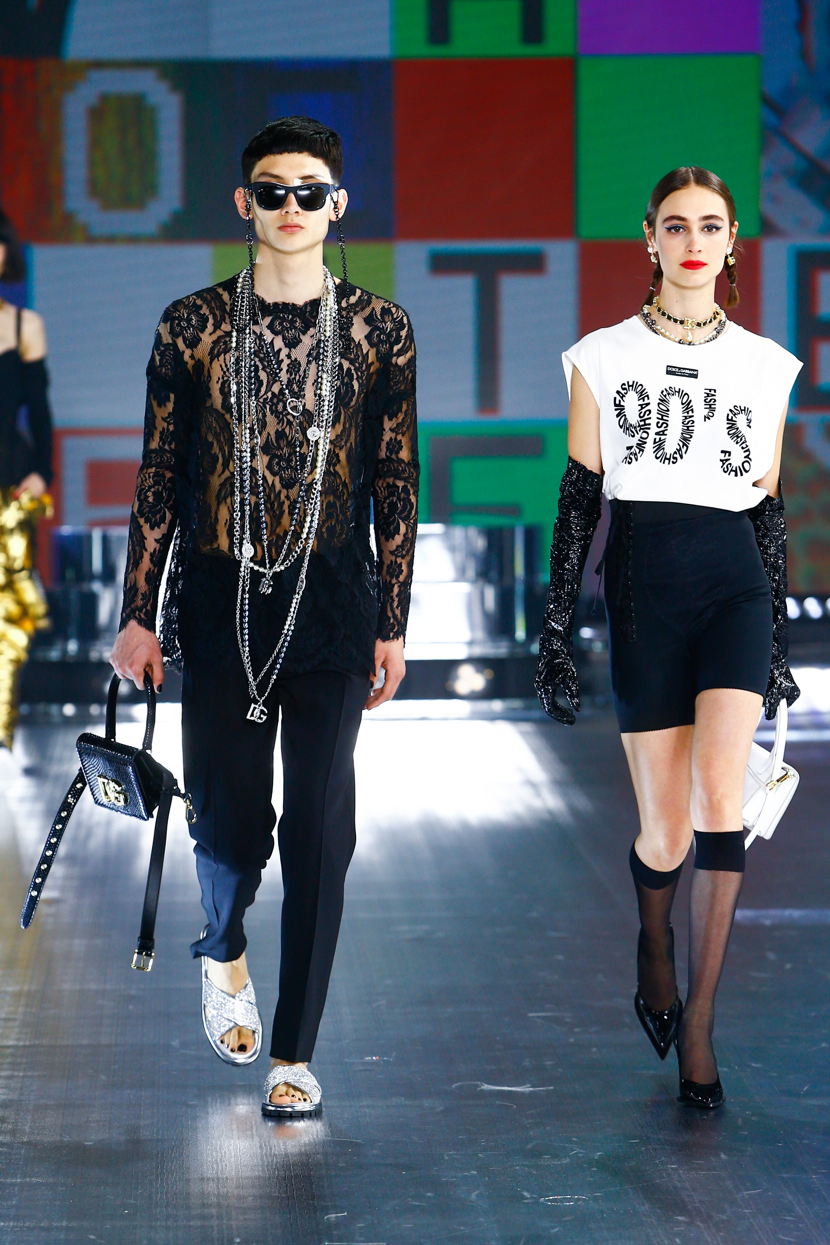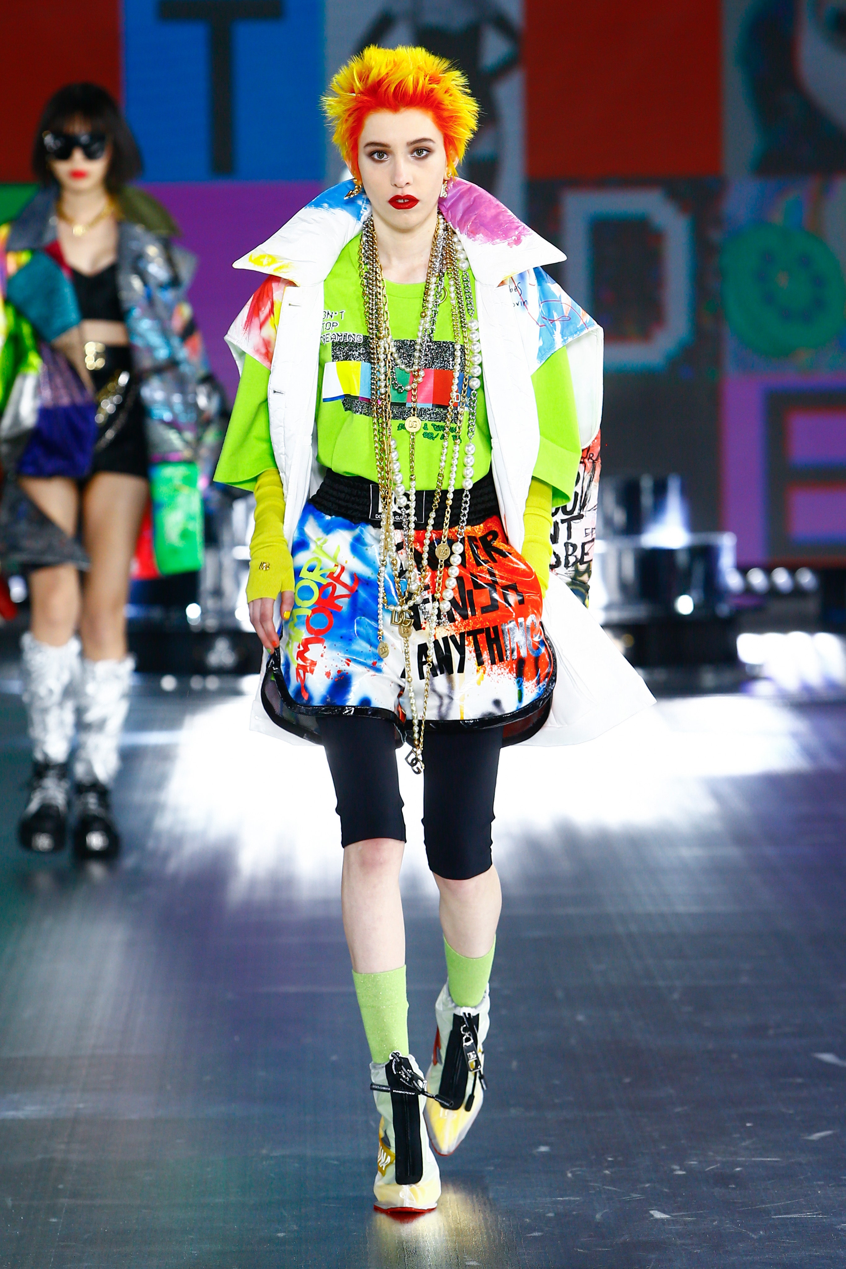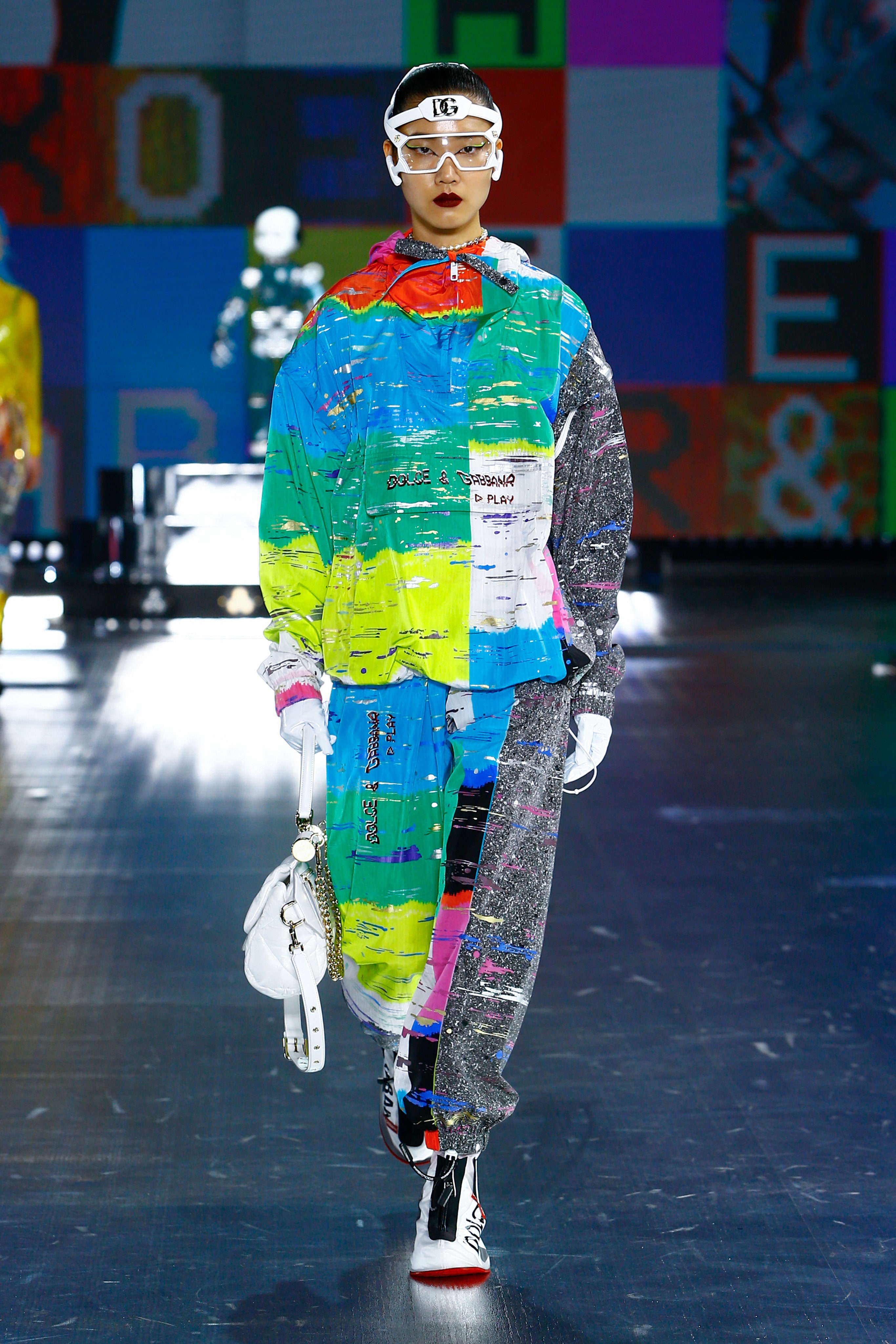 В новой реальности Dolce & Gabbana, которая многих поразила, элементы хип-хопа сплетаются со стилями гранж и панк, а привычный для модного дома гламур становится кислотным. В неоновых брючных костюмах, пестрых шубах и сияющих платьях с острыми плечами могли бы ходить персонажи произведений Филипа Дика — прародителя жанра киберпанк. Вместе с моделями на подиуме также показались роботы-модники, увешанные сумками и брелоками с фирменными логотипами бренда.