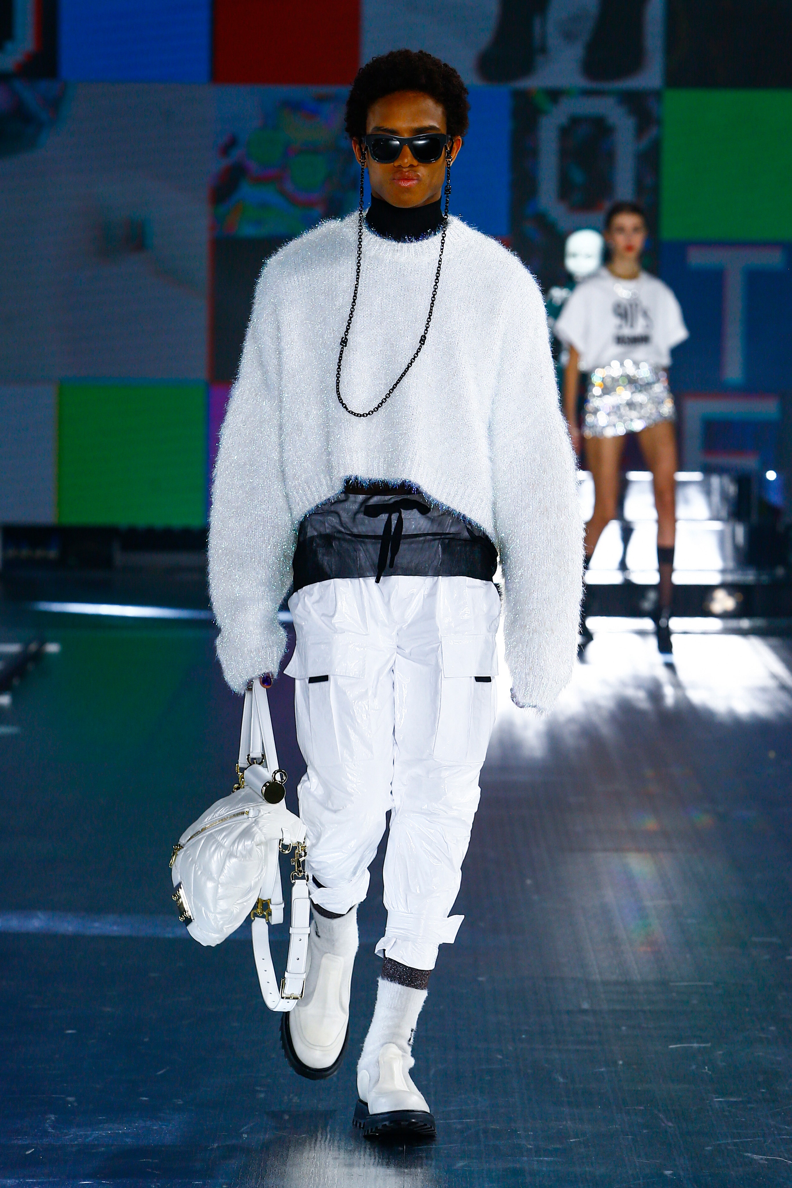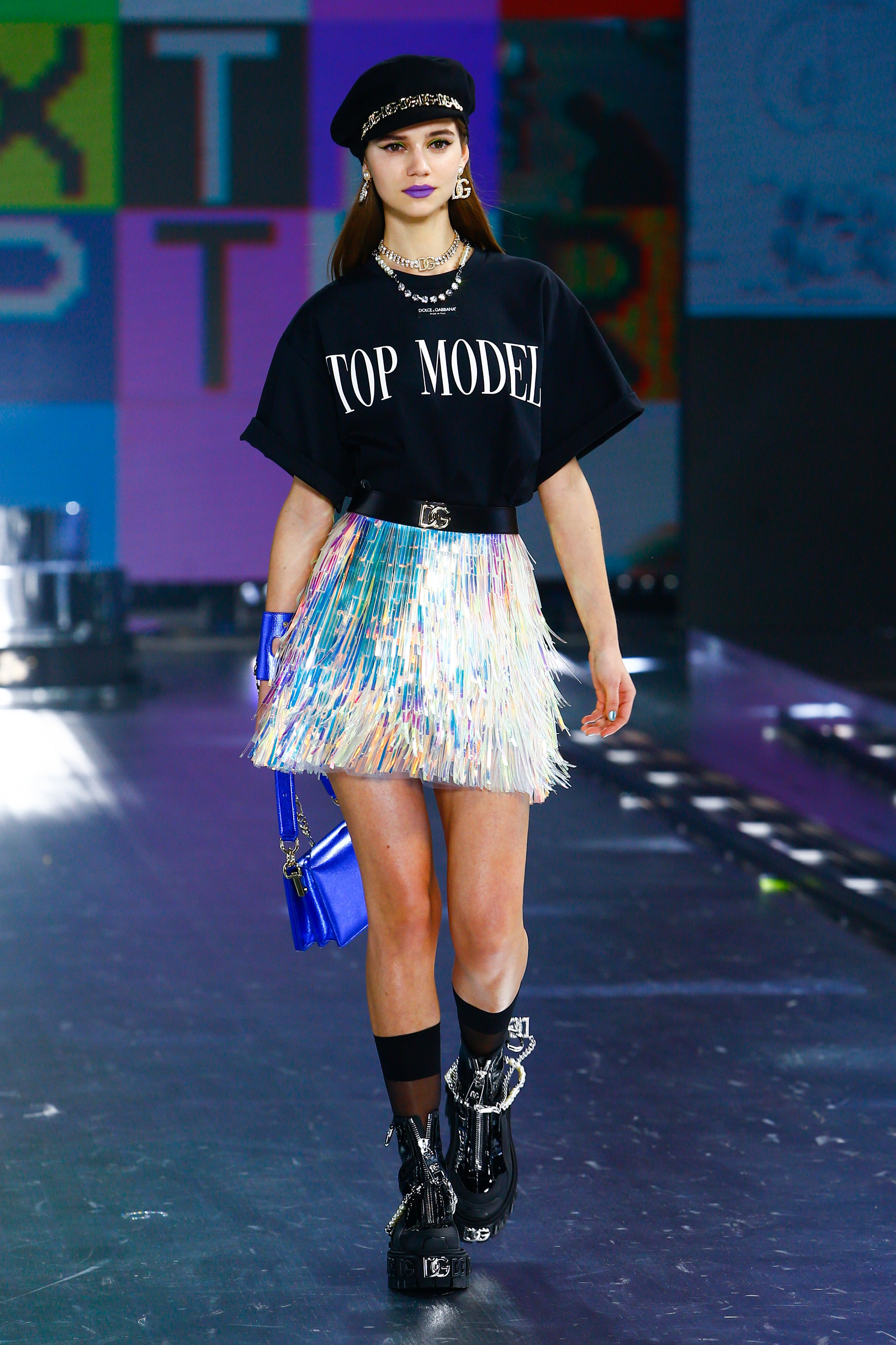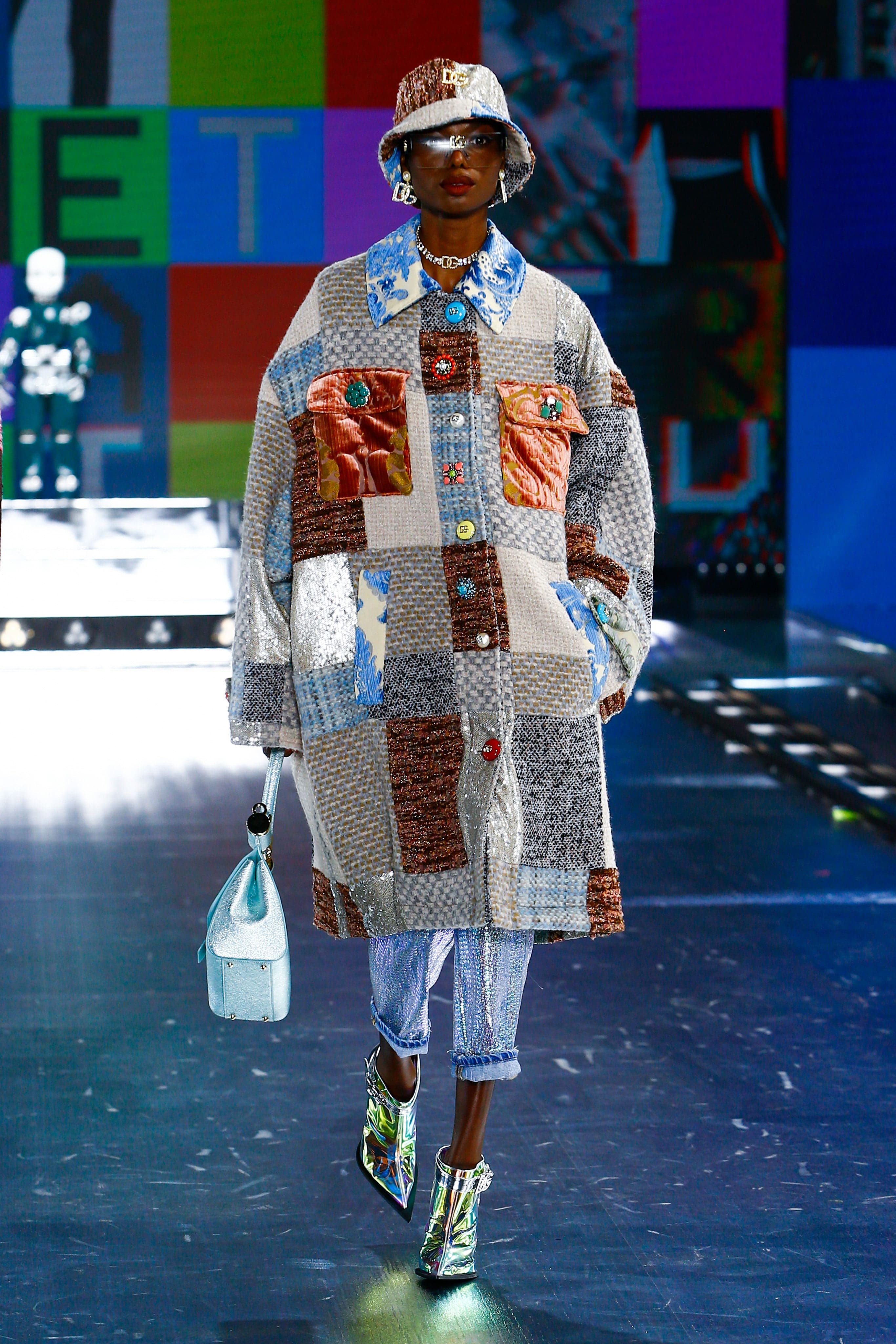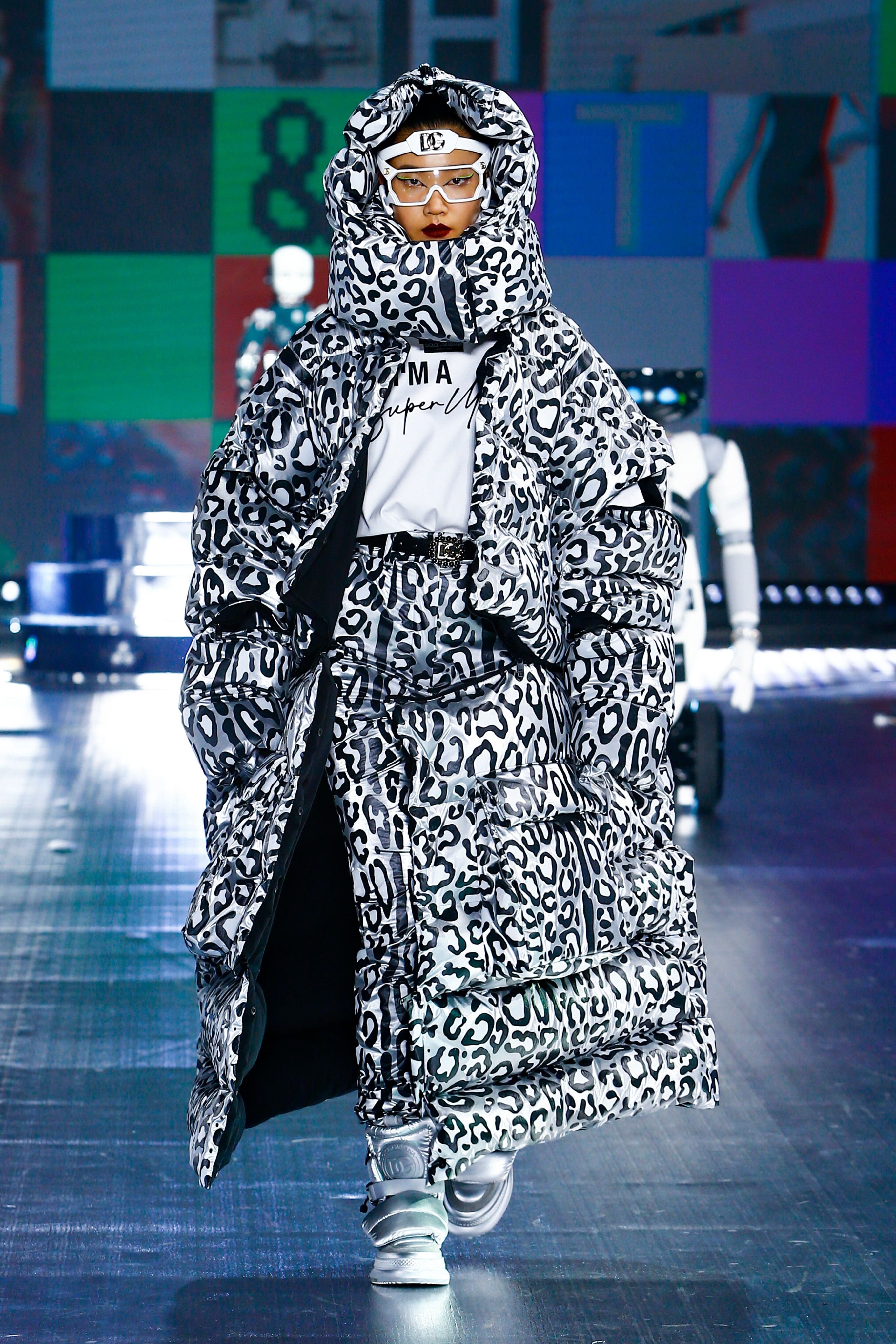 В новой реальности Dolce & Gabbana, которая многих поразила, элементы хип-хопа сплетаются со стилями гранж и панк, а привычный для модного дома гламур становится кислотным. В неоновых брючных костюмах, пестрых шубах и сияющих платьях с острыми плечами могли бы ходить персонажи произведений Филипа Дика — прародителя жанра киберпанк. Вместе с моделями на подиуме также показались роботы-модники, увешанные сумками и брелоками с фирменными логотипами бренда.