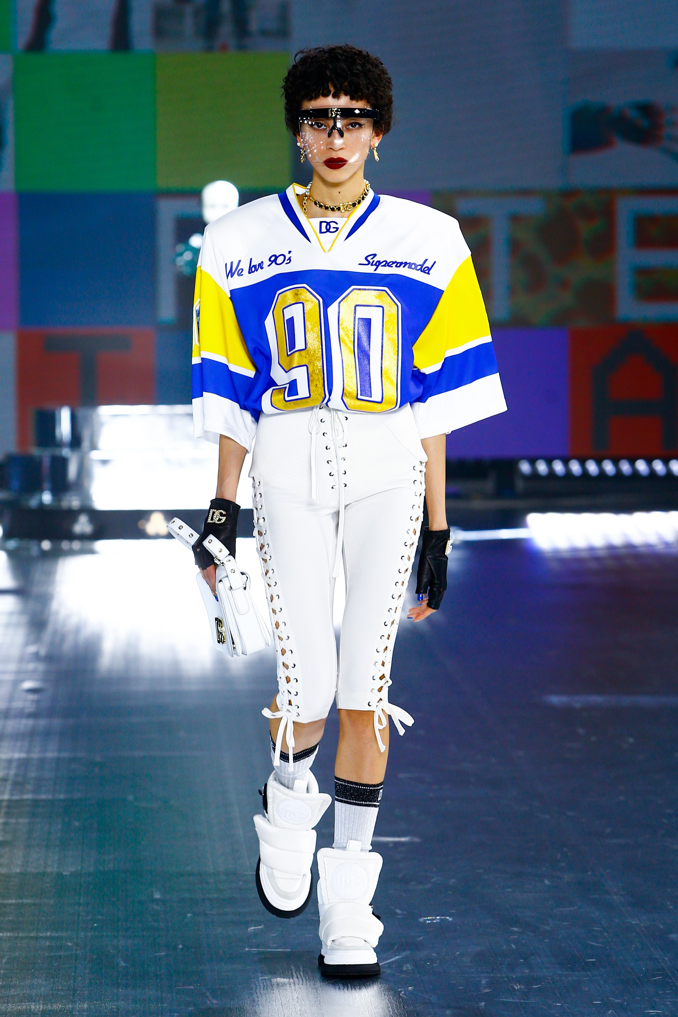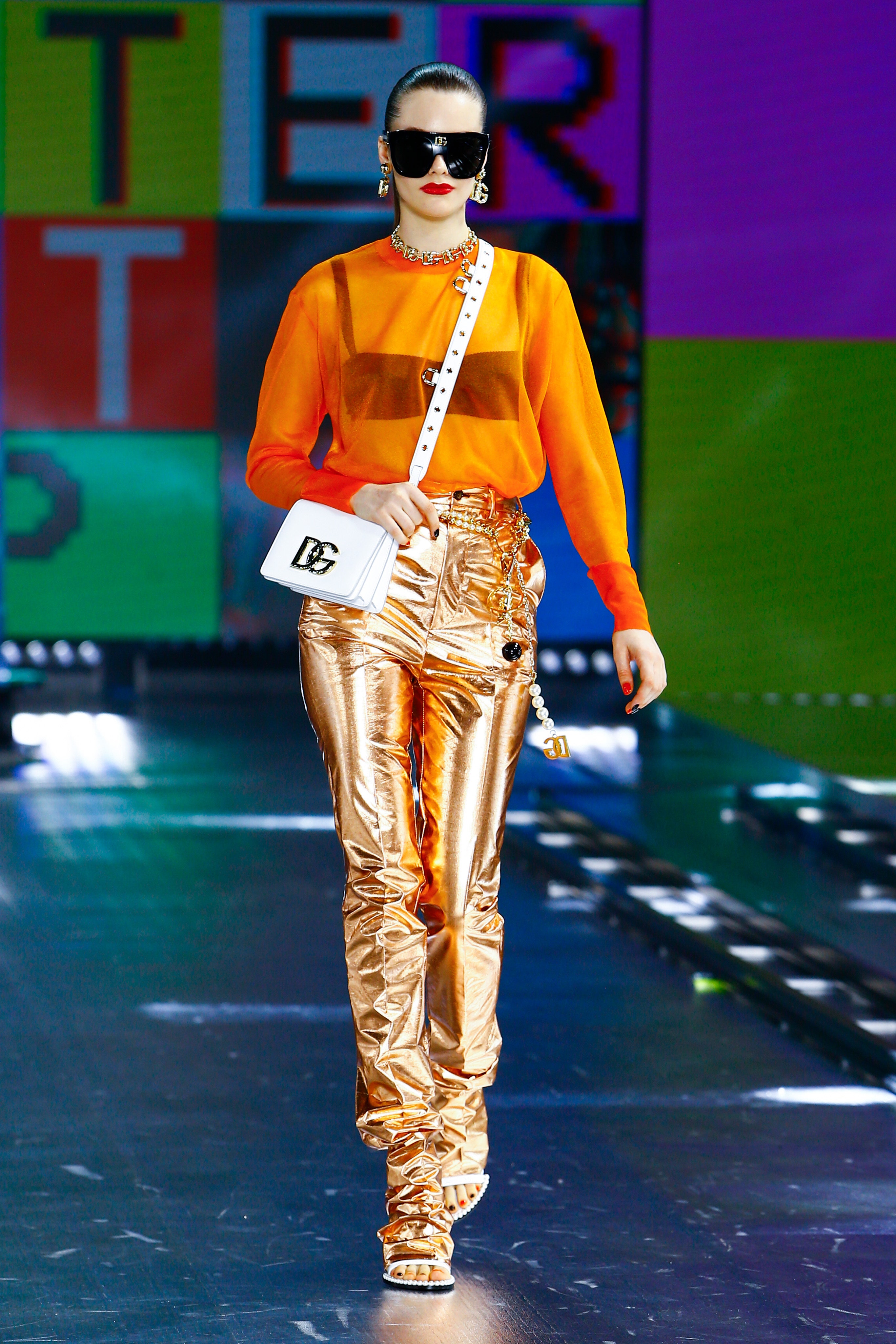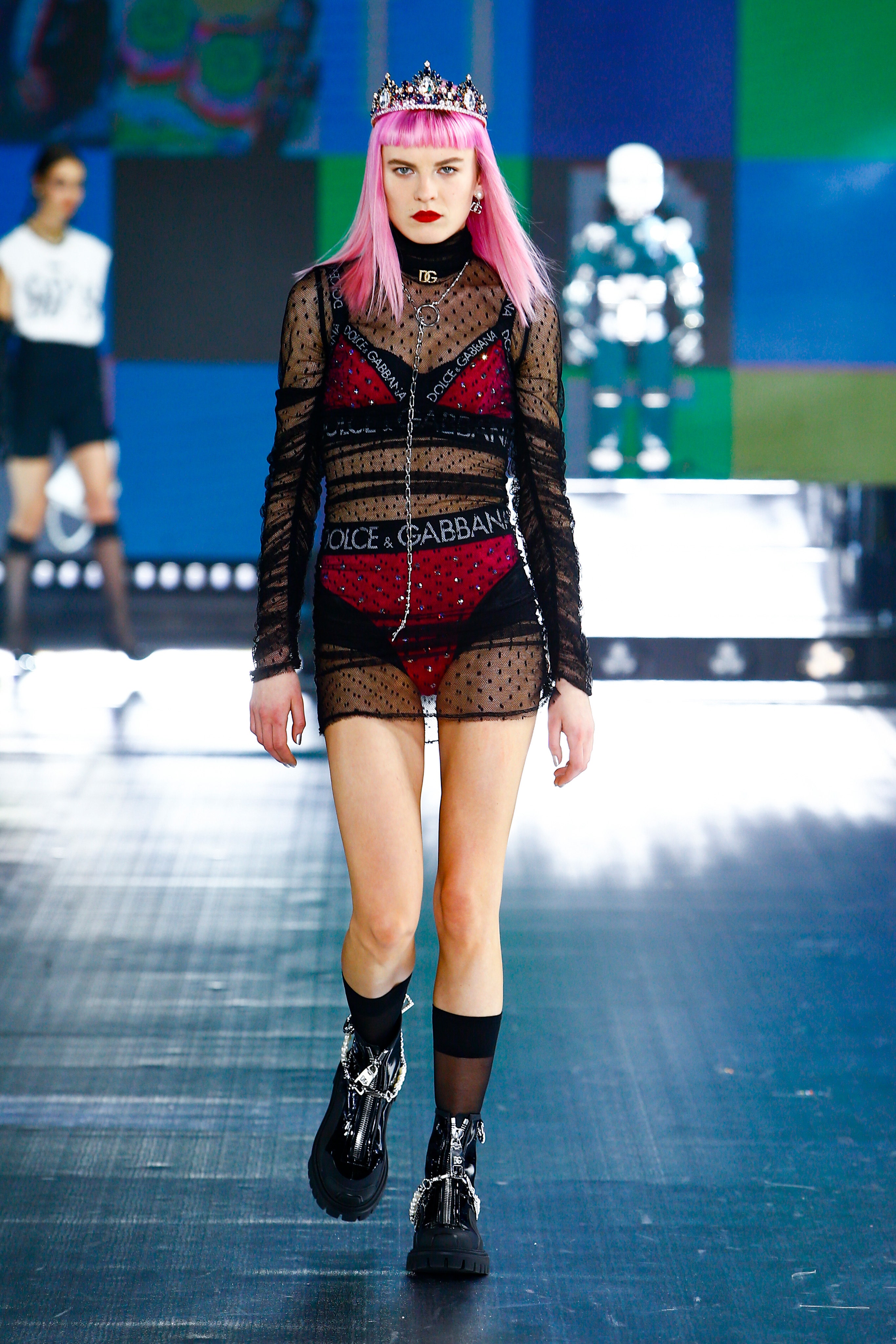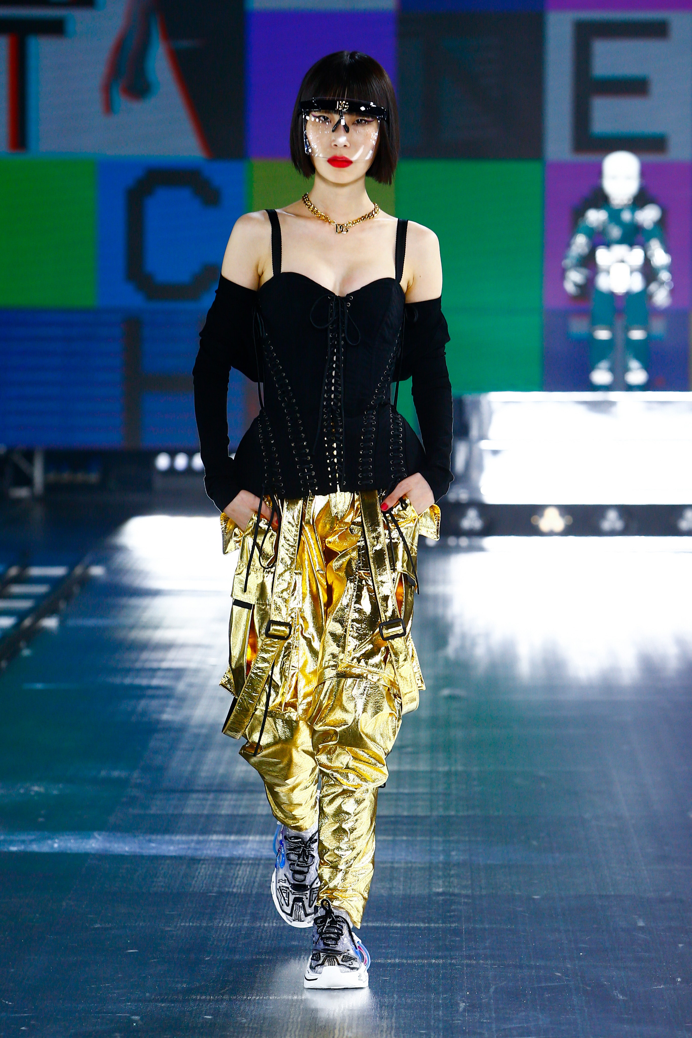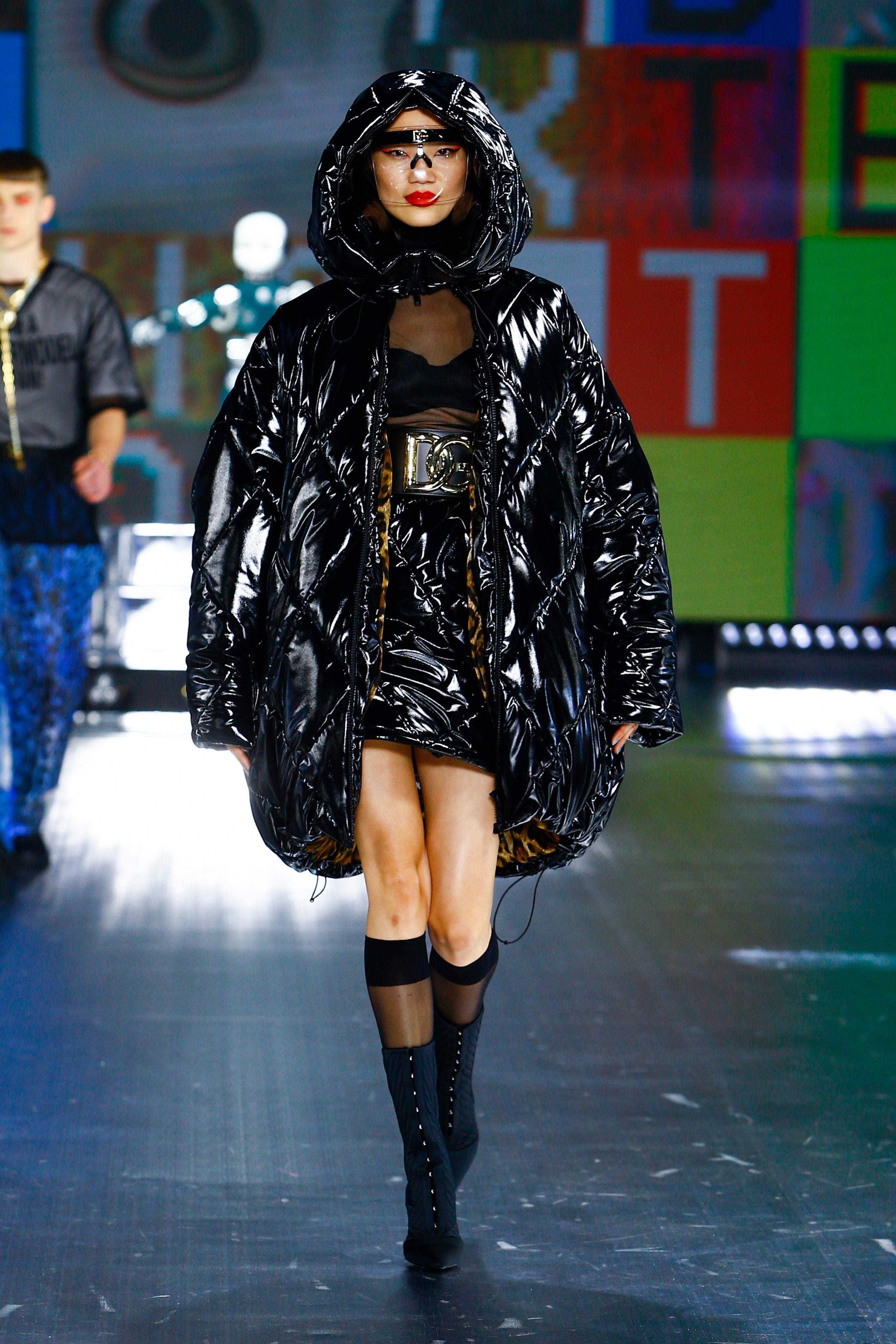 Дизайнеры перебрали архивы бренда и достали на поверхность кое-что из 90-х и 2000-х, как, например, бронированные бра. Также коллекция наполнена вещами спортивного кроя и радужной "киберрасцветки". Для будущей осени и возможной жизни в виртуальной реальности Доменико и Стефано приготовили блестящие сапоги-луноходы, переливистые платья, дождевики из ПВХ-пластика, костюмы с глянцевыми принтами и пластиковые прозрачные маски для лица.