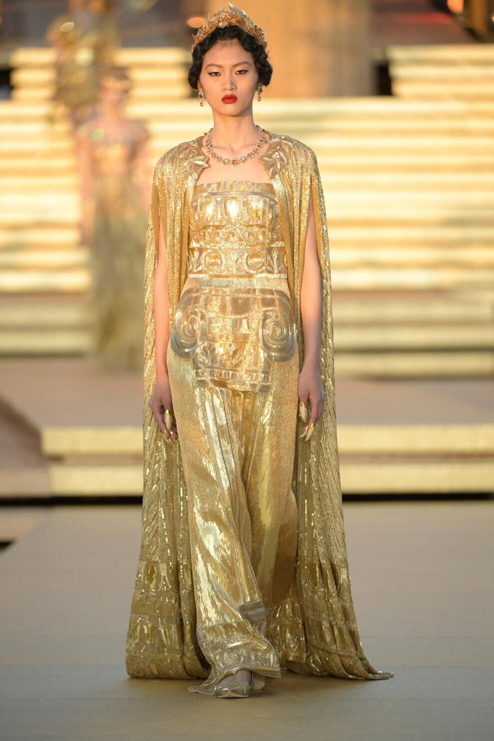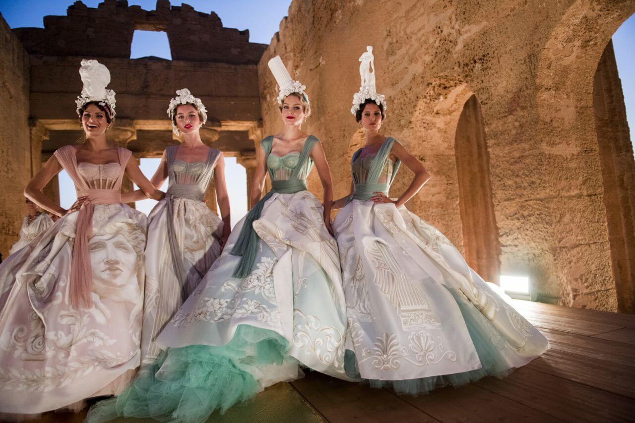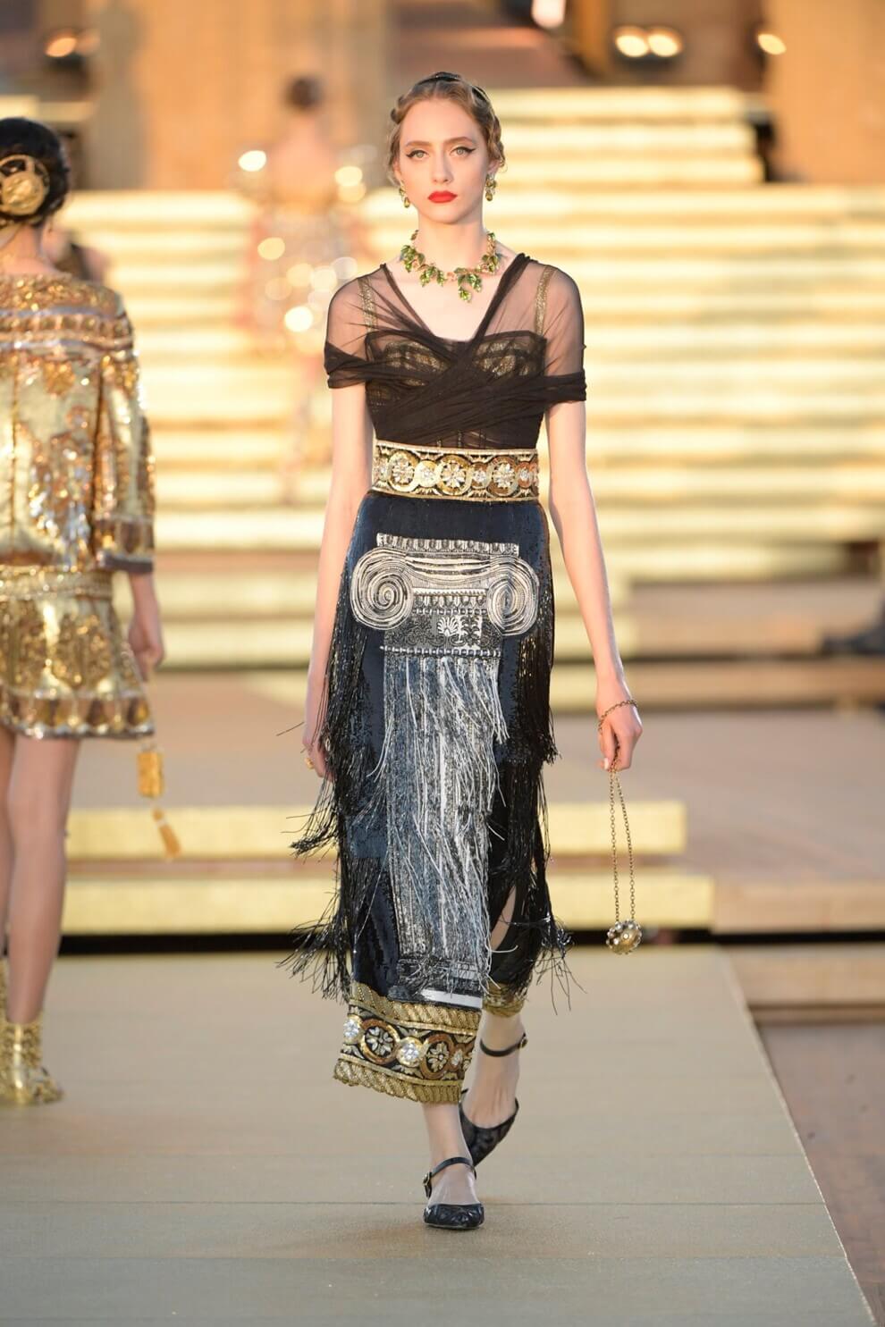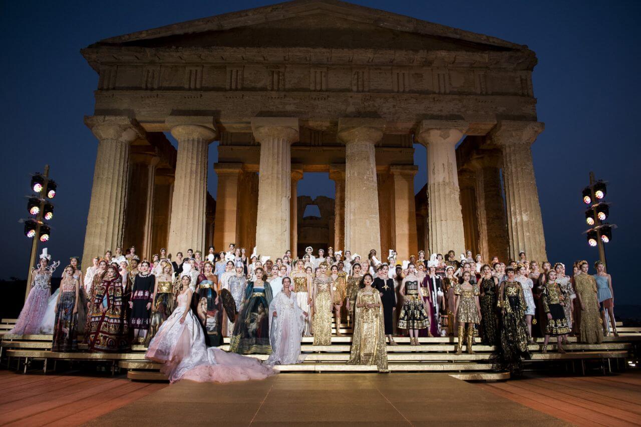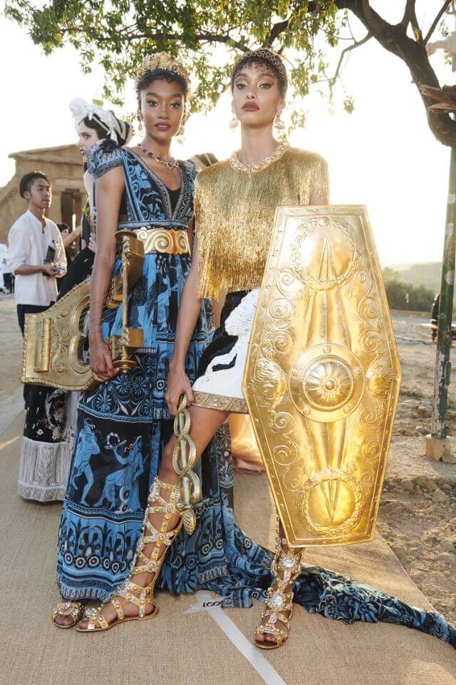 В сицилийском городе Агридженто, в знаменитой Долине храмов, прошел показ коллекции Alta Moda Dolce & Gabbana невиданной пышности. Среди памятников храмовой архитектуры Древней Греции модели шествовали по импровизированному пантеону, словно сошедшие с Олимпа богини: в платьях, напоминающих хитоны, пеплосы и гиматии, украшенные золотом, сложными вышивками и репродукциями картин итальянского Ренессанса. Например, на юбках расположены мотивы полотен Жак-Луи Давида. Шелковые наряды венчали сюжеты древнеримского и древнегреческого изобразительного искусства, которые нам знакомы по образцам на амфорах. В качестве аксессуаров на моделях были золотые гладиаторские сандалии и тиары, а в ушах красовались большие вычурные серьги.
