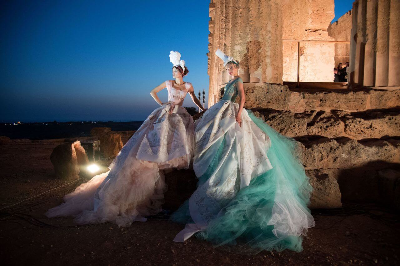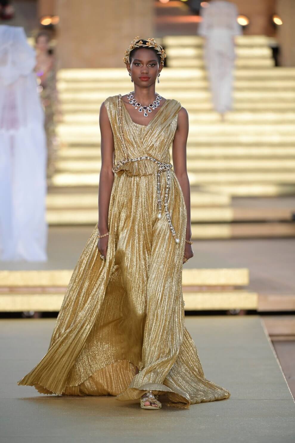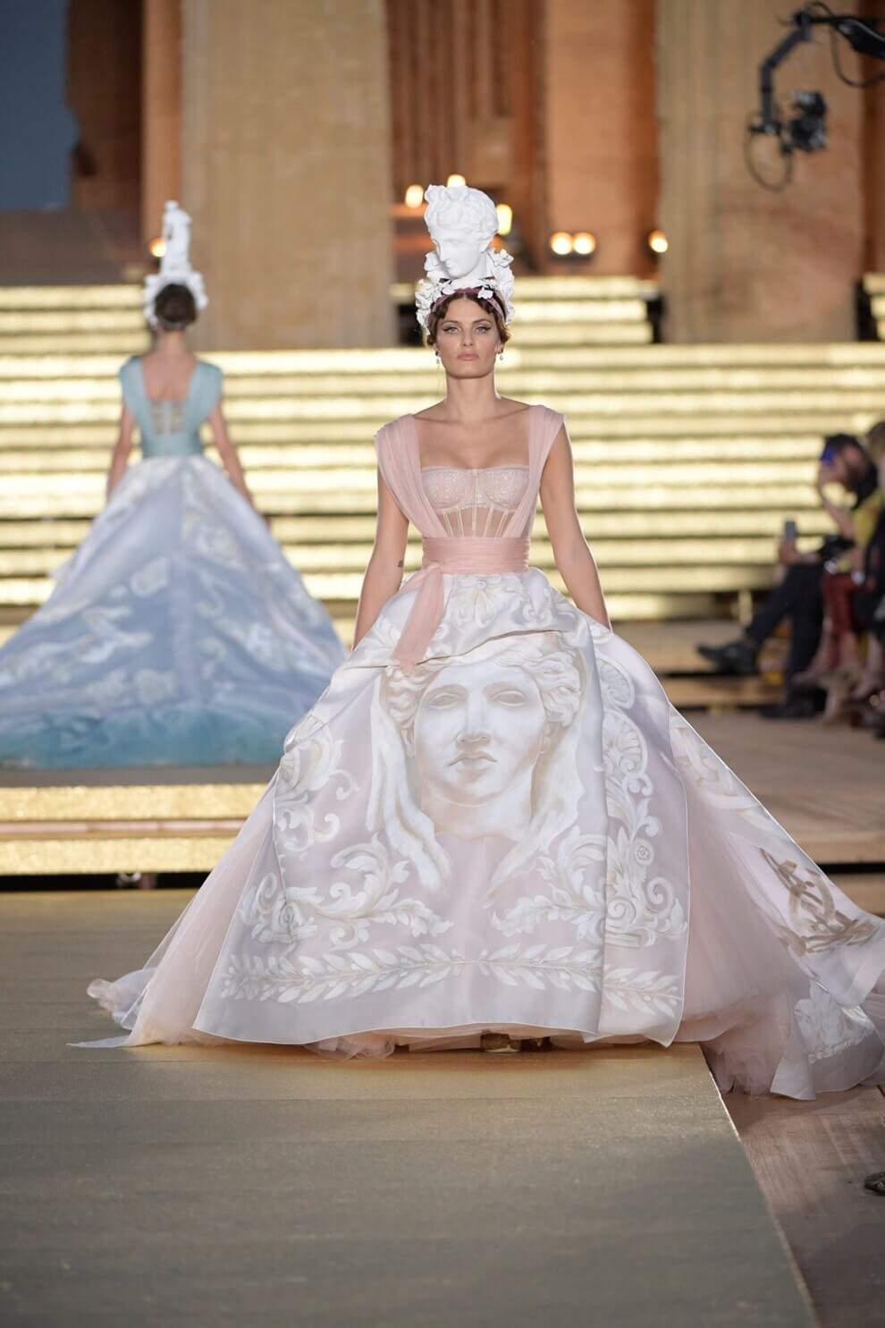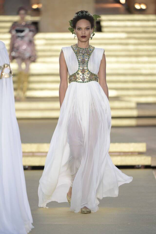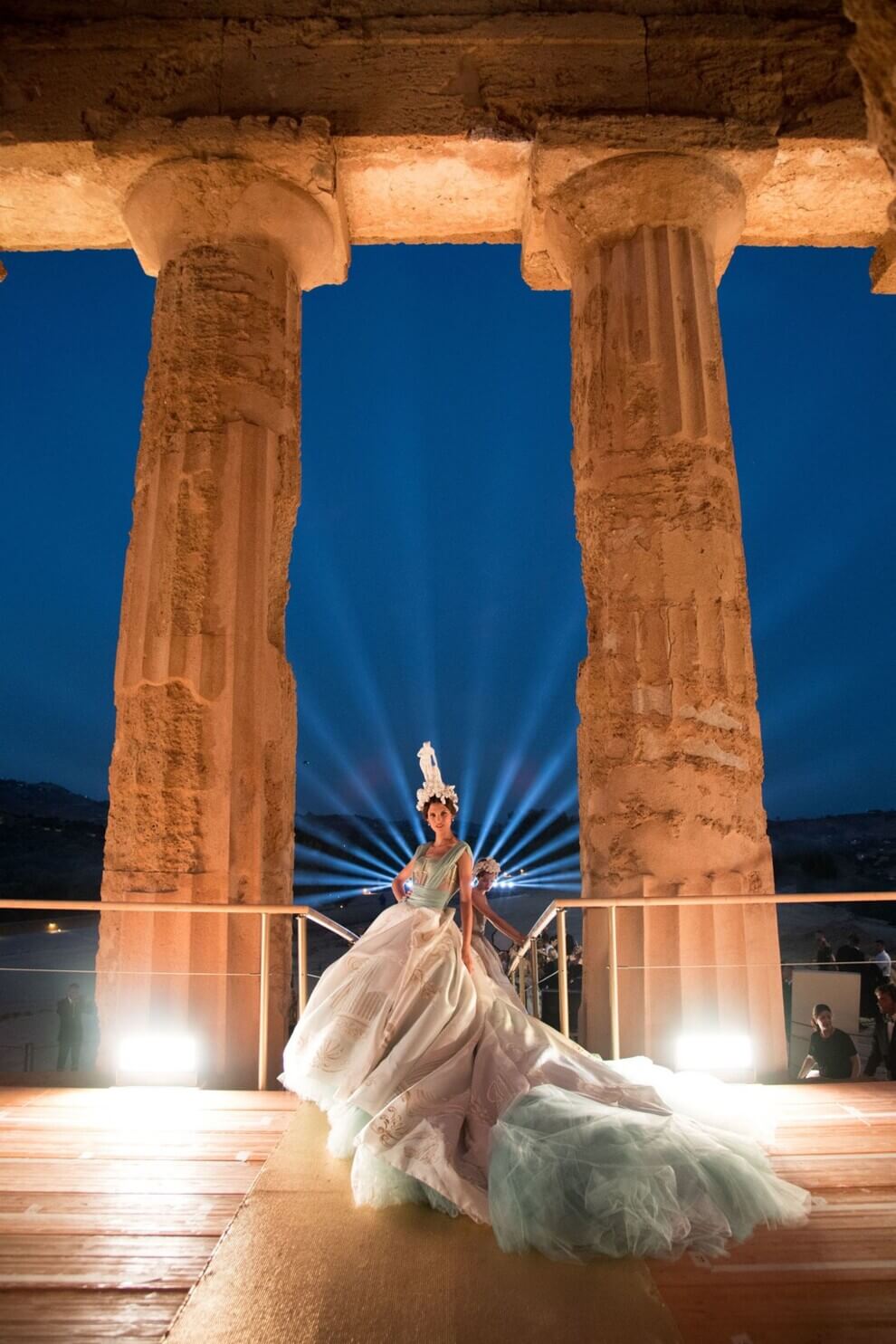 В сицилийском городе Агридженто, в знаменитой Долине храмов, прошел показ коллекции Alta Moda Dolce & Gabbana невиданной пышности. Среди памятников храмовой архитектуры Древней Греции модели шествовали по импровизированному пантеону, словно сошедшие с Олимпа богини: в платьях, напоминающих хитоны, пеплосы и гиматии, украшенные золотом, сложными вышивками и репродукциями картин итальянского Ренессанса. Например, на юбках расположены мотивы полотен Жак-Луи Давида. Шелковые наряды венчали сюжеты древнеримского и древнегреческого изобразительного искусства, которые нам знакомы по образцам на амфорах. В качестве аксессуаров на моделях были золотые гладиаторские сандалии и тиары, а в ушах красовались большие вычурные серьги.