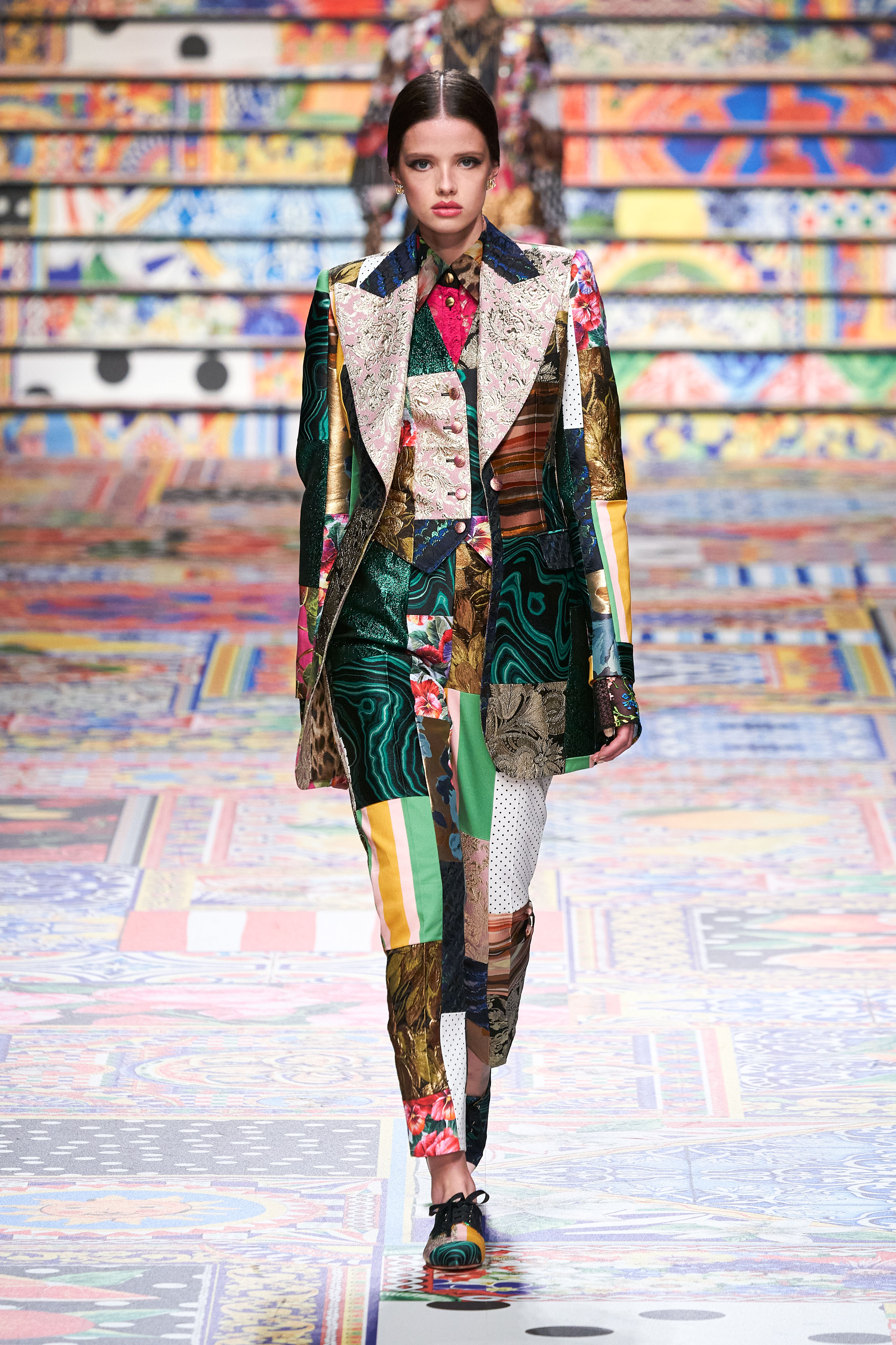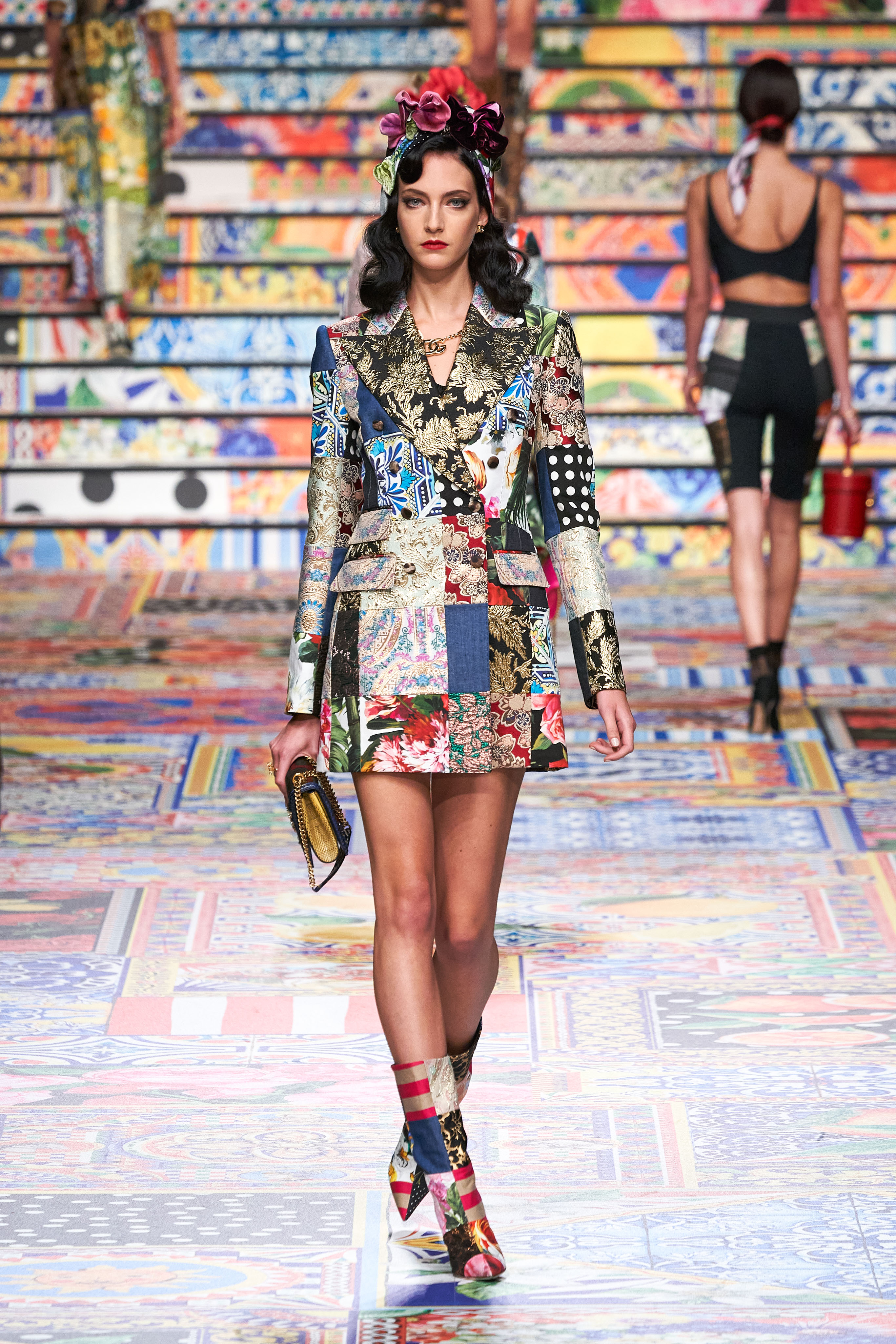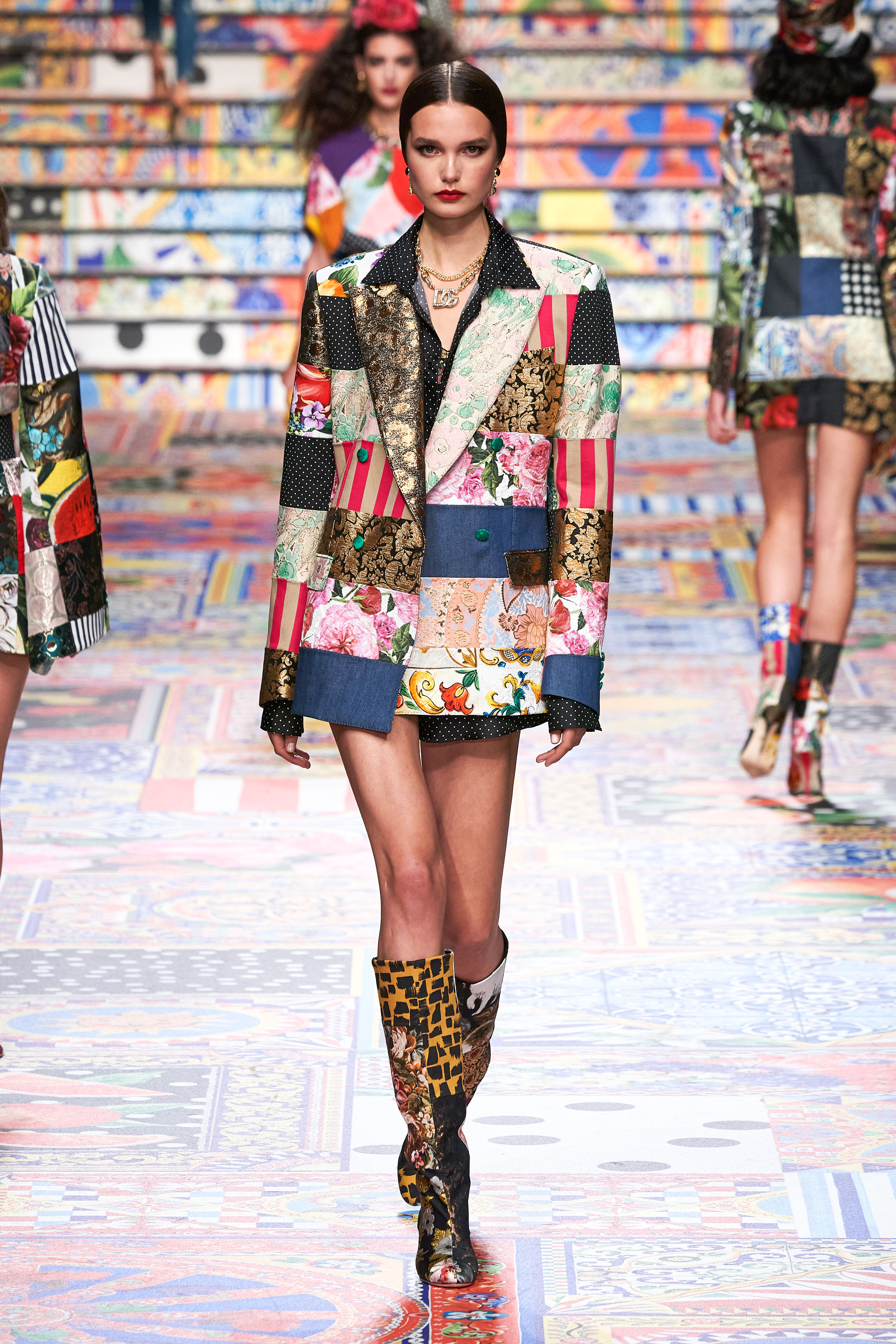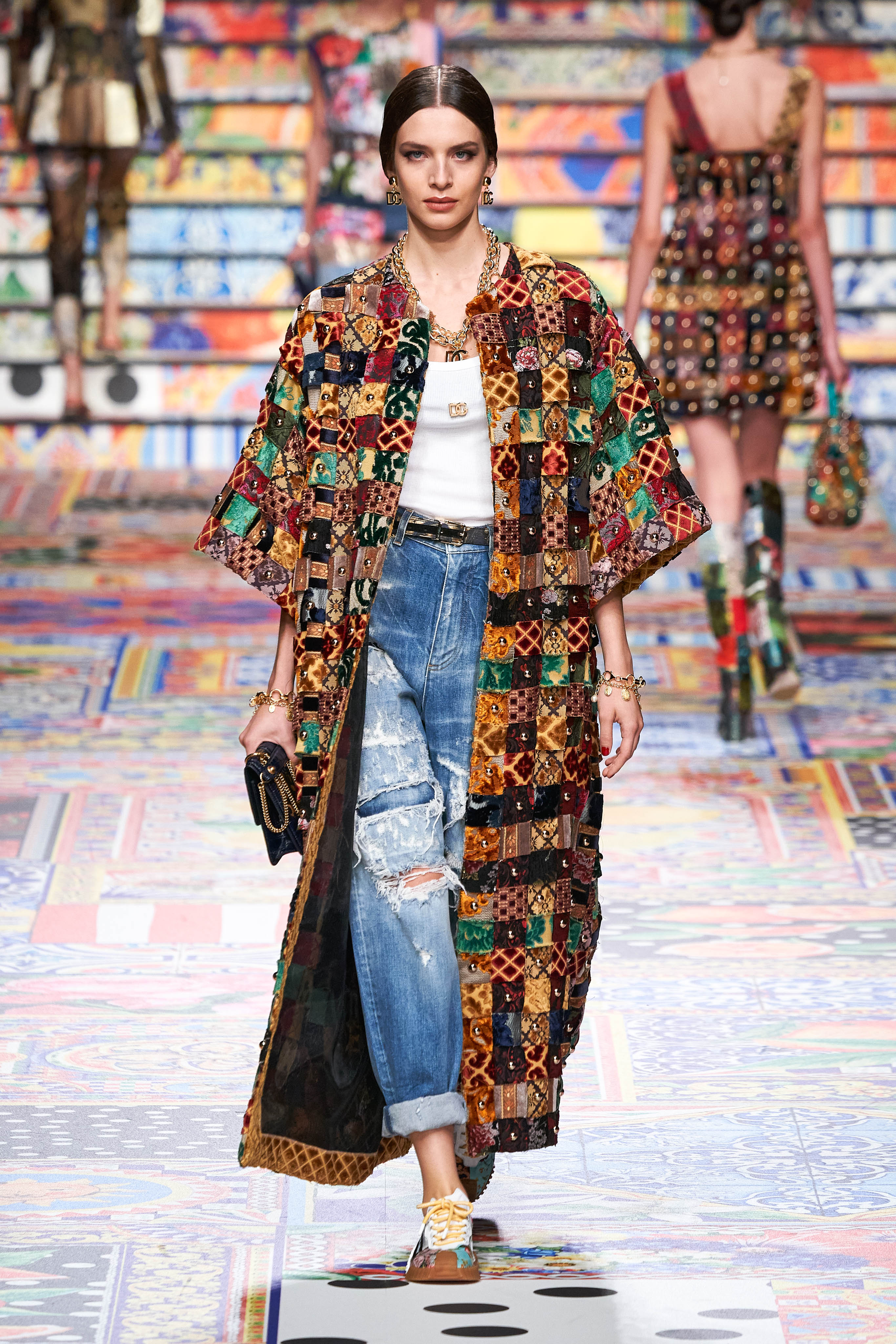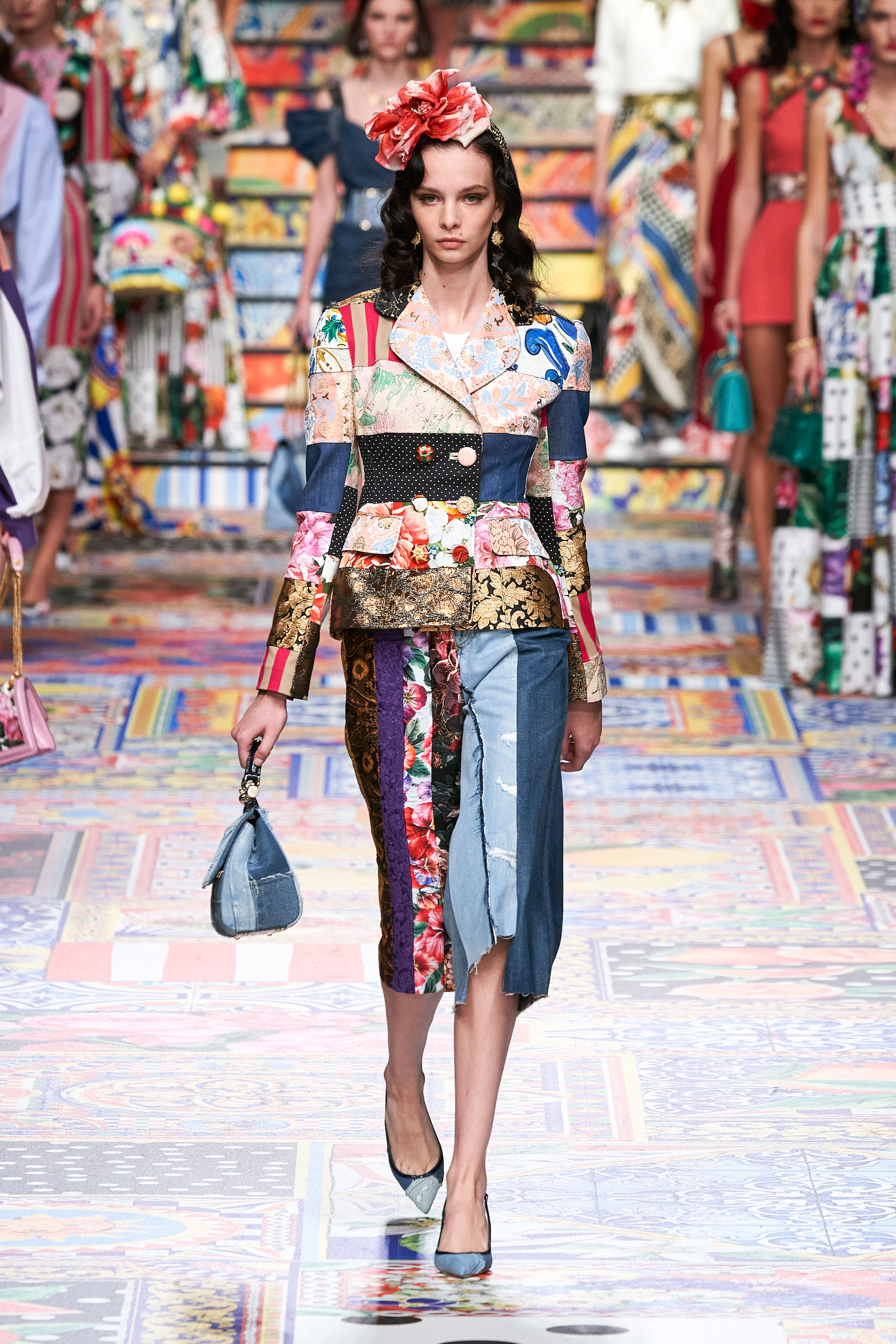 Доменико Дольче и Стефано Габбана в своей работе над весенней коллекцией, так же как и другие дизайнеры, размышляли над родной землей, домом и необходимостью находить баланс во время пандемии — как внутренний, так и производственный. Так, вся коллекция создана из текстильных остатков прошлых сезонов, а костюмы-тройки, плащи, юбки и даже джинсы выполнены в технике пэчворк.