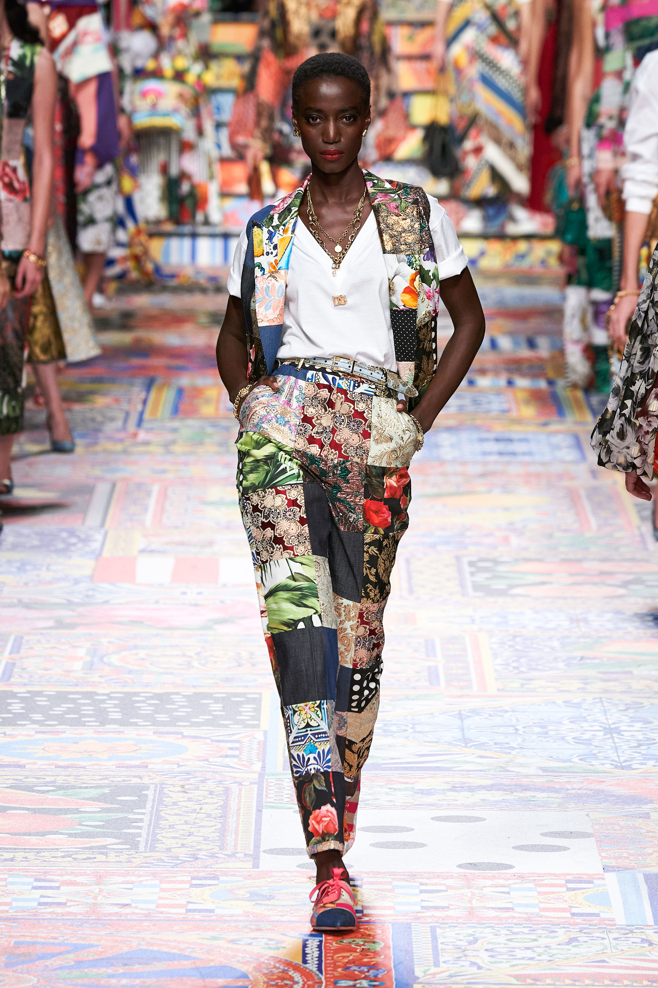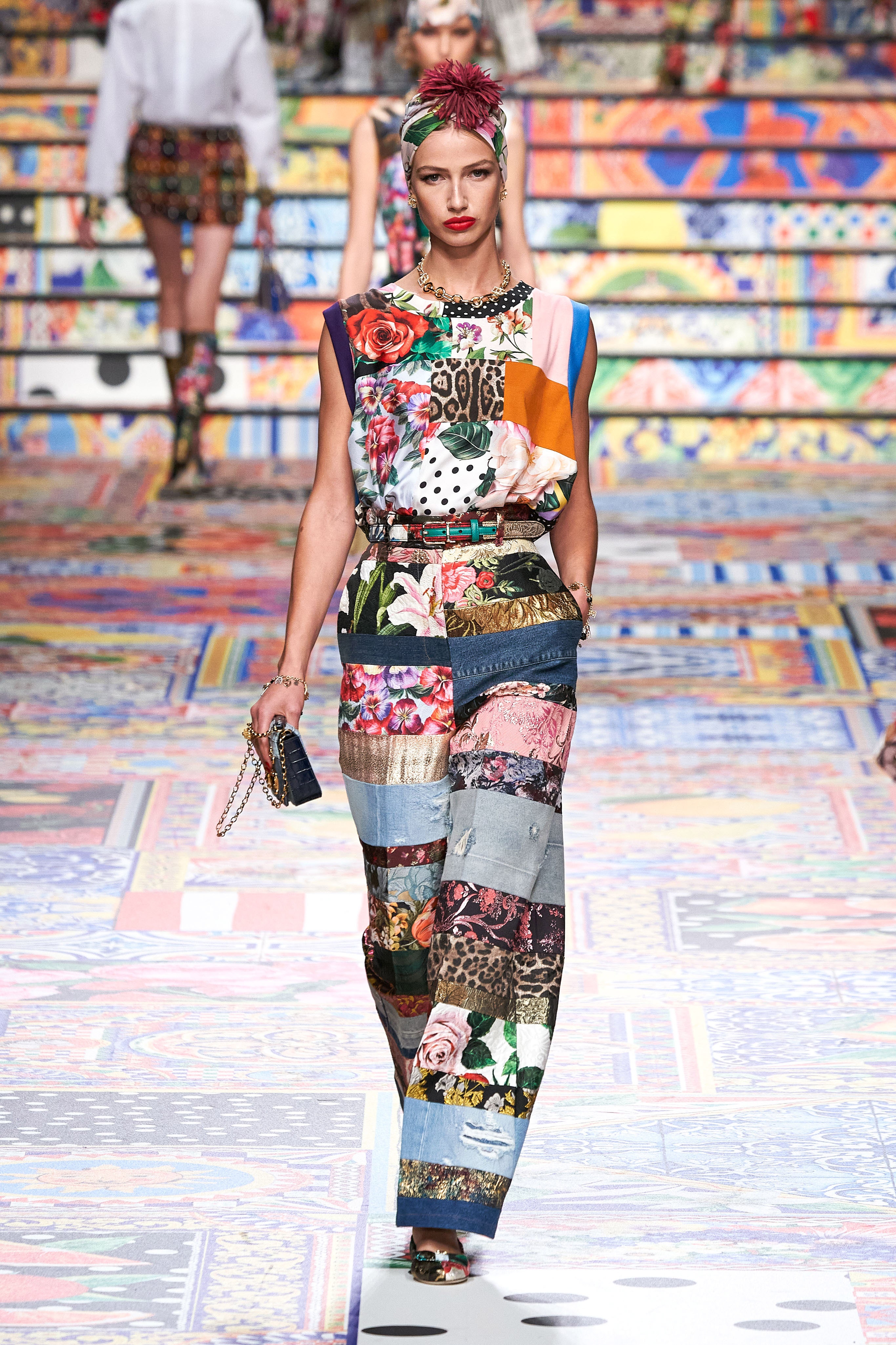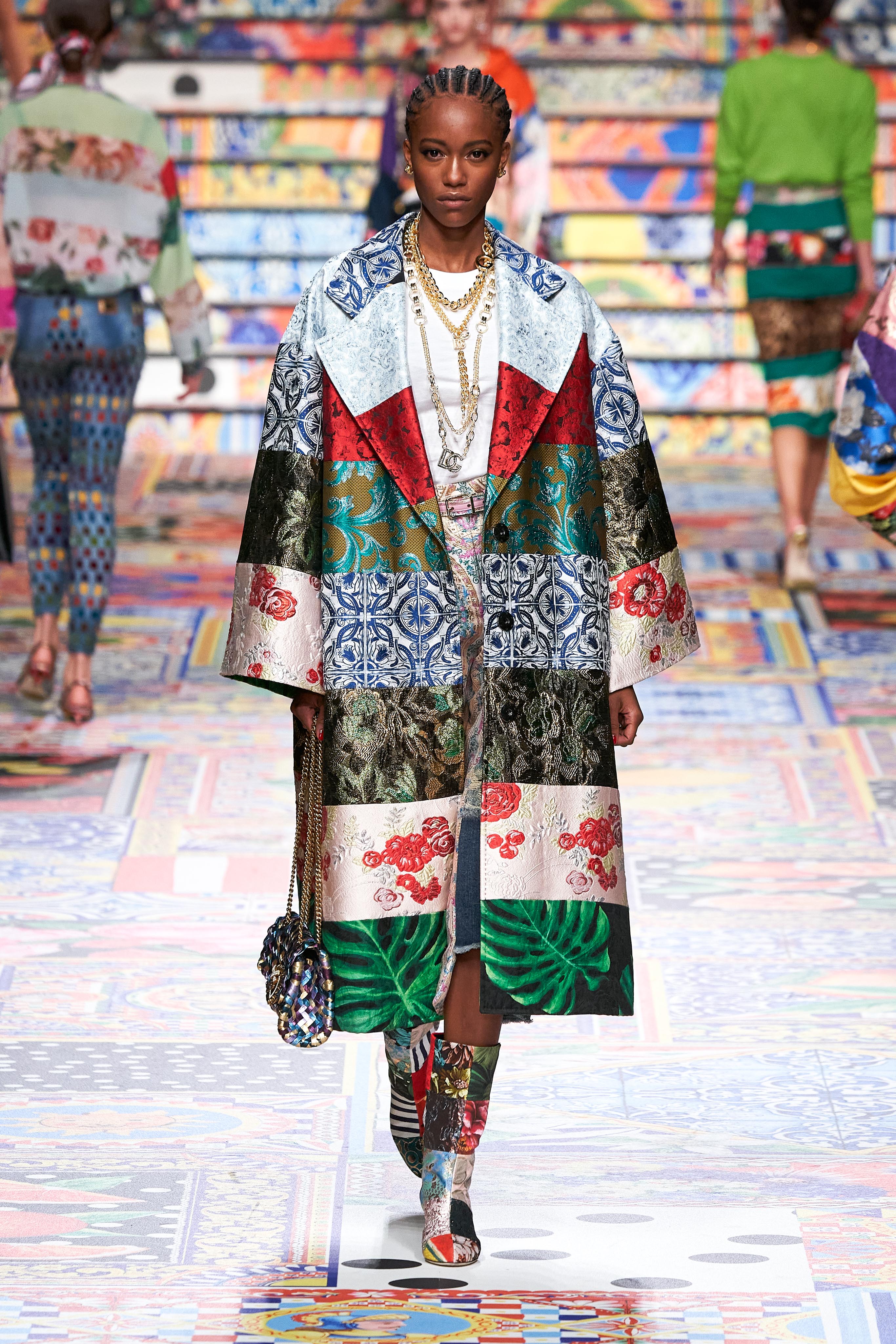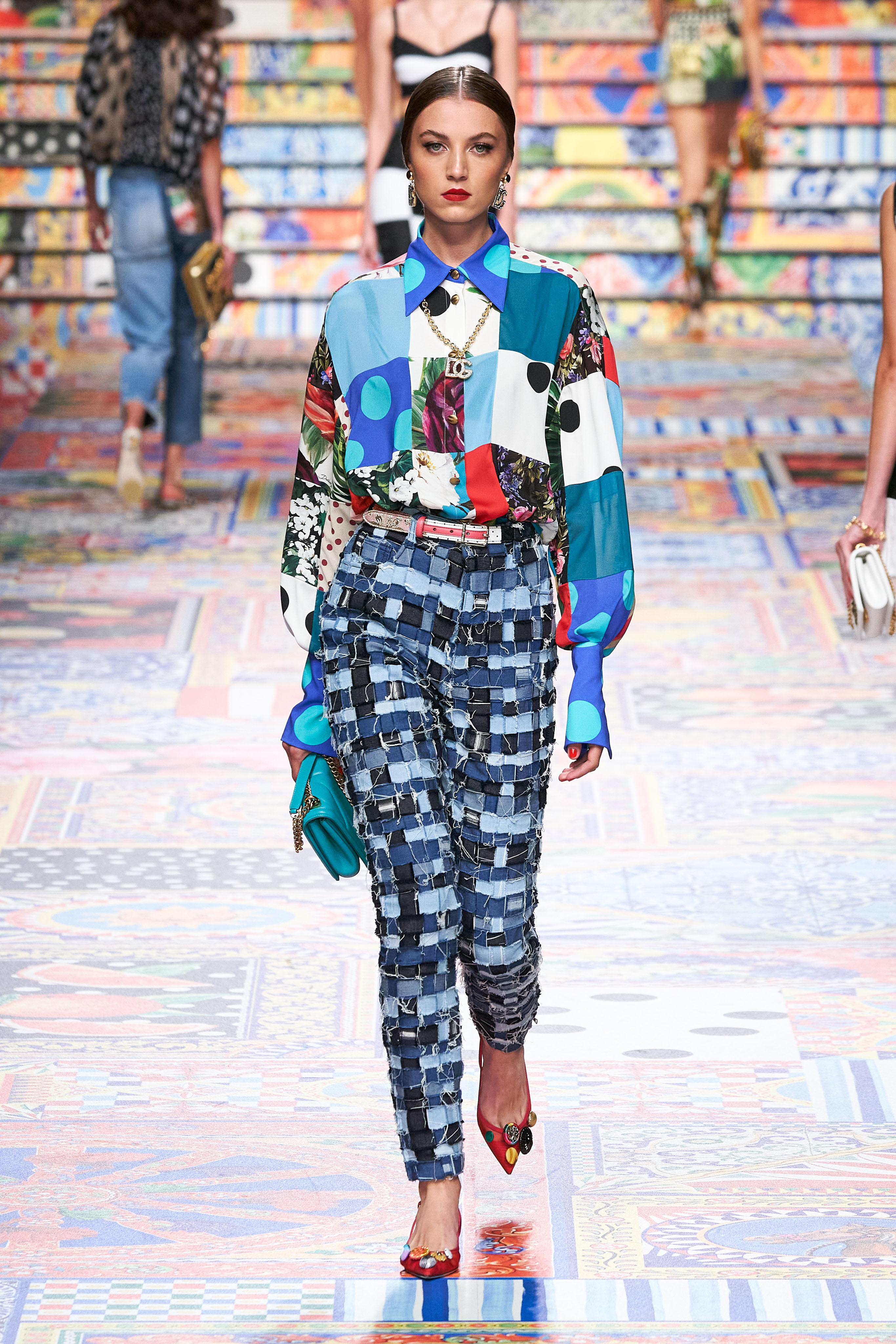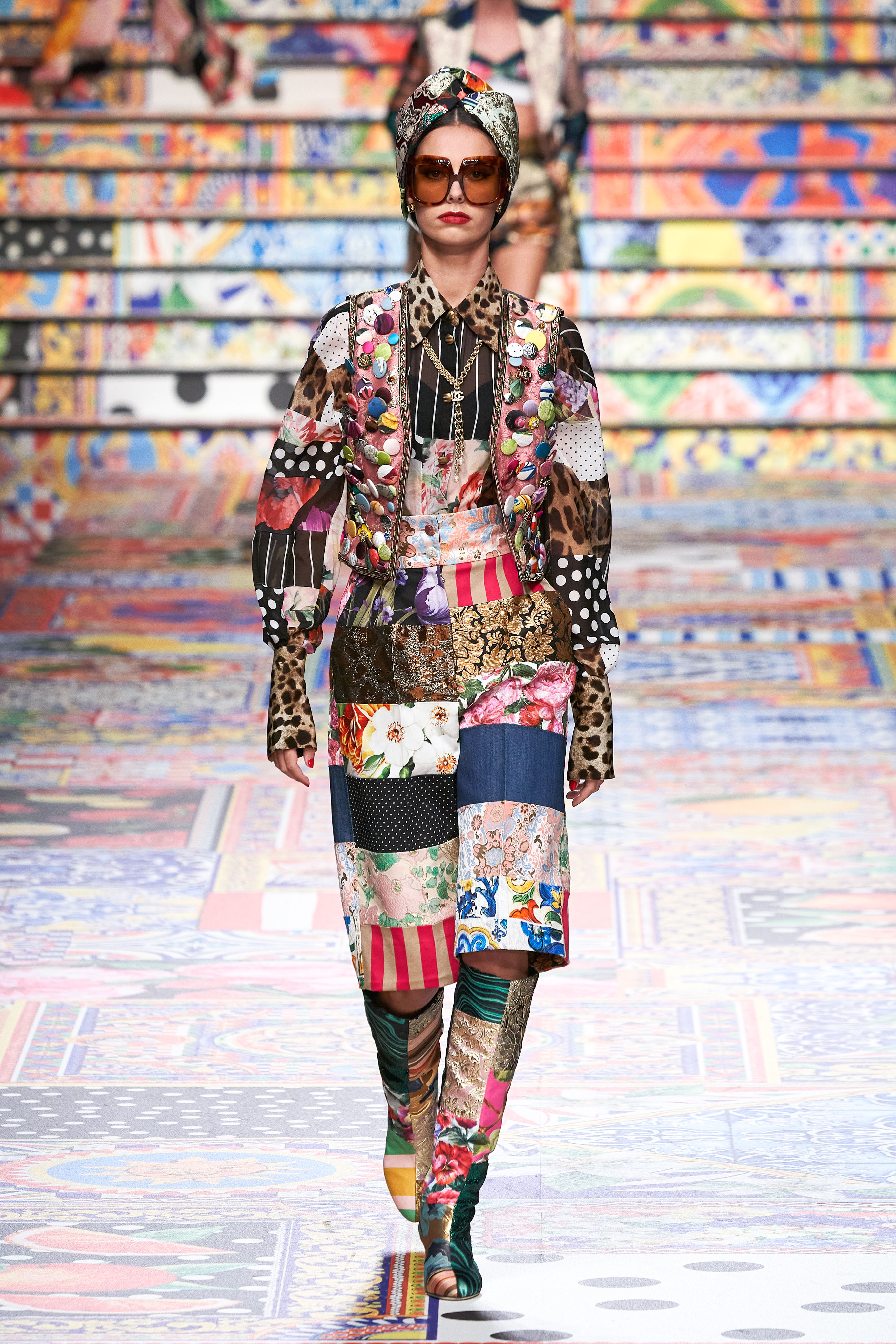 Доменико Дольче и Стефано Габбана в своей работе над весенней коллекцией, так же как и другие дизайнеры, размышляли над родной землей, домом и необходимостью находить баланс во время пандемии — как внутренний, так и производственный. Так, вся коллекция создана из текстильных остатков прошлых сезонов, а костюмы-тройки, плащи, юбки и даже джинсы выполнены в технике пэчворк.