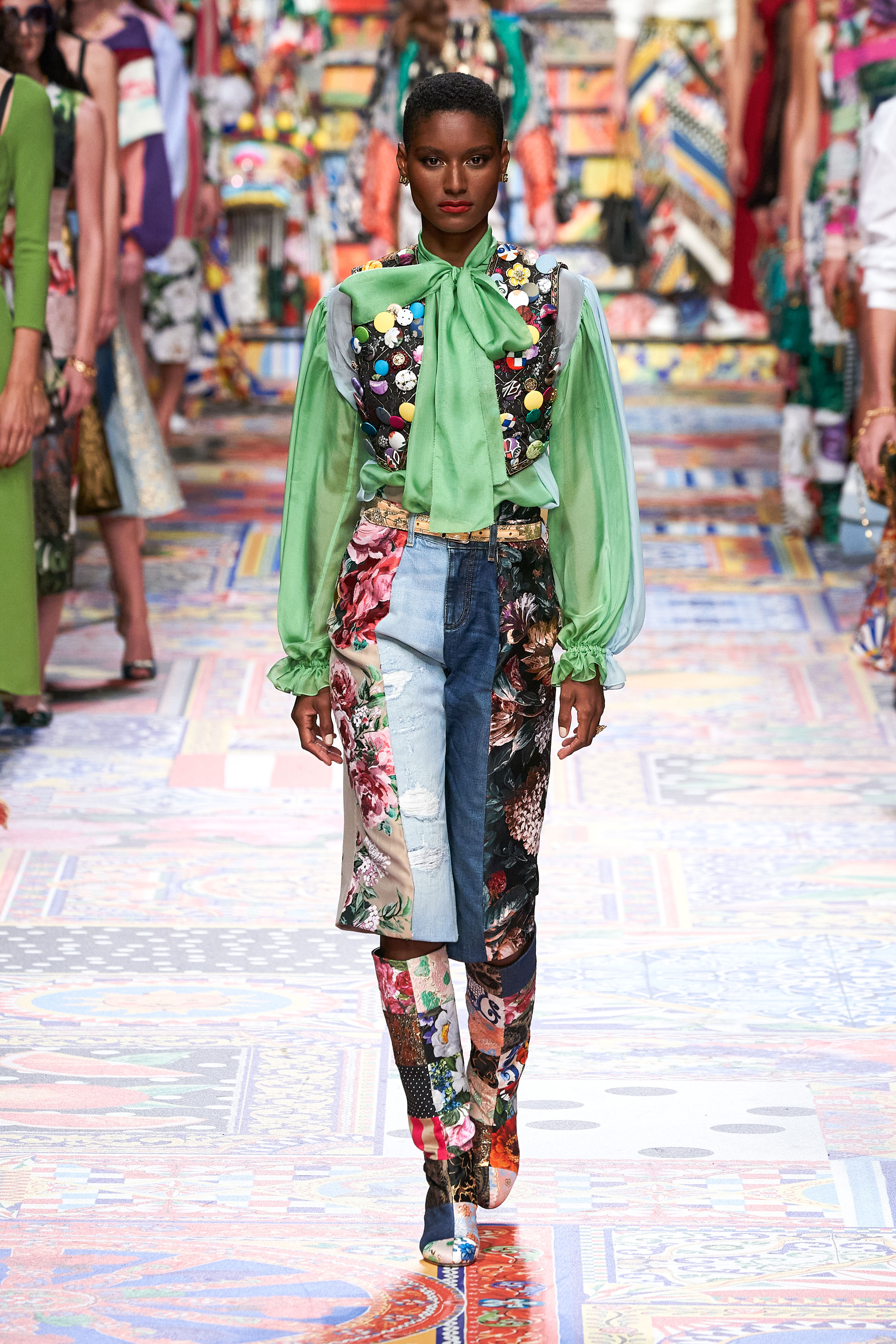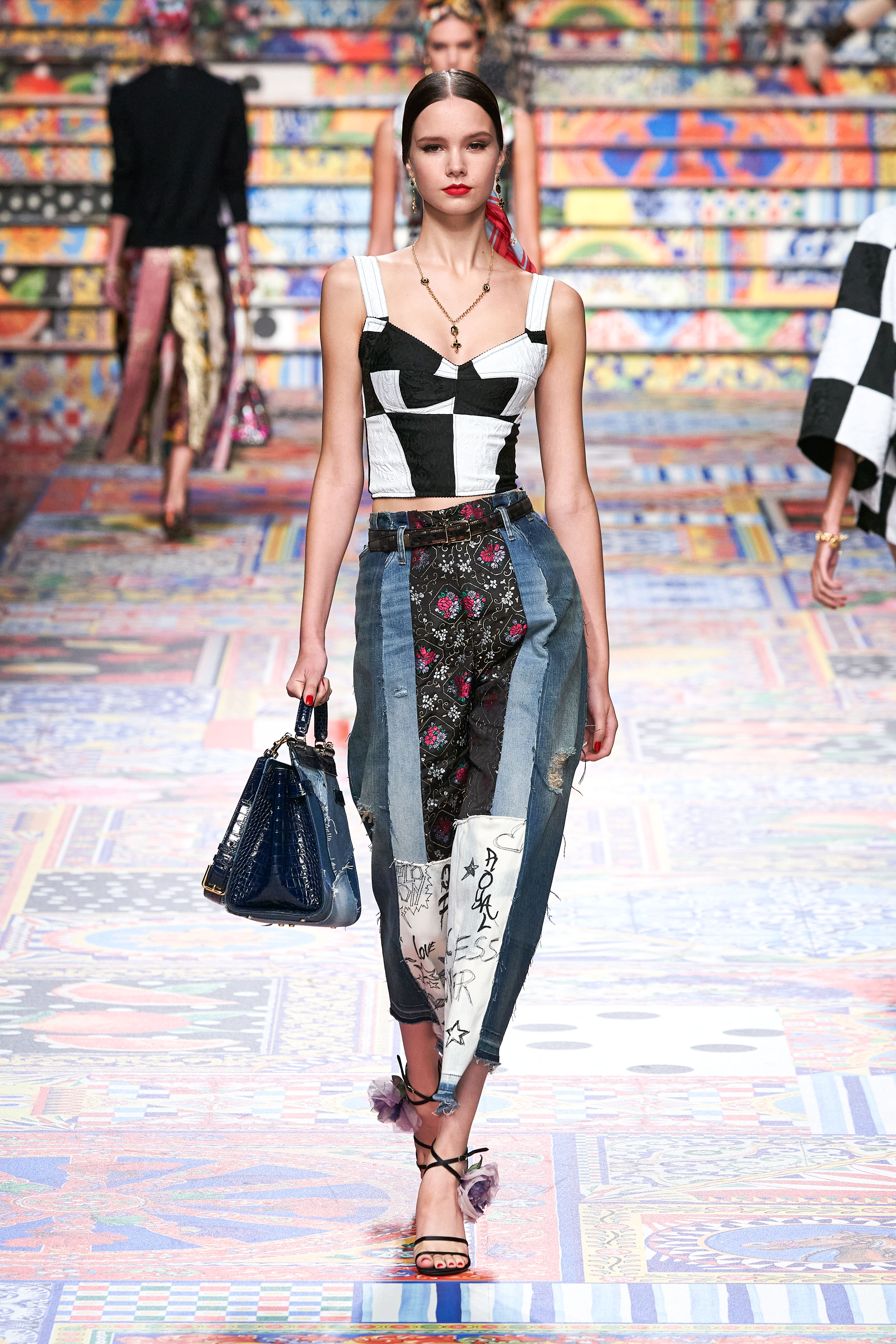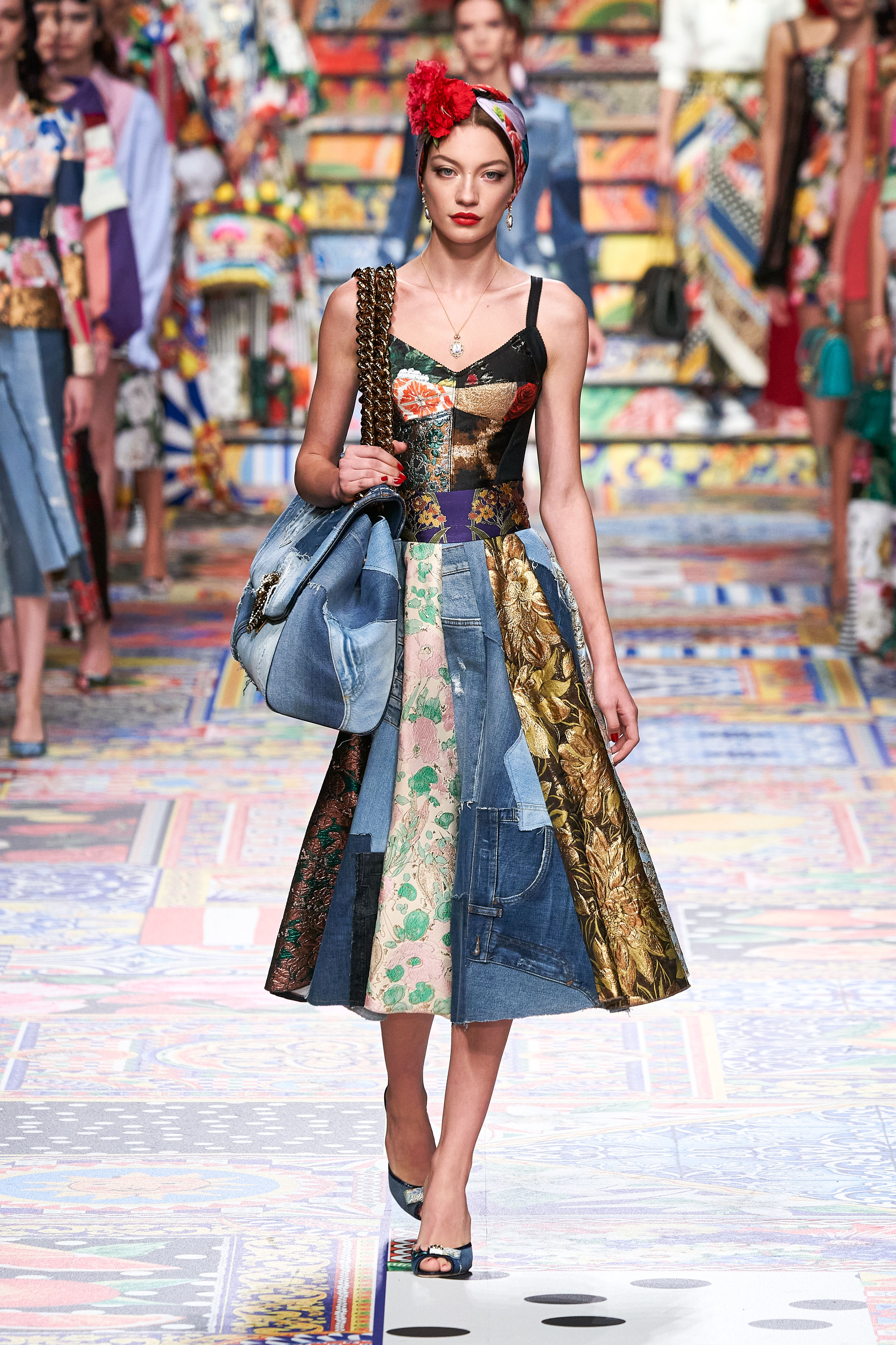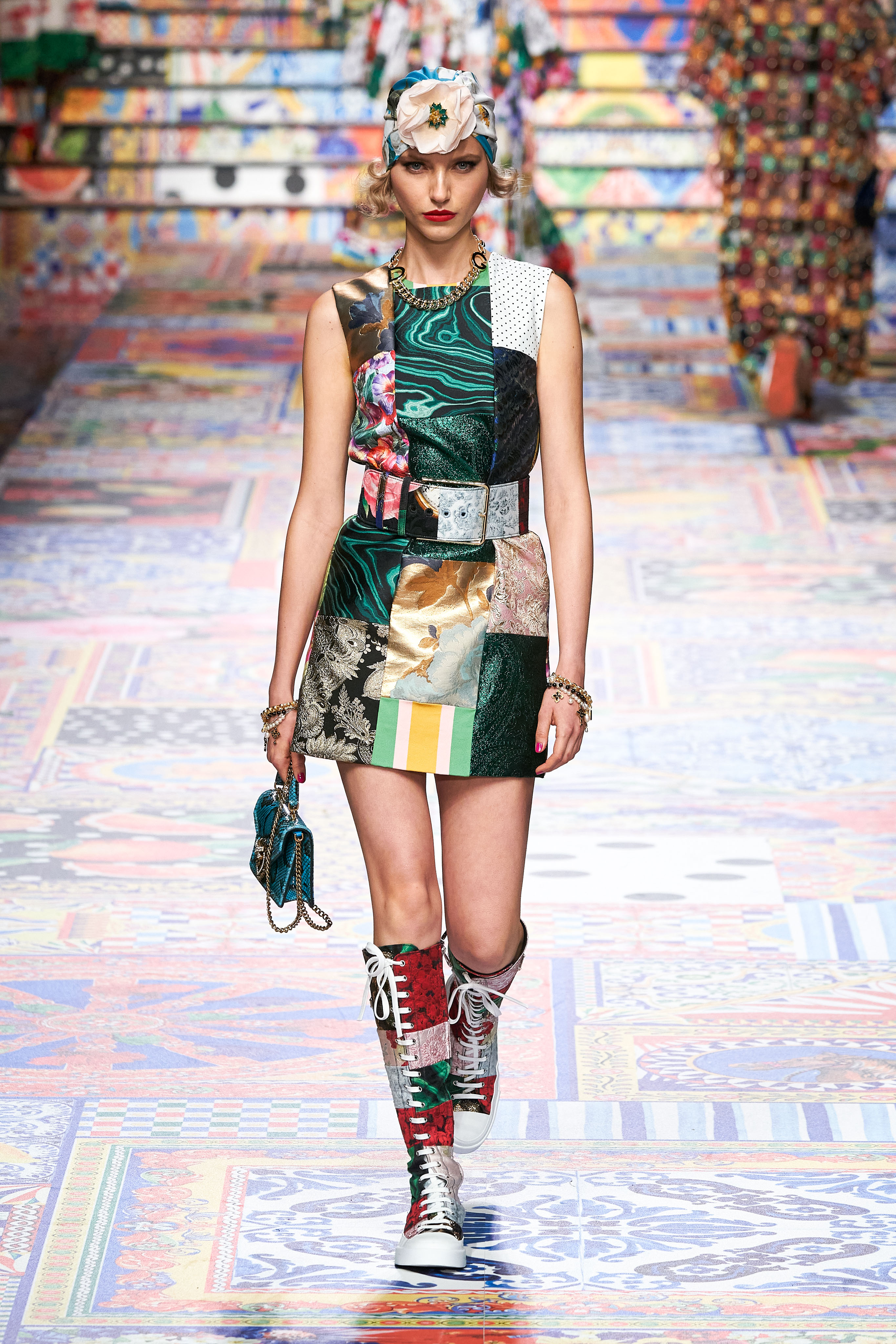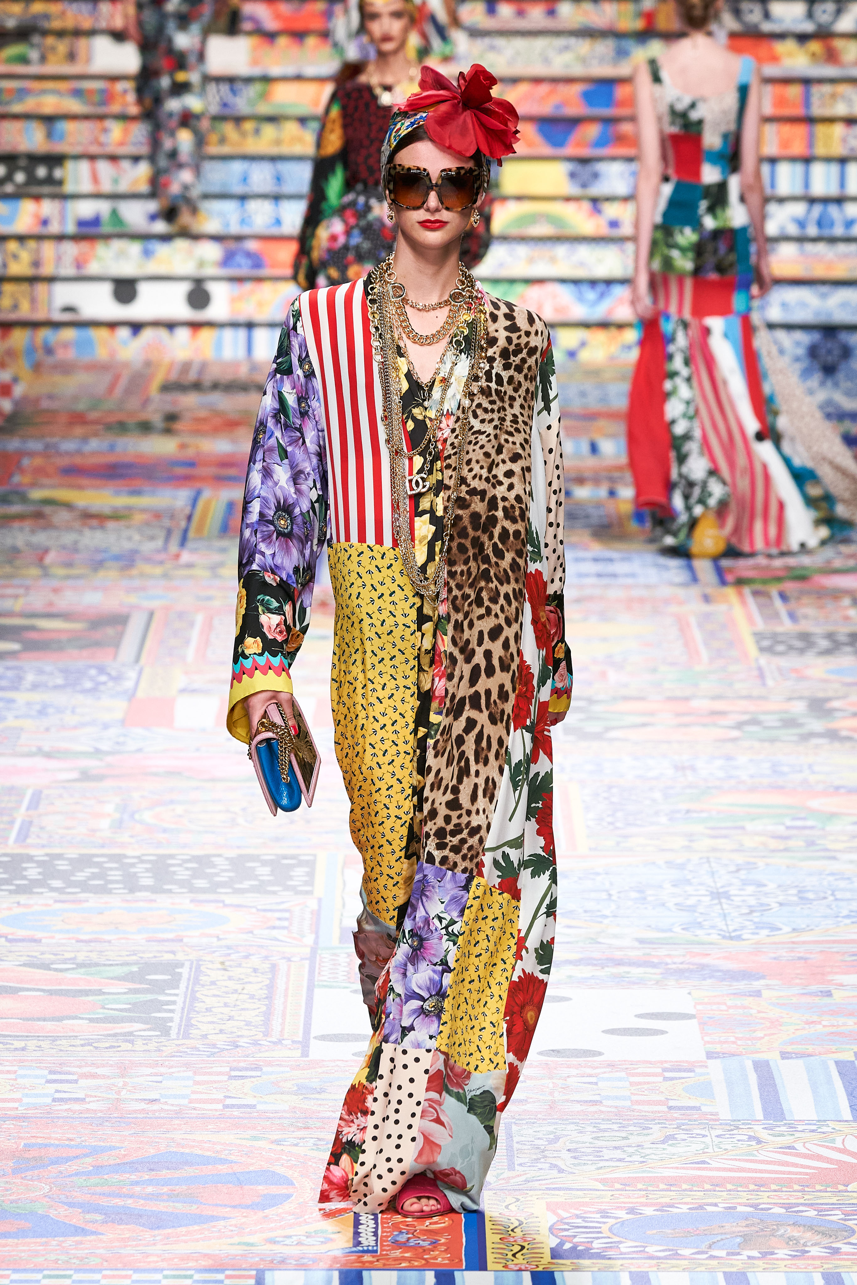 Доменико Дольче и Стефано Габбана в своей работе над весенней коллекцией, так же как и другие дизайнеры, размышляли над родной землей, домом и необходимостью находить баланс во время пандемии — как внутренний, так и производственный. Так, вся коллекция создана из текстильных остатков прошлых сезонов, а костюмы-тройки, плащи, юбки и даже джинсы выполнены в технике пэчворк.