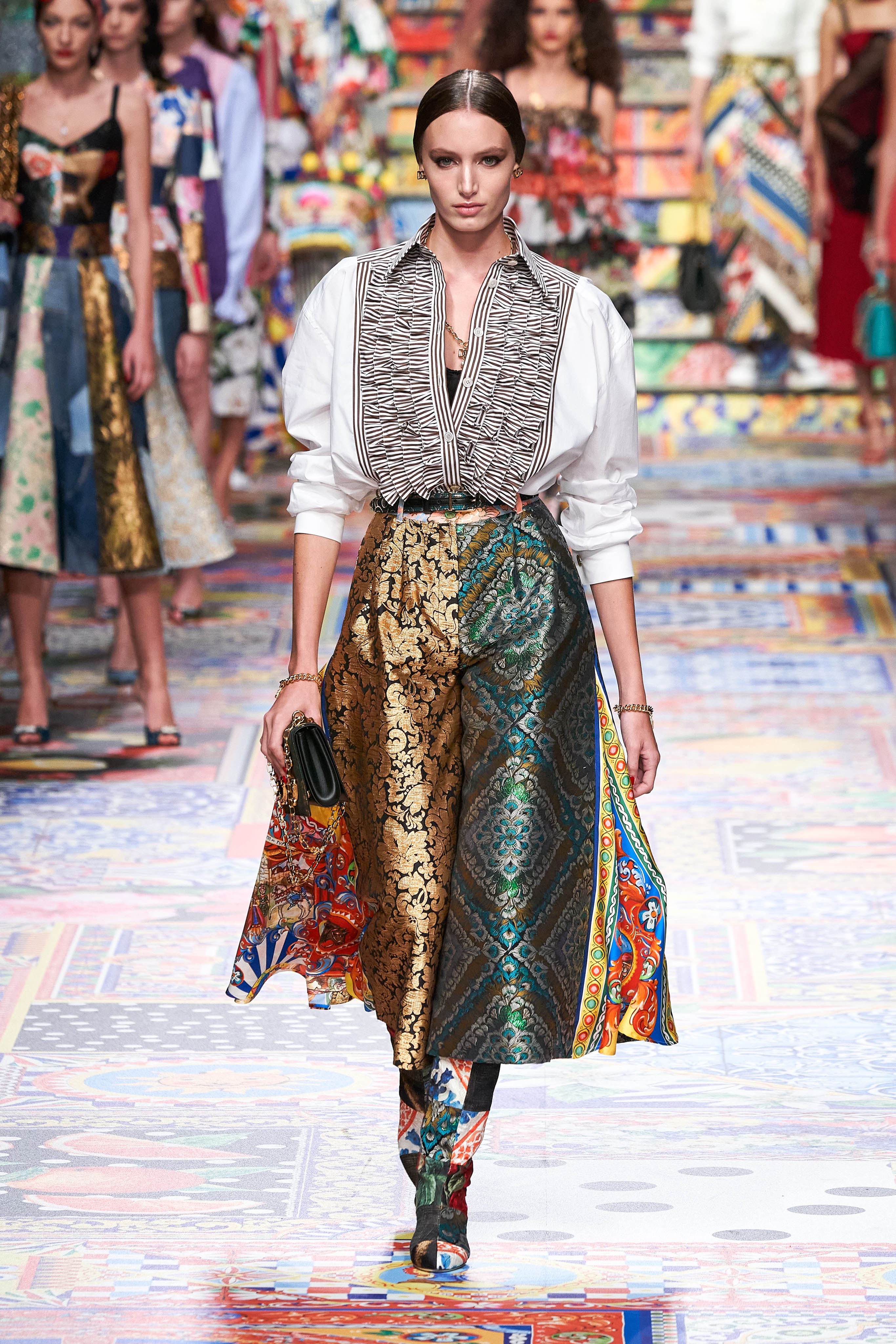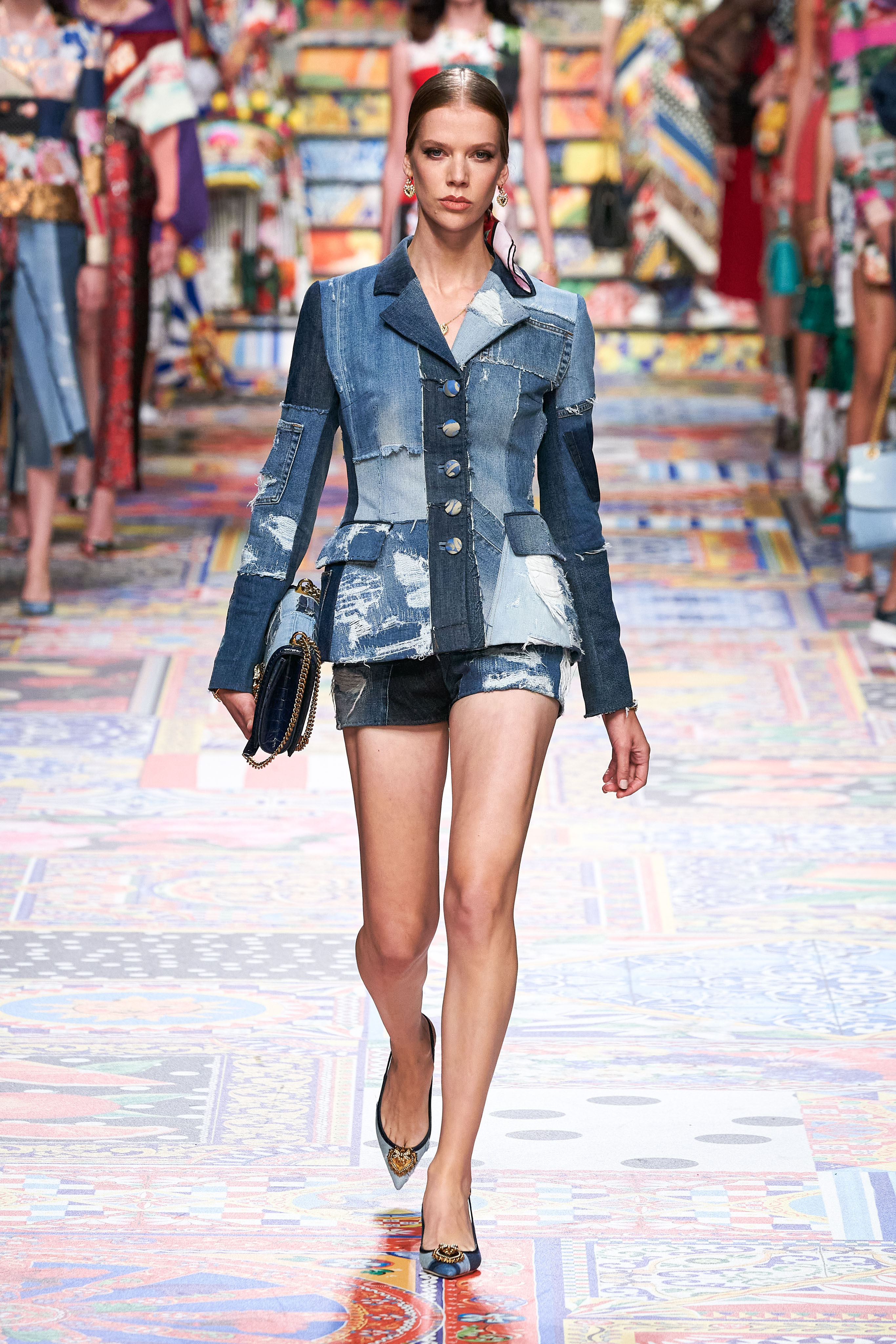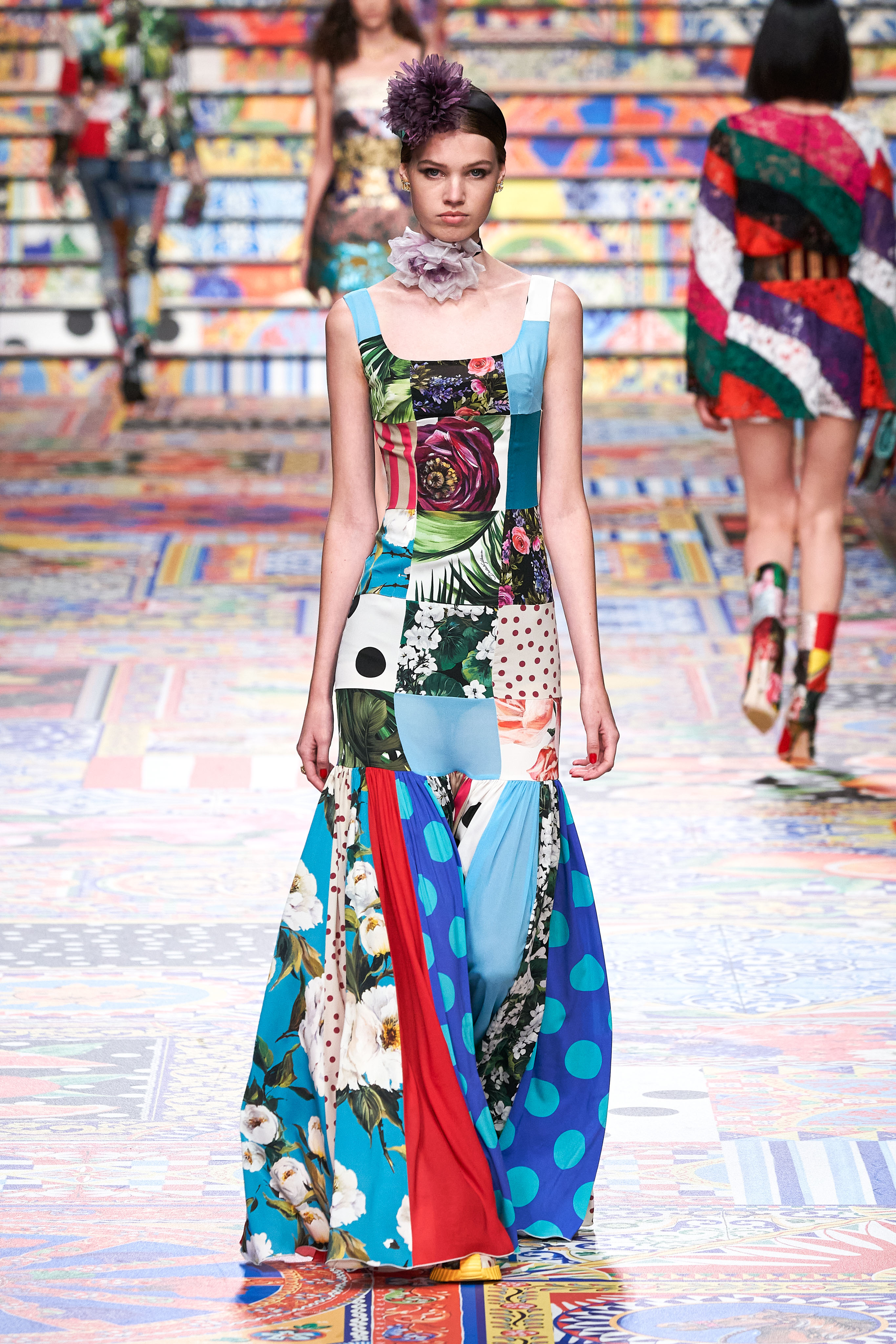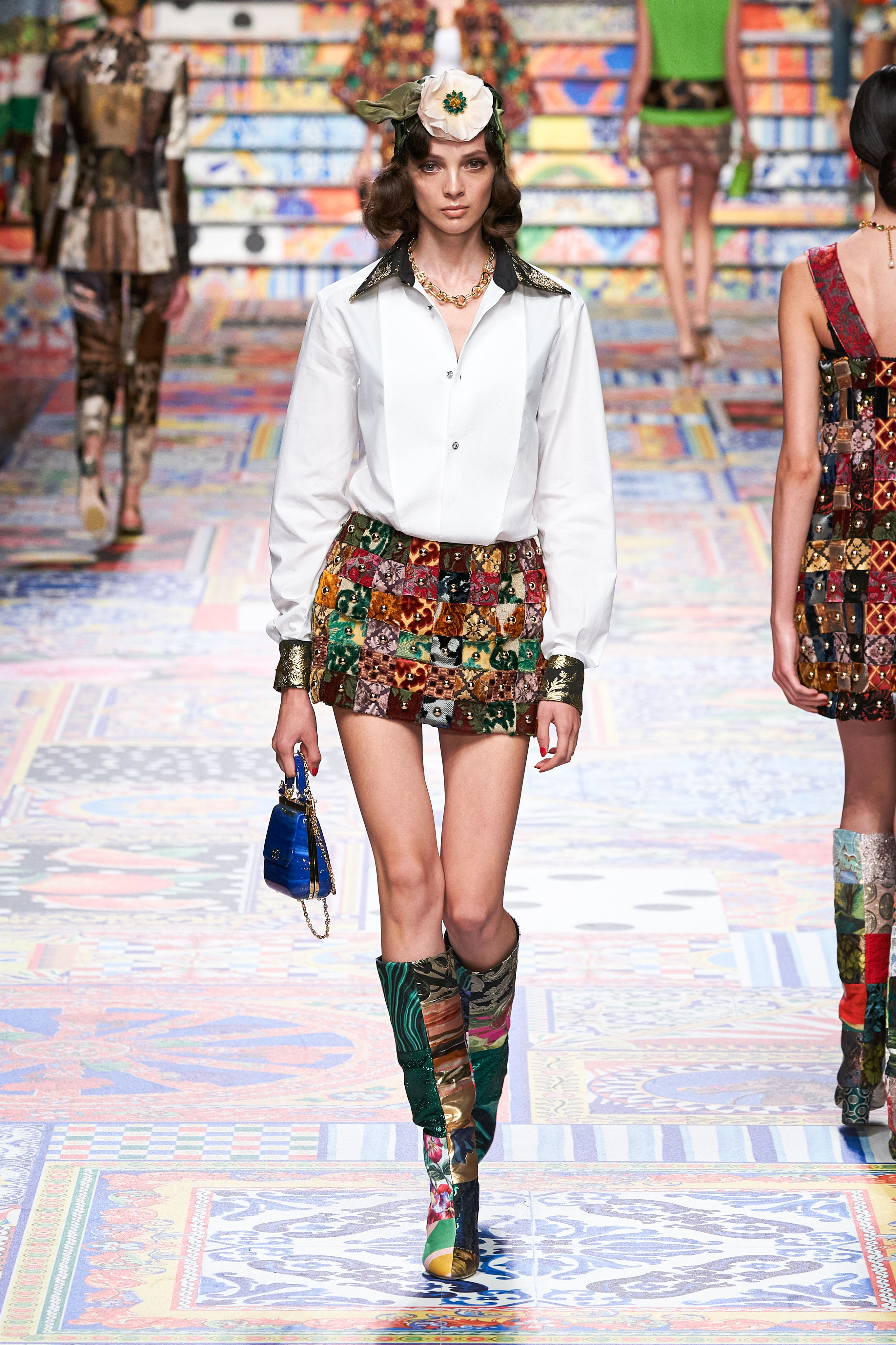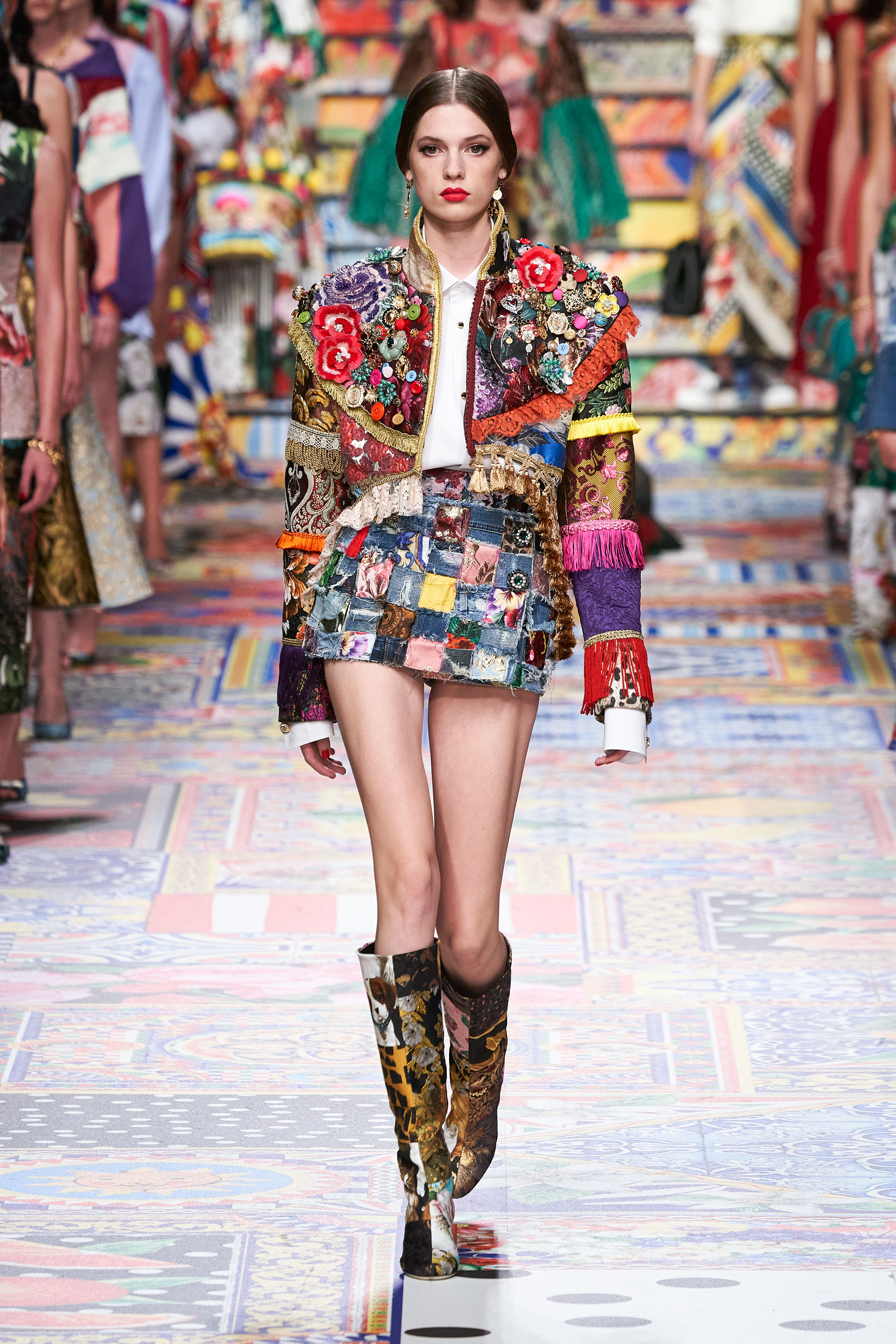 Доменико Дольче и Стефано Габбана в своей работе над весенней коллекцией, так же как и другие дизайнеры, размышляли над родной землей, домом и необходимостью находить баланс во время пандемии — как внутренний, так и производственный. Так, вся коллекция создана из текстильных остатков прошлых сезонов, а костюмы-тройки, плащи, юбки и даже джинсы выполнены в технике пэчворк.