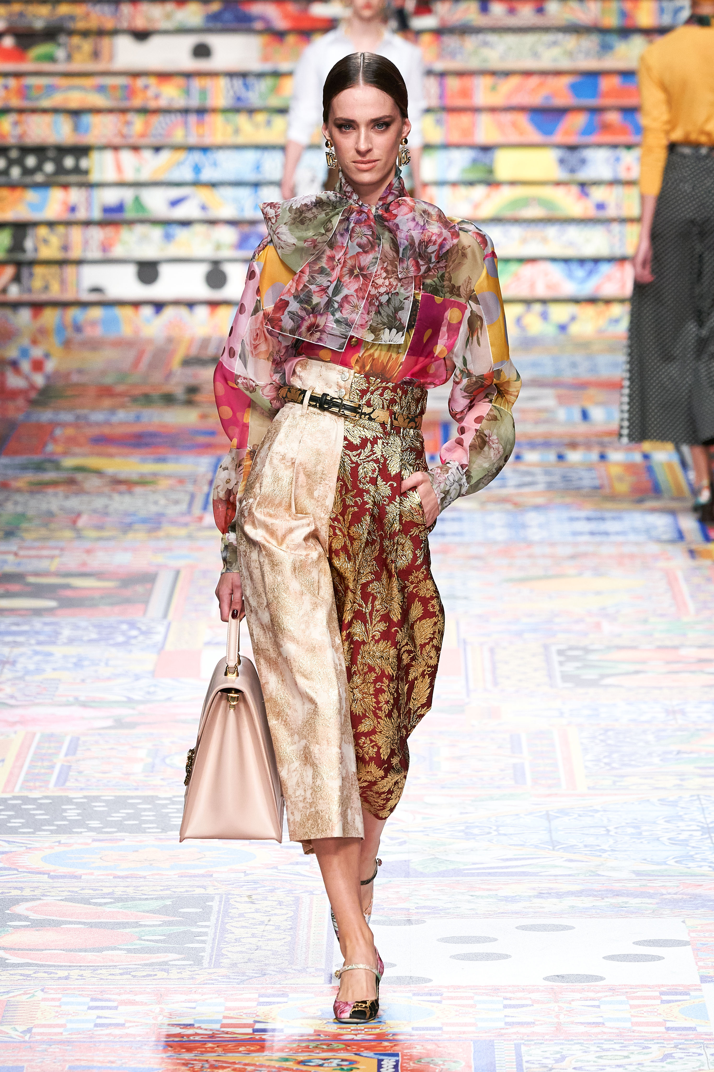 Жакеты строгого кроя, платья — песочные часы, пальто, напоминающие халаты аристократов 19 века, и роскошные блузы с бантами сшиты из кусочков парчи, органзы, жоржета и хлопка. Подобную технику Доменико и Дольче использовали в коллекции 1993 года, когда вдохновлялись богемной модой 70-х, в новой же коллекции силуэты и фасоны выглядят как искусный оммаж ранним 90-м.