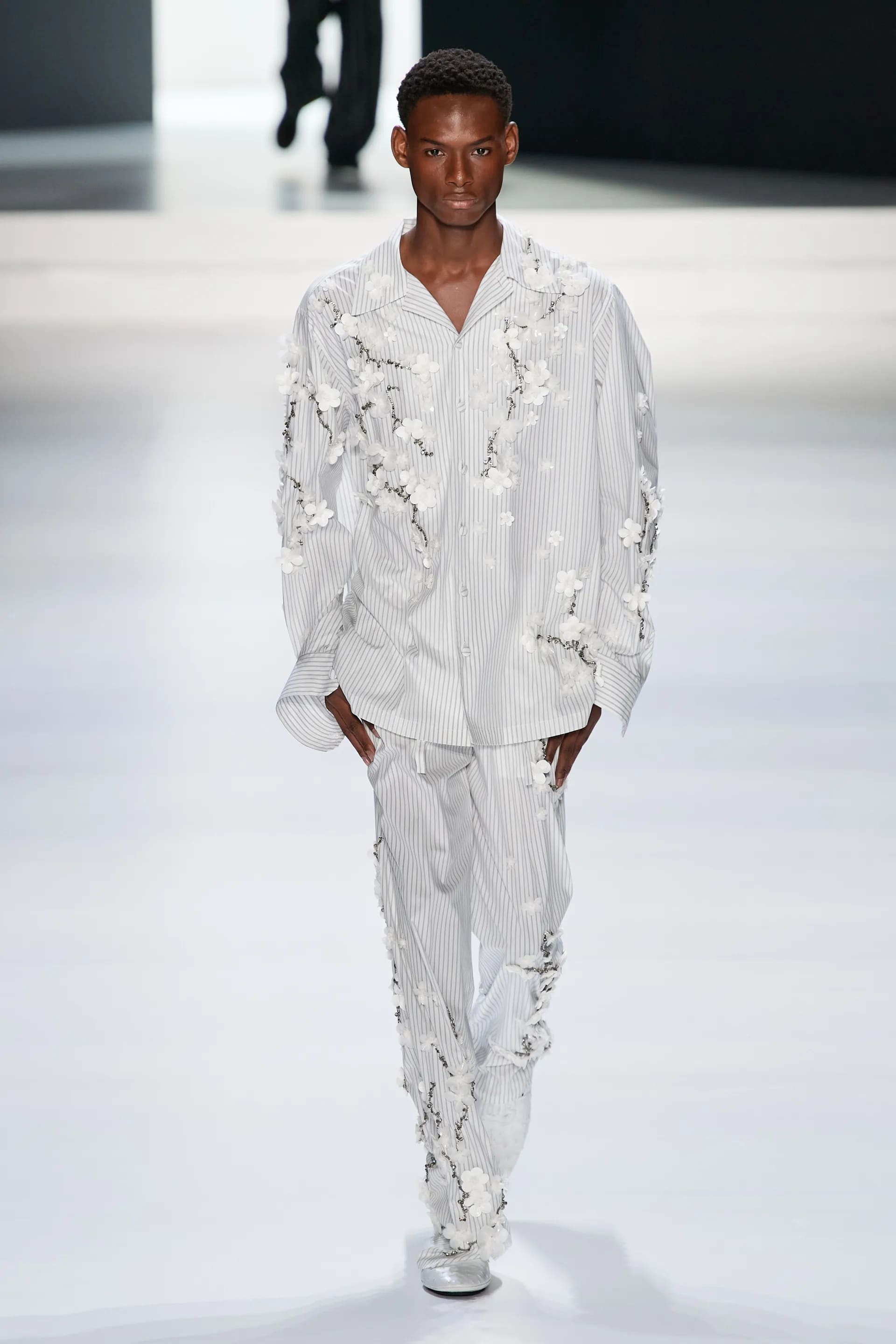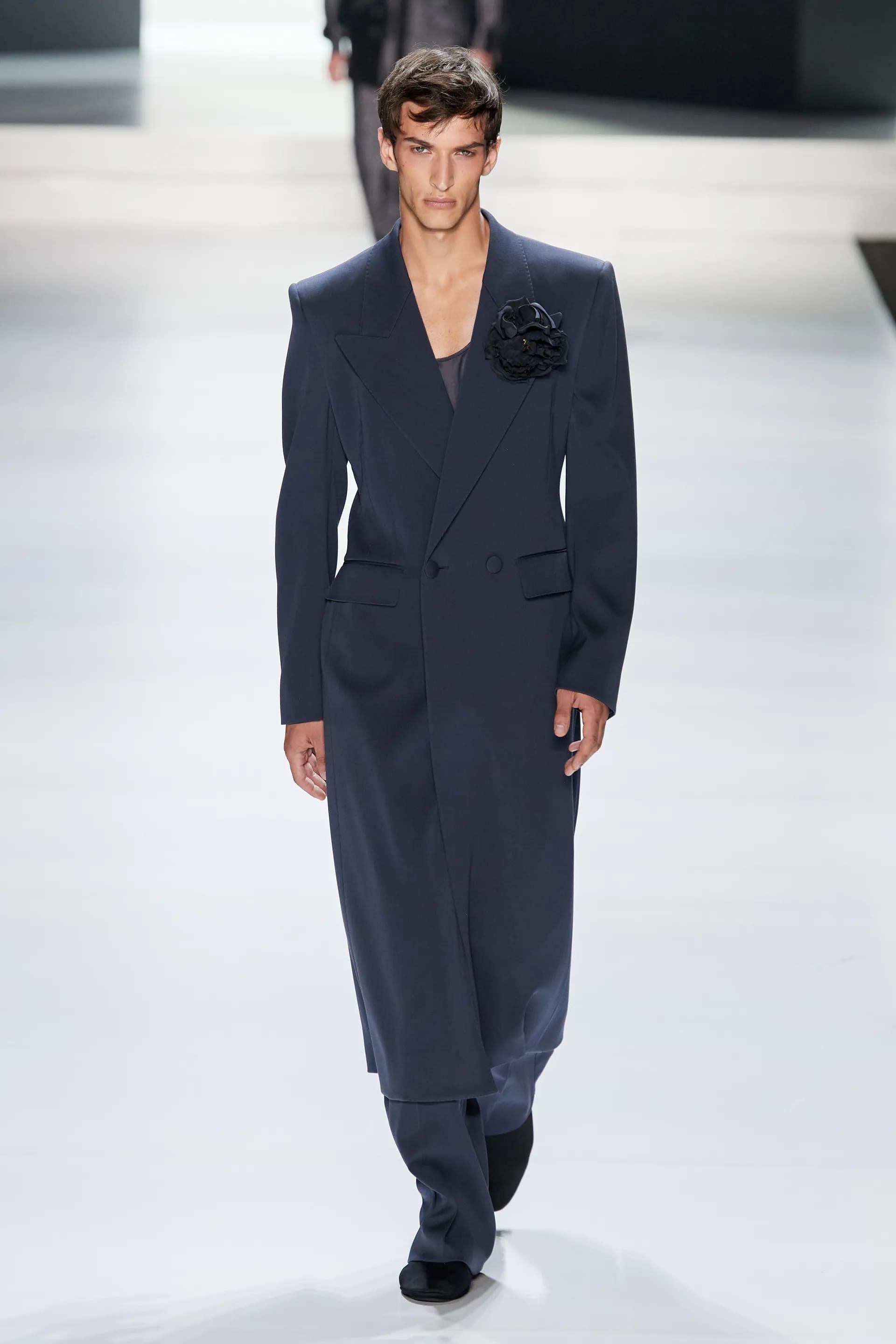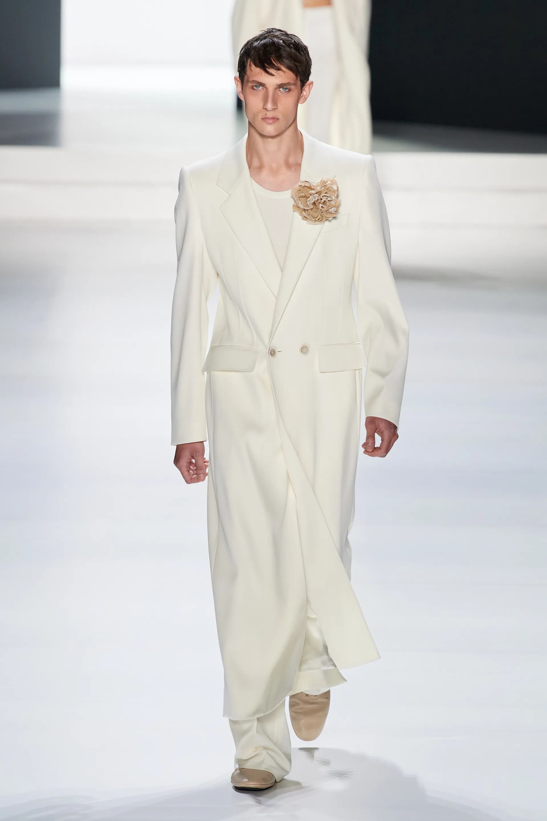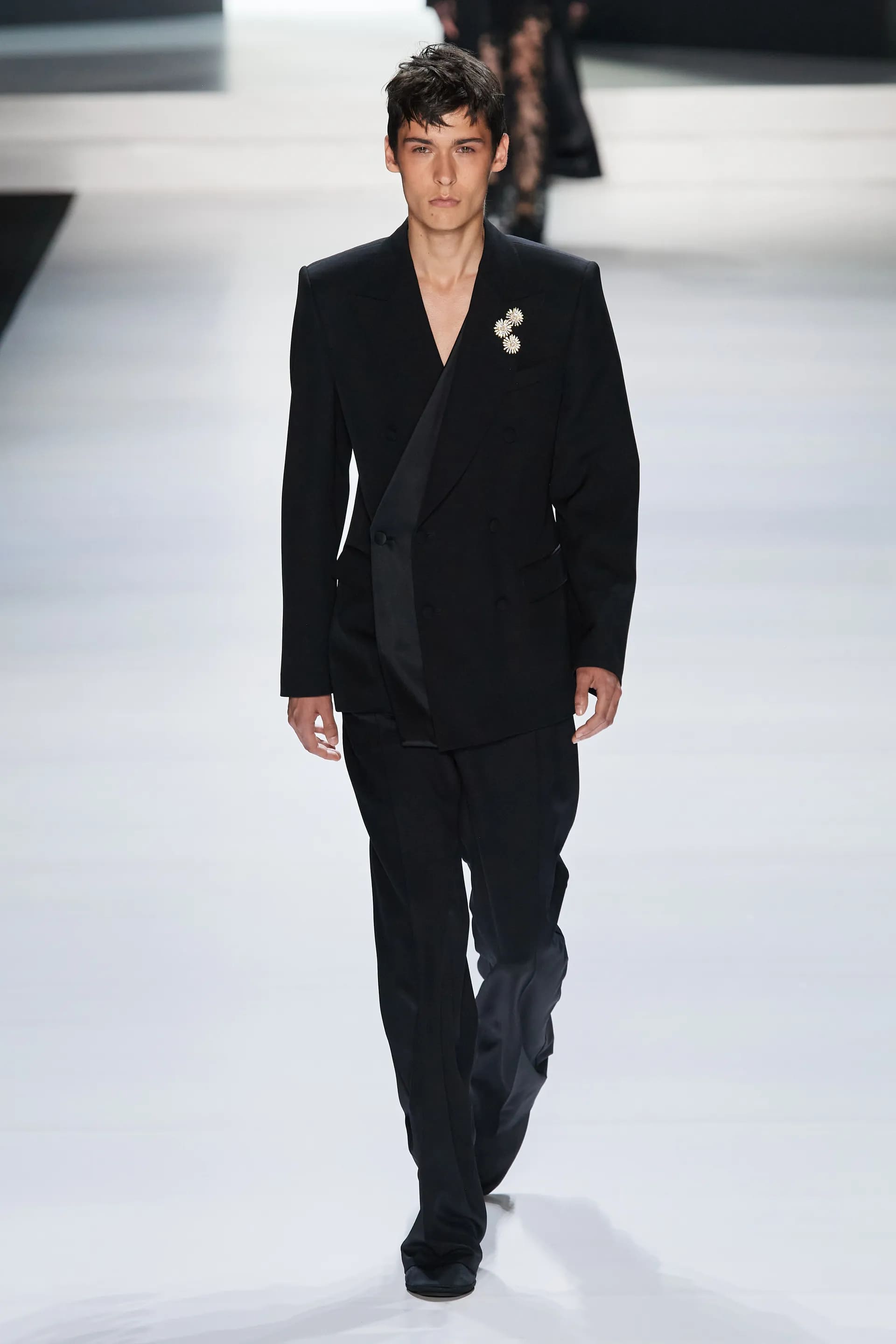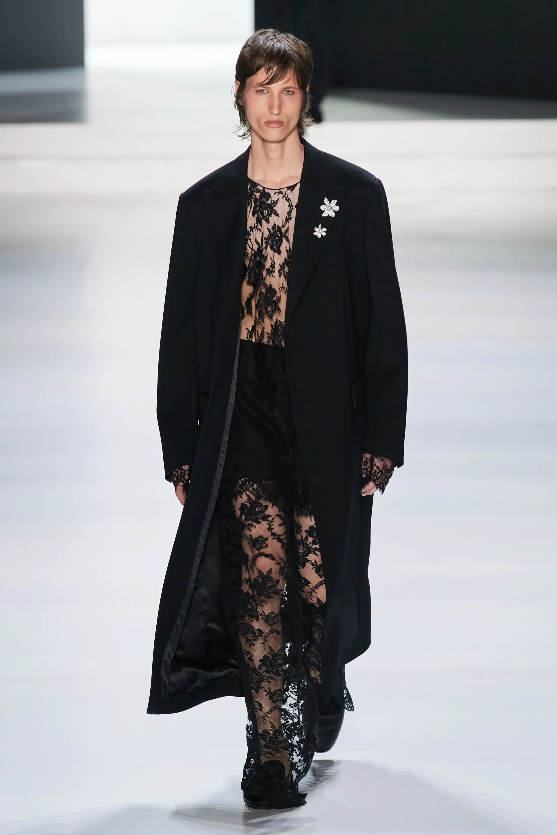 Під центральний саундтрек Anyma — The Answer на подіумі з’явилися ансамблі, які підкреслюють чоловічий силует структурованими об’ємами та техніками багатошаровості. Особливим акцентом стають квіти у формі вишивки, прикрас на лацканах піджаків або комірцях сорочок.