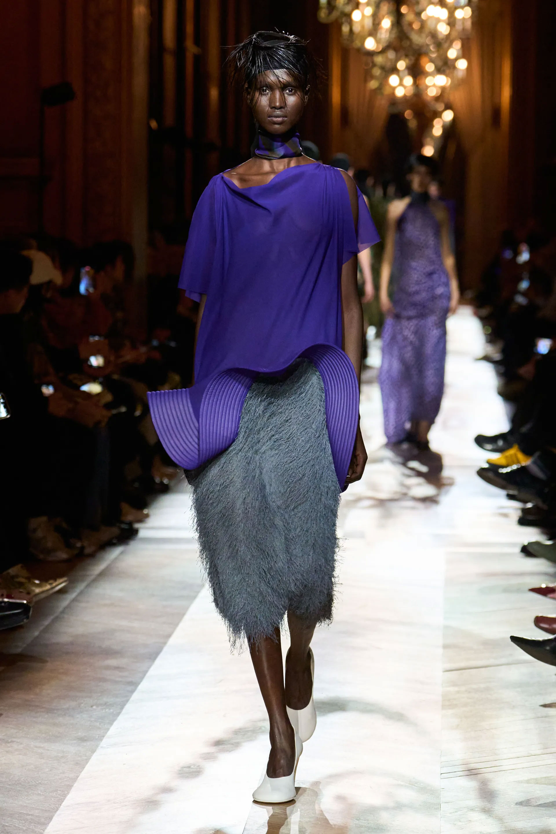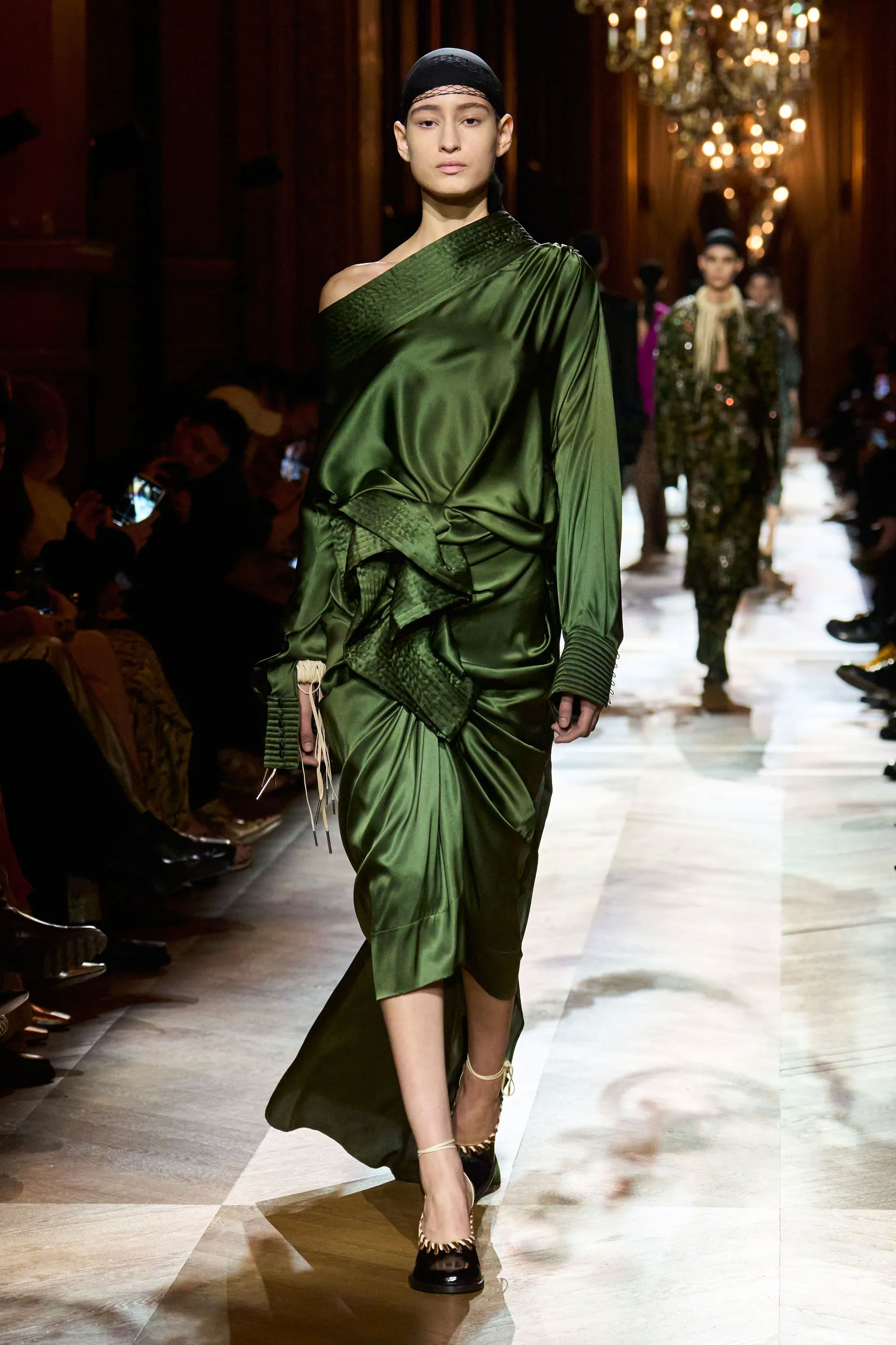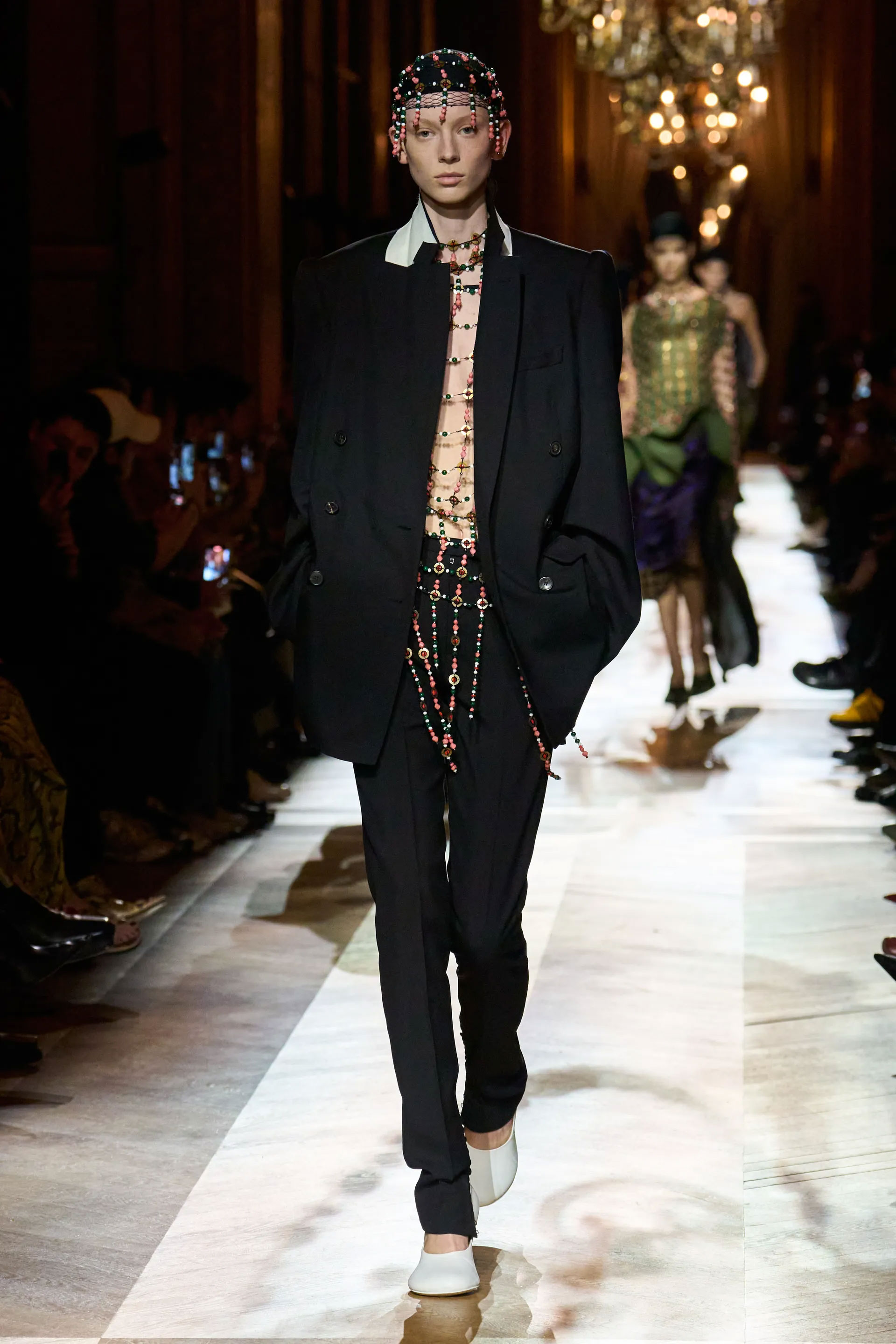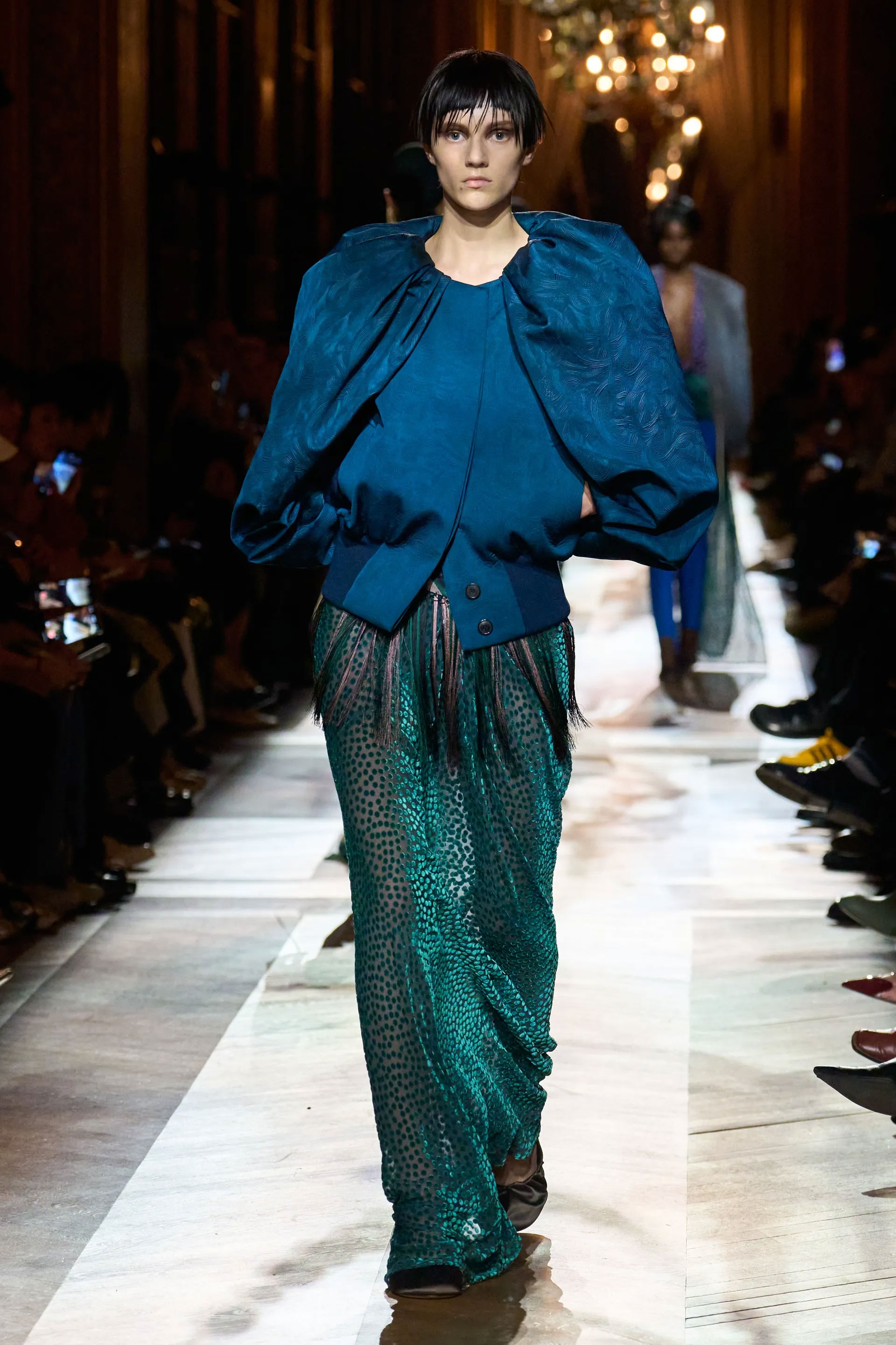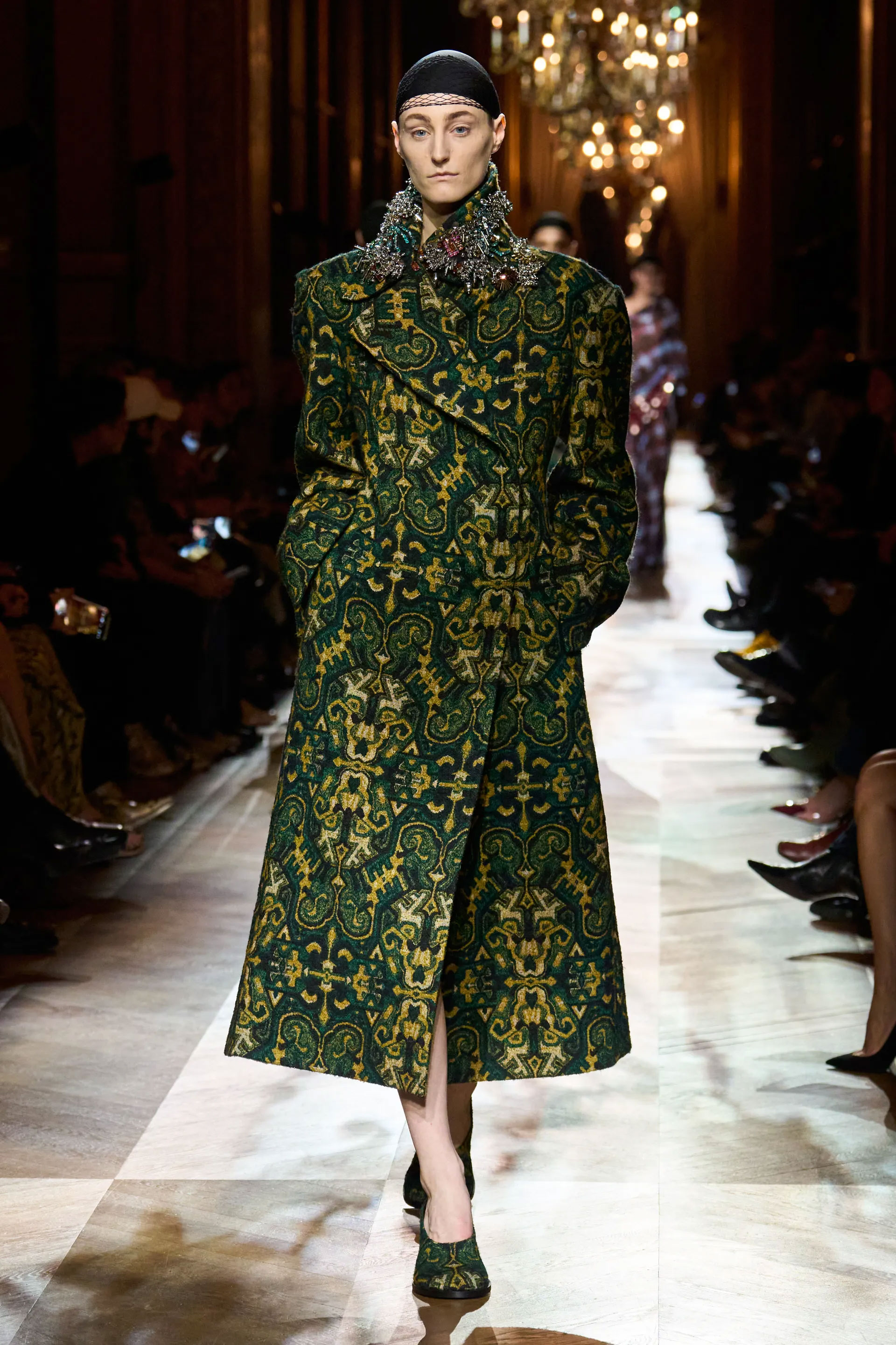 На тлі розкішних люстр моделі виходили в силуетах, що були покликані передати історії з уяви, елегантність інших епох у дусі сьогодення. Образи також відсилали до тепер переосмислених основоположних кодів Dries Van Noten — різноманіття принтів в одному ансамблі, колірної гармонії, гри з комбінацією фактур та тканин, незвичайного одягу, що інтегрується у звичайне життя.