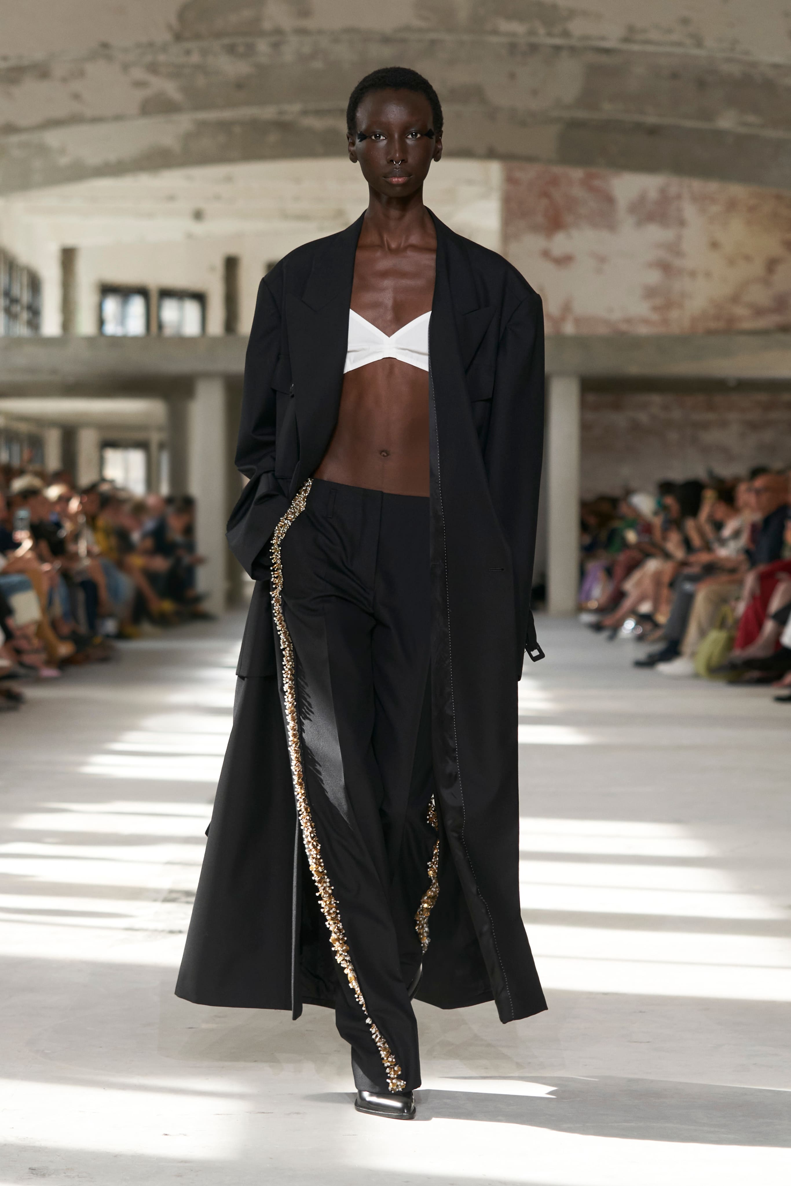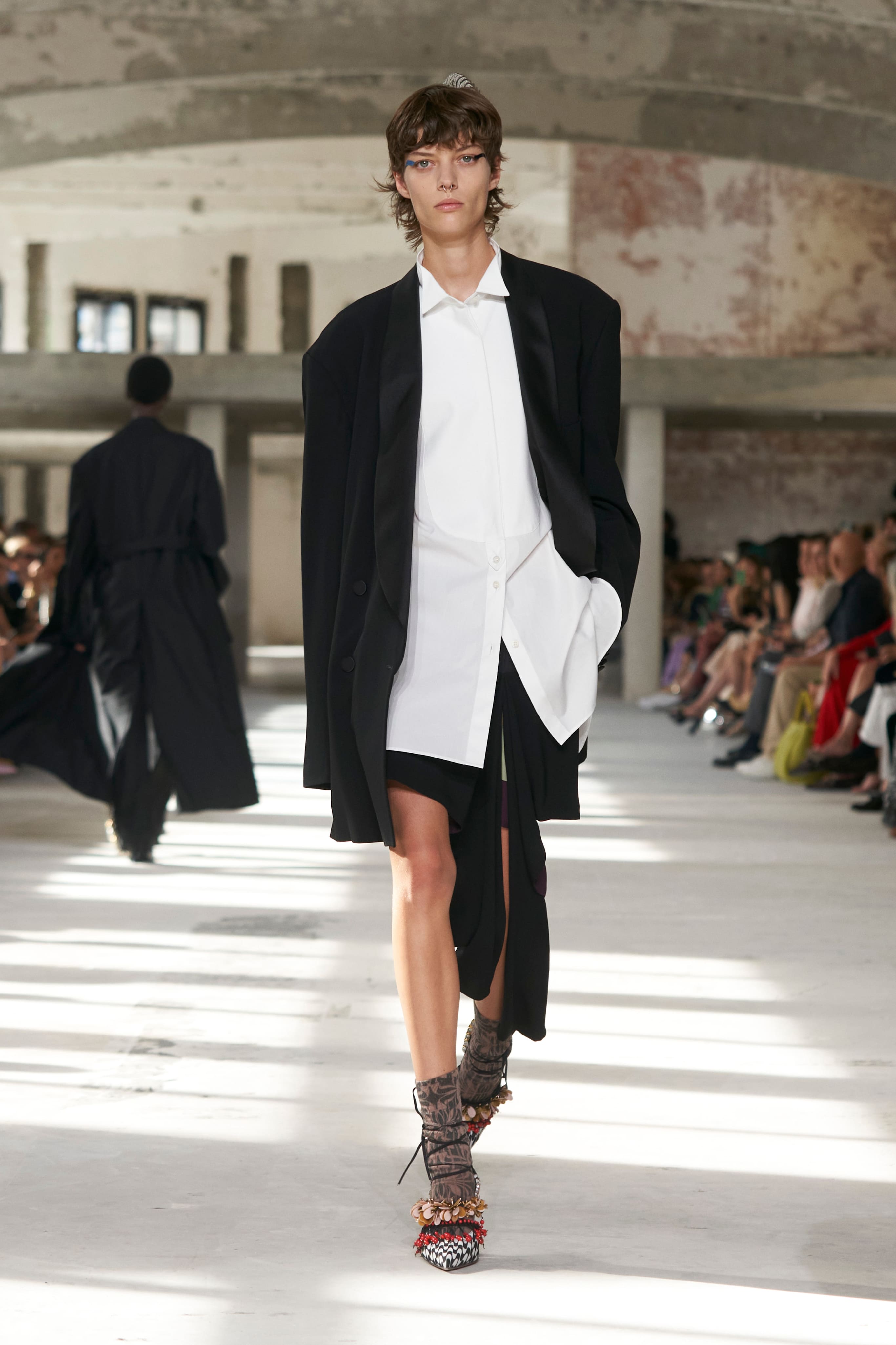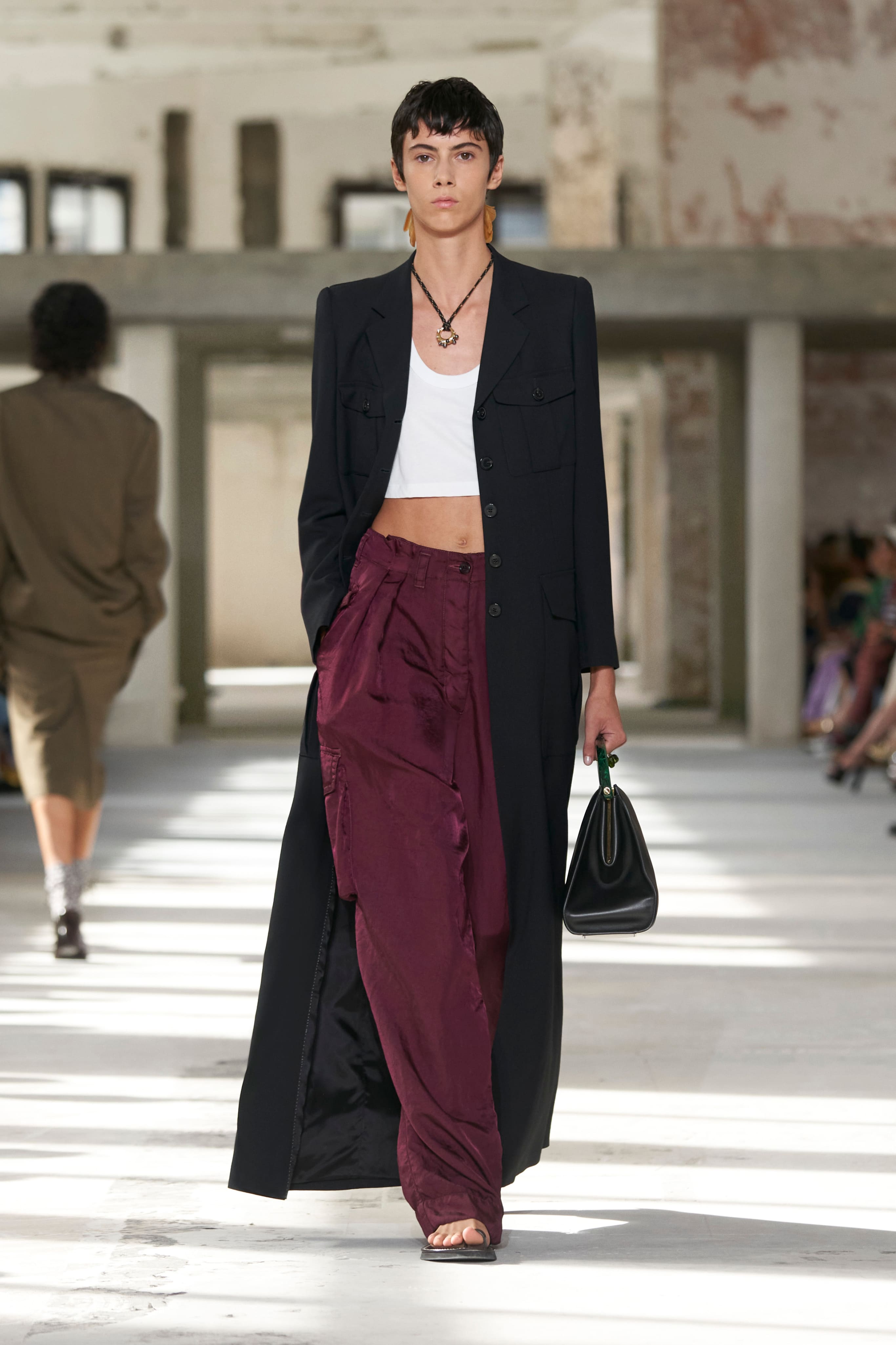 Всесвіт Dries Van Noten підкреслив власну синергію вкрапленням айтемів із чоловічої колекції весна-літо 2024. Тоді дизайнер експериментував із концепцією маскулінності, представивши прозорі тканини, блискучі шорти та строгі пальта. Ці мотиви перекочували в жіночу колекцію — всесвіт ван Нотена залишається цілісним.