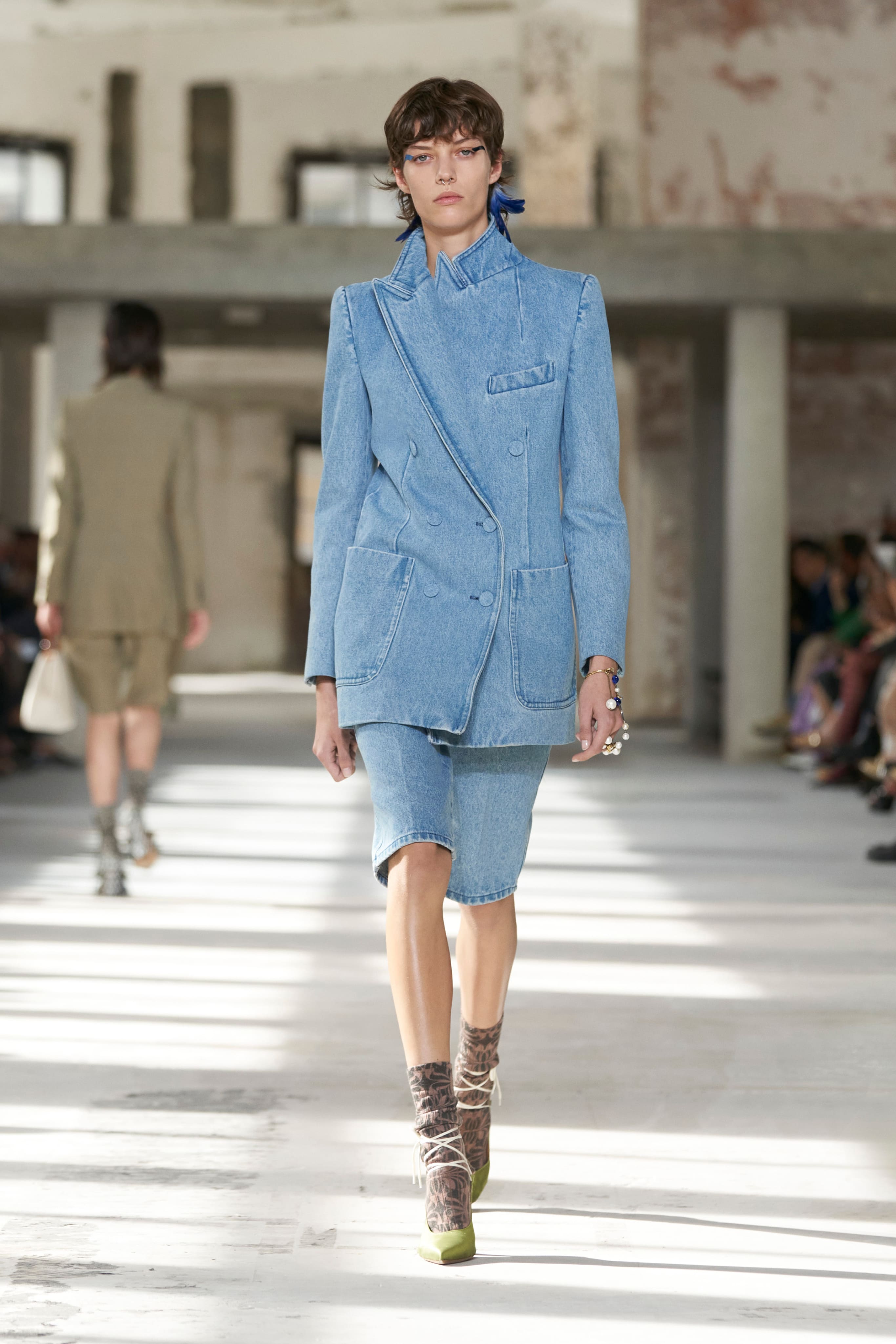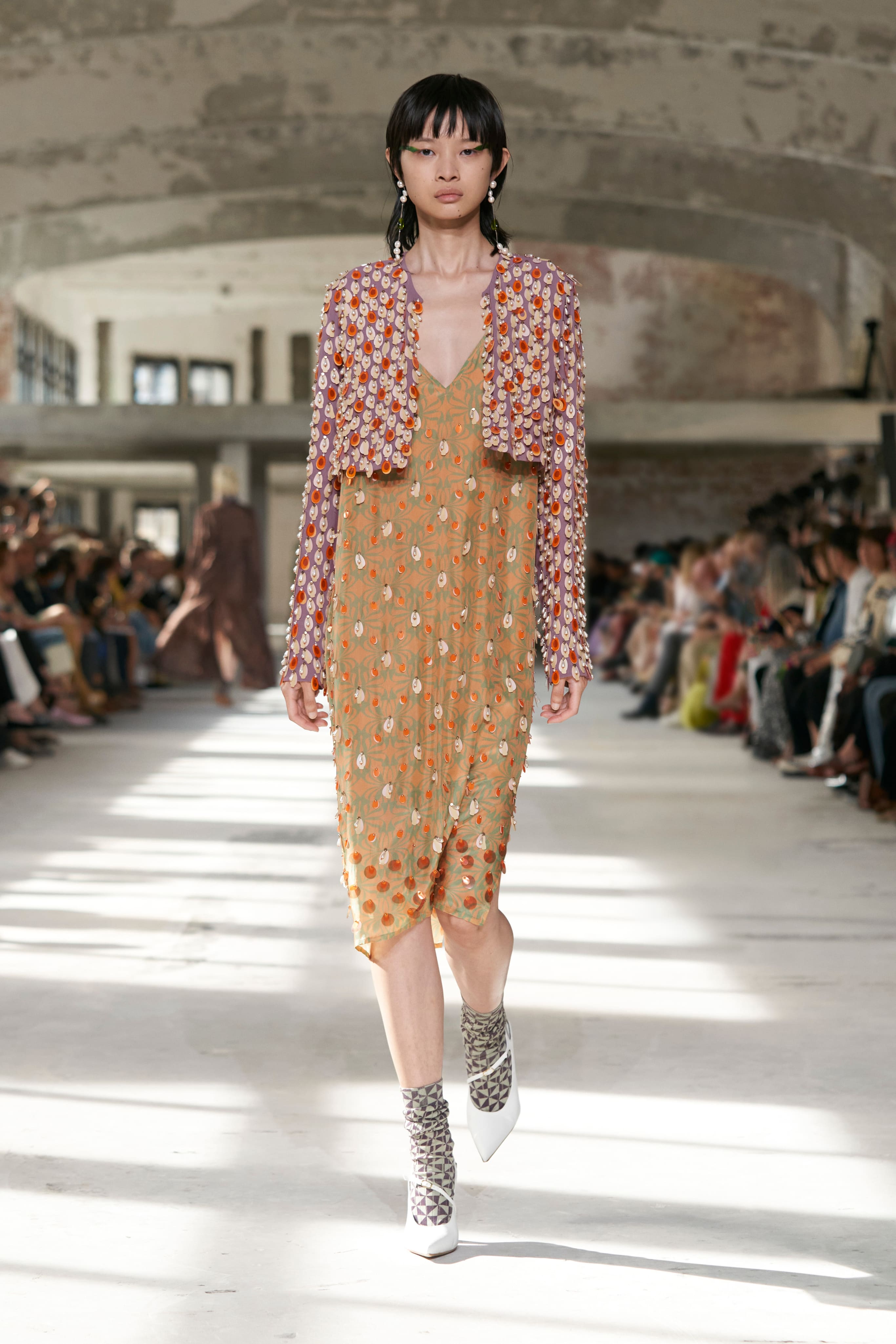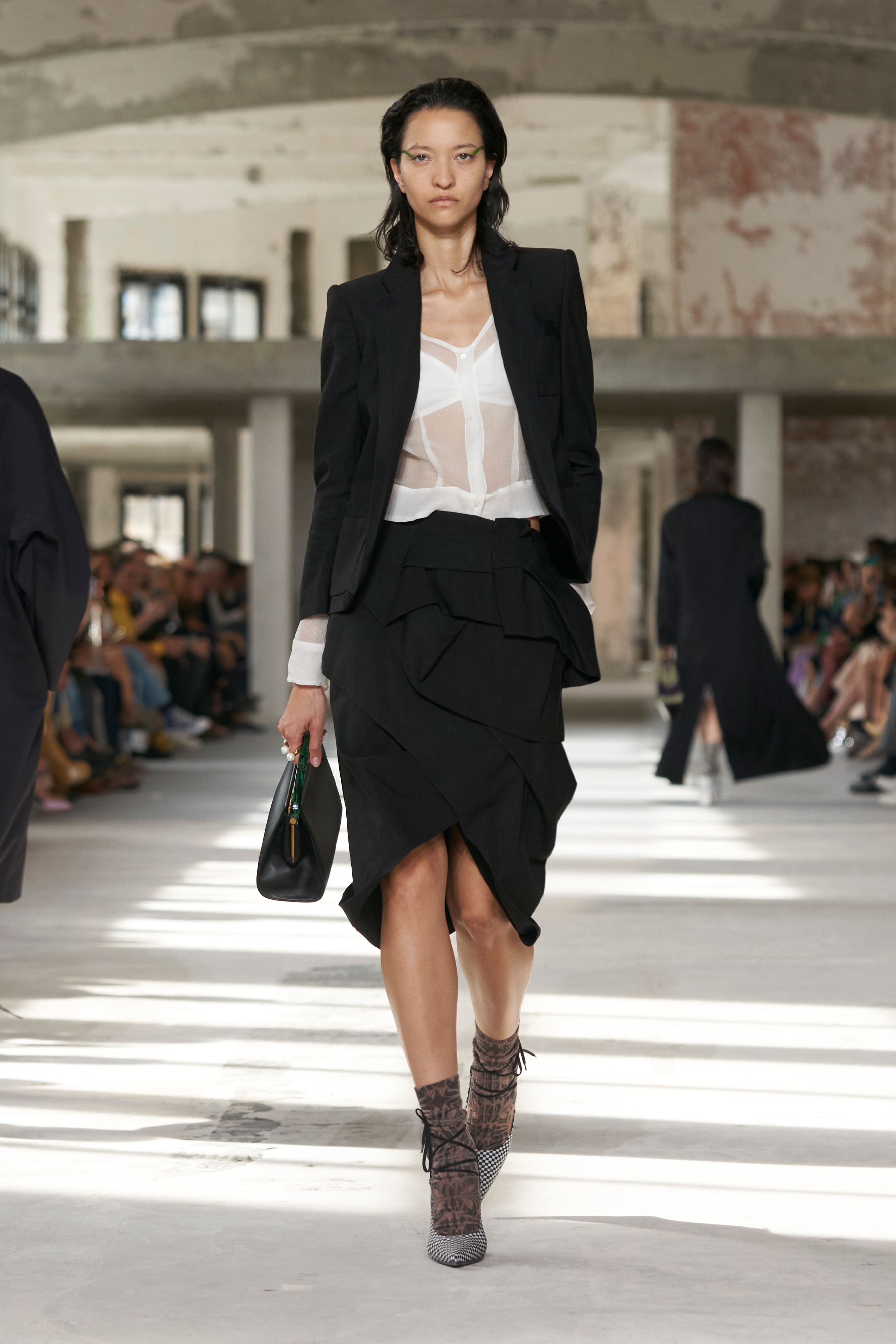 Всесвіт Dries Van Noten підкреслив власну синергію вкрапленням айтемів із чоловічої колекції весна-літо 2024. Тоді дизайнер експериментував із концепцією маскулінності, представивши прозорі тканини, блискучі шорти та строгі пальта. Ці мотиви перекочували в жіночу колекцію — всесвіт ван Нотена залишається цілісним.