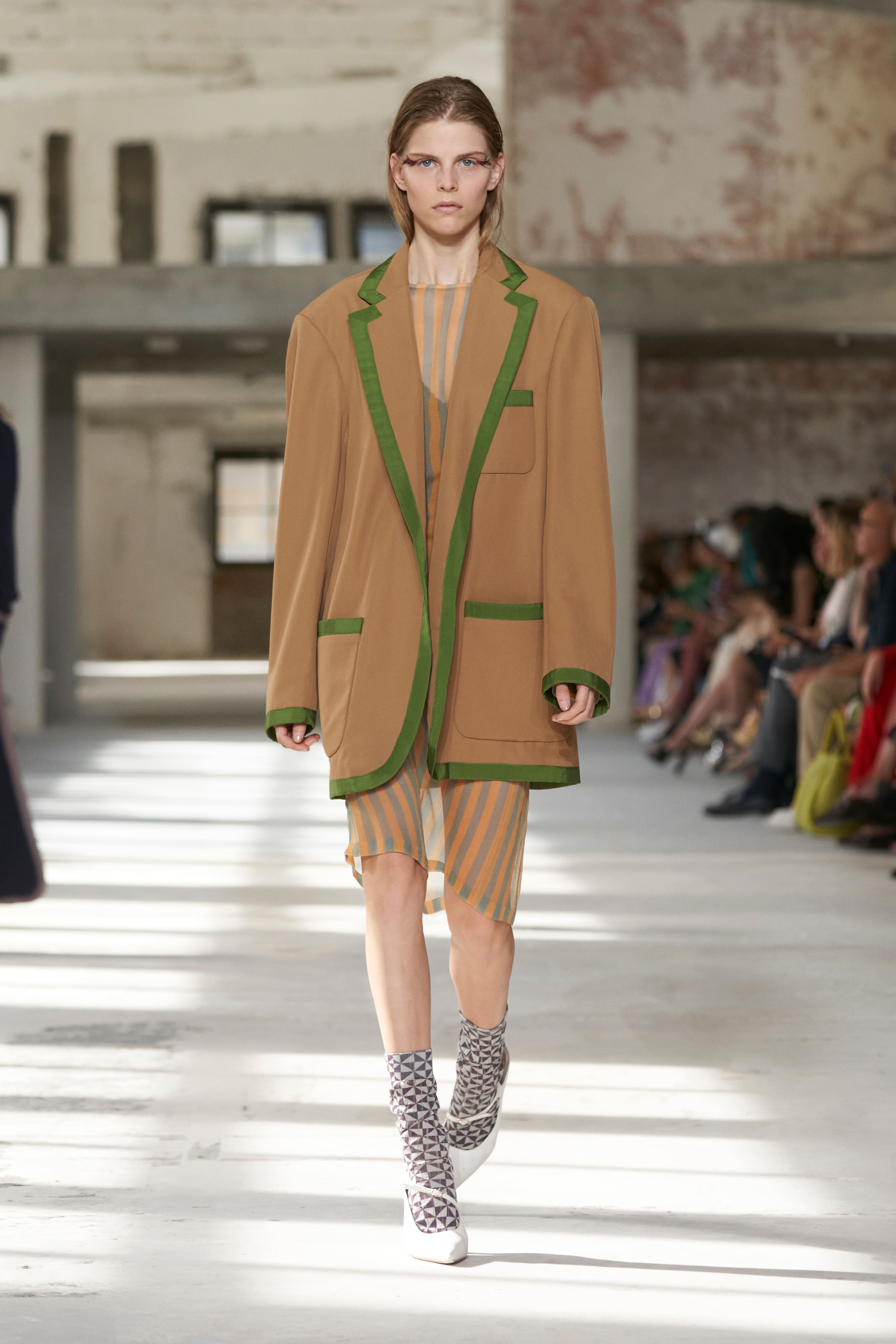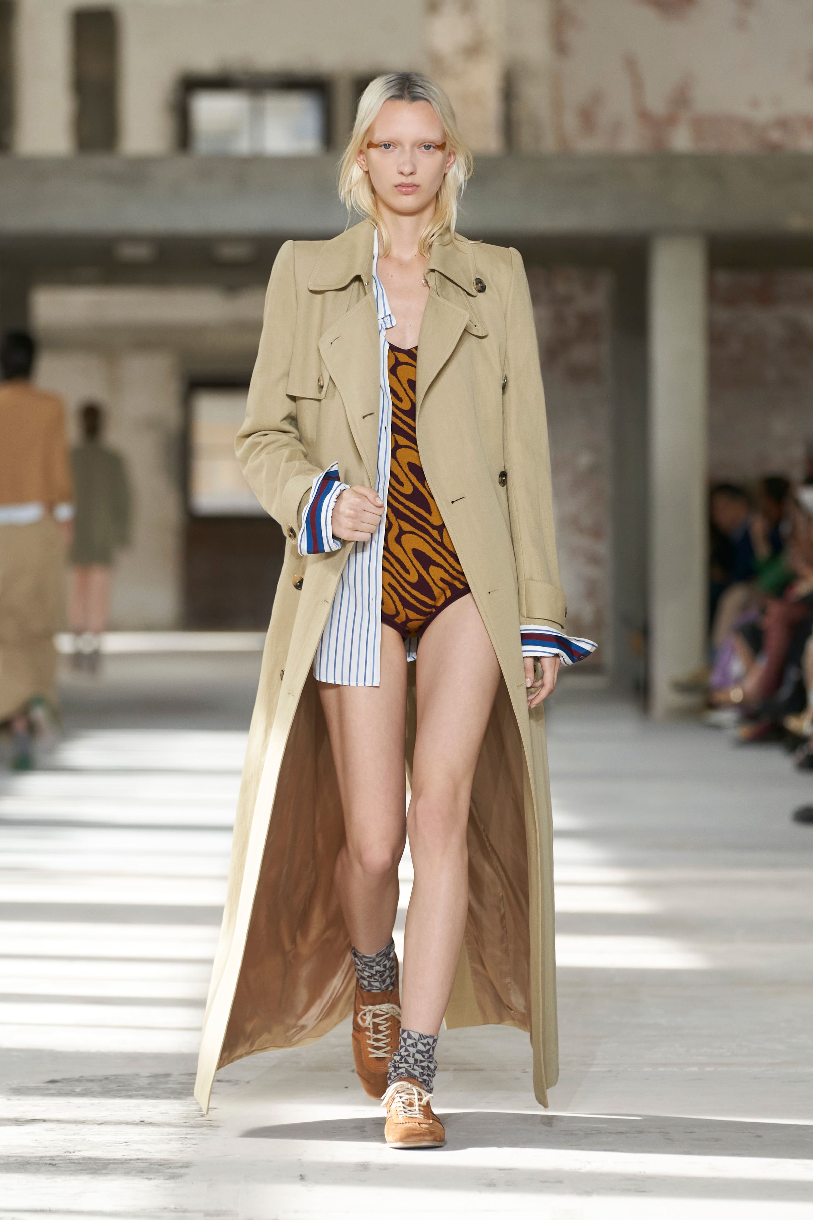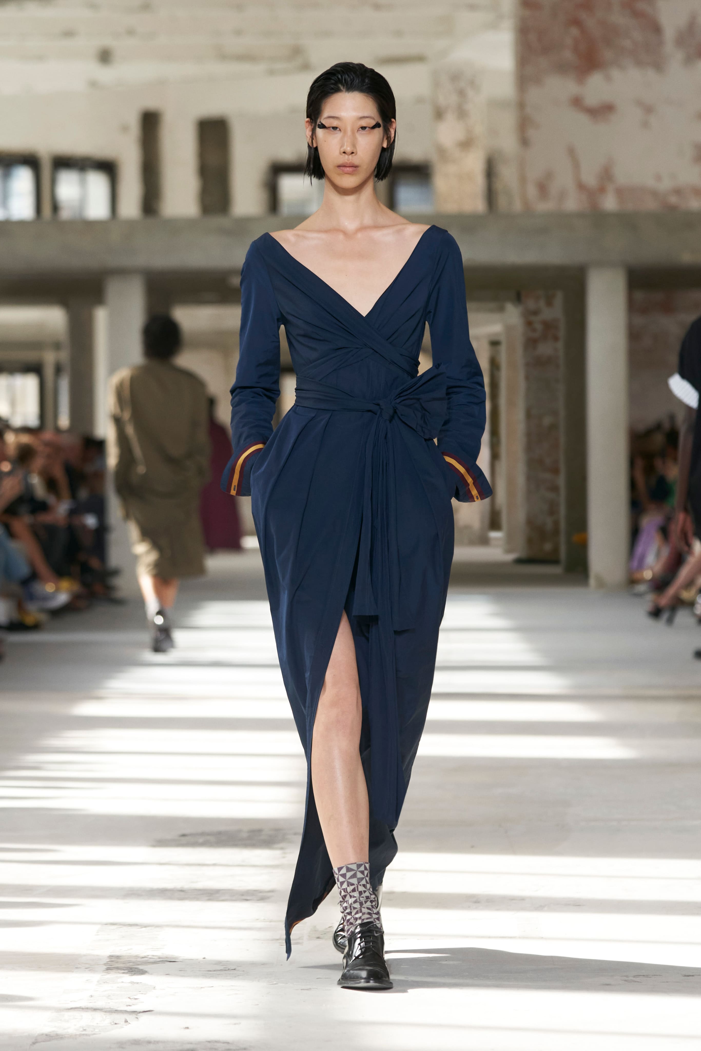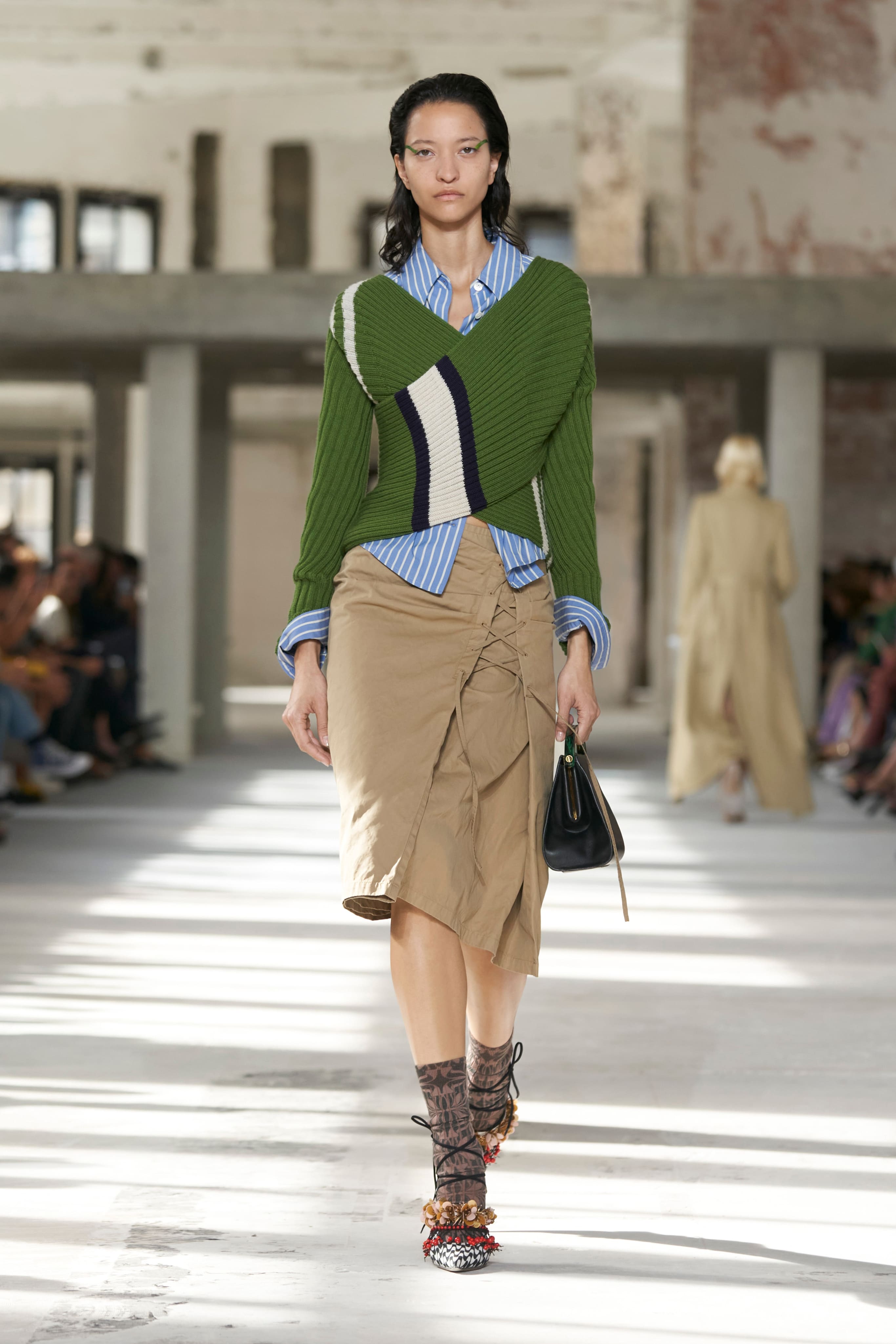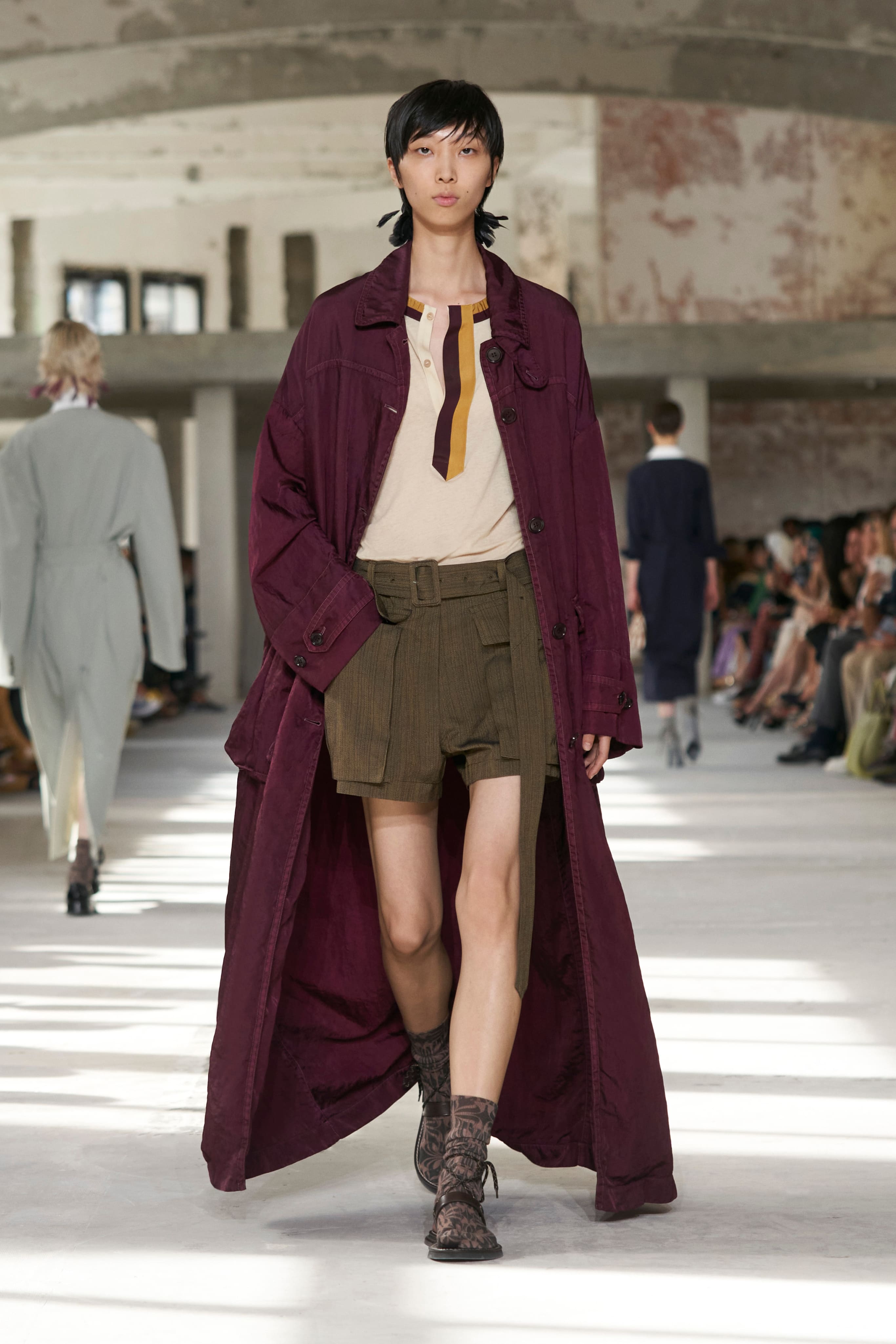 Бренд Dries Van Noten презентував одяг для реального життя у незвичній формі. На тлі звуків дощу показ розпочався ансамблями зі спідниць-карго кольору хакі, структурних піджаків та пальт. Водночас топи, сорочки та сукні прикрашала вертикальна й горизонтальна смужка. Чільне місце посів спортивний шик — регбійна уніформа втілилася в оверсайз поло.