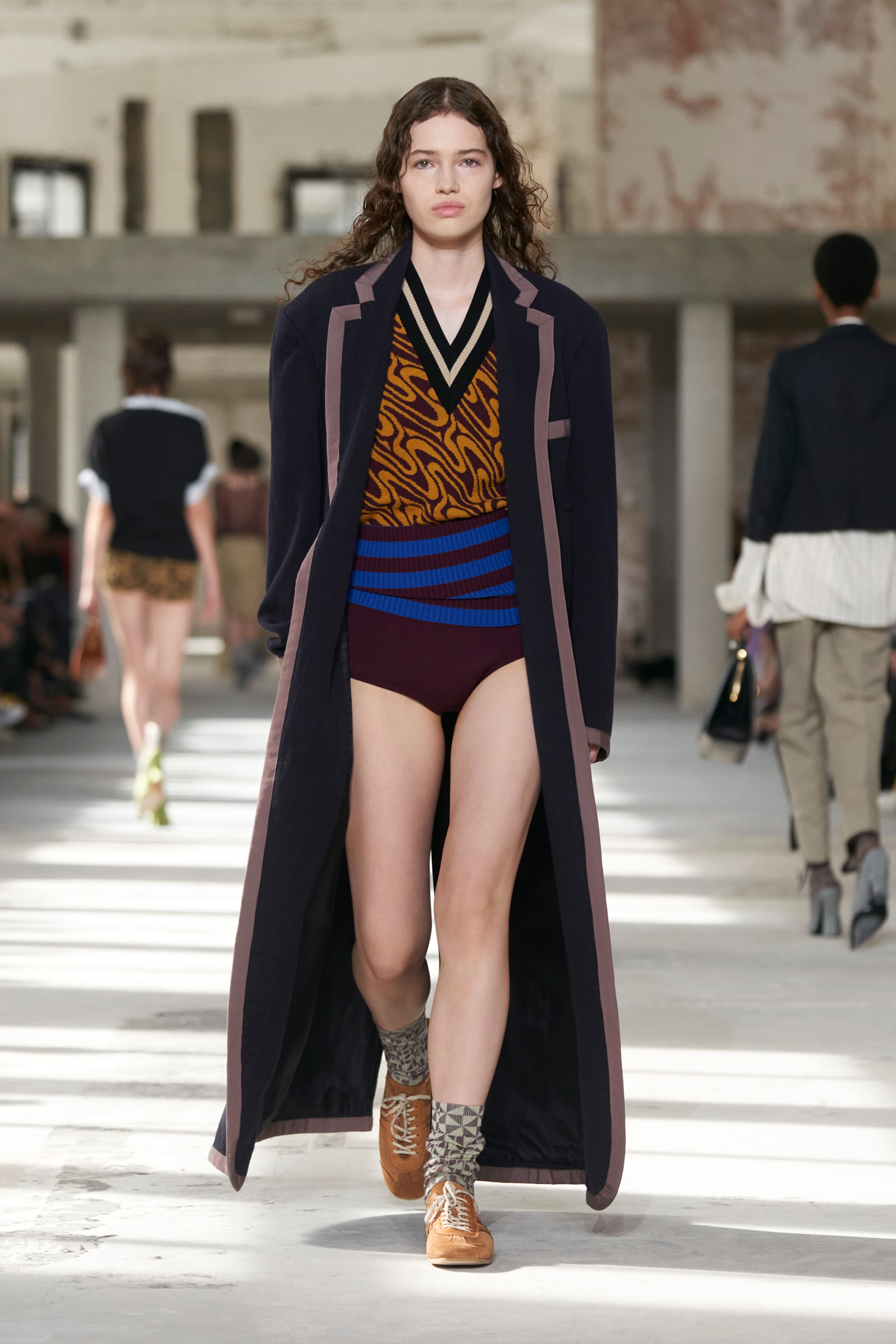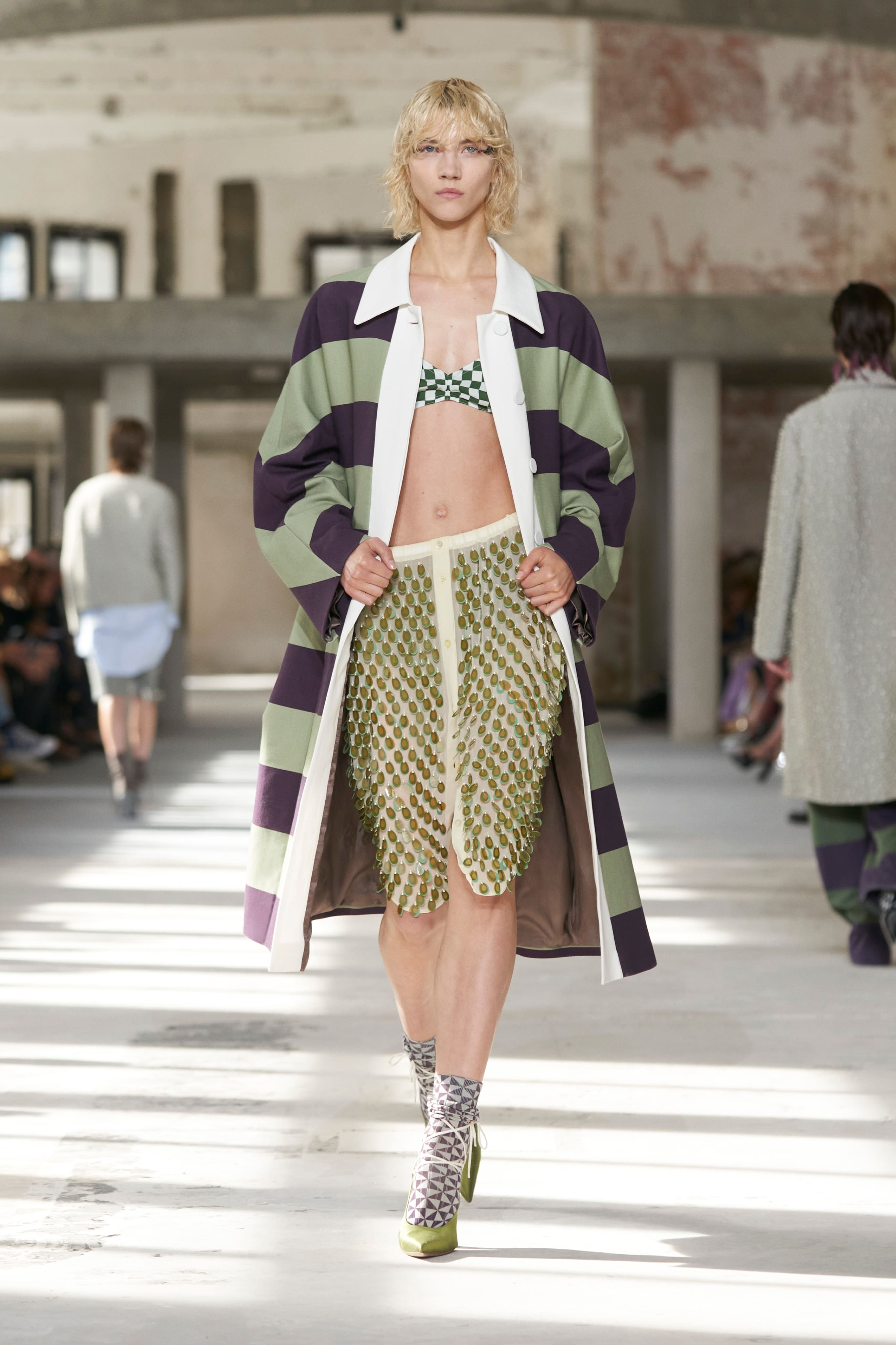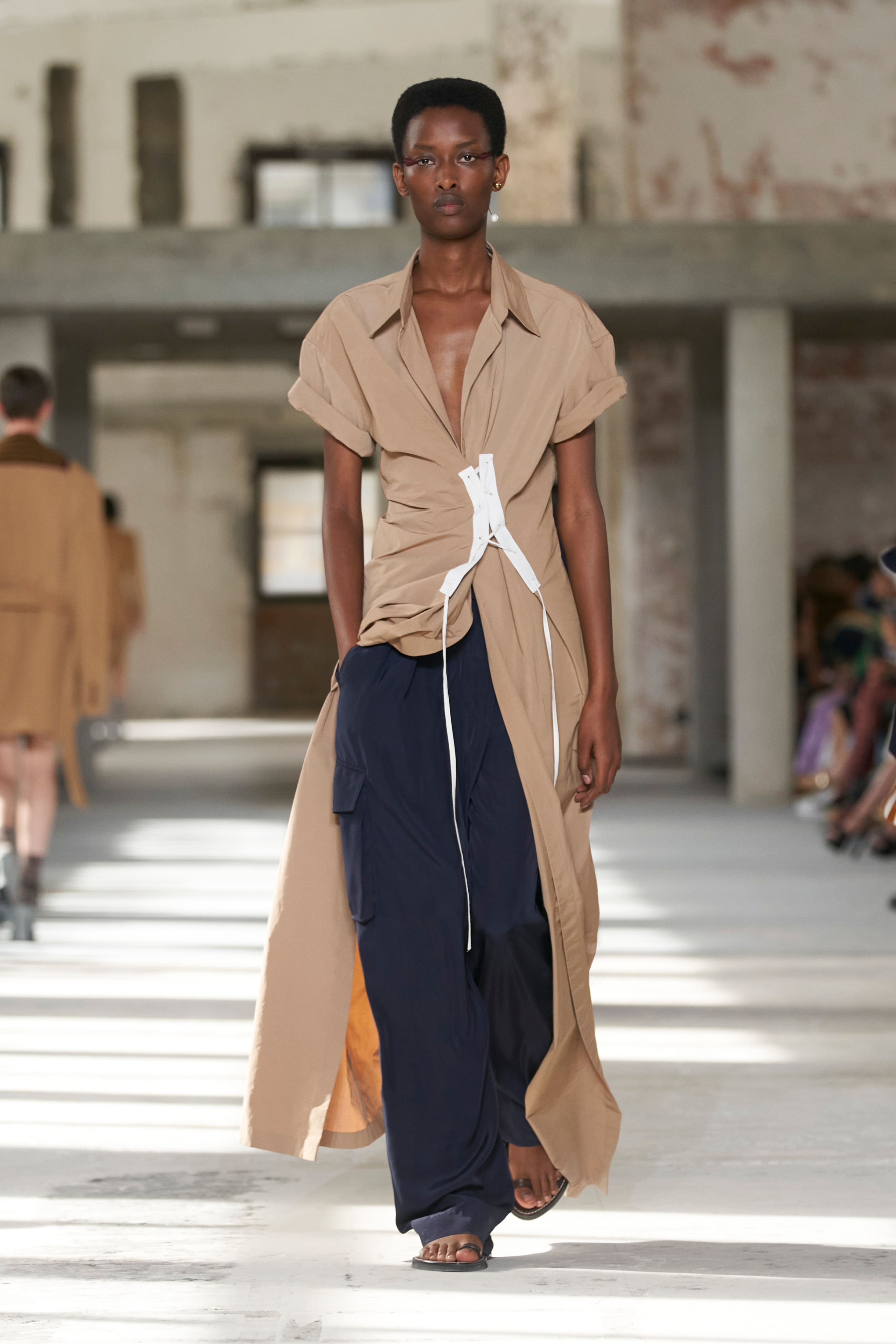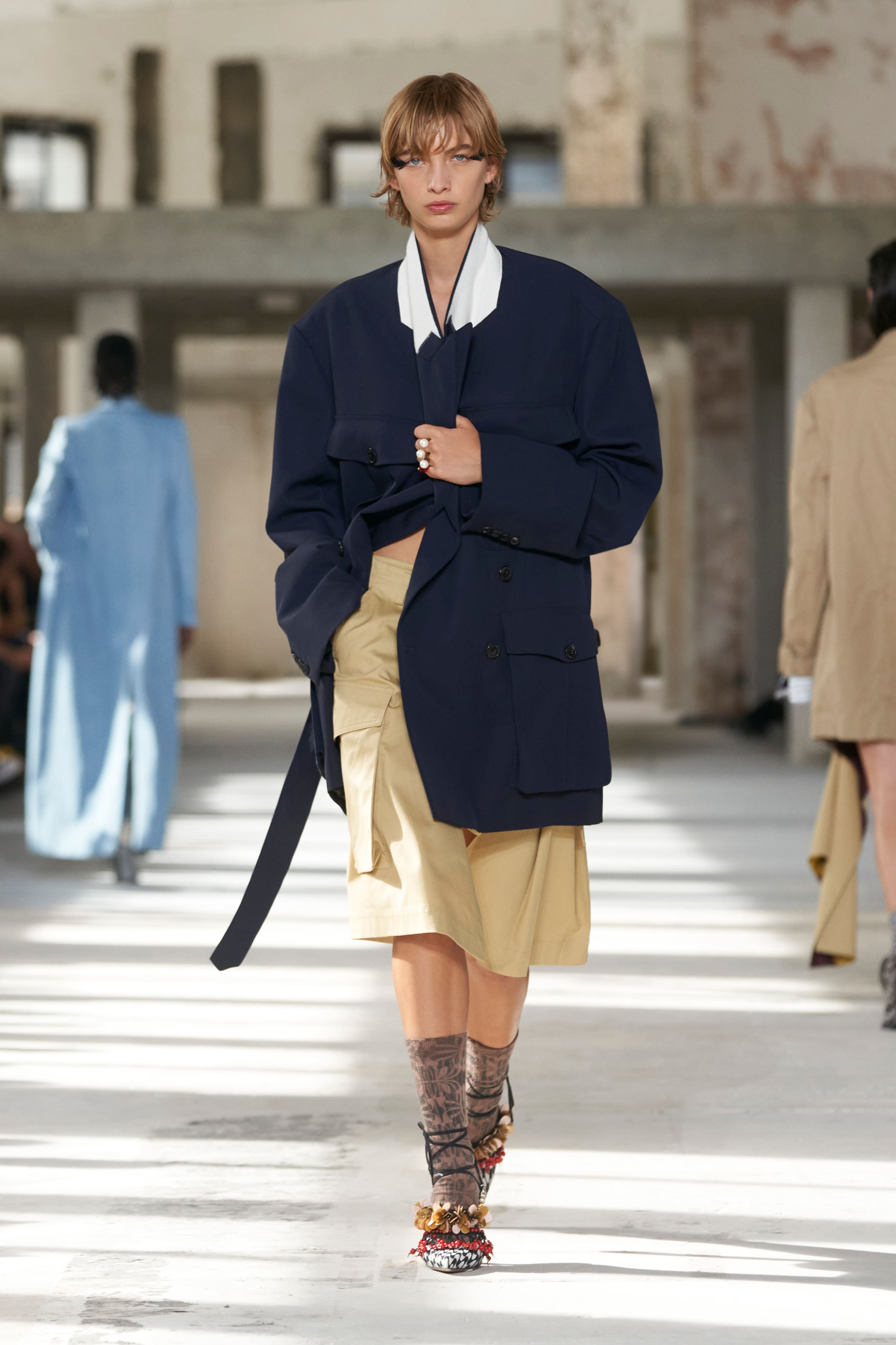 Бренд Dries Van Noten презентував одяг для реального життя у незвичній формі. На тлі звуків дощу показ розпочався ансамблями зі спідниць-карго кольору хакі, структурних піджаків та пальт. Водночас топи, сорочки та сукні прикрашала вертикальна й горизонтальна смужка. Чільне місце посів спортивний шик — регбійна уніформа втілилася в оверсайз поло.