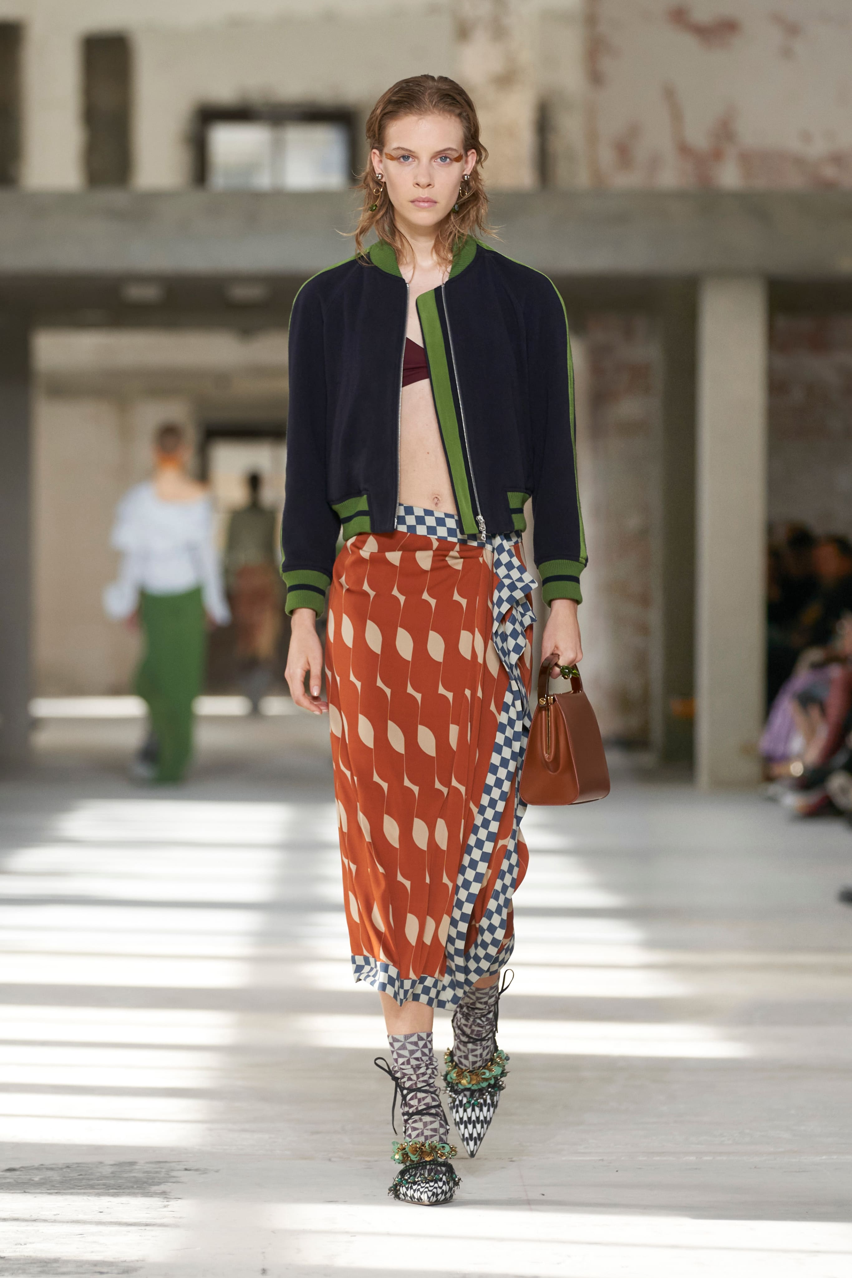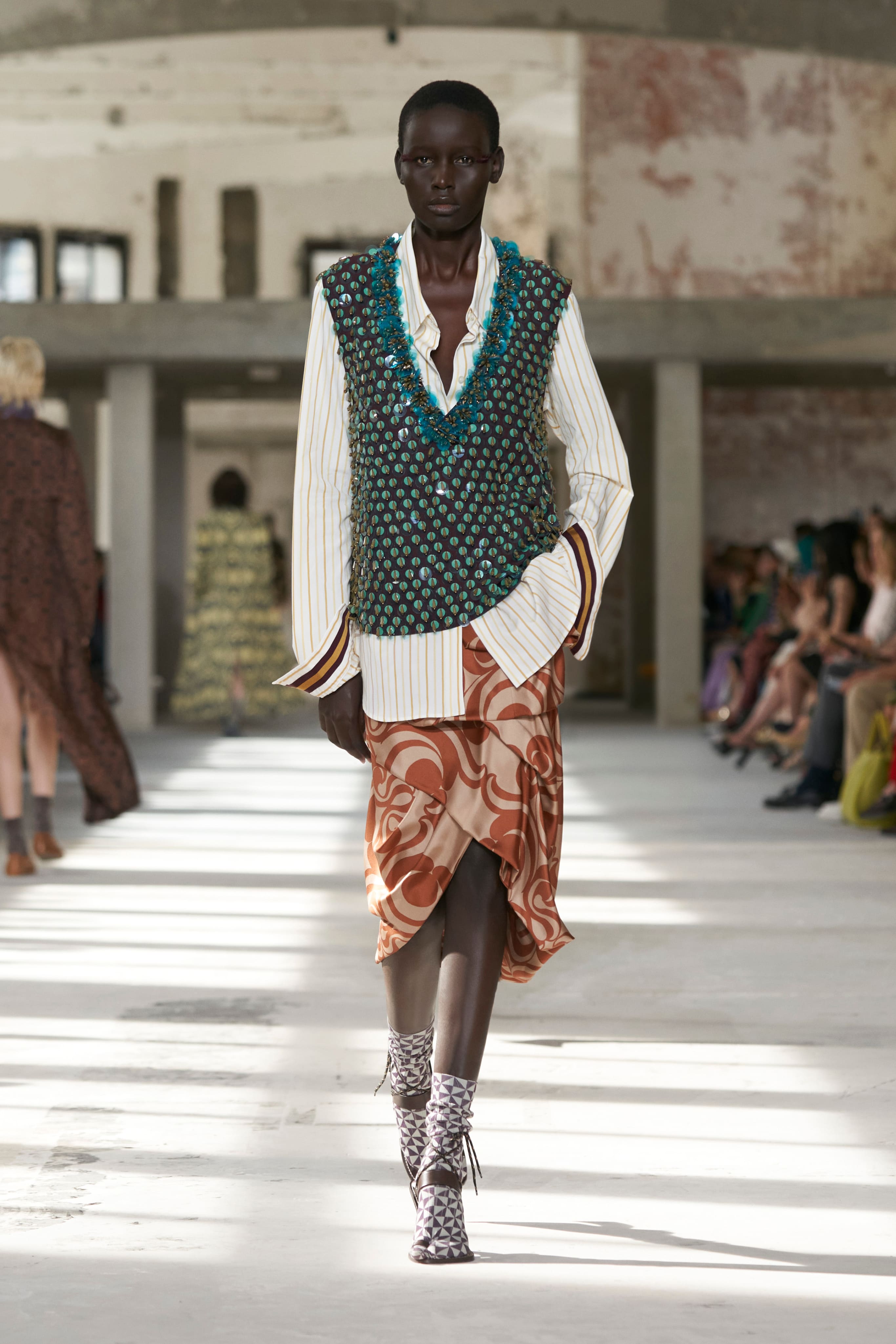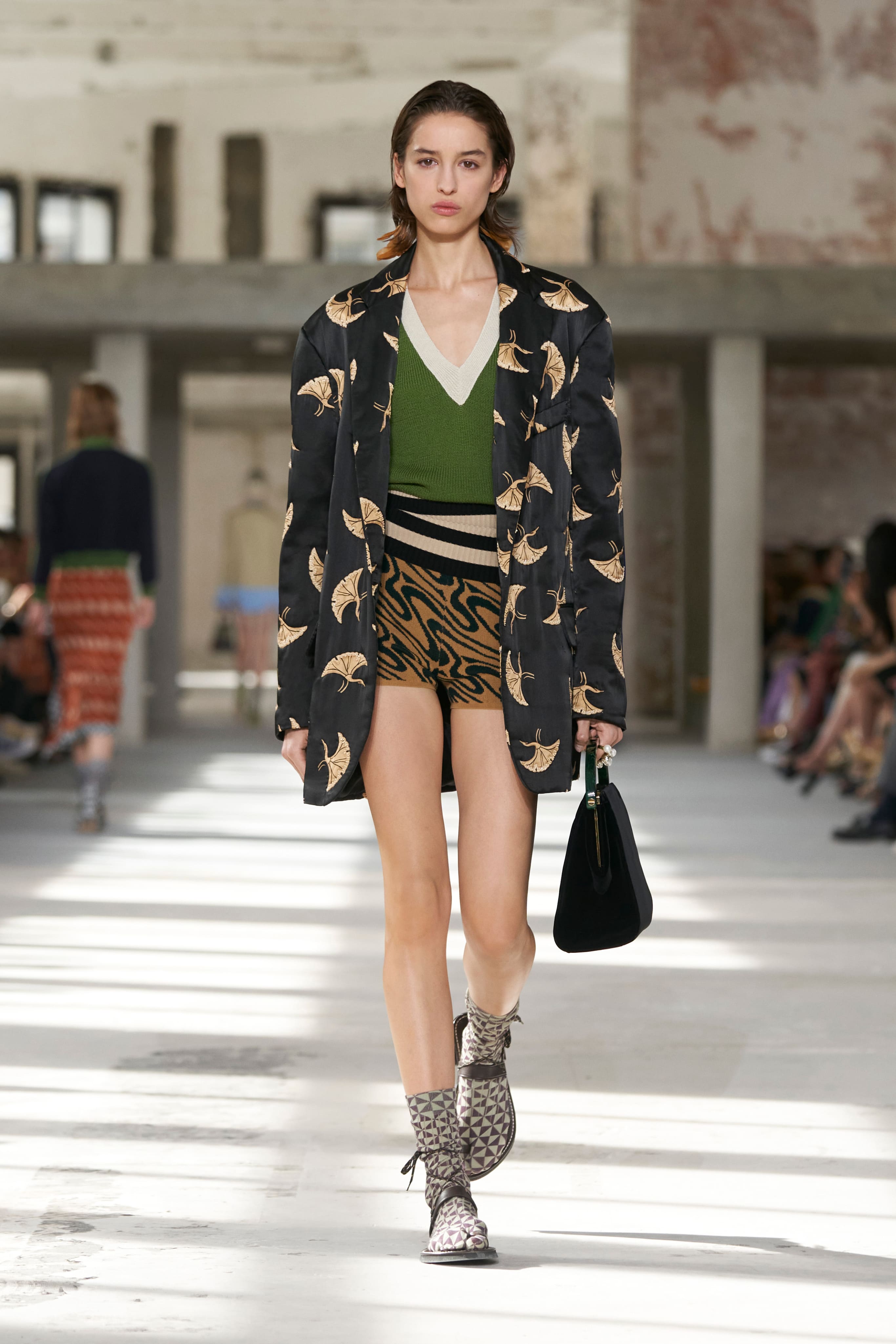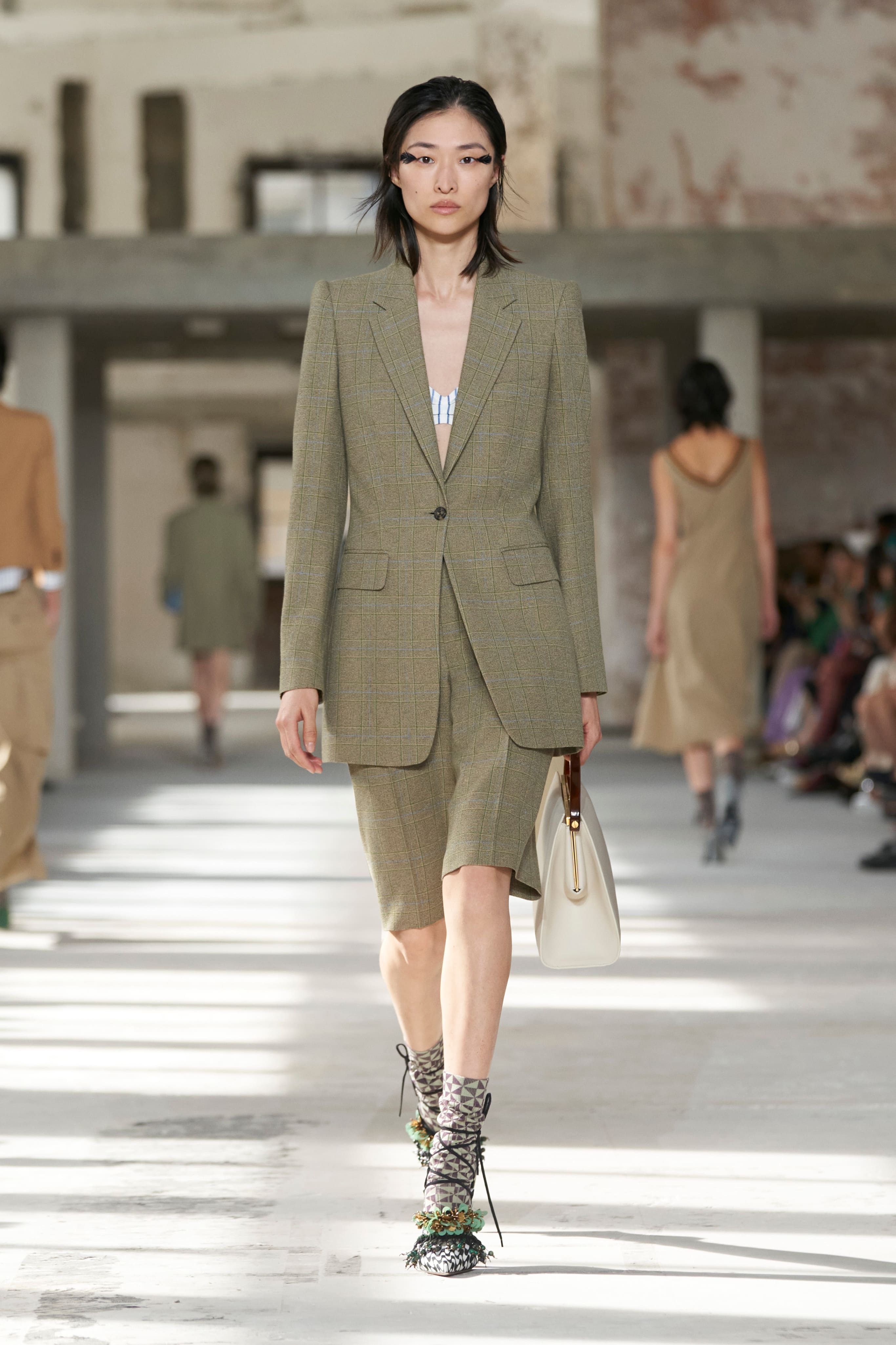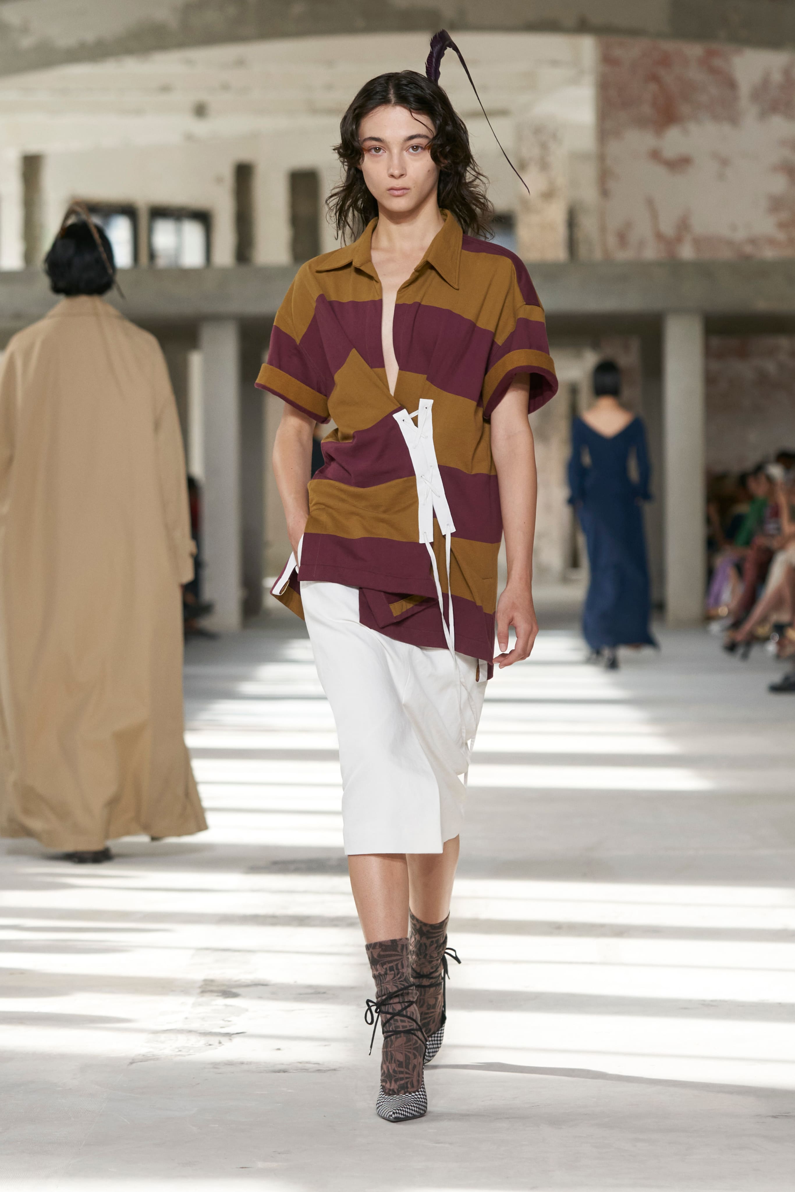 Бренд Dries Van Noten презентував одяг для реального життя у незвичній формі. На тлі звуків дощу показ розпочався ансамблями зі спідниць-карго кольору хакі, структурних піджаків та пальт. Водночас топи, сорочки та сукні прикрашала вертикальна й горизонтальна смужка. Чільне місце посів спортивний шик — регбійна уніформа втілилася в оверсайз поло.