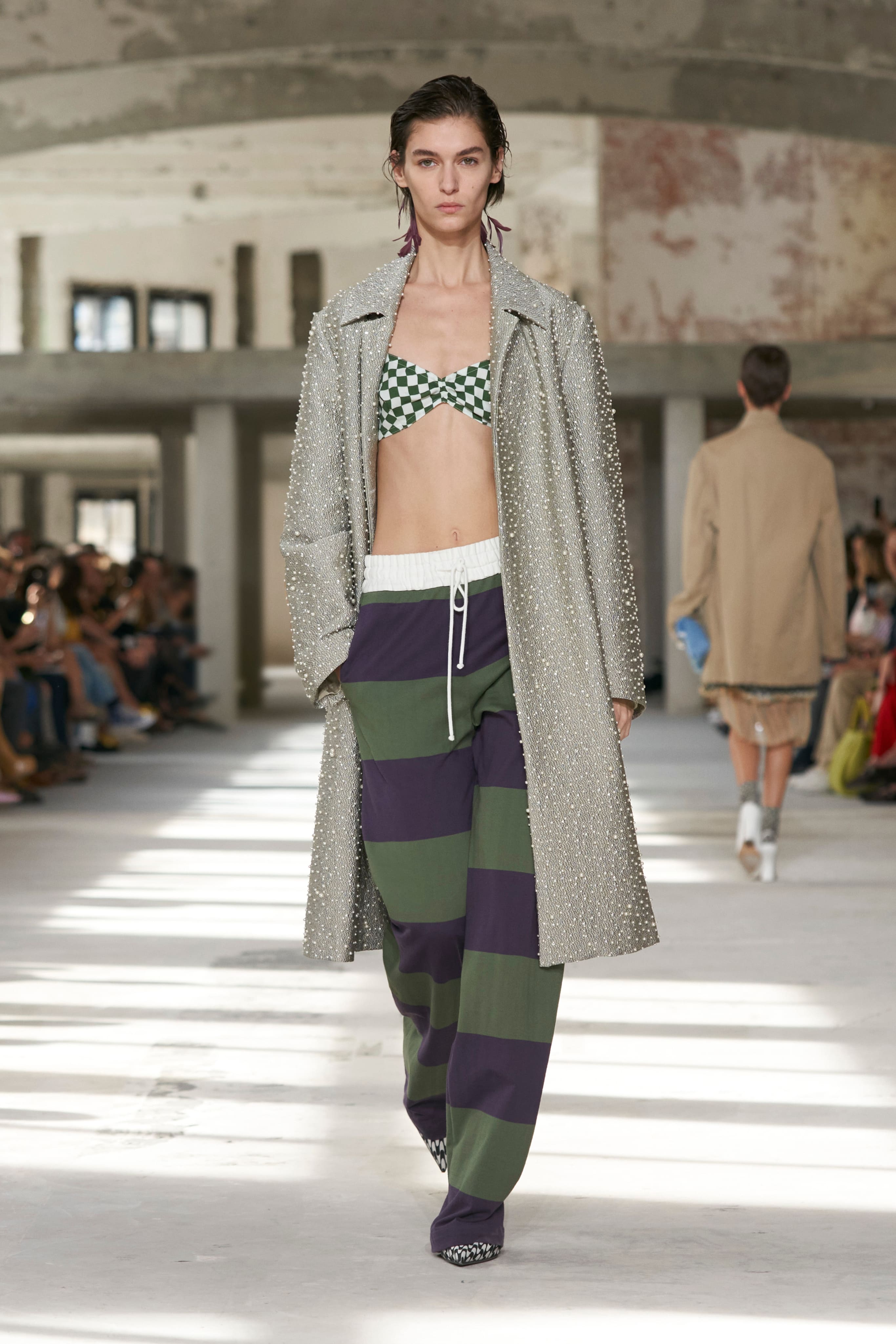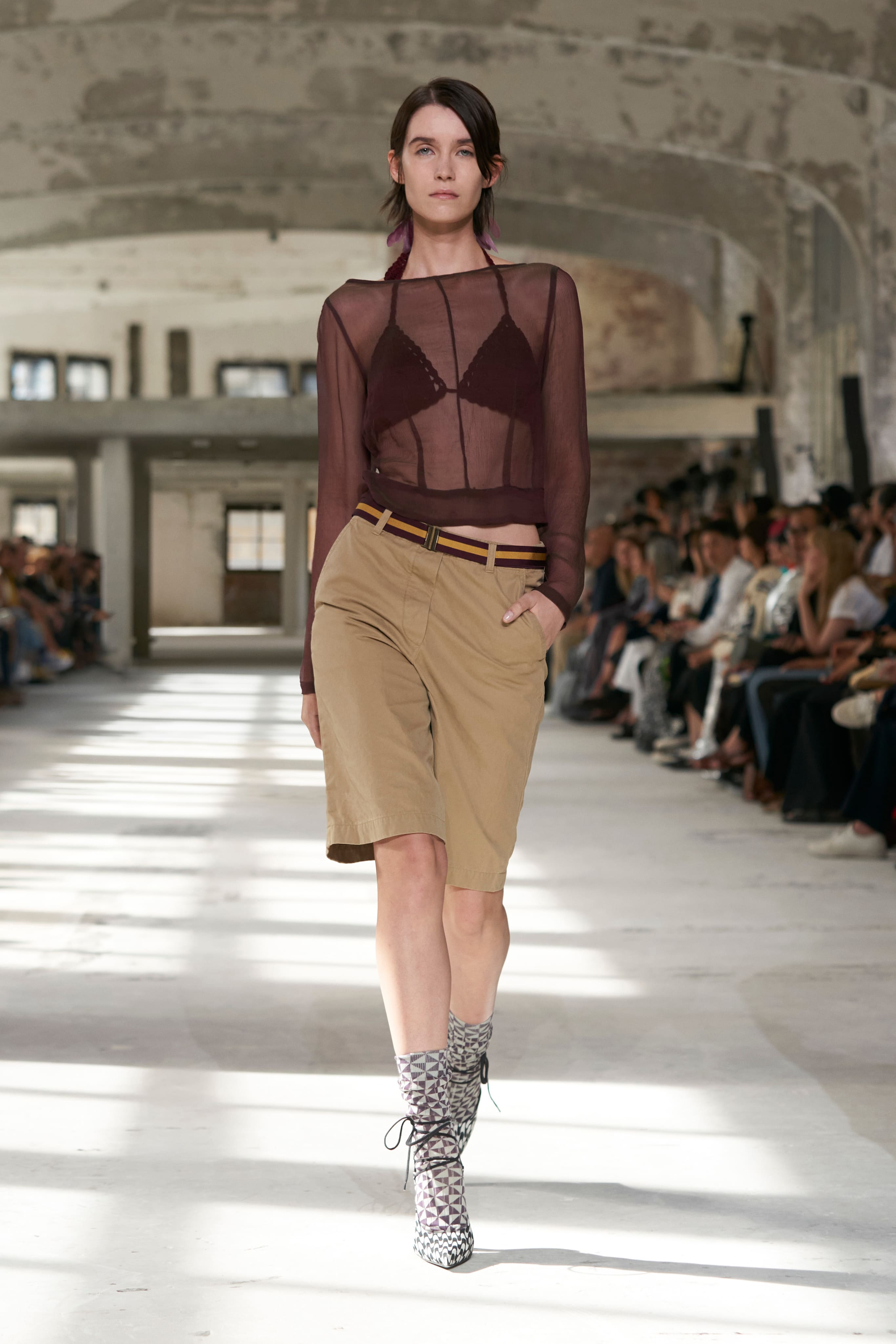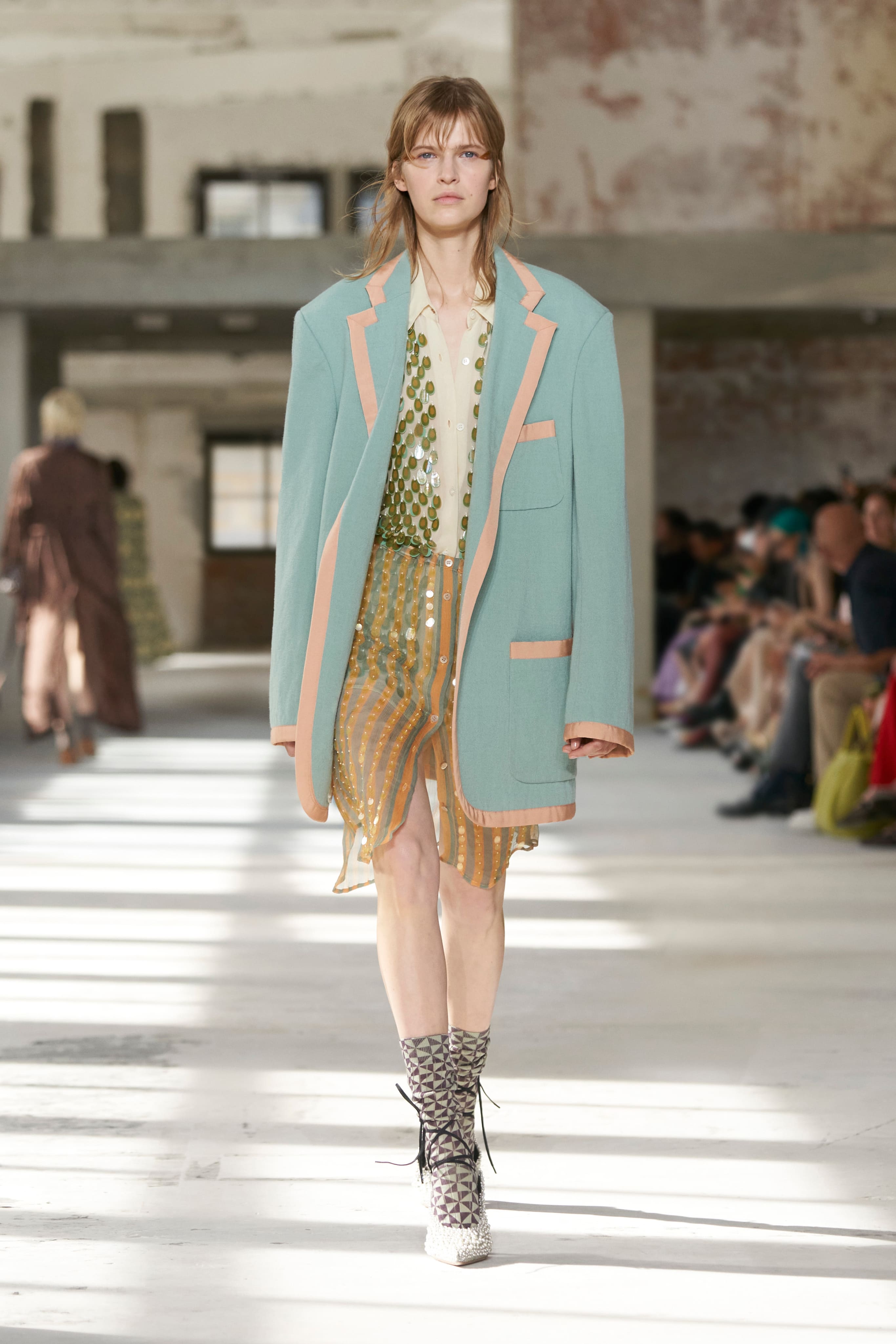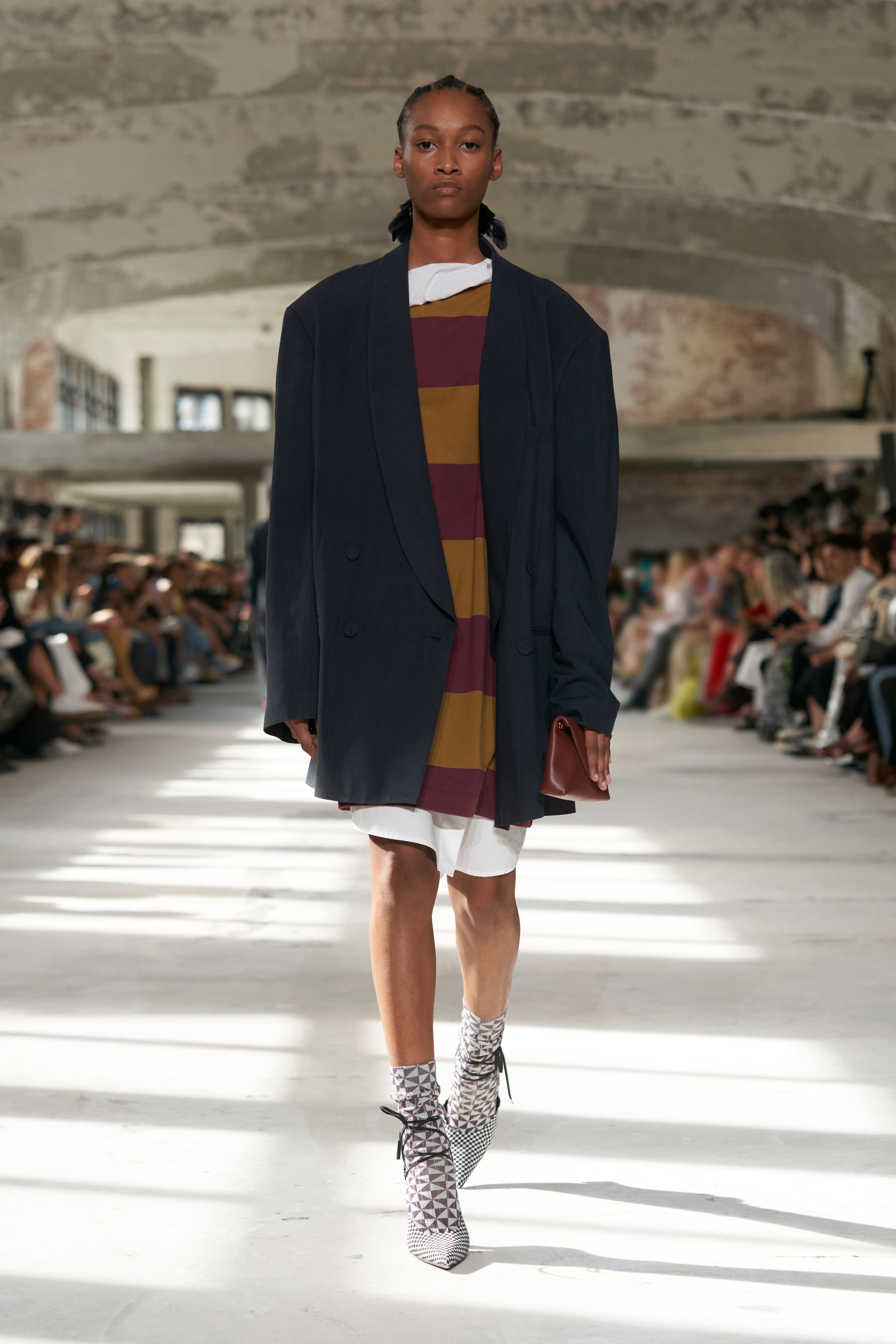 Бренд Dries Van Noten презентував одяг для реального життя у незвичній формі. На тлі звуків дощу показ розпочався ансамблями зі спідниць-карго кольору хакі, структурних піджаків та пальт. Водночас топи, сорочки та сукні прикрашала вертикальна й горизонтальна смужка. Чільне місце посів спортивний шик — регбійна уніформа втілилася в оверсайз поло.