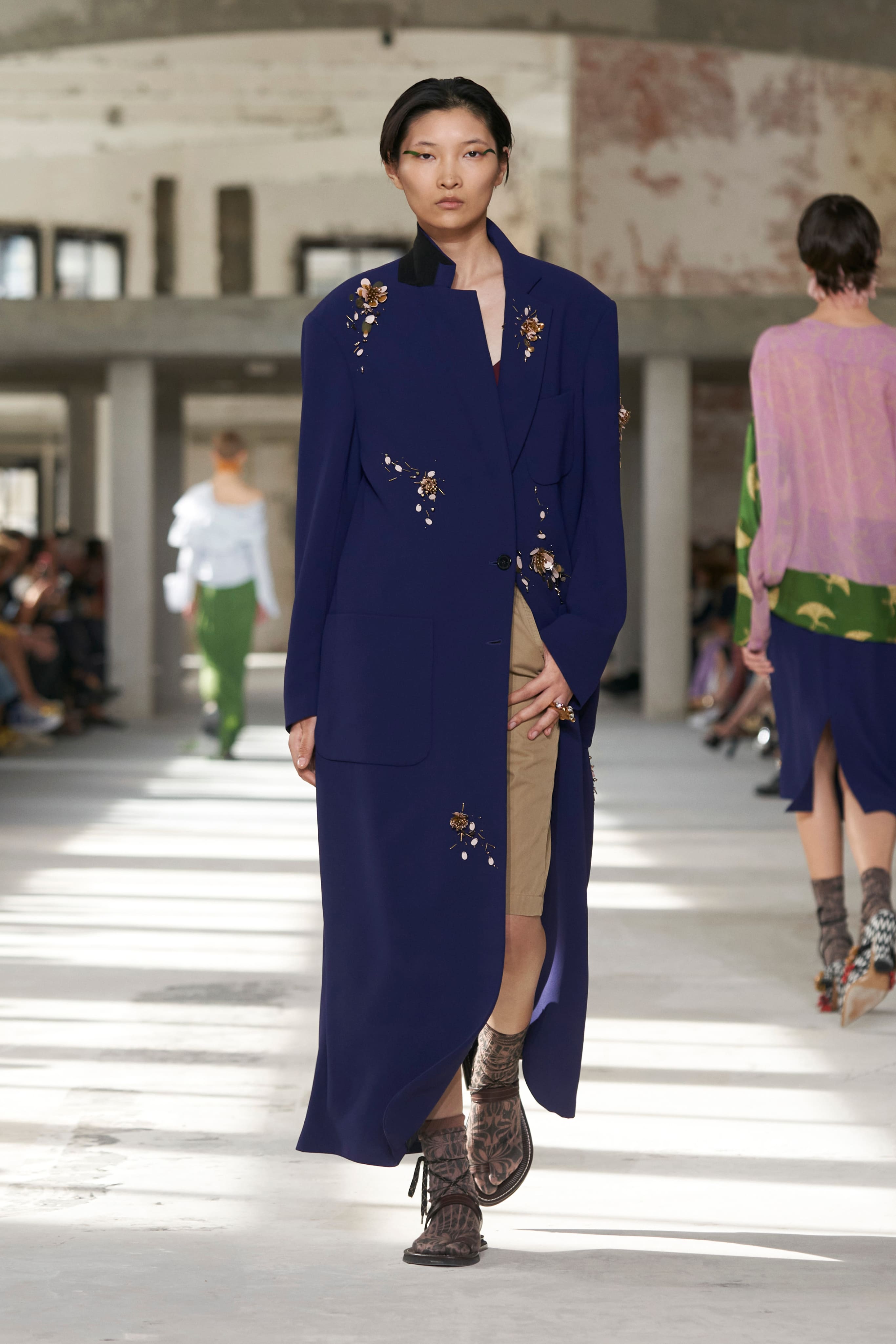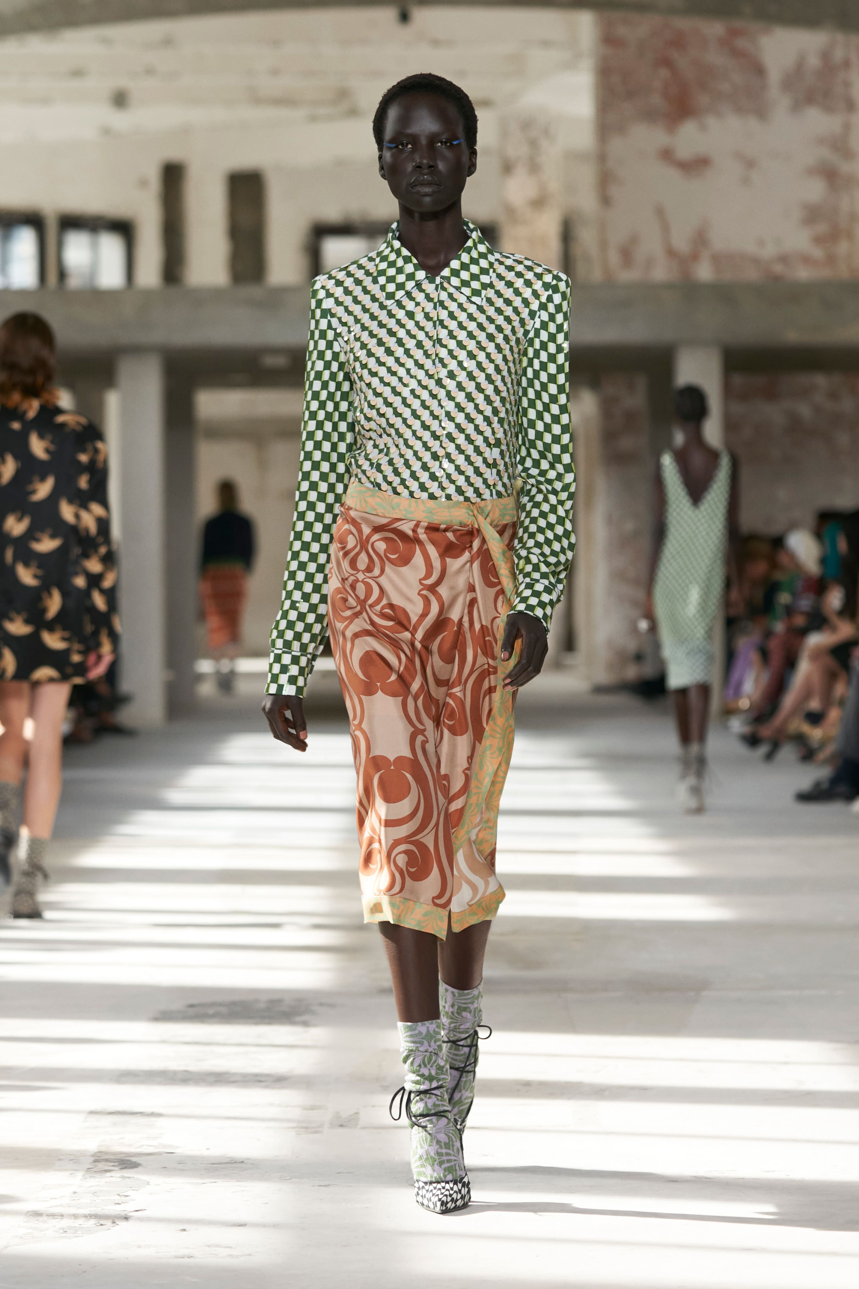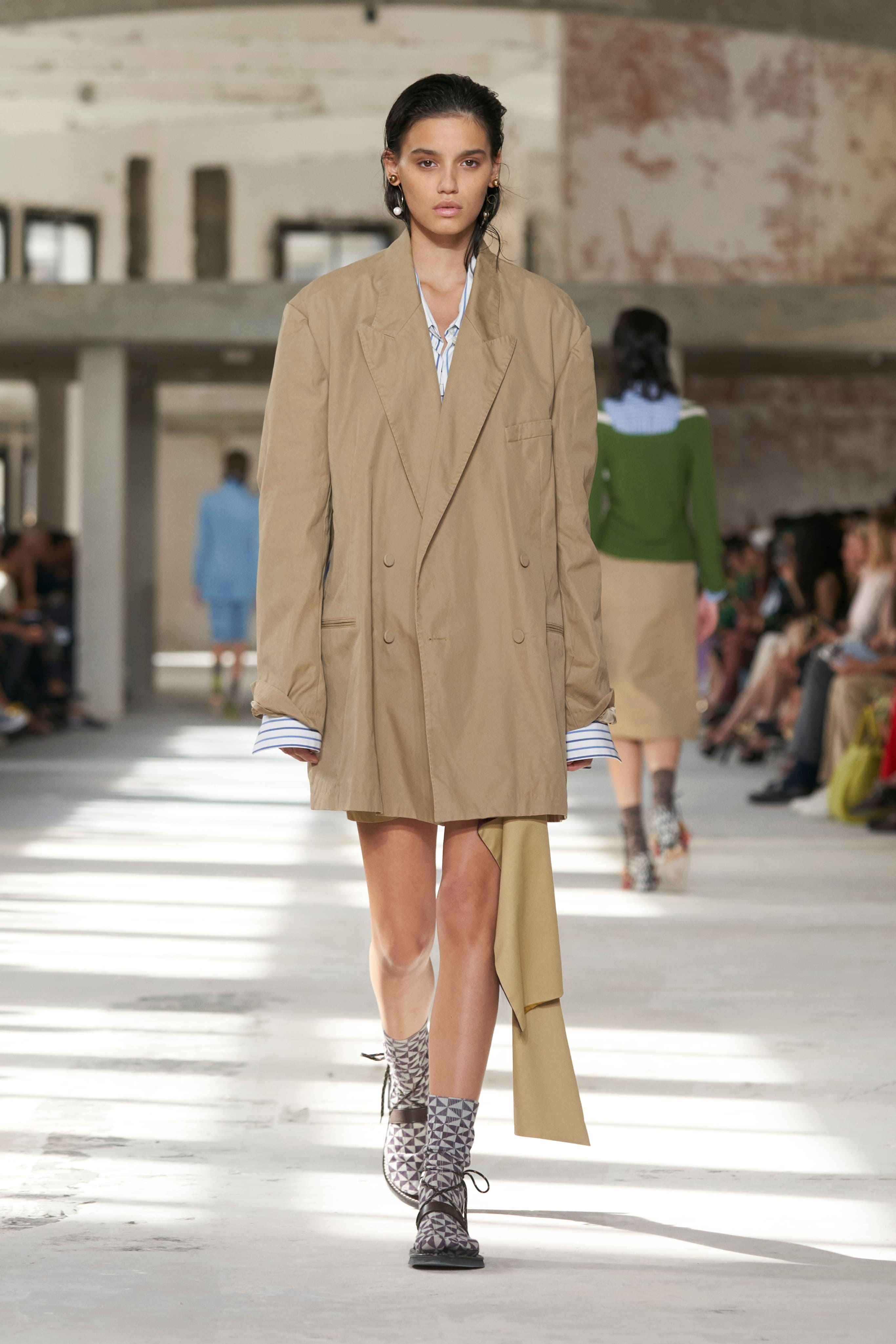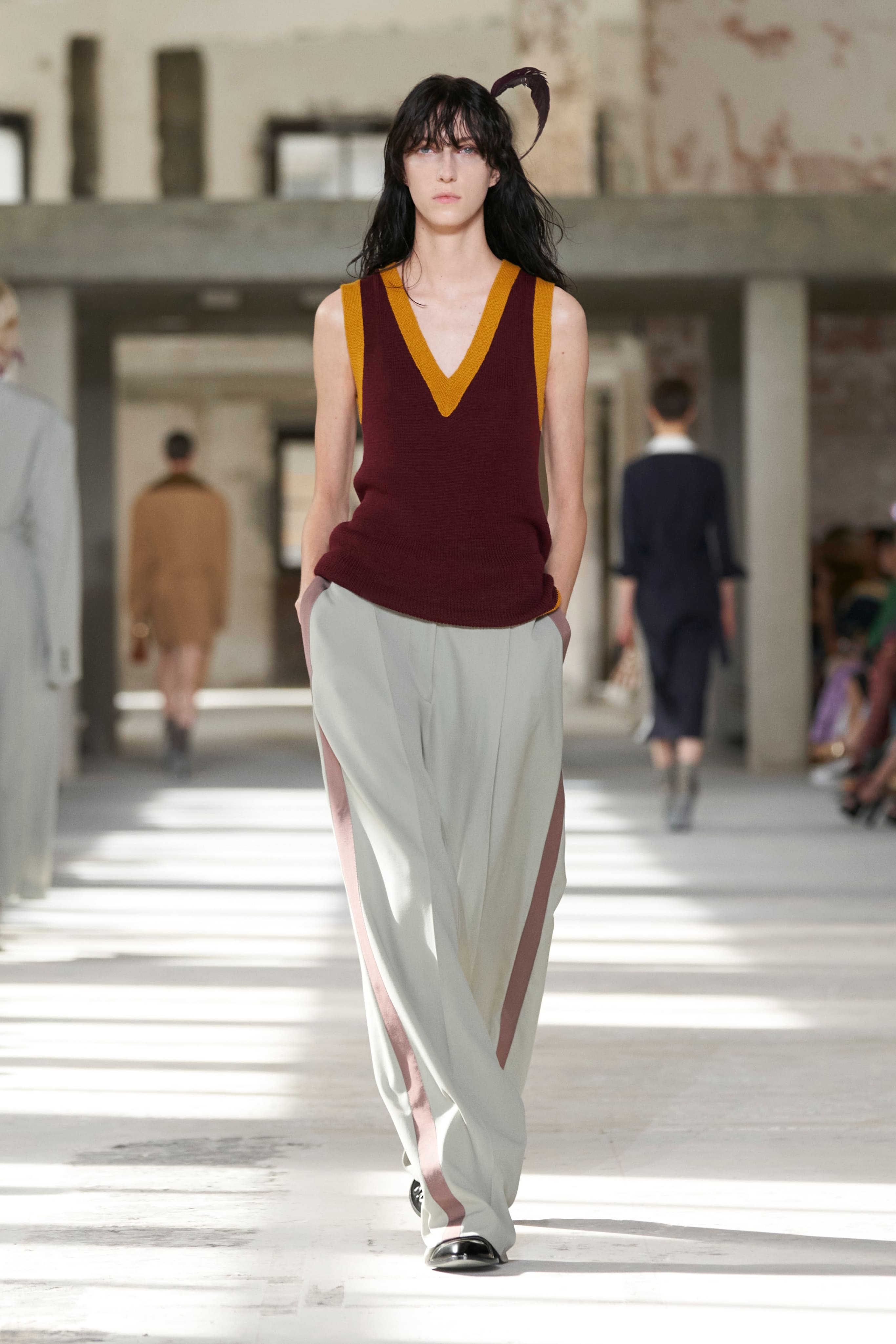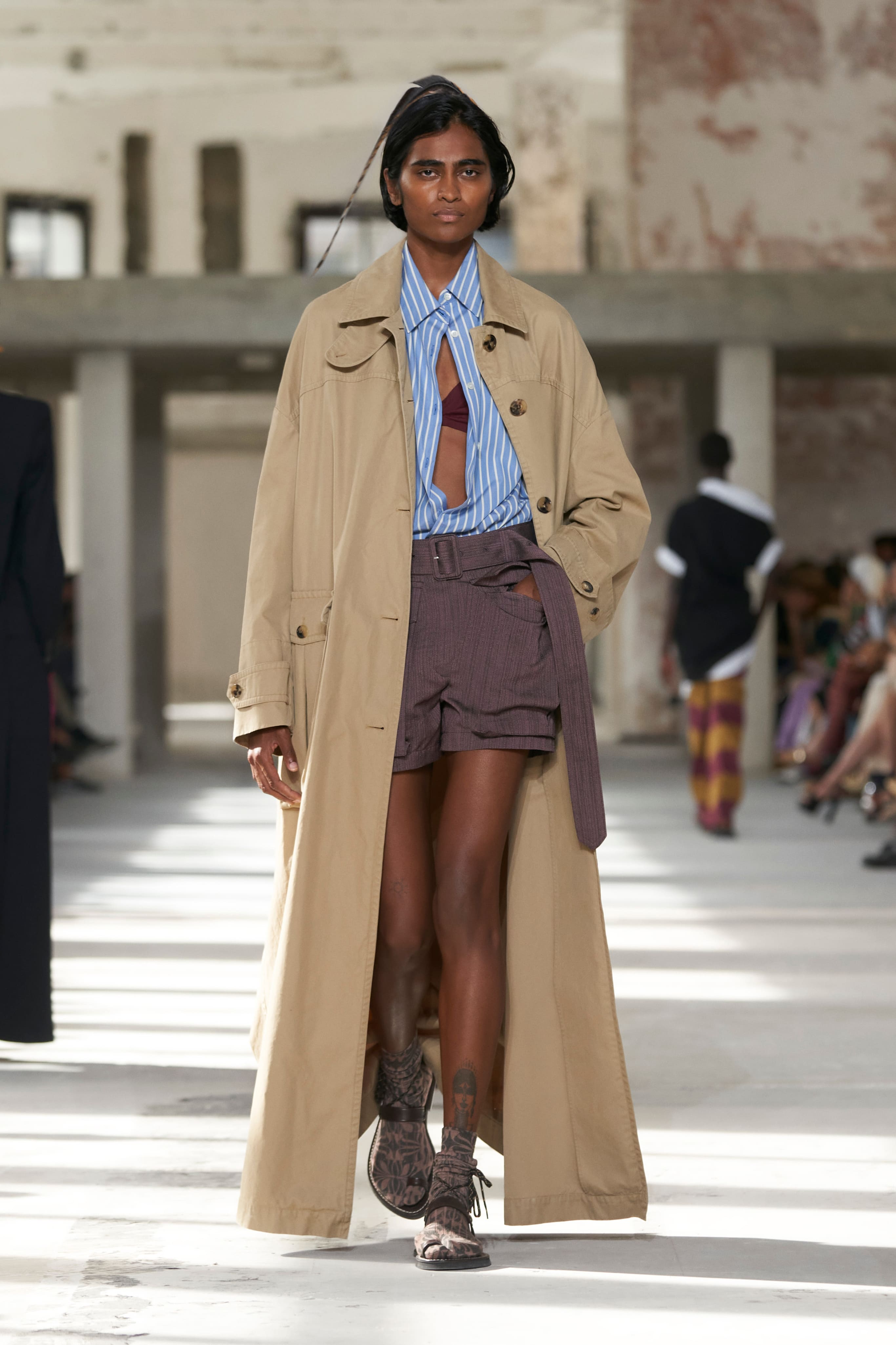 Бренд Dries Van Noten презентував одяг для реального життя у незвичній формі. На тлі звуків дощу показ розпочався ансамблями зі спідниць-карго кольору хакі, структурних піджаків та пальт. Водночас топи, сорочки та сукні прикрашала вертикальна й горизонтальна смужка. Чільне місце посів спортивний шик — регбійна уніформа втілилася в оверсайз поло.