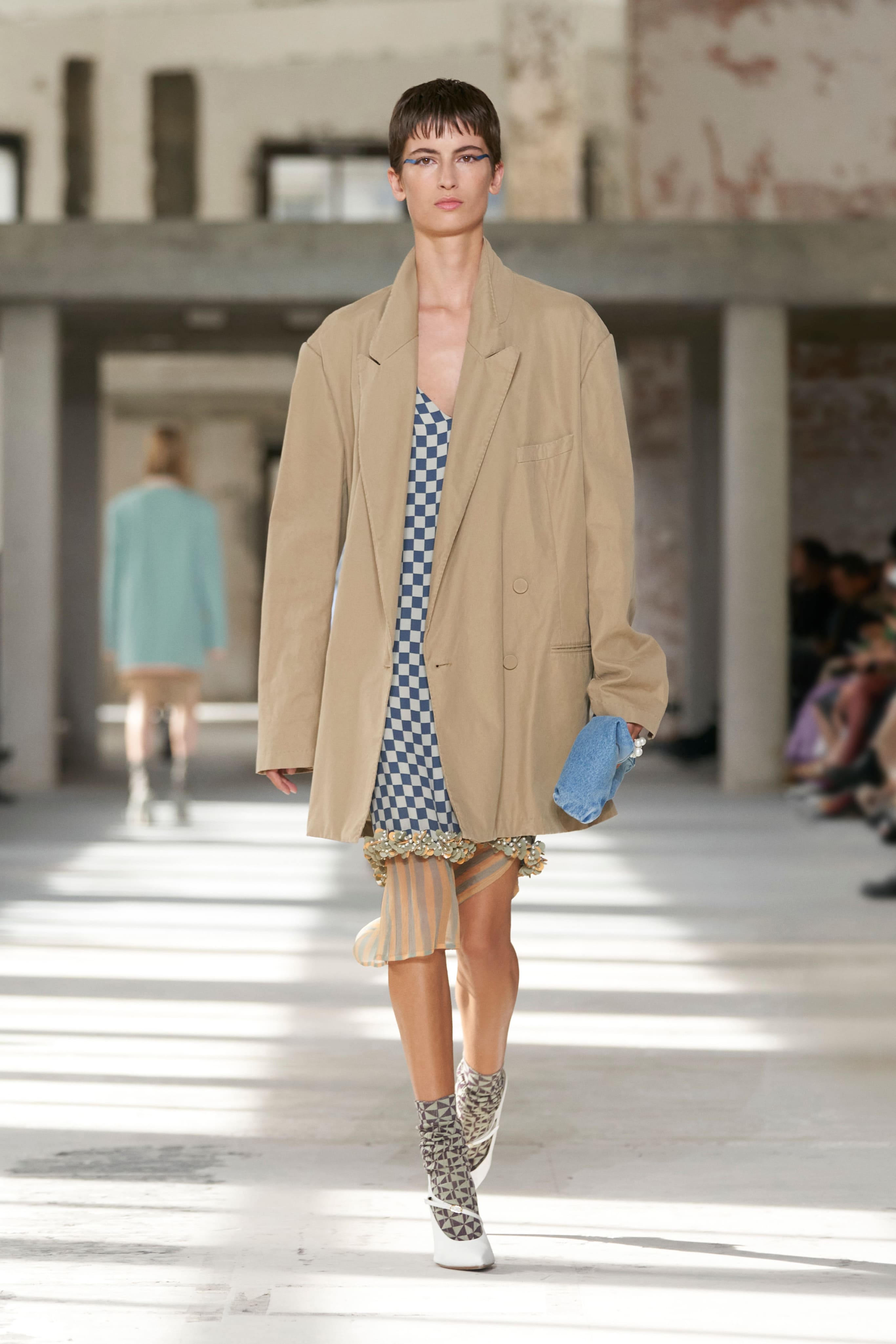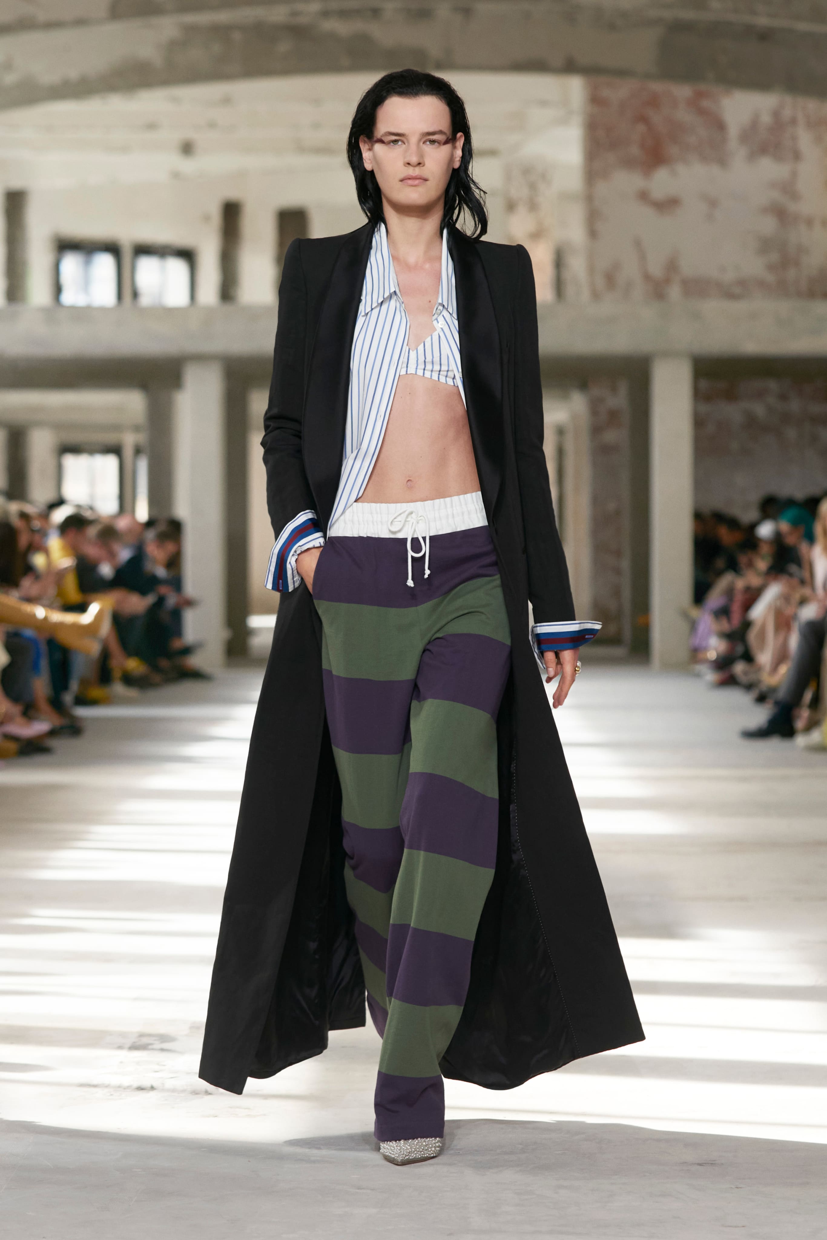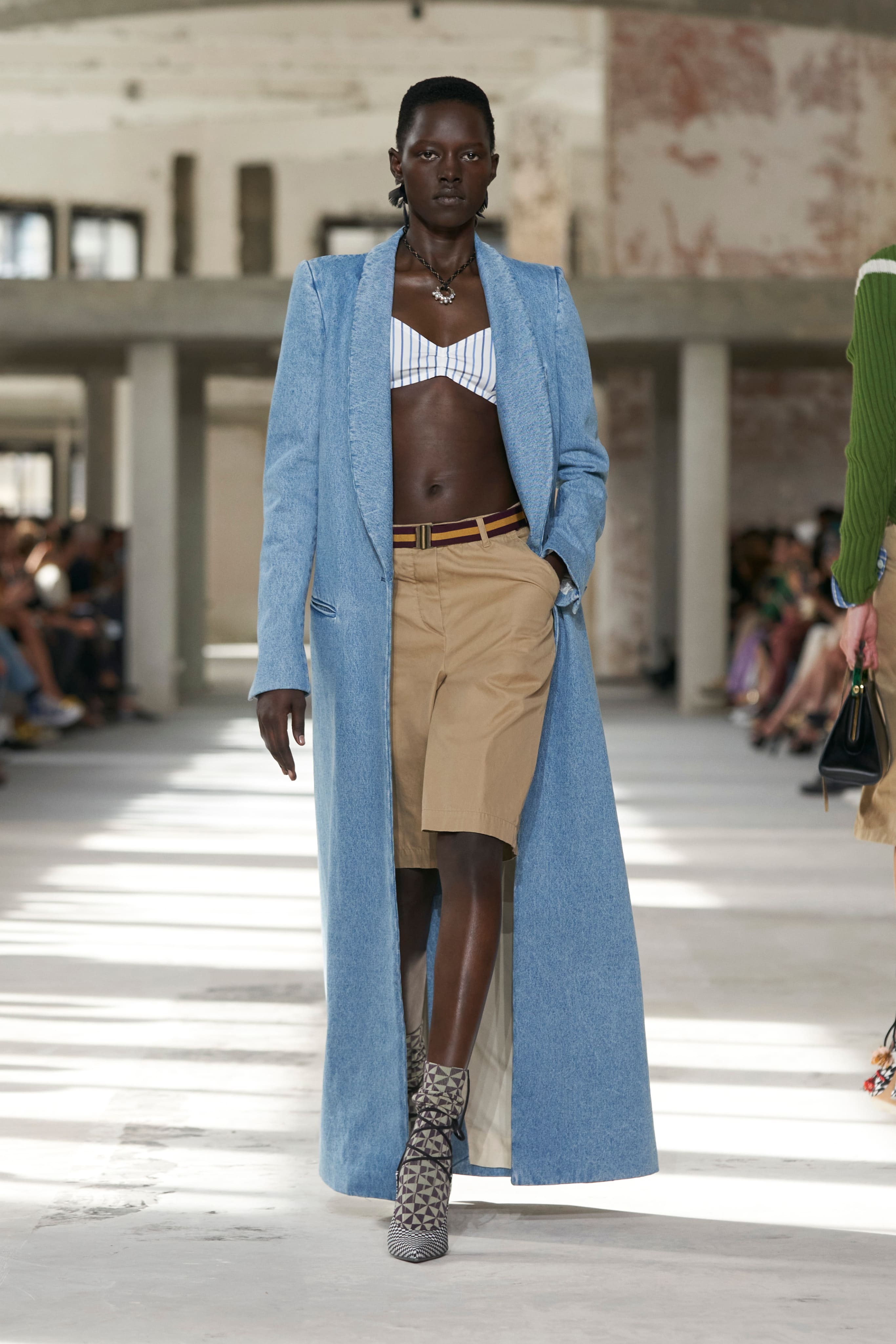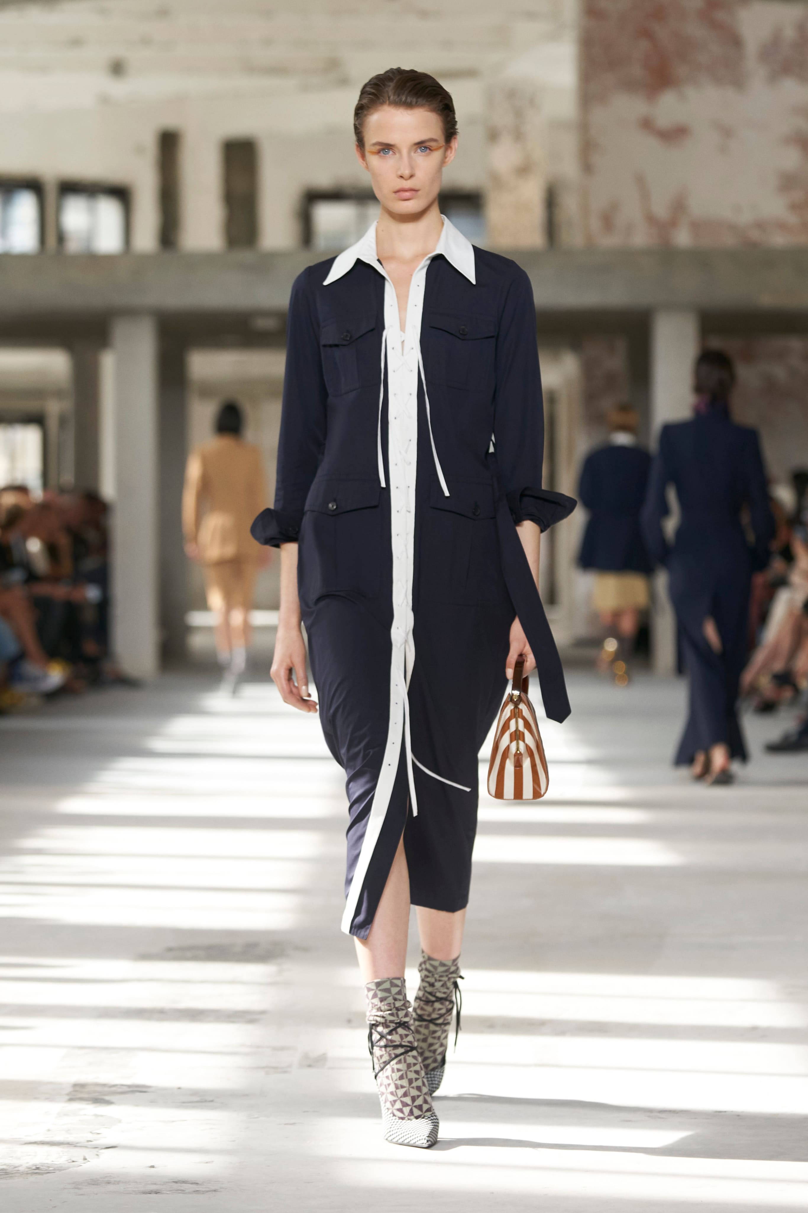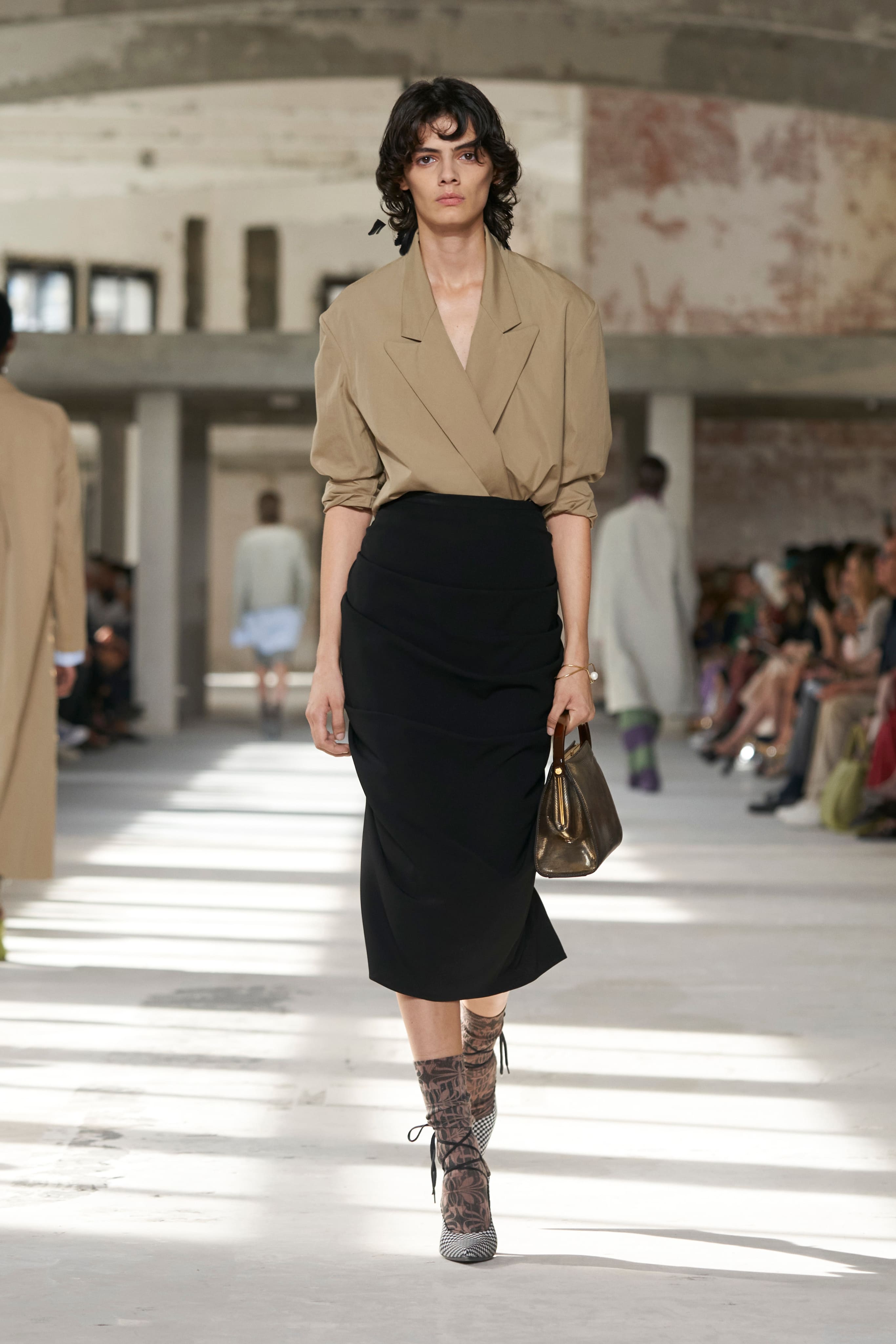 Бренд Dries Van Noten презентував одяг для реального життя у незвичній формі. На тлі звуків дощу показ розпочався ансамблями зі спідниць-карго кольору хакі, структурних піджаків та пальт. Водночас топи, сорочки та сукні прикрашала вертикальна й горизонтальна смужка. Чільне місце посів спортивний шик — регбійна уніформа втілилася в оверсайз поло.