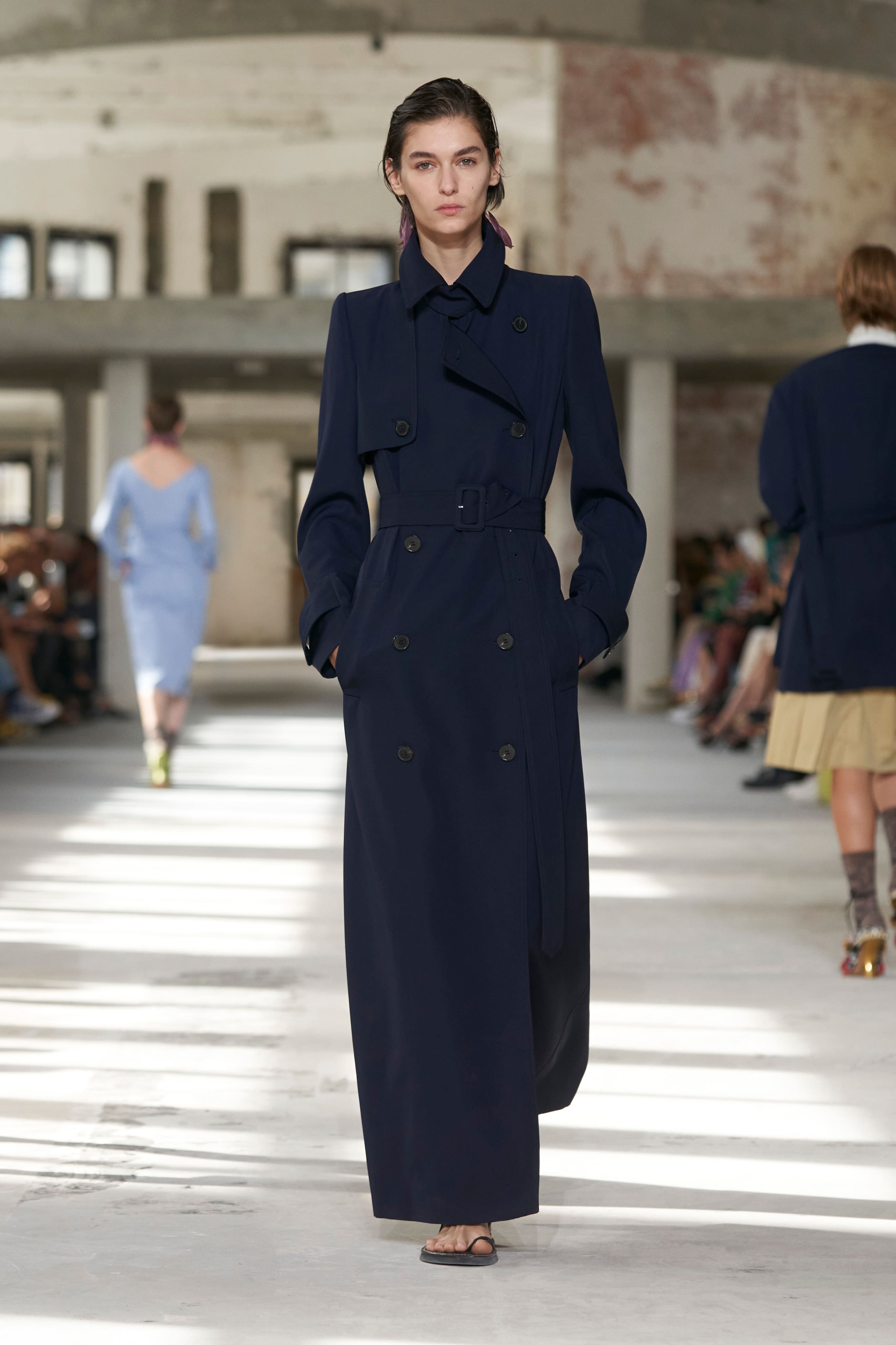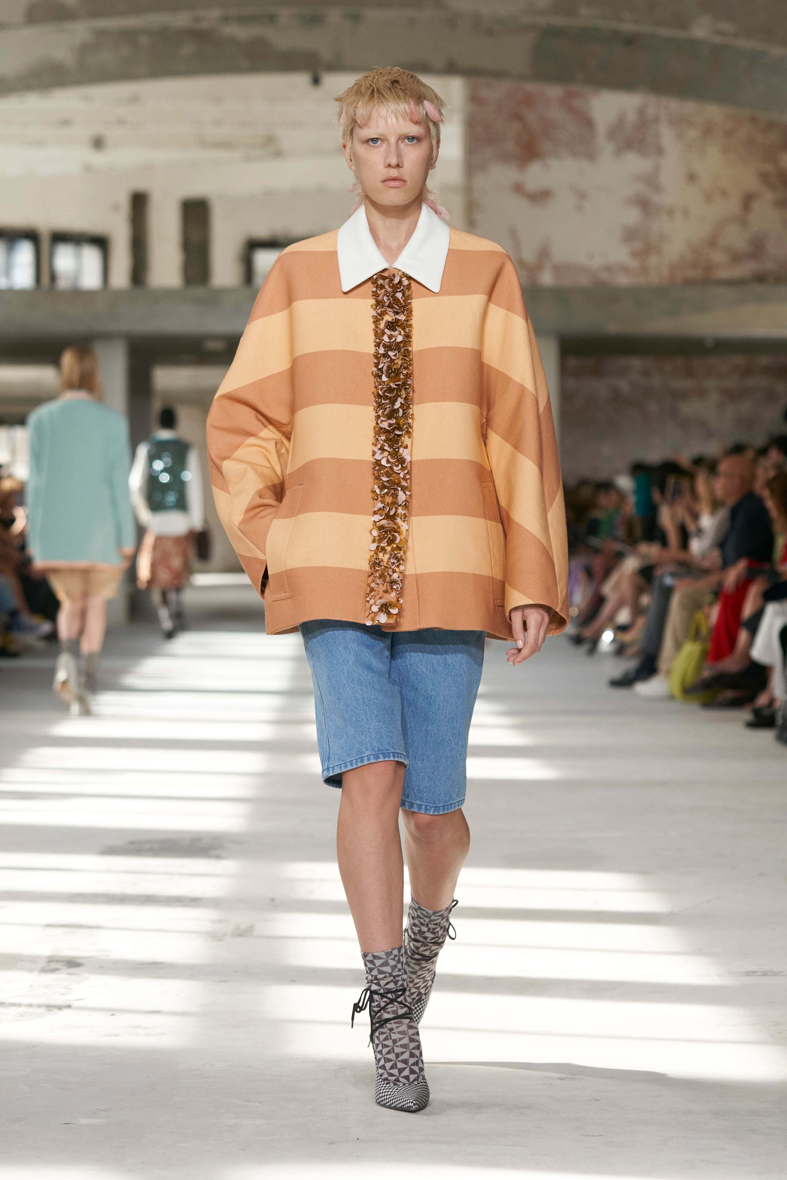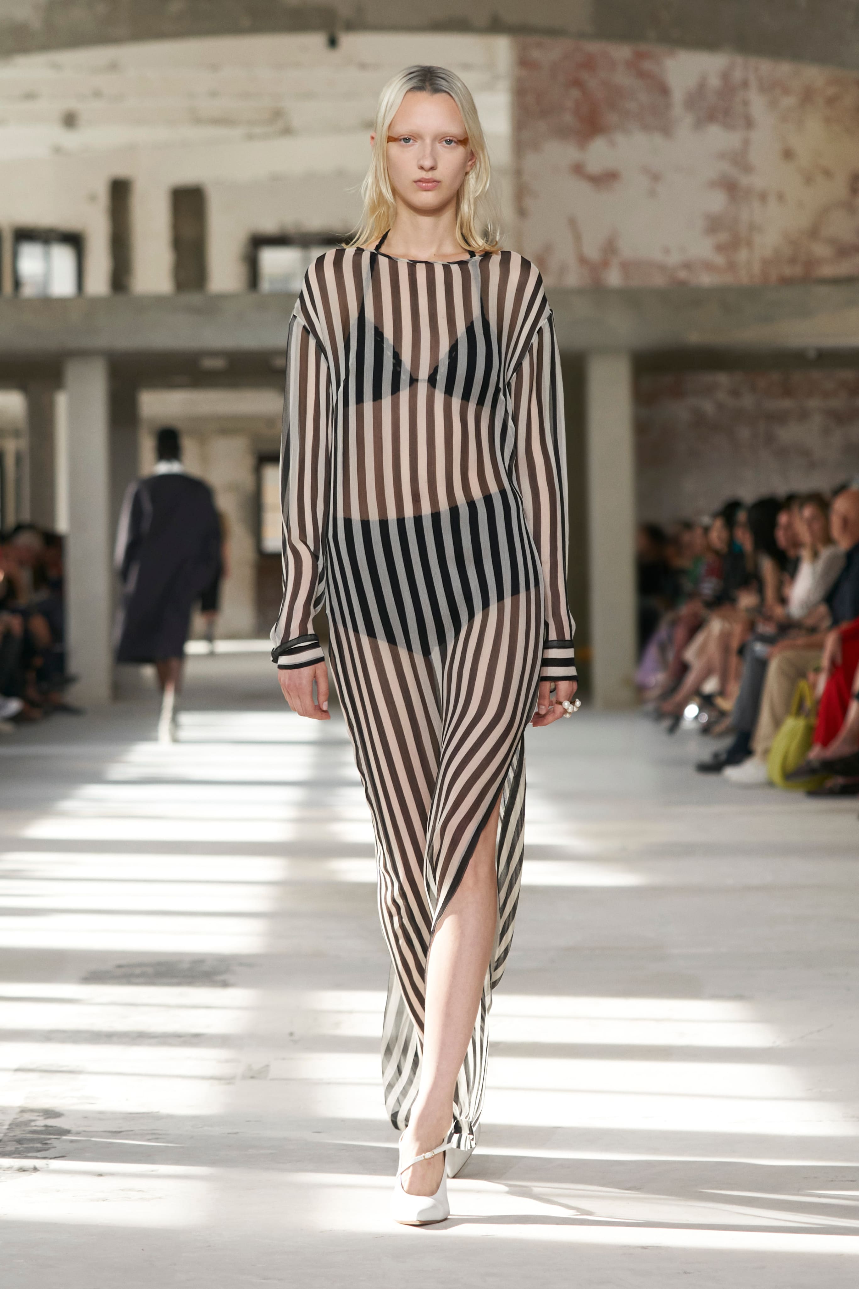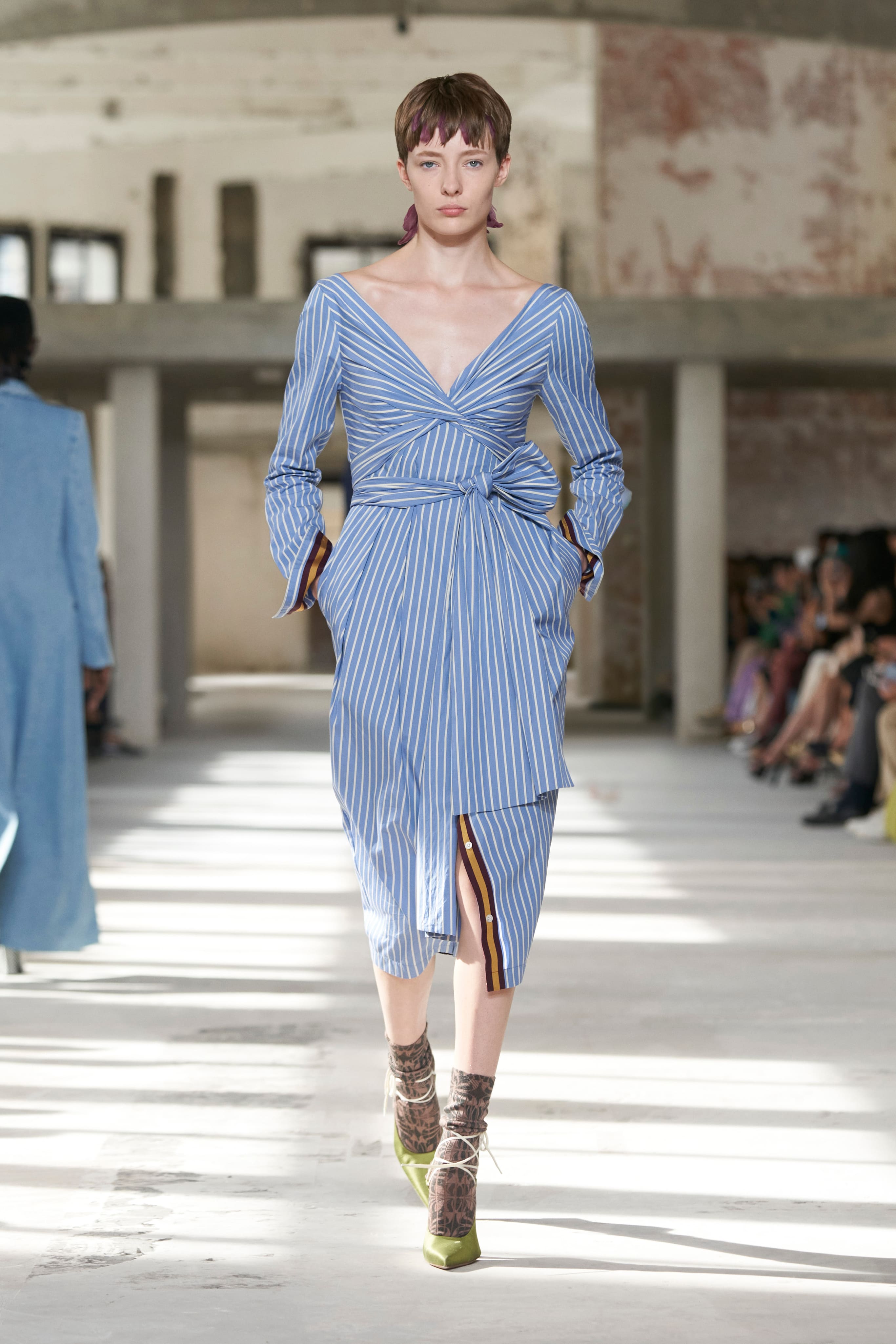 Бренд Dries Van Noten презентував одяг для реального життя у незвичній формі. На тлі звуків дощу показ розпочався ансамблями зі спідниць-карго кольору хакі, структурних піджаків та пальт. Водночас топи, сорочки та сукні прикрашала вертикальна й горизонтальна смужка. Чільне місце посів спортивний шик — регбійна уніформа втілилася в оверсайз поло.