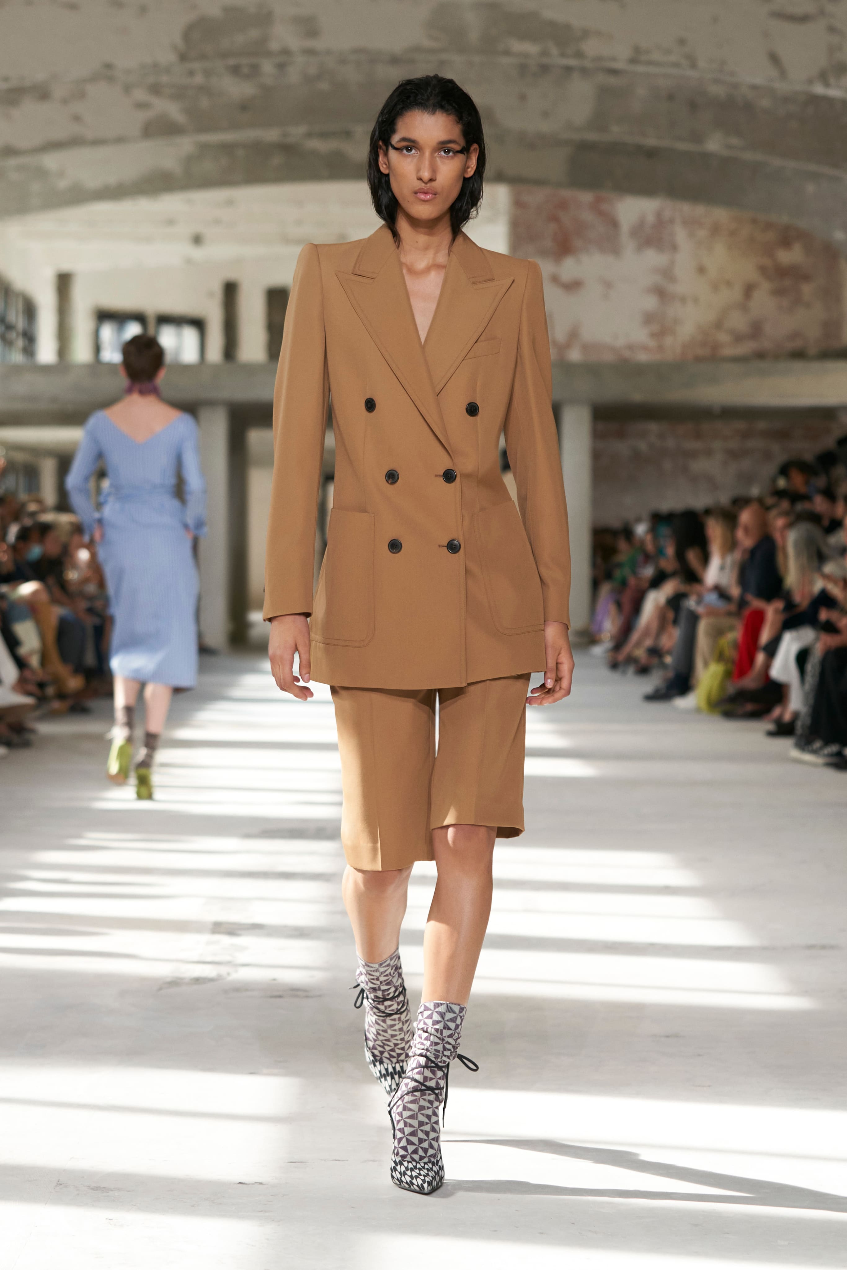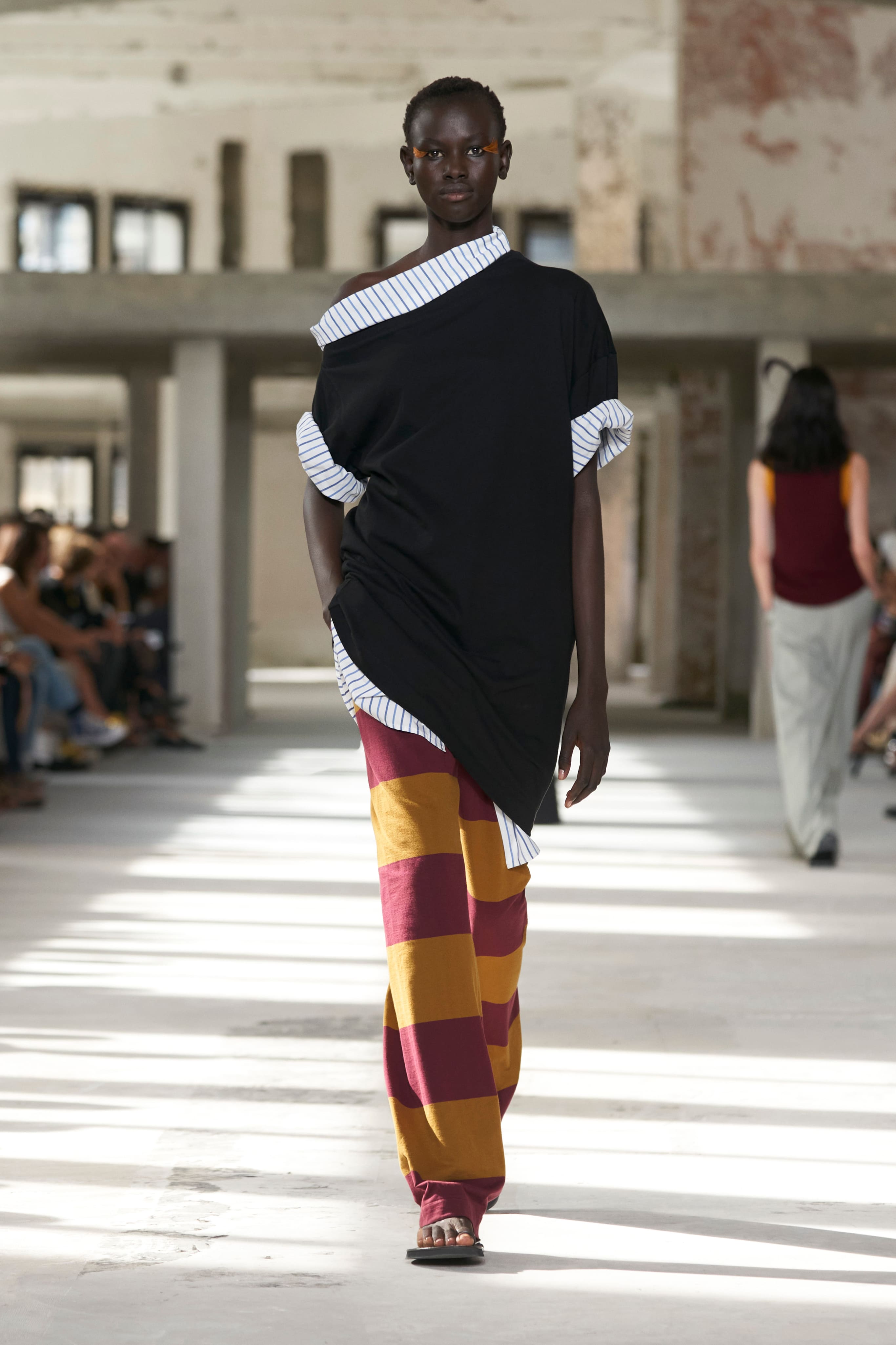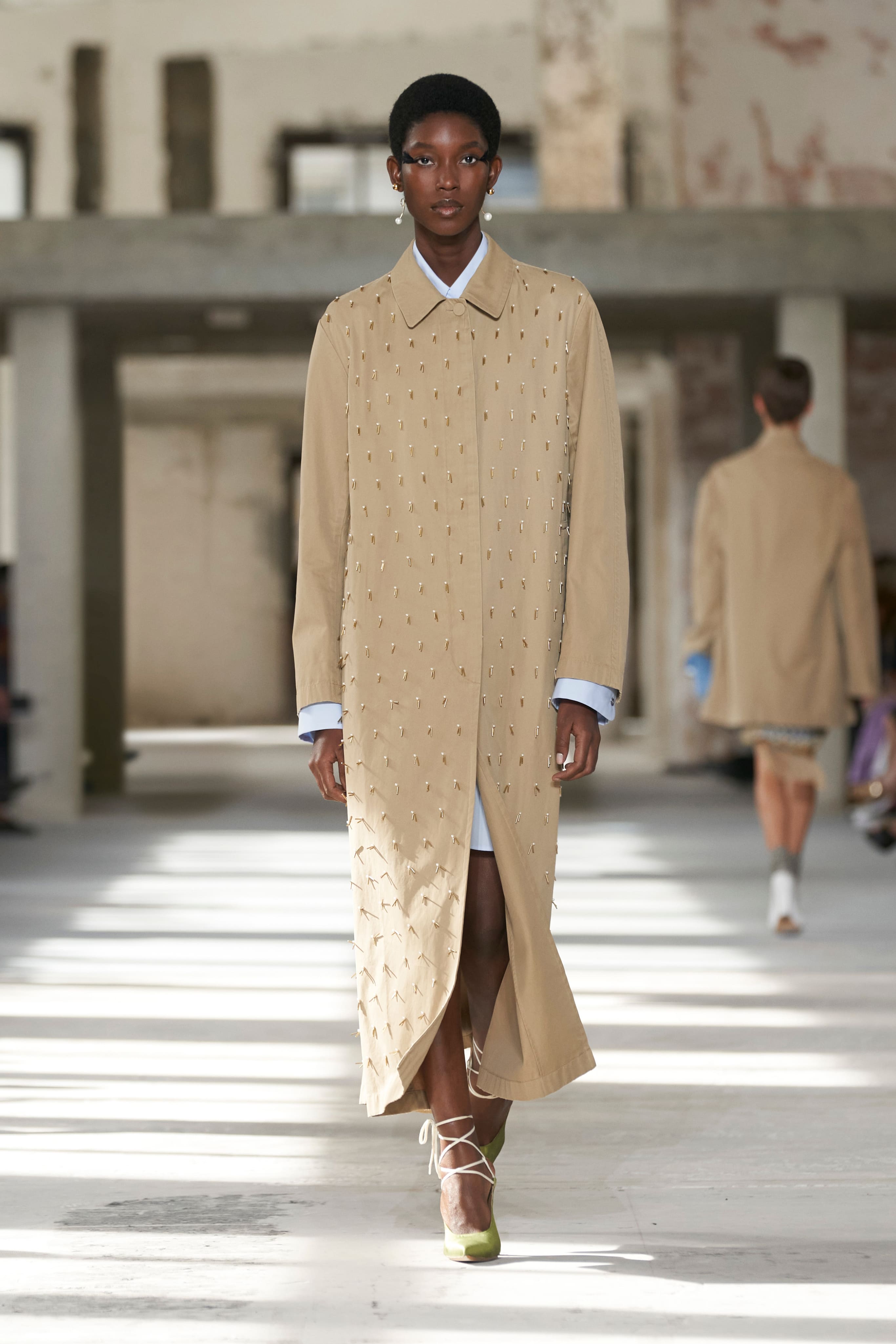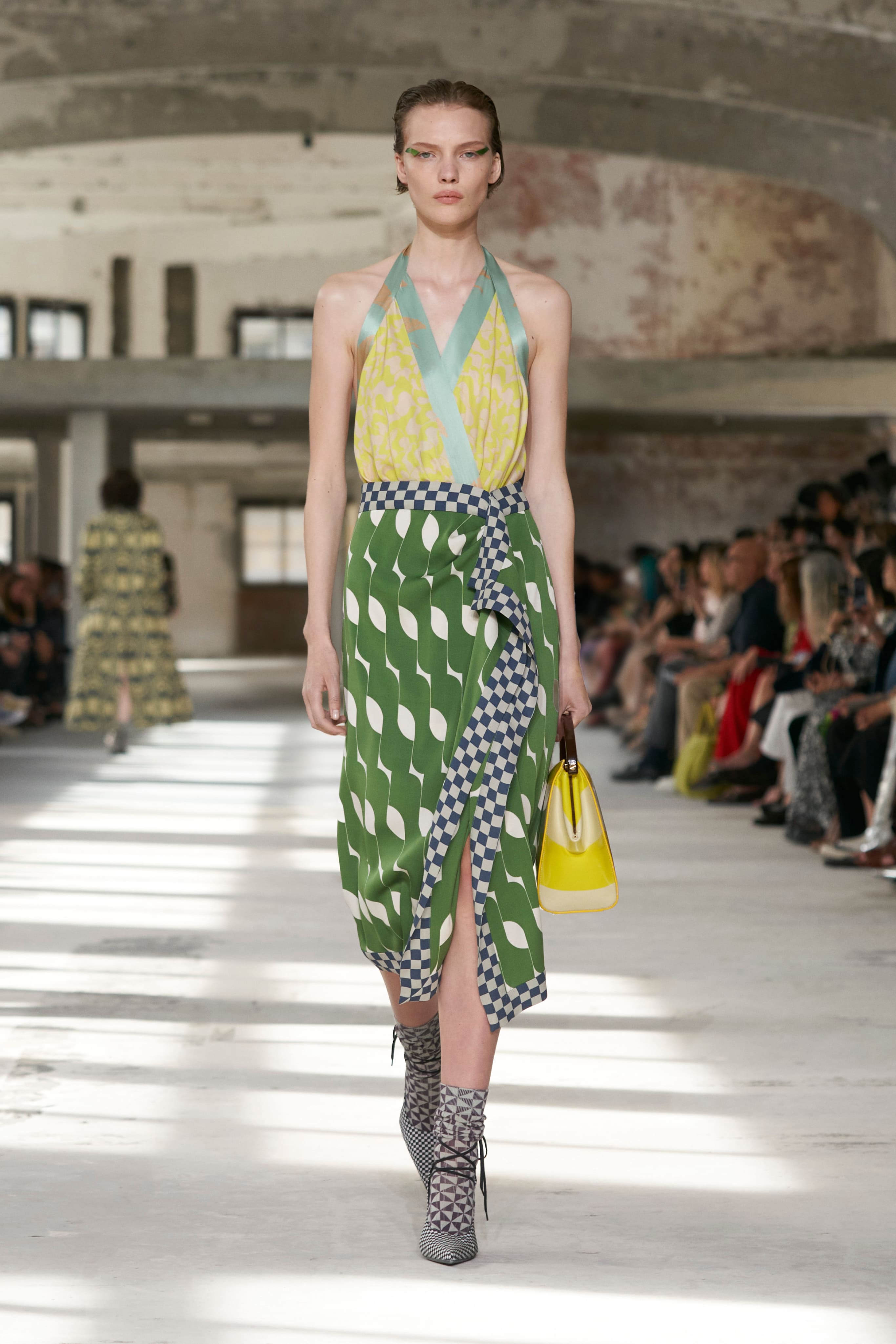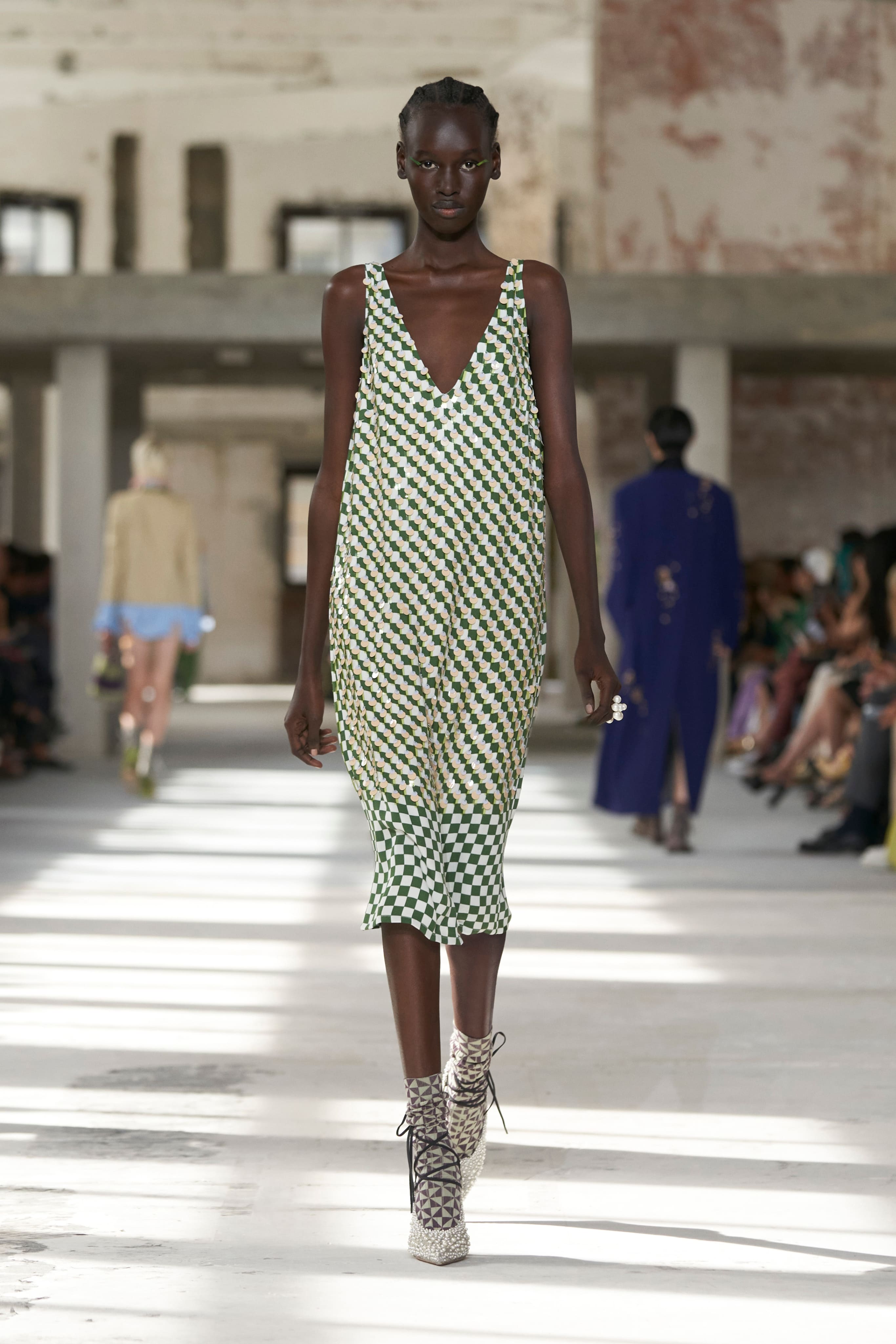 Бренд Dries Van Noten презентував одяг для реального життя у незвичній формі. На тлі звуків дощу показ розпочався ансамблями зі спідниць-карго кольору хакі, структурних піджаків та пальт. Водночас топи, сорочки та сукні прикрашала вертикальна й горизонтальна смужка. Чільне місце посів спортивний шик — регбійна уніформа втілилася в оверсайз поло.