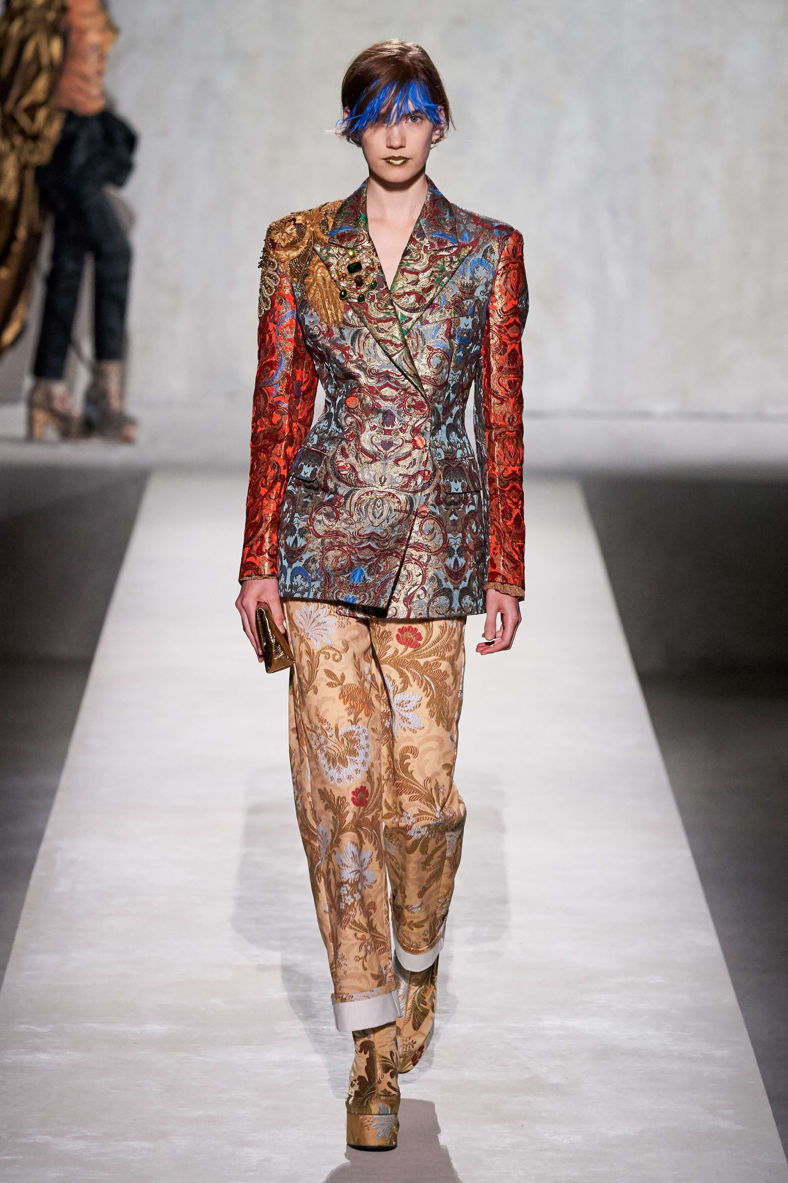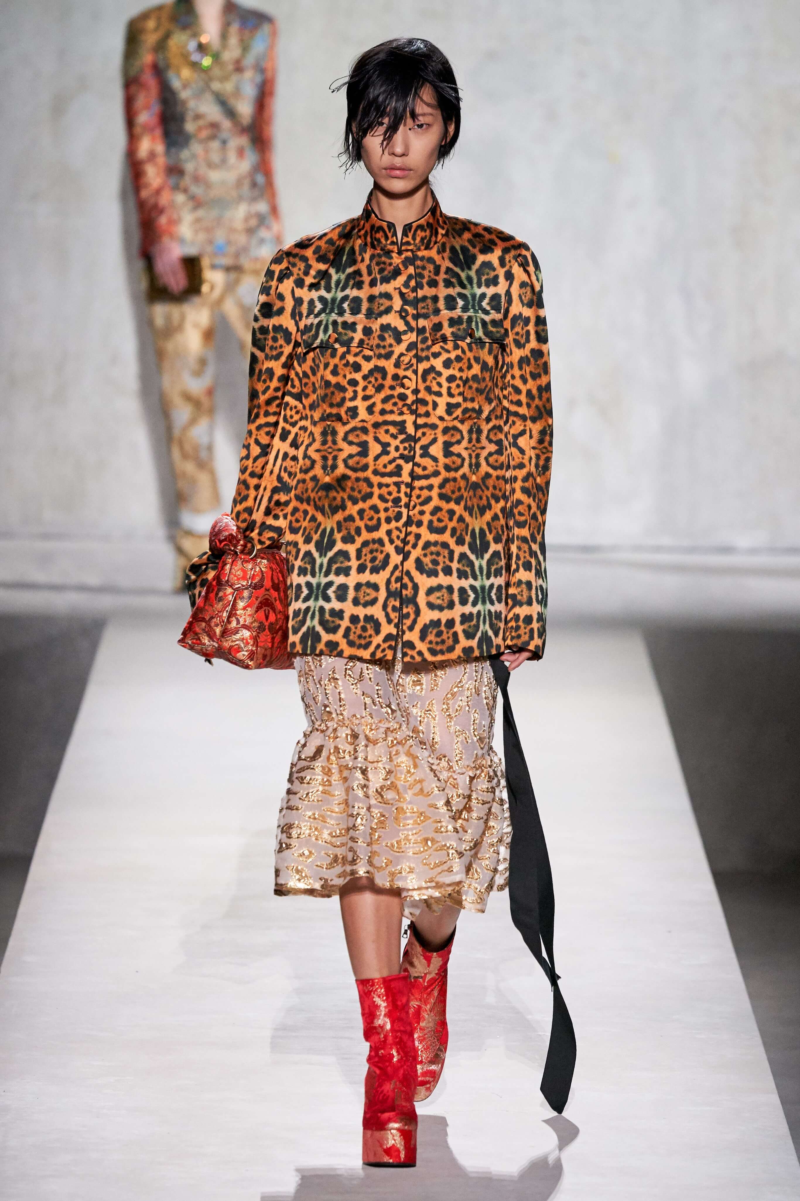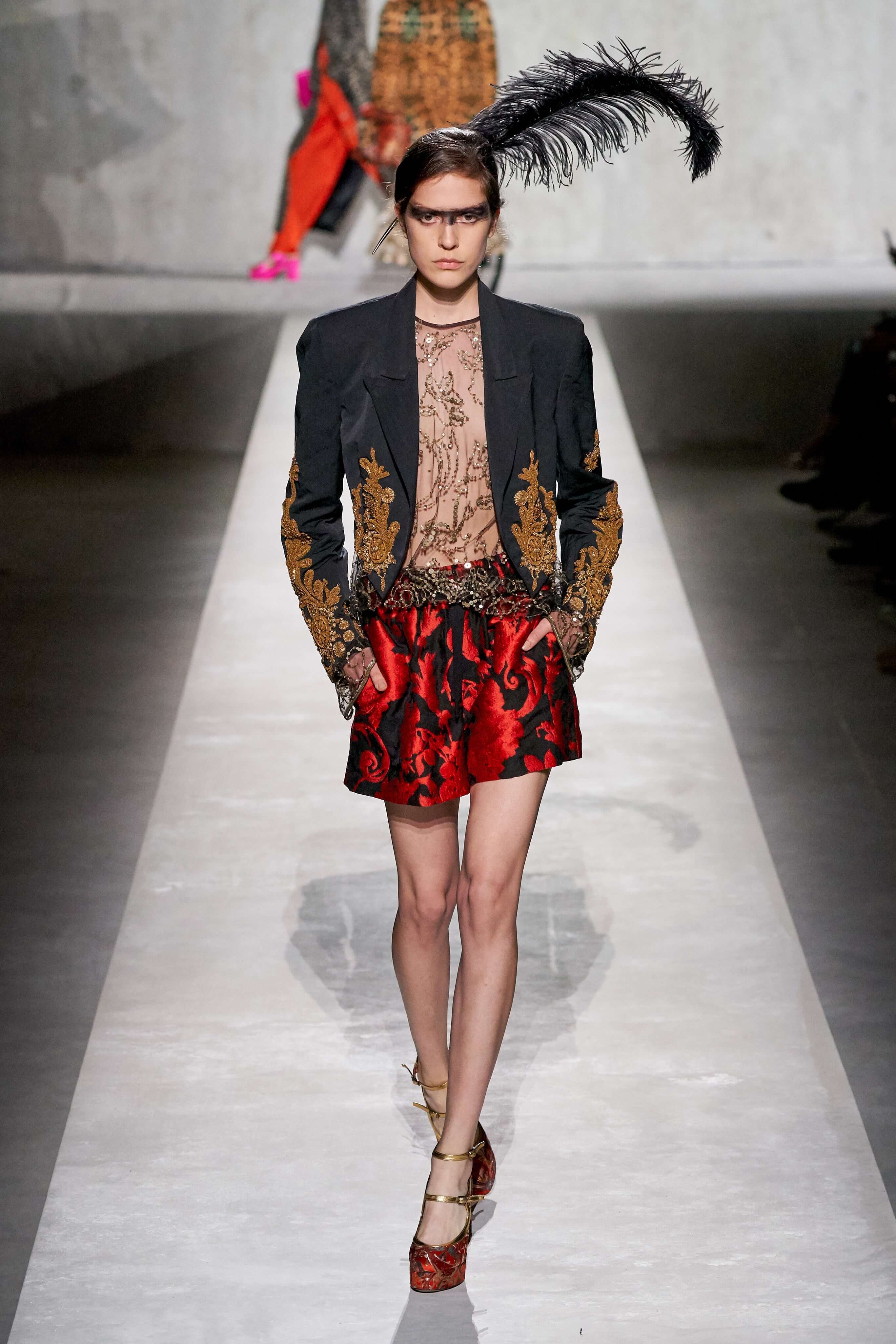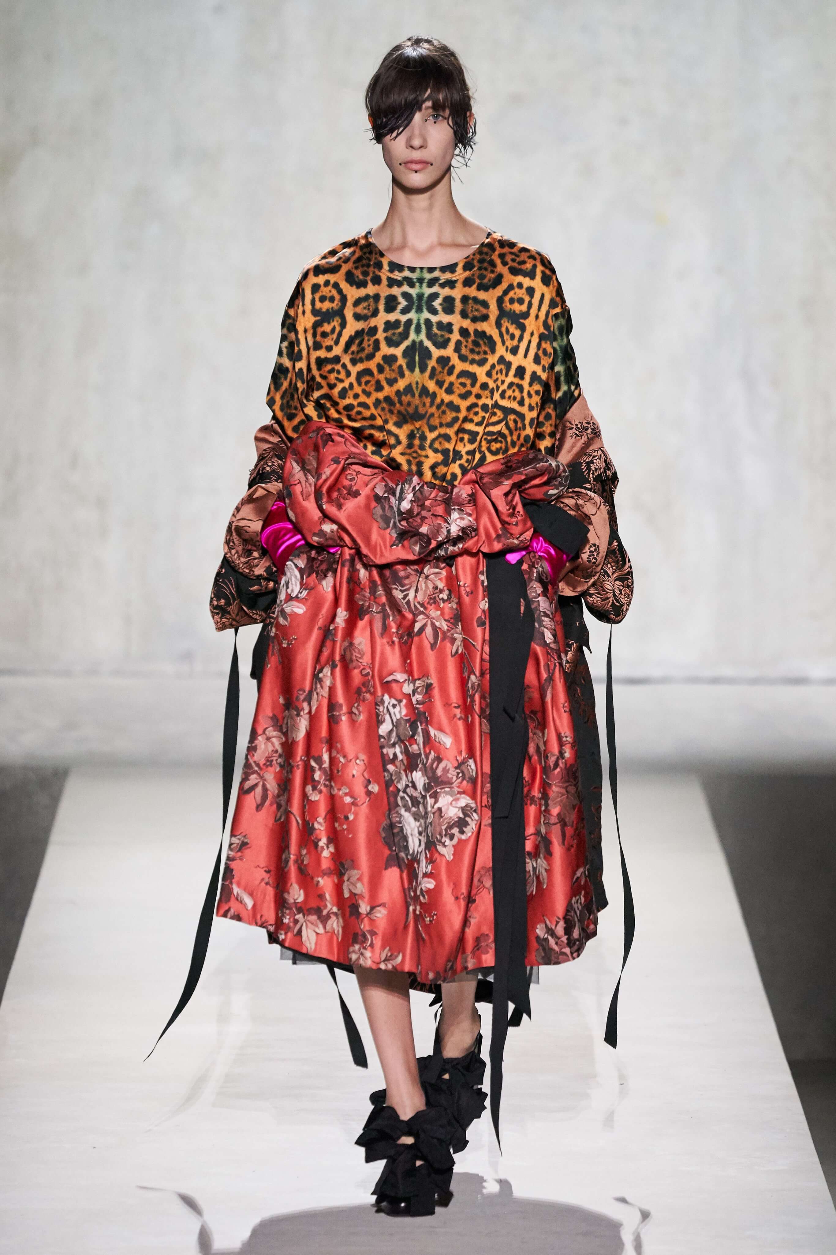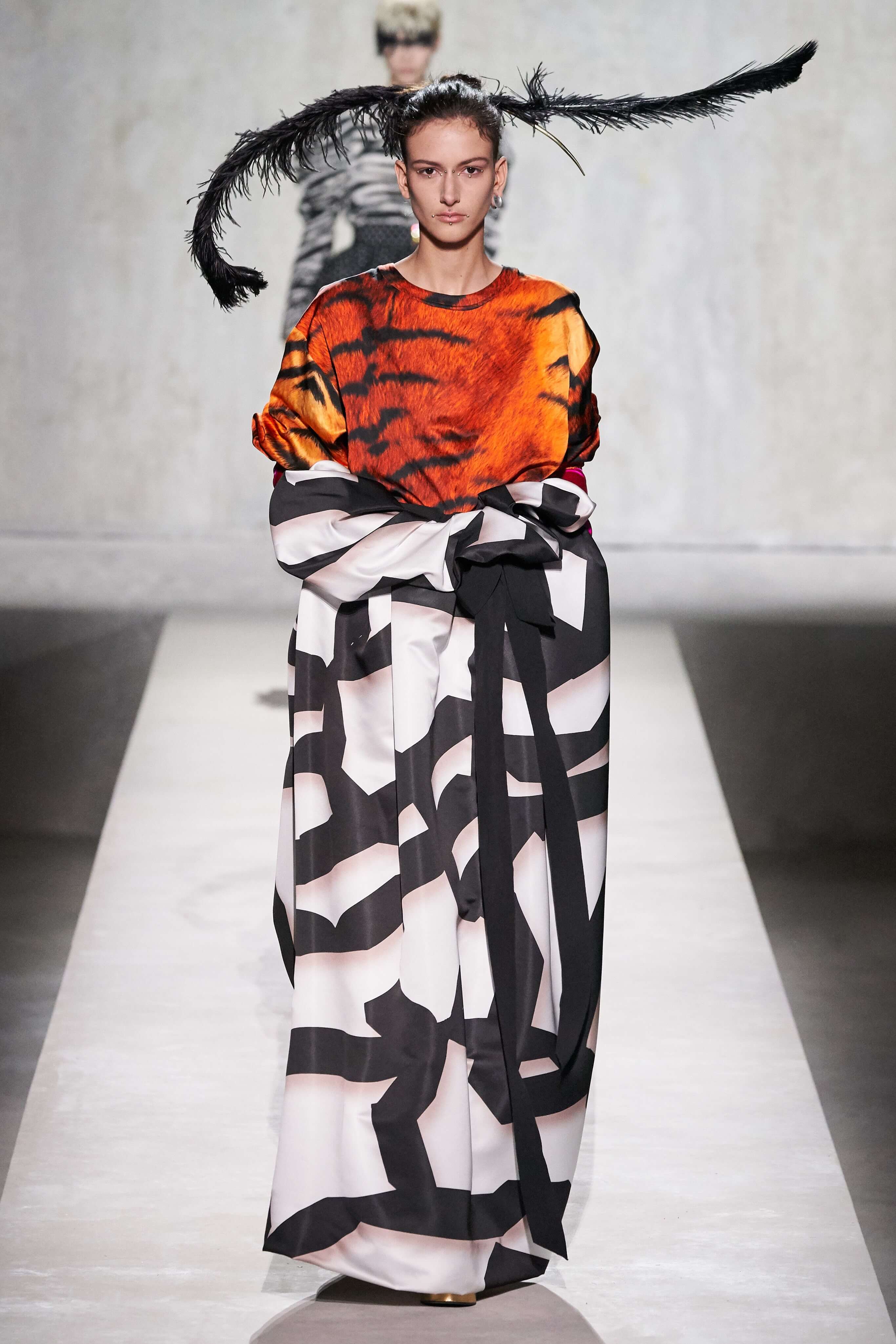 В коллекции есть пышные платья с хищными принтами, жаккардовые пальто в блестящих цветах, юбки в стиле фламенко и топы с одним объёмным рукавом и бантом на плече, многослойные наряды, в которых сочетаются сразу и мелкий гороховый принт, и тигровые узоры, и много, действительно много цветов. А самое главное — выглядит каждая вещь фантастически красиво и современно. Надеть хочется даже тигровый брючный костюм. Прически моделей украшали знаковые для кутюрной моды прошлых десятилетий плюмажи из перьев и шапочки из золотого люрекса, а в руках были маленькие сумочки в узорах под зебру и леопарда.