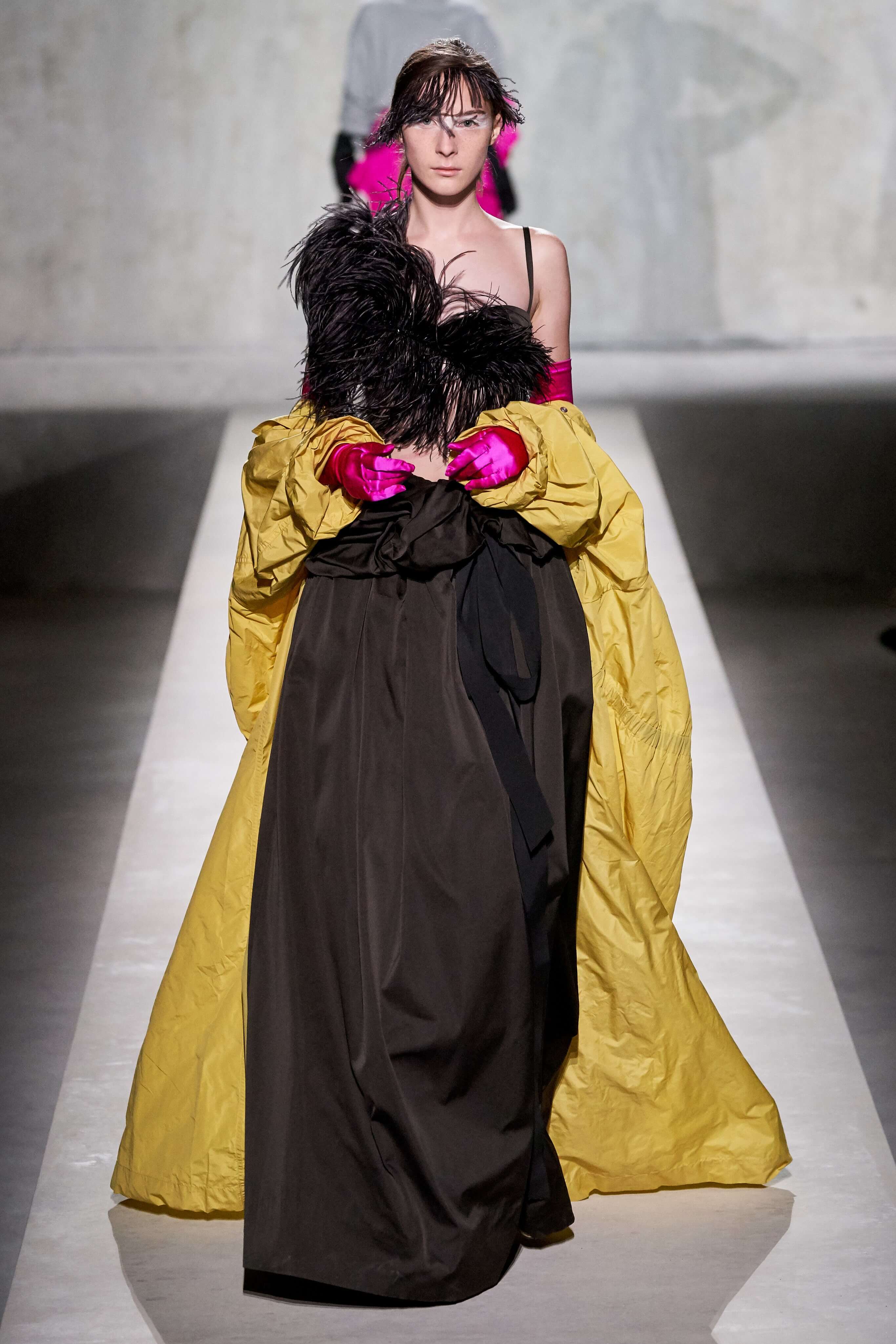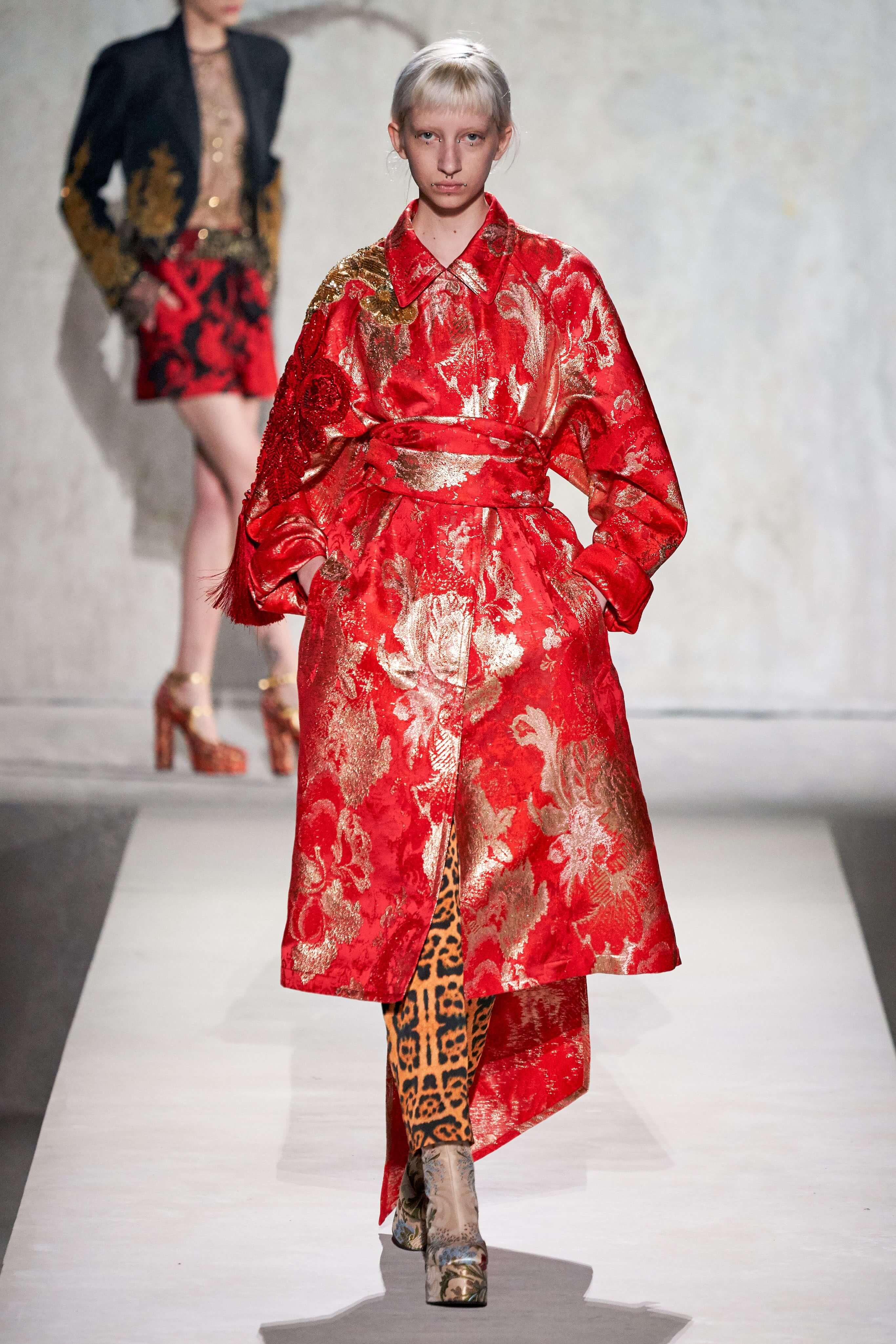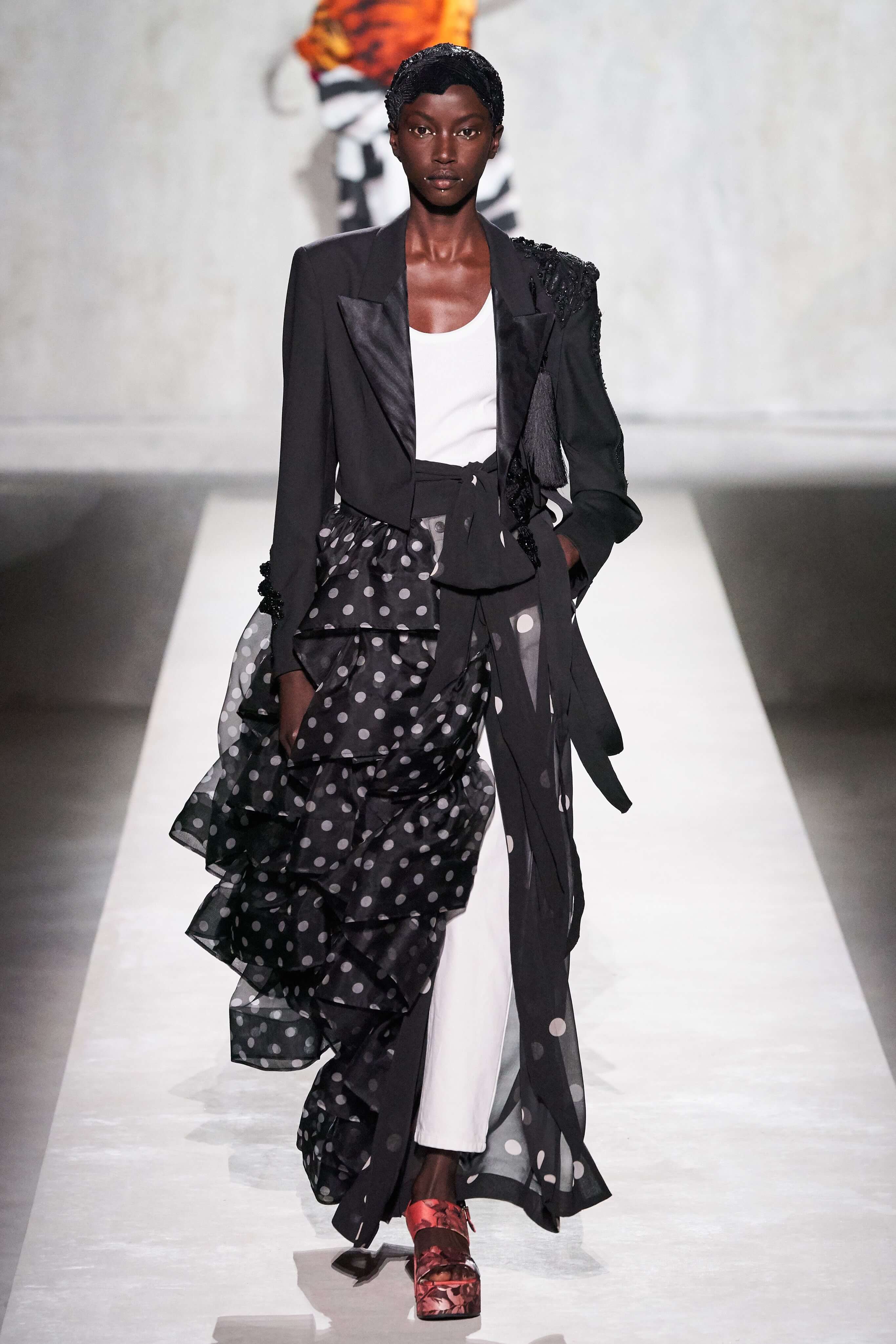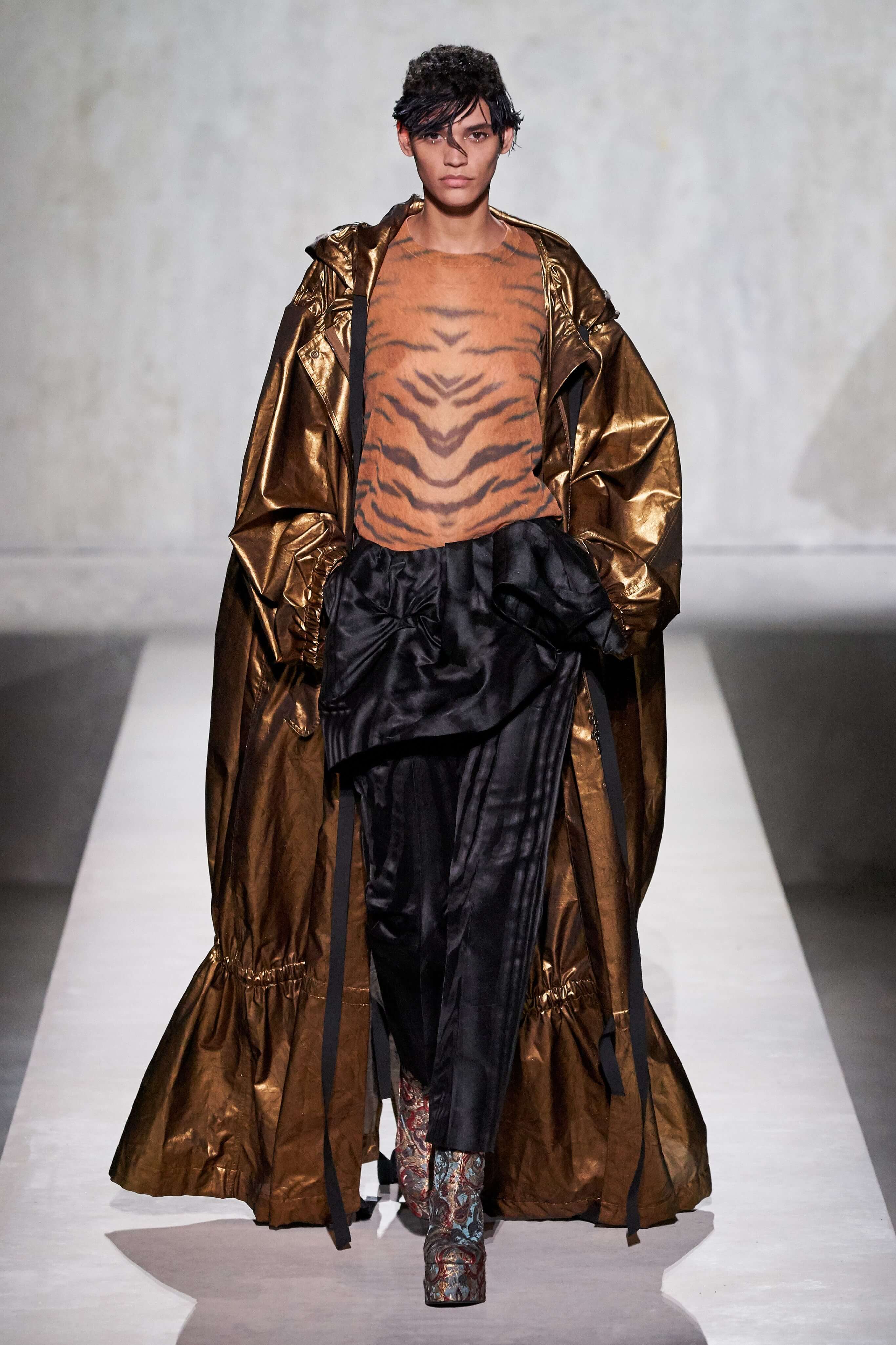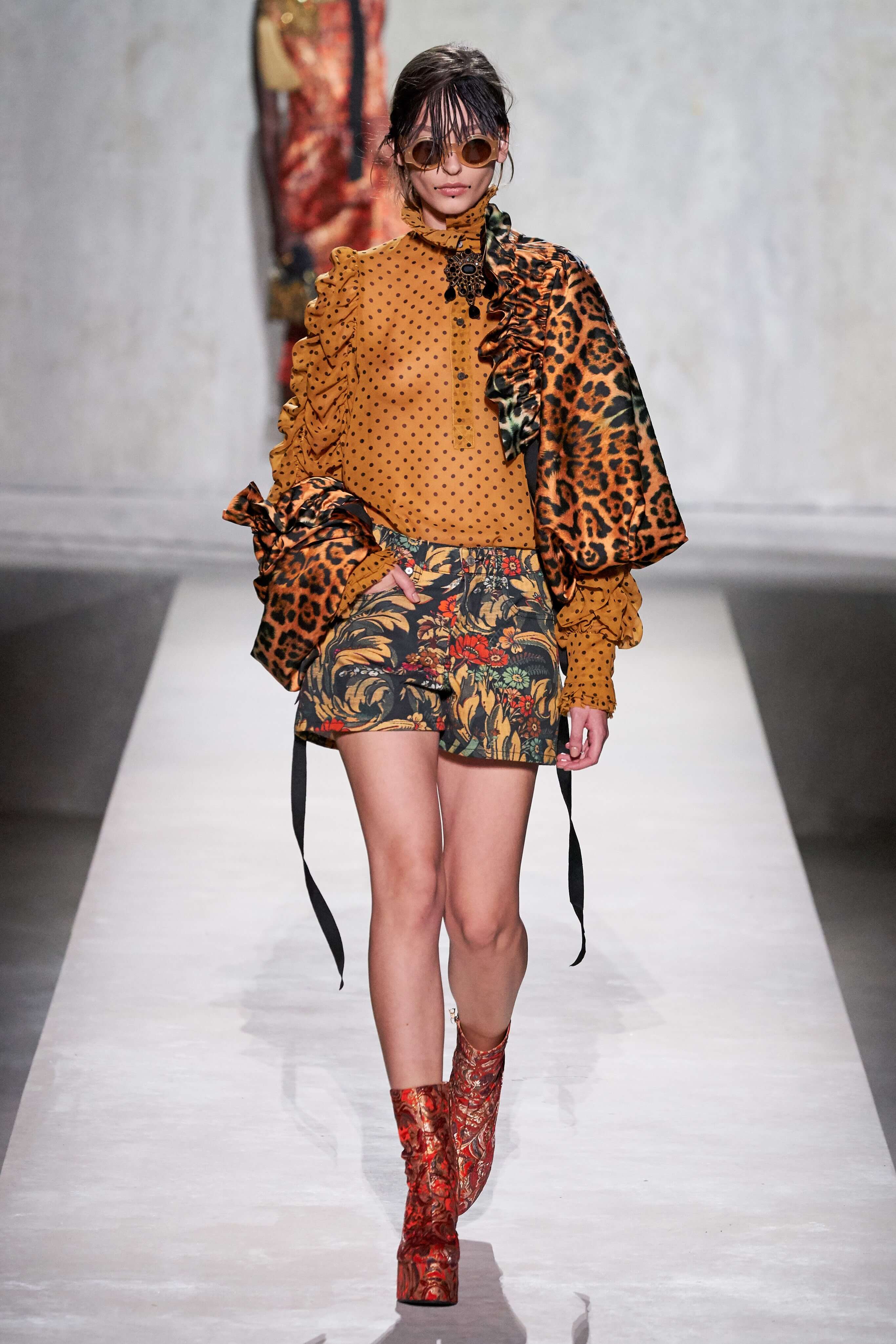 В коллекции есть пышные платья с хищными принтами, жаккардовые пальто в блестящих цветах, юбки в стиле фламенко и топы с одним объёмным рукавом и бантом на плече, многослойные наряды, в которых сочетаются сразу и мелкий гороховый принт, и тигровые узоры, и много, действительно много цветов. А самое главное — выглядит каждая вещь фантастически красиво и современно. Надеть хочется даже тигровый брючный костюм. Прически моделей украшали знаковые для кутюрной моды прошлых десятилетий плюмажи из перьев и шапочки из золотого люрекса, а в руках были маленькие сумочки в узорах под зебру и леопарда.