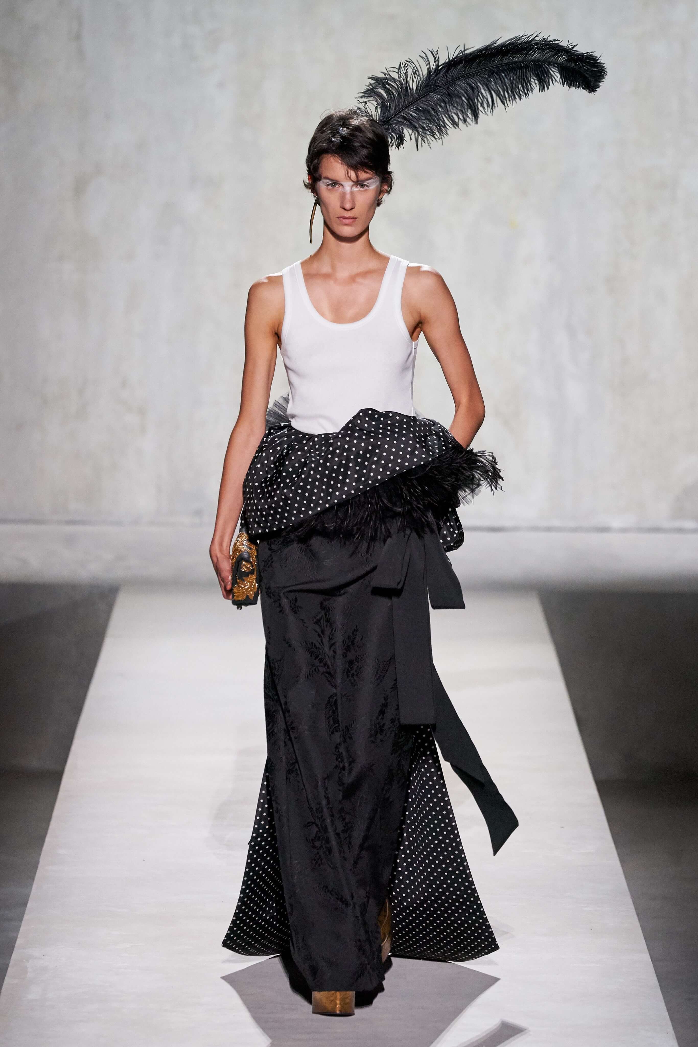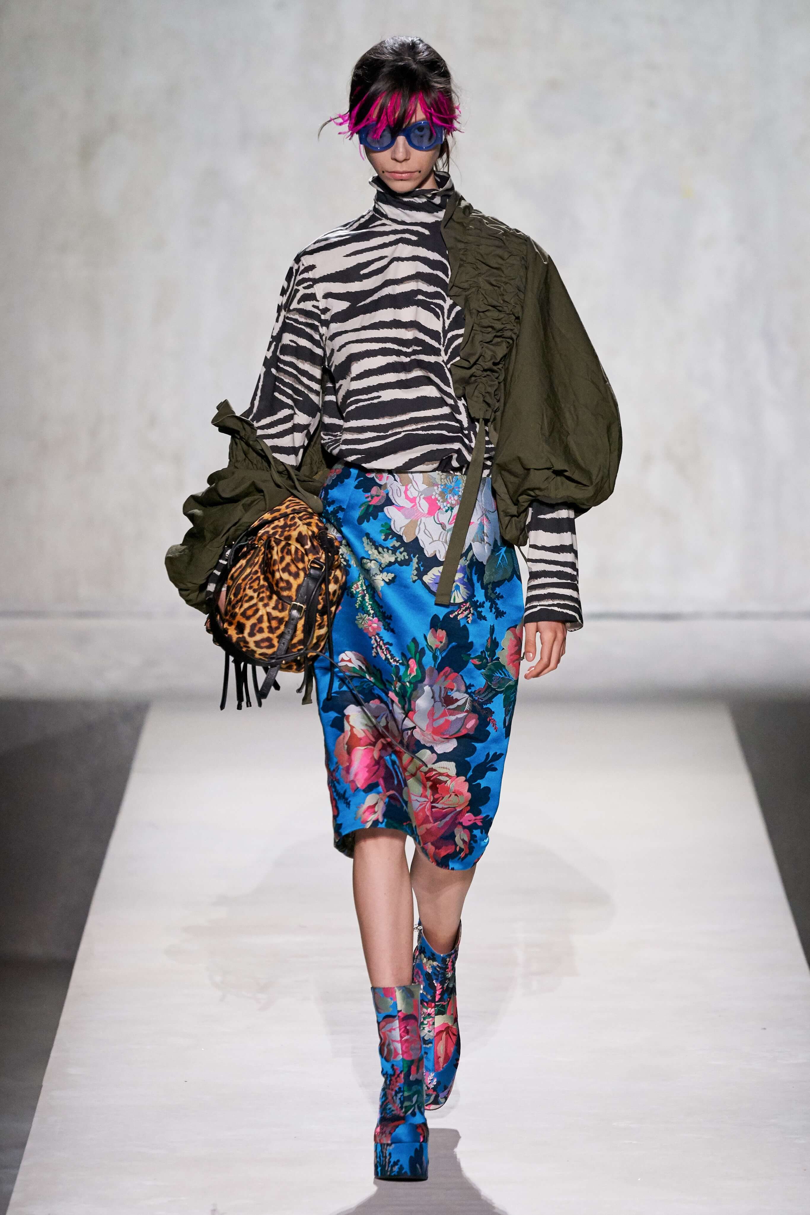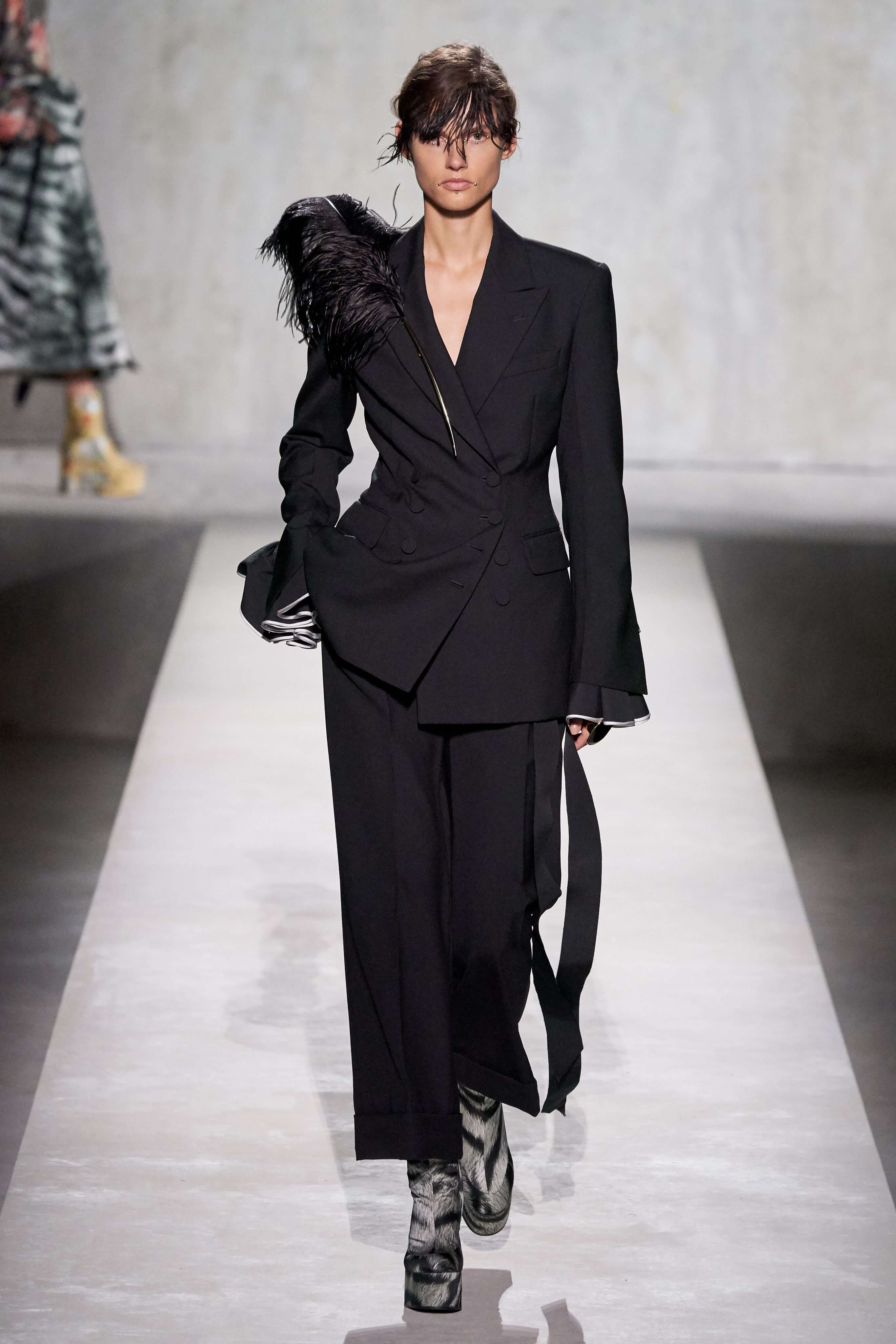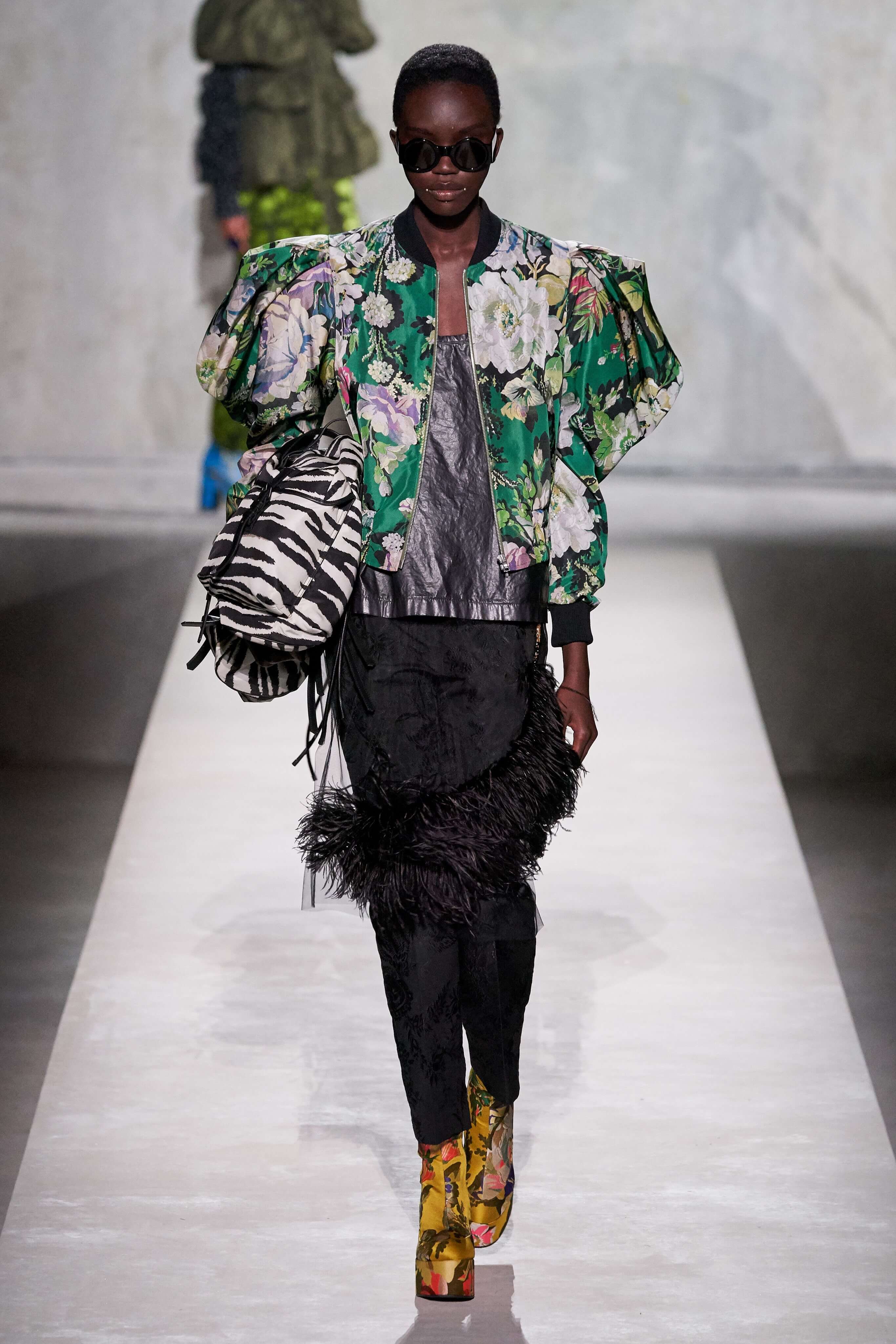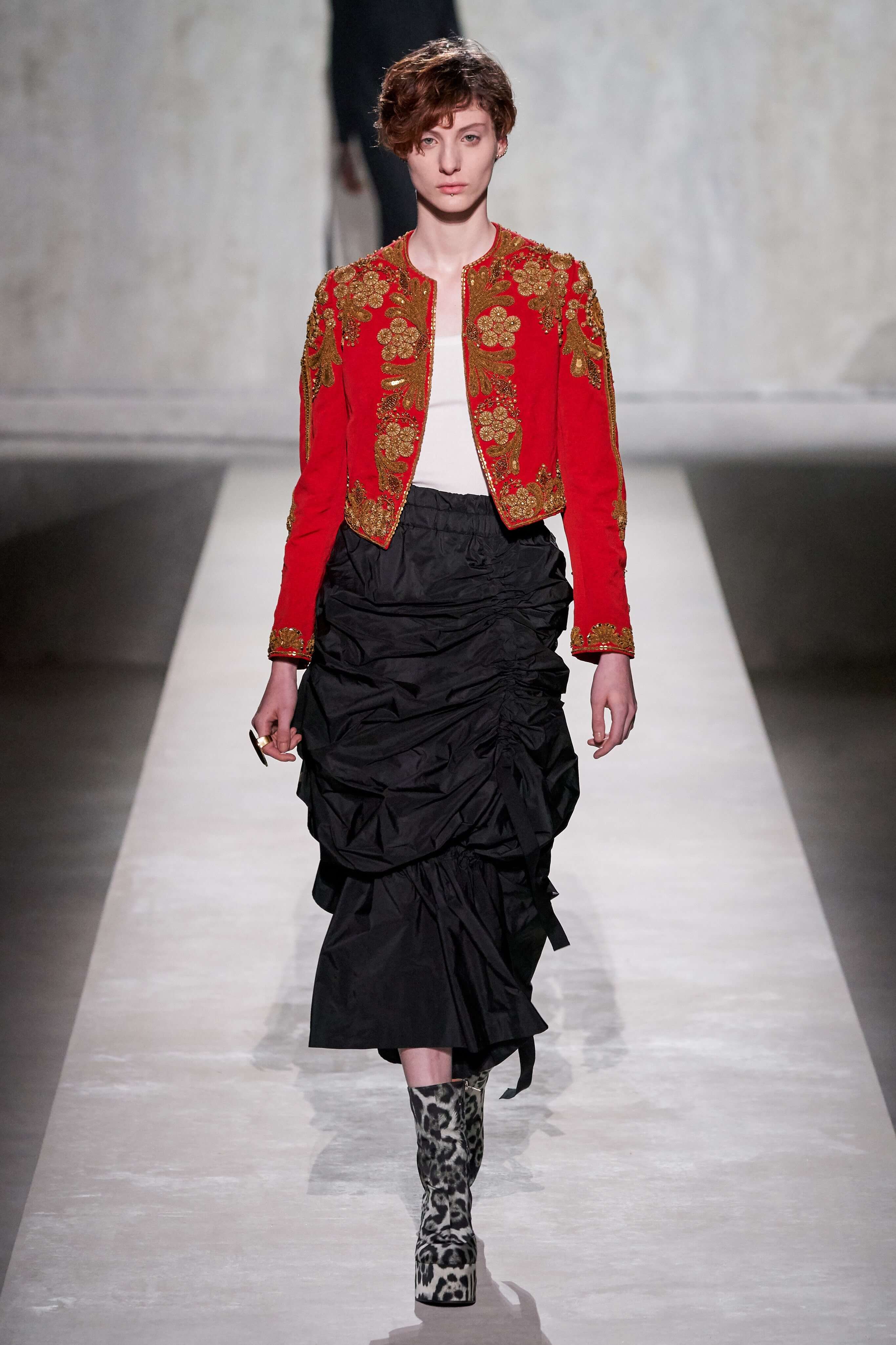 В коллекции есть пышные платья с хищными принтами, жаккардовые пальто в блестящих цветах, юбки в стиле фламенко и топы с одним объёмным рукавом и бантом на плече, многослойные наряды, в которых сочетаются сразу и мелкий гороховый принт, и тигровые узоры, и много, действительно много цветов. А самое главное — выглядит каждая вещь фантастически красиво и современно. Надеть хочется даже тигровый брючный костюм. Прически моделей украшали знаковые для кутюрной моды прошлых десятилетий плюмажи из перьев и шапочки из золотого люрекса, а в руках были маленькие сумочки в узорах под зебру и леопарда.