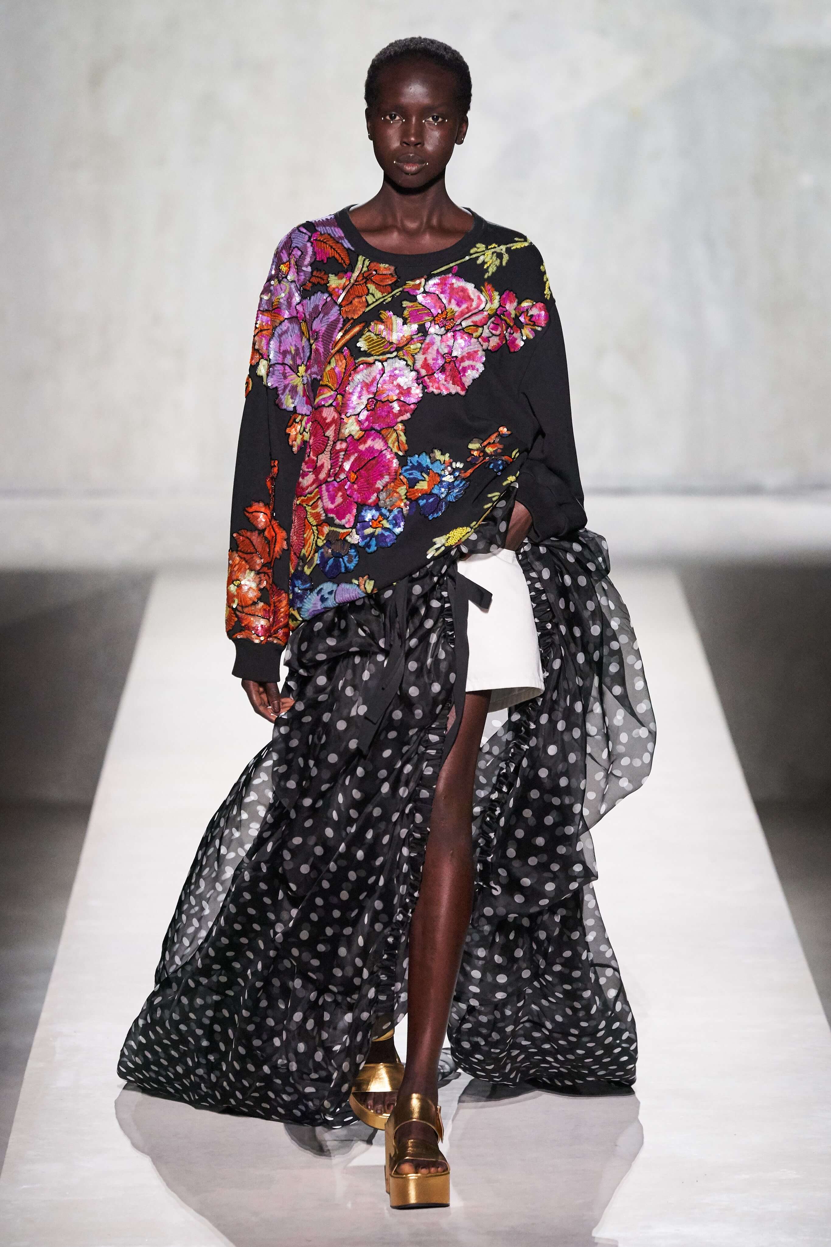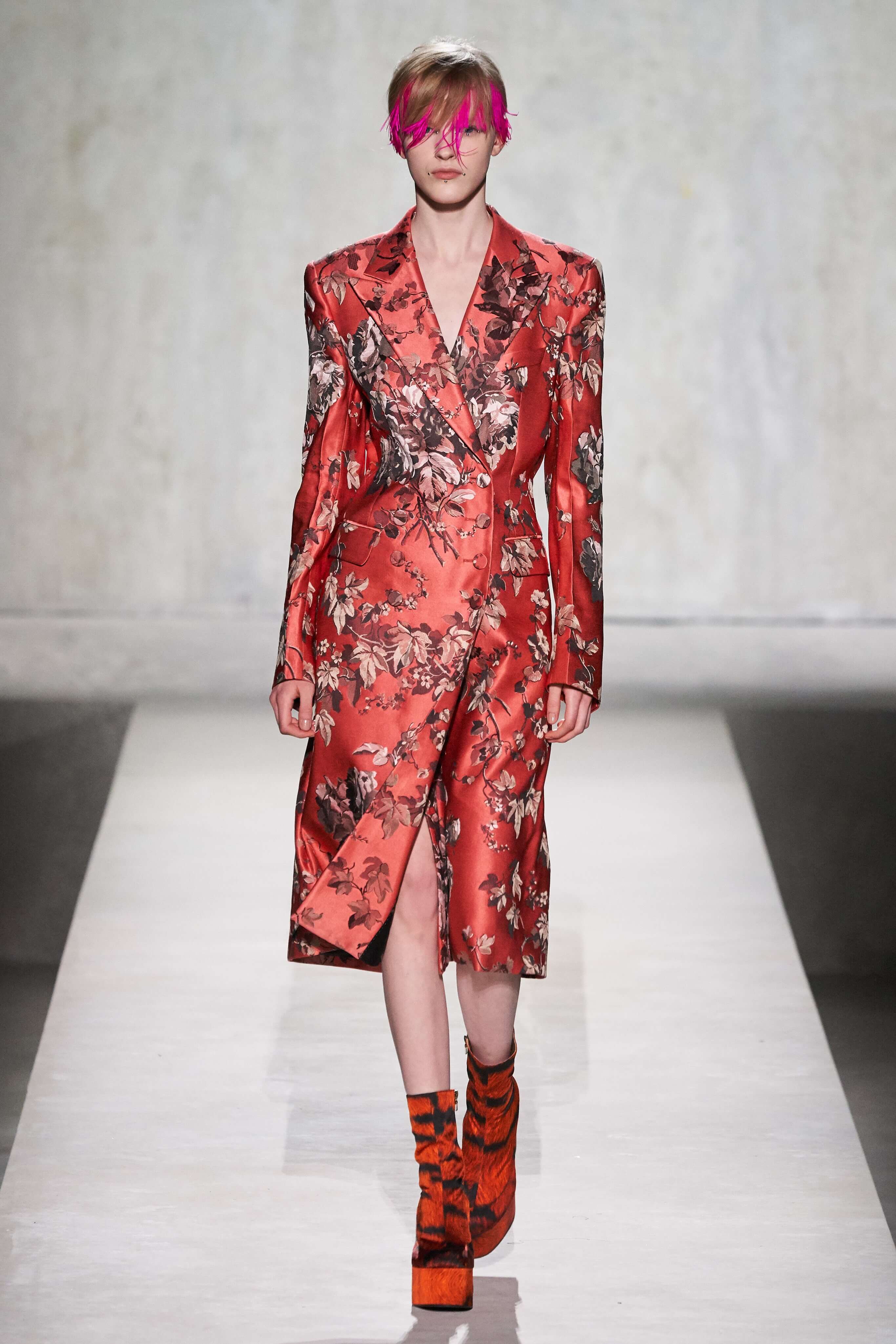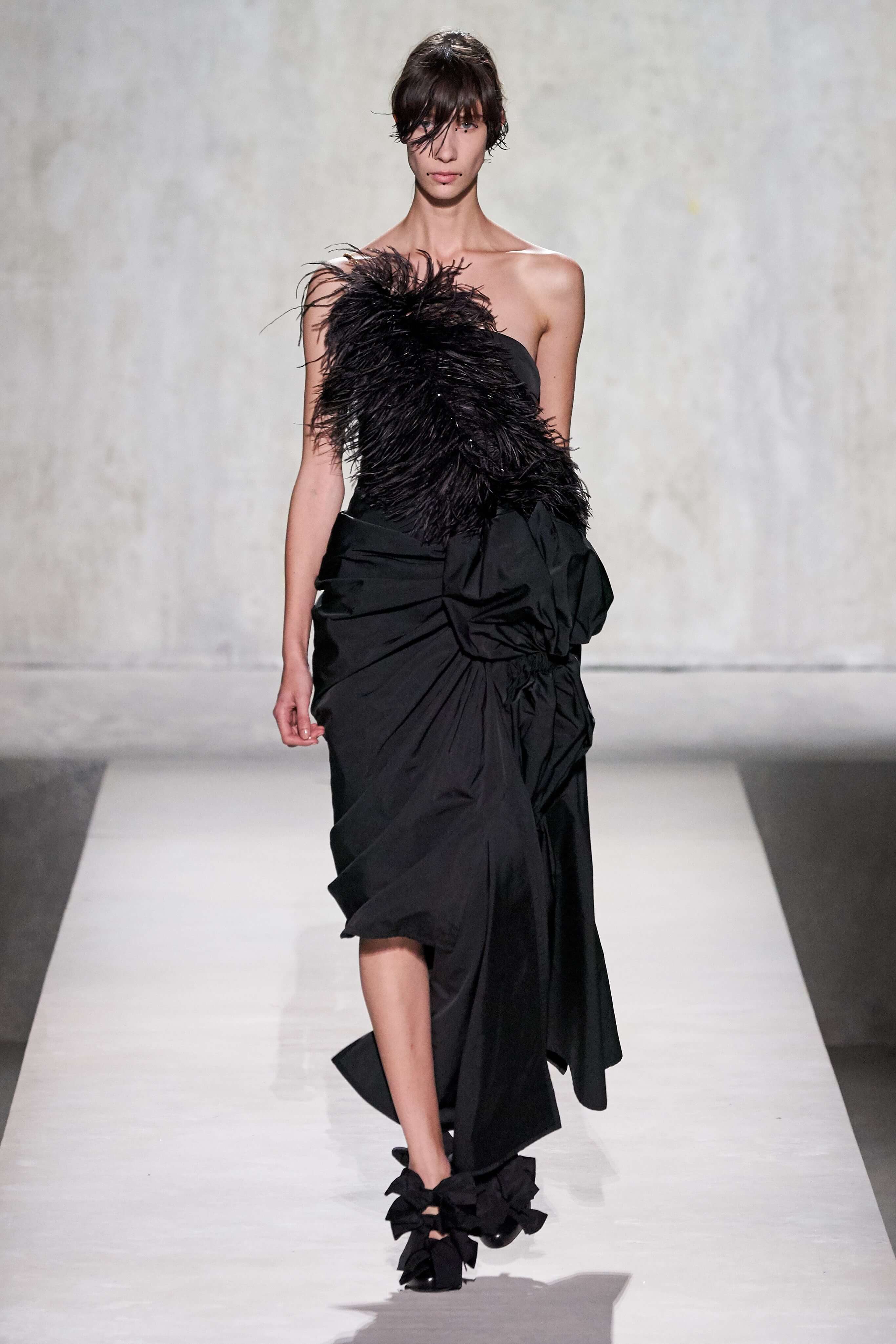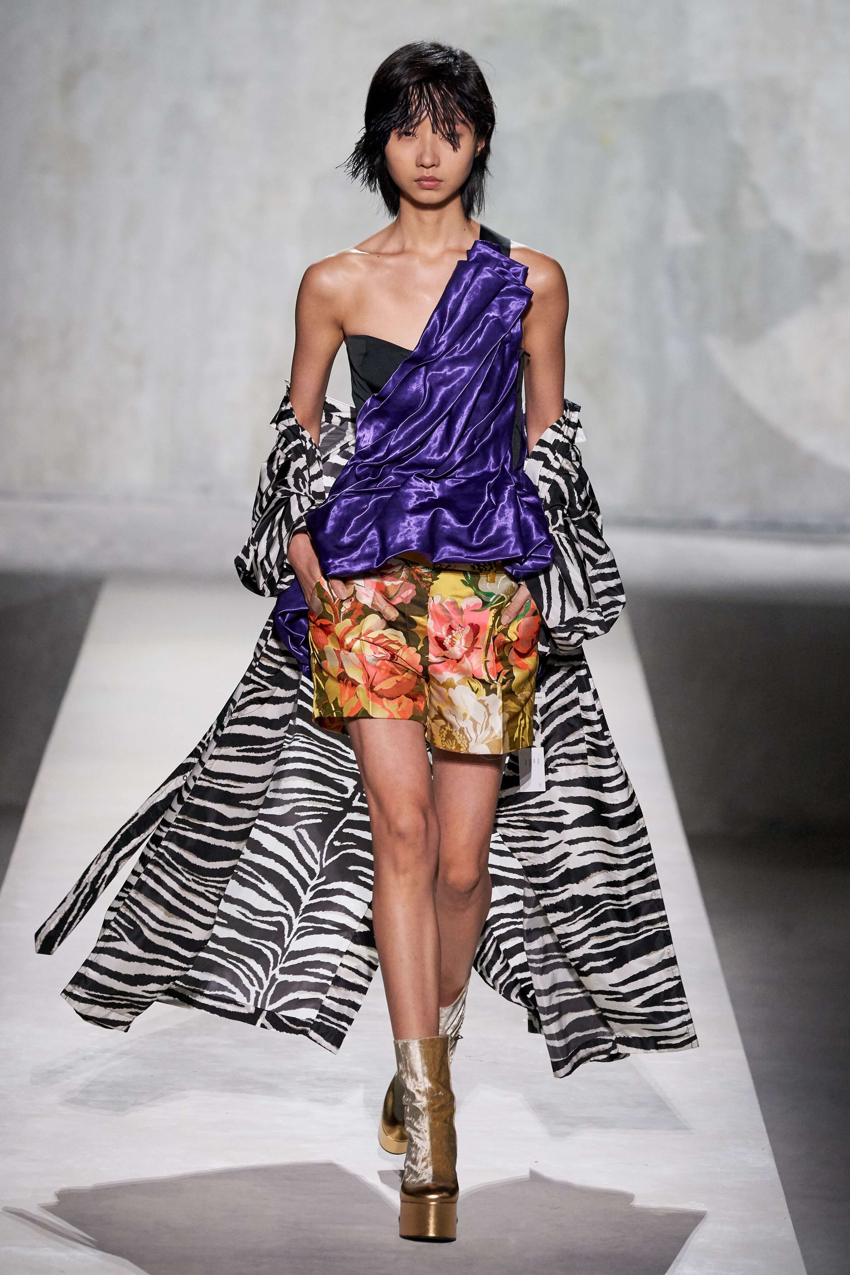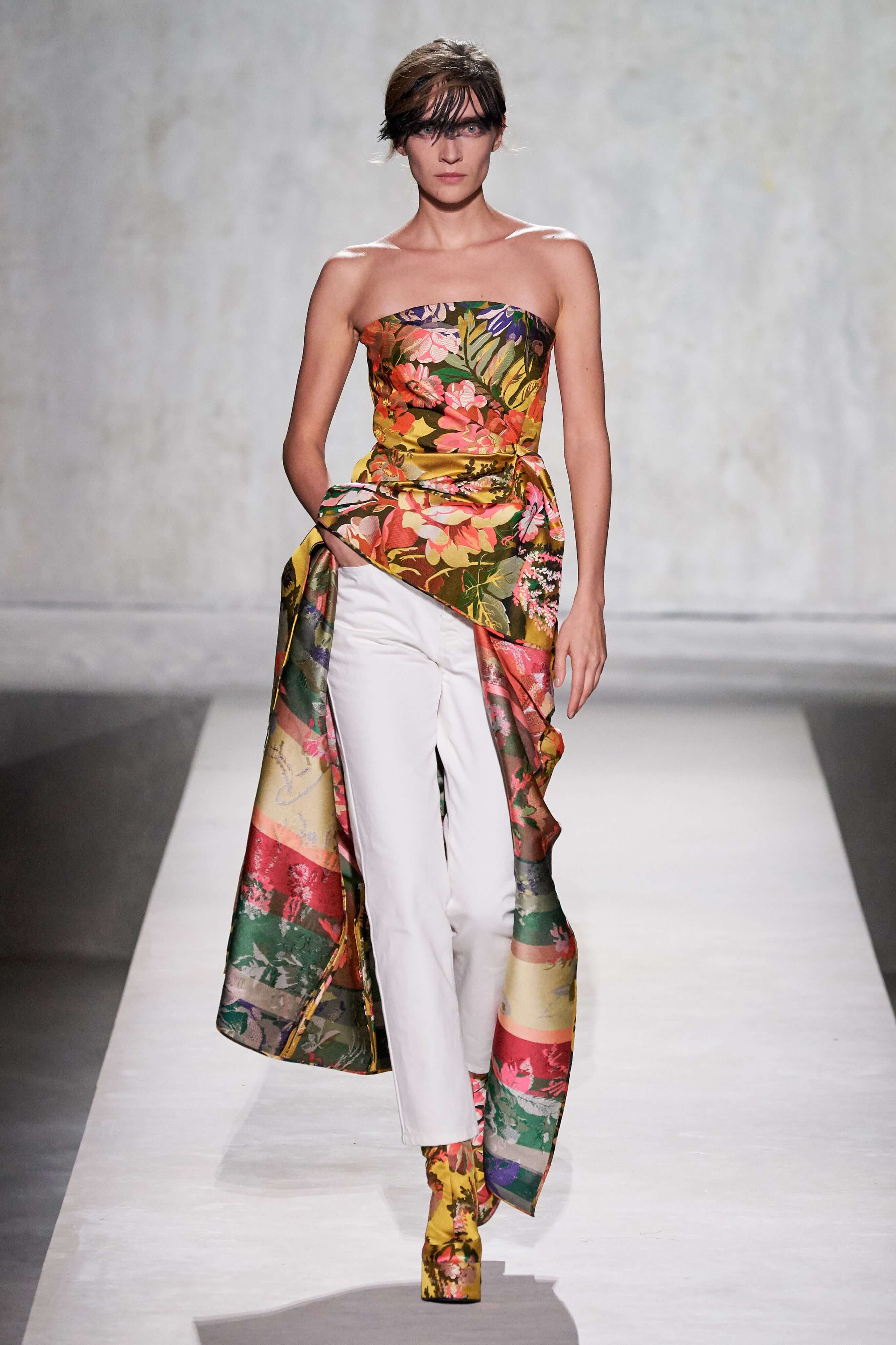 В коллекции есть пышные платья с хищными принтами, жаккардовые пальто в блестящих цветах, юбки в стиле фламенко и топы с одним объёмным рукавом и бантом на плече, многослойные наряды, в которых сочетаются сразу и мелкий гороховый принт, и тигровые узоры, и много, действительно много цветов. А самое главное — выглядит каждая вещь фантастически красиво и современно. Надеть хочется даже тигровый брючный костюм. Прически моделей украшали знаковые для кутюрной моды прошлых десятилетий плюмажи из перьев и шапочки из золотого люрекса, а в руках были маленькие сумочки в узорах под зебру и леопарда.