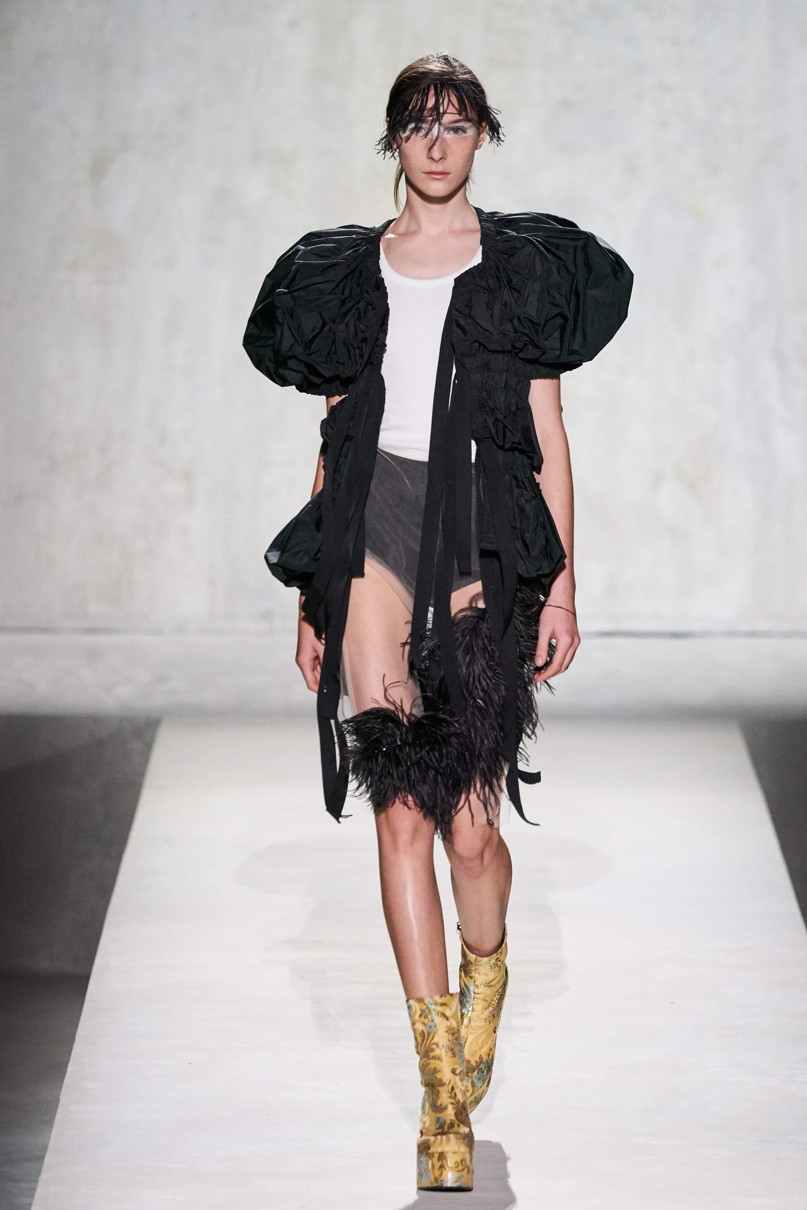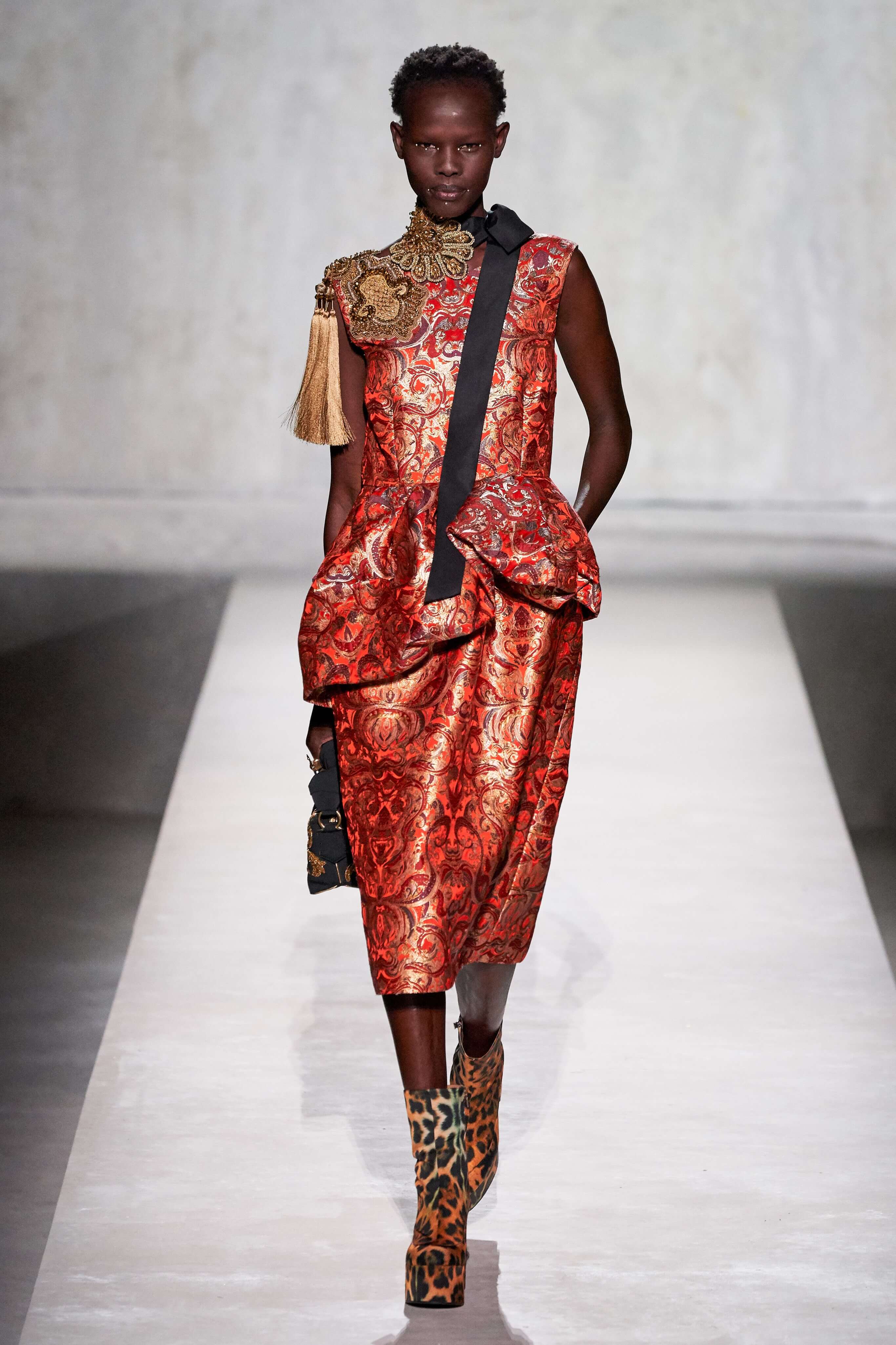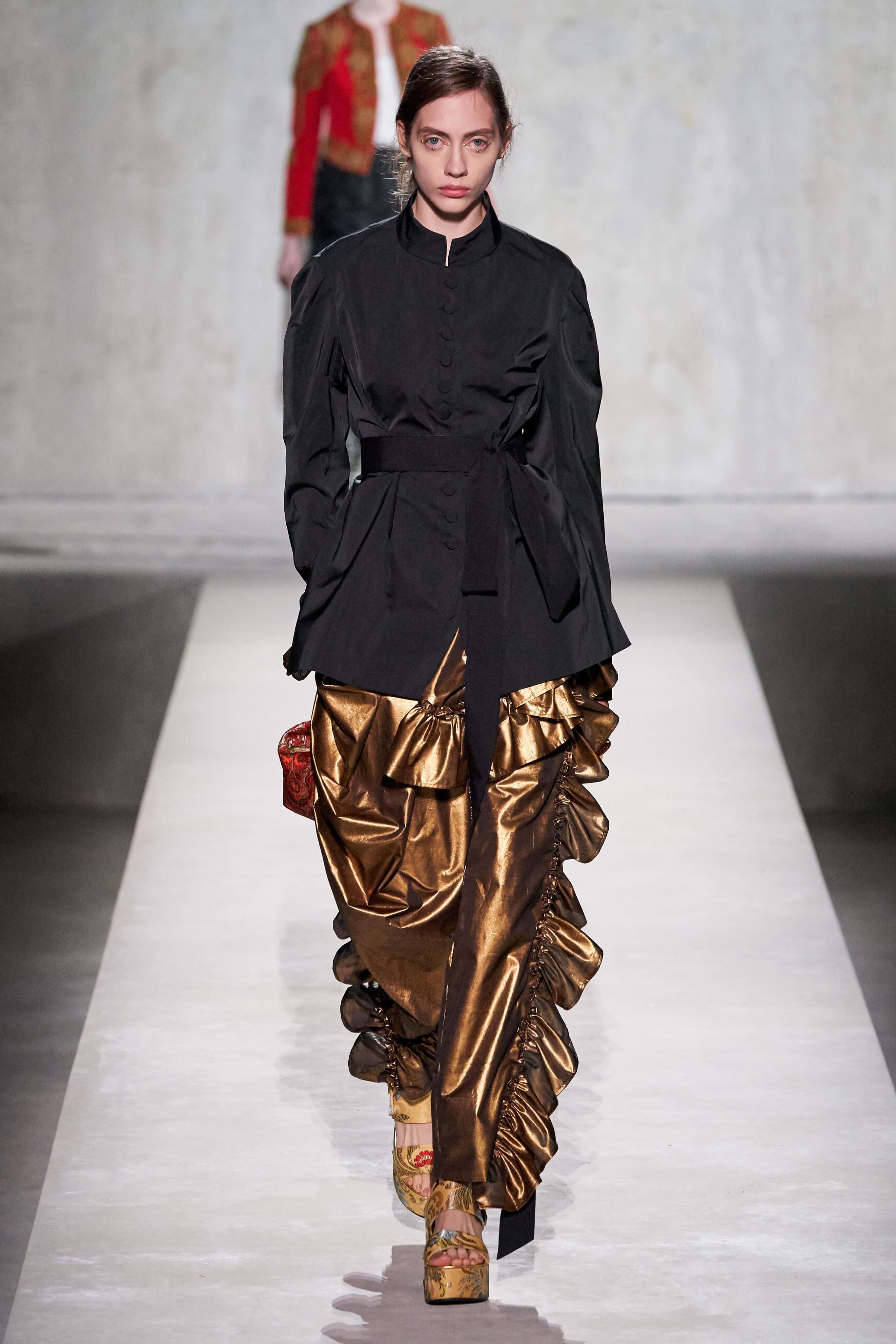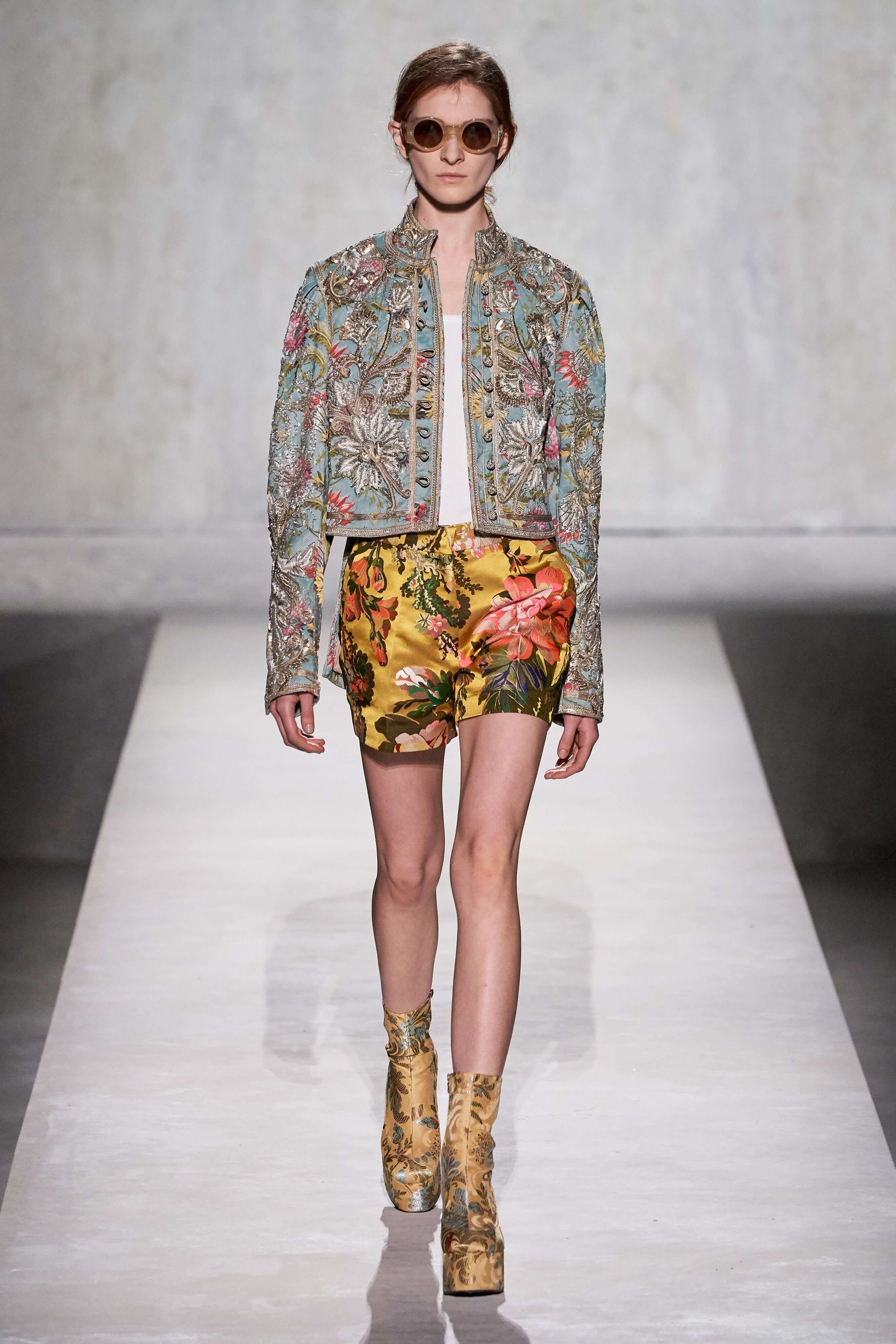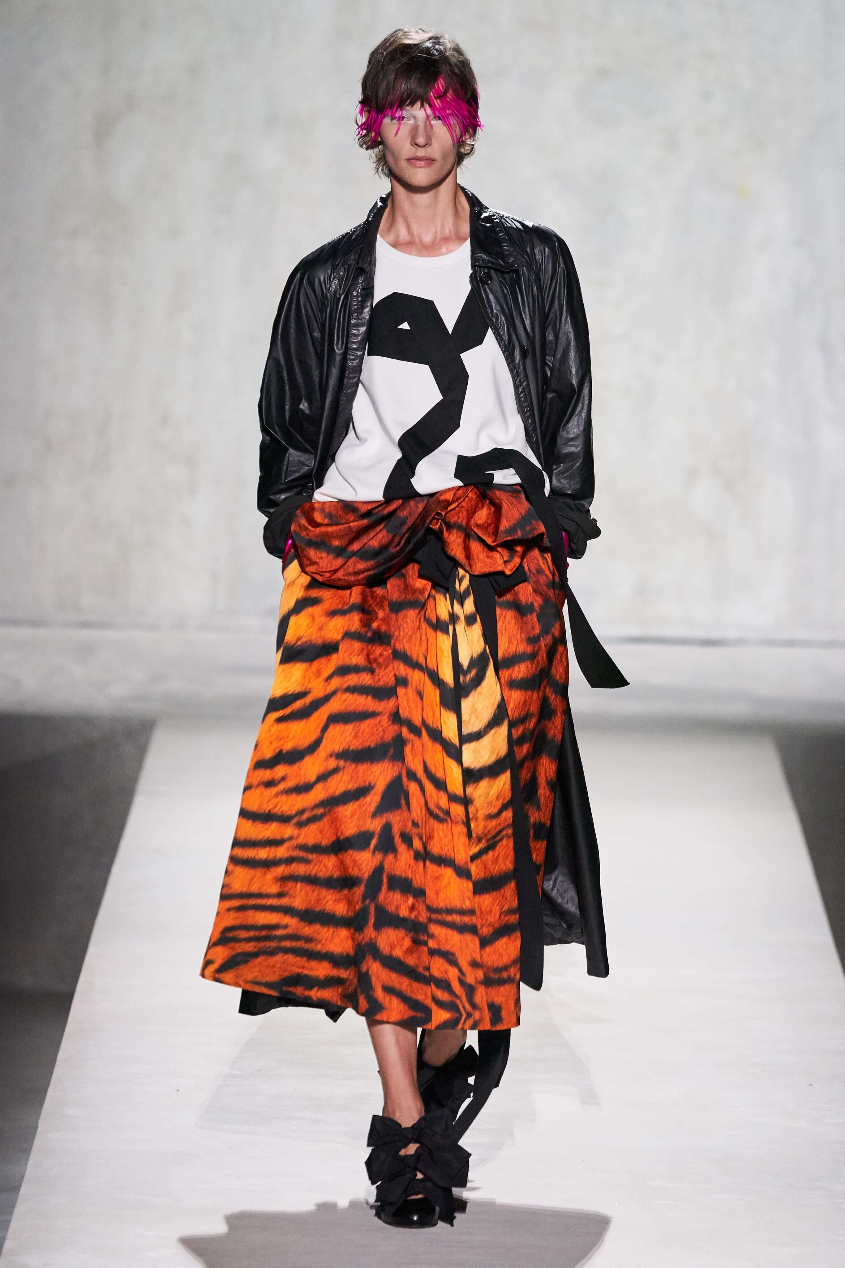 В коллекции есть пышные платья с хищными принтами, жаккардовые пальто в блестящих цветах, юбки в стиле фламенко и топы с одним объёмным рукавом и бантом на плече, многослойные наряды, в которых сочетаются сразу и мелкий гороховый принт, и тигровые узоры, и много, действительно много цветов. А самое главное — выглядит каждая вещь фантастически красиво и современно. Надеть хочется даже тигровый брючный костюм. Прически моделей украшали знаковые для кутюрной моды прошлых десятилетий плюмажи из перьев и шапочки из золотого люрекса, а в руках были маленькие сумочки в узорах под зебру и леопарда.