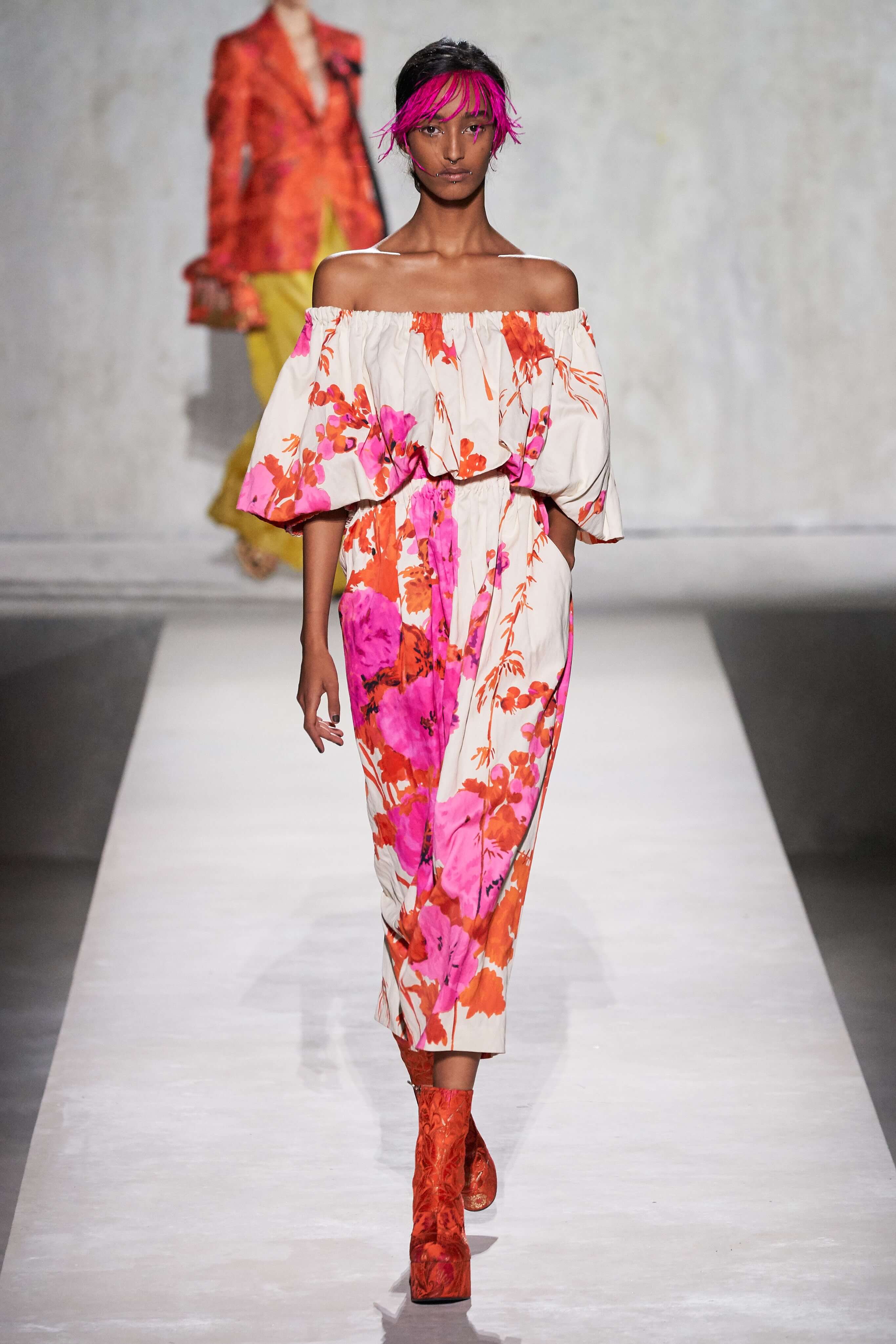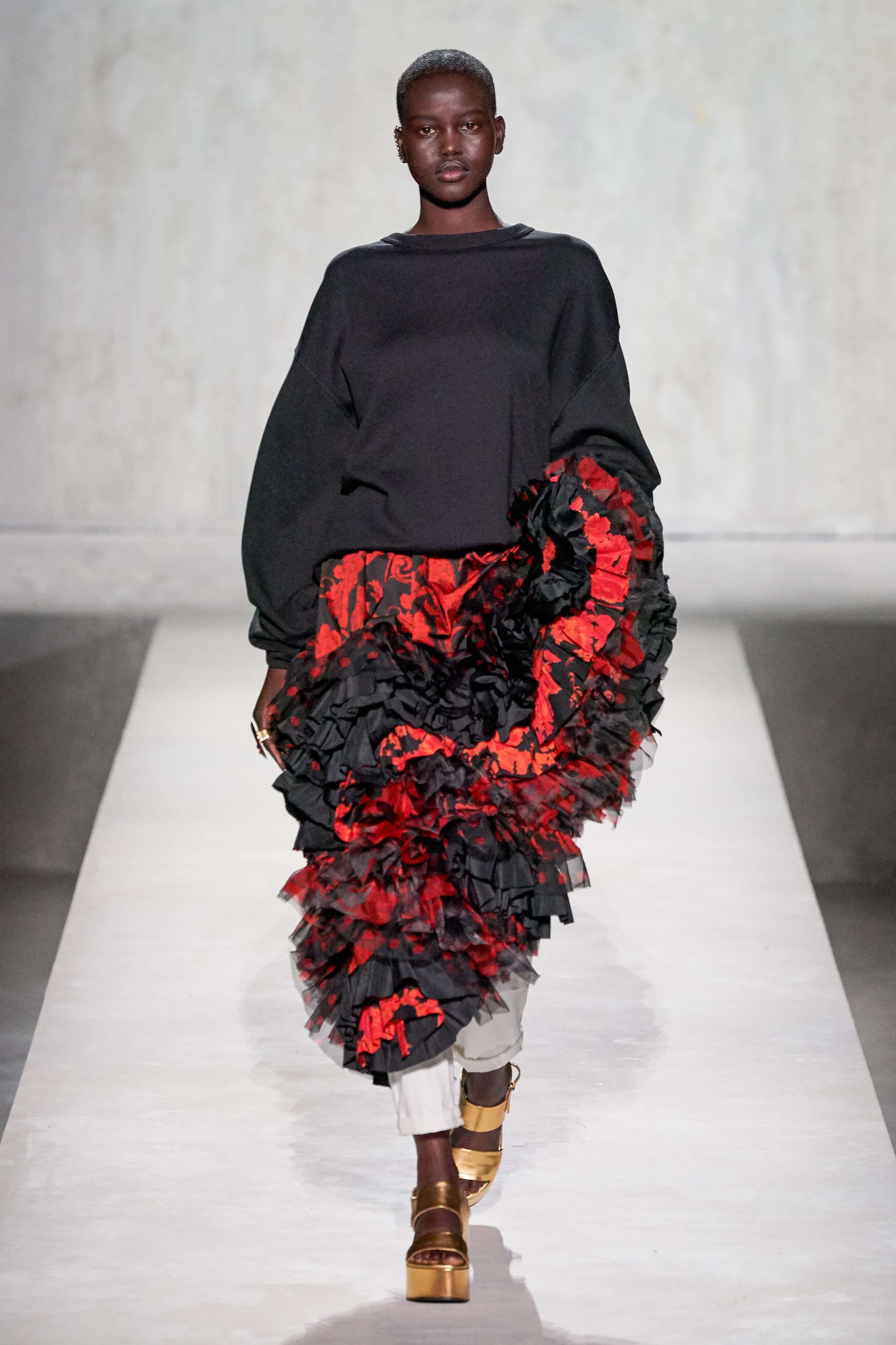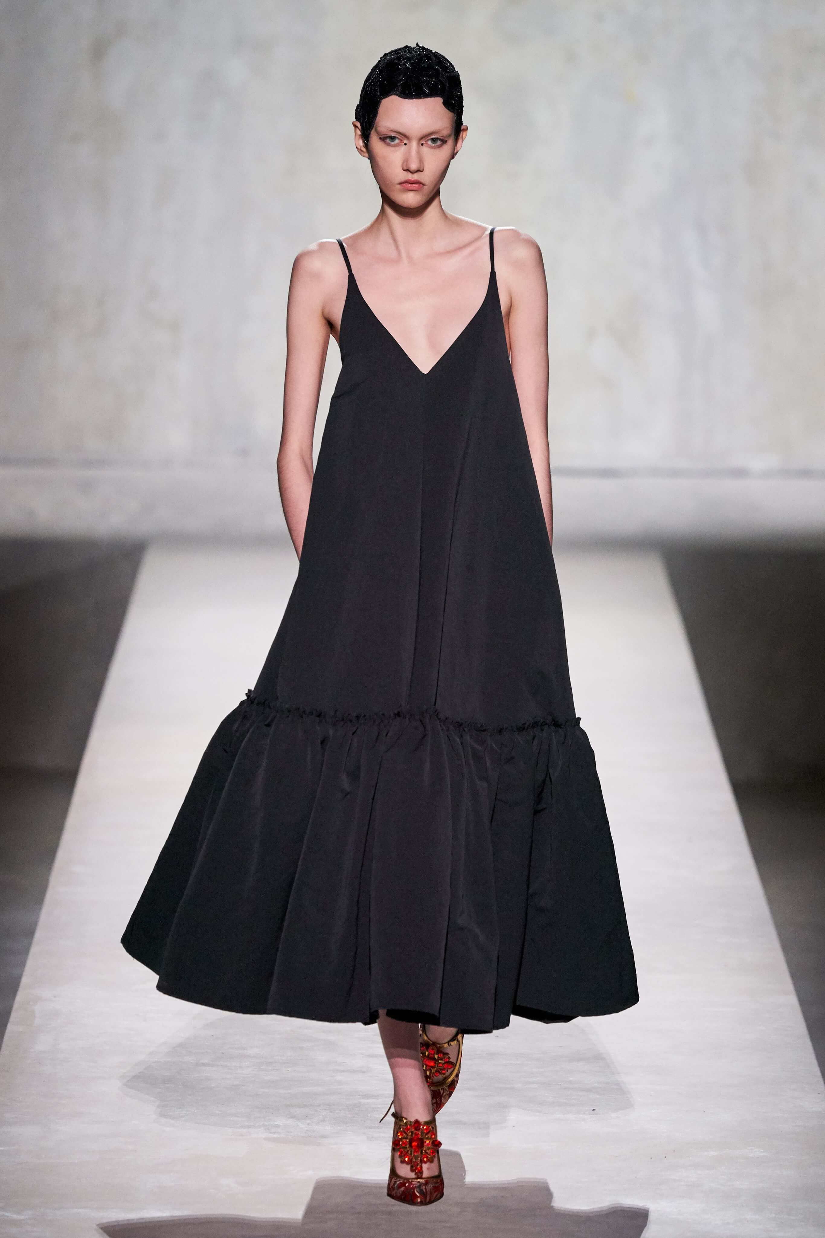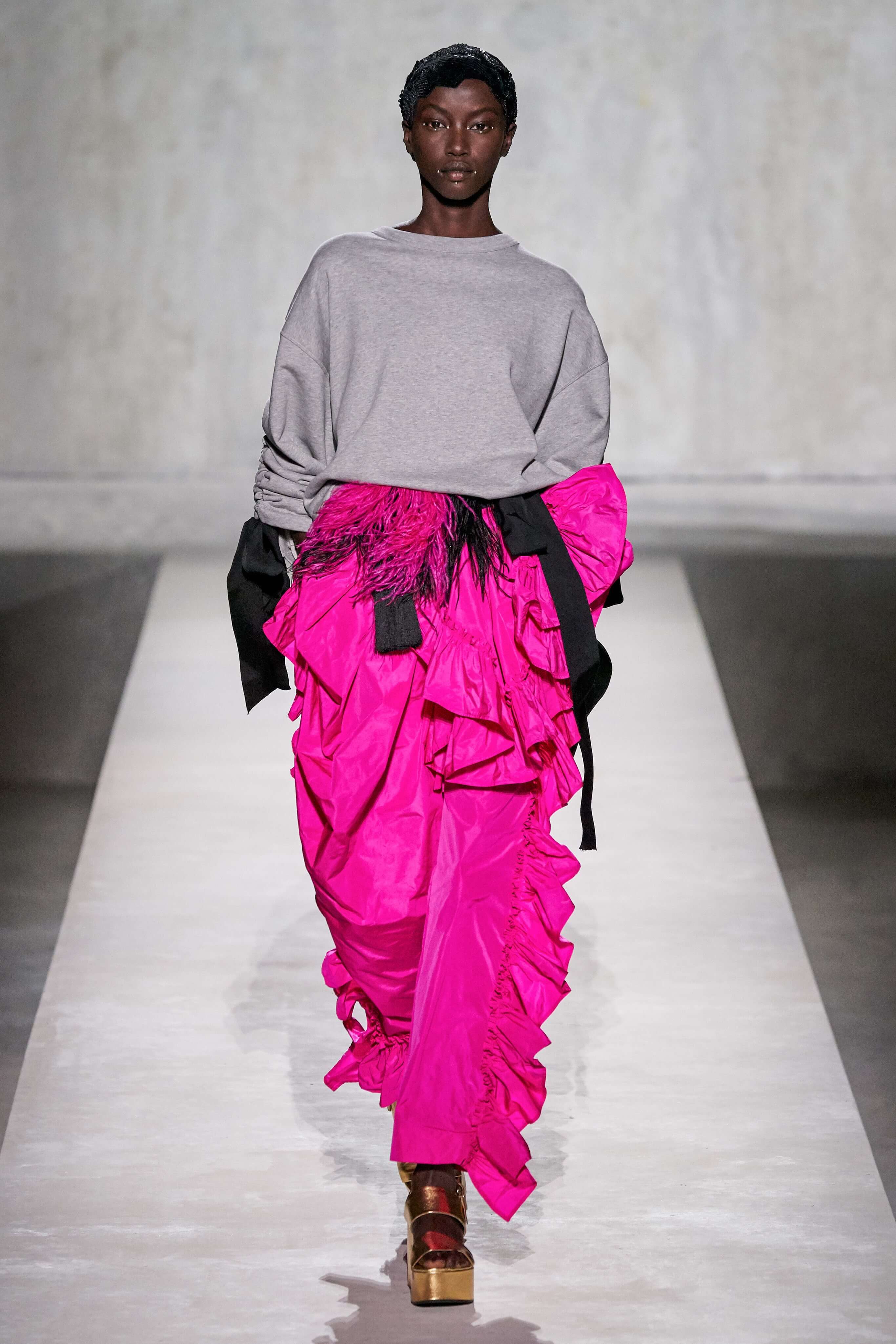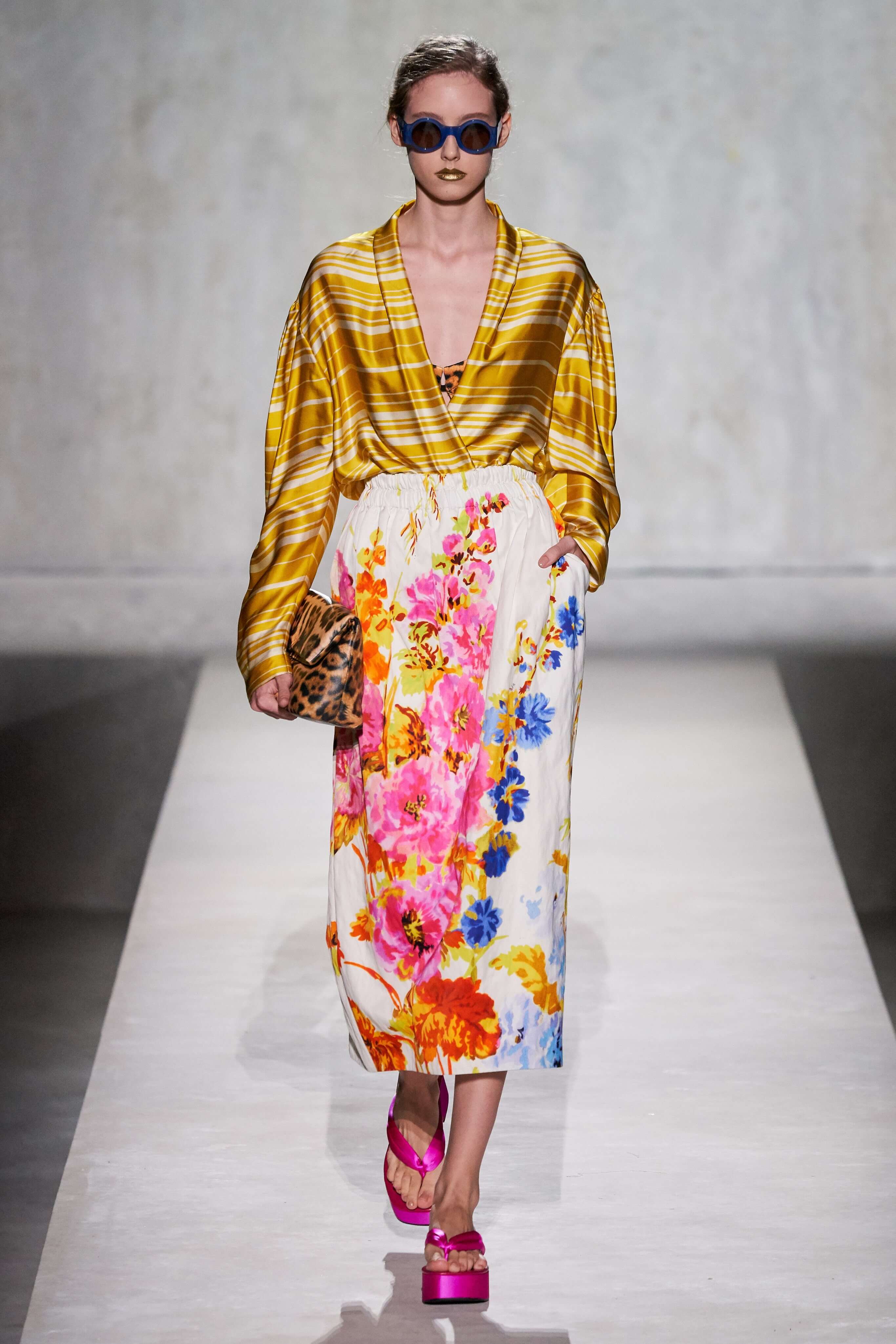 В коллекции есть пышные платья с хищными принтами, жаккардовые пальто в блестящих цветах, юбки в стиле фламенко и топы с одним объёмным рукавом и бантом на плече, многослойные наряды, в которых сочетаются сразу и мелкий гороховый принт, и тигровые узоры, и много, действительно много цветов. А самое главное — выглядит каждая вещь фантастически красиво и современно. Надеть хочется даже тигровый брючный костюм. Прически моделей украшали знаковые для кутюрной моды прошлых десятилетий плюмажи из перьев и шапочки из золотого люрекса, а в руках были маленькие сумочки в узорах под зебру и леопарда.