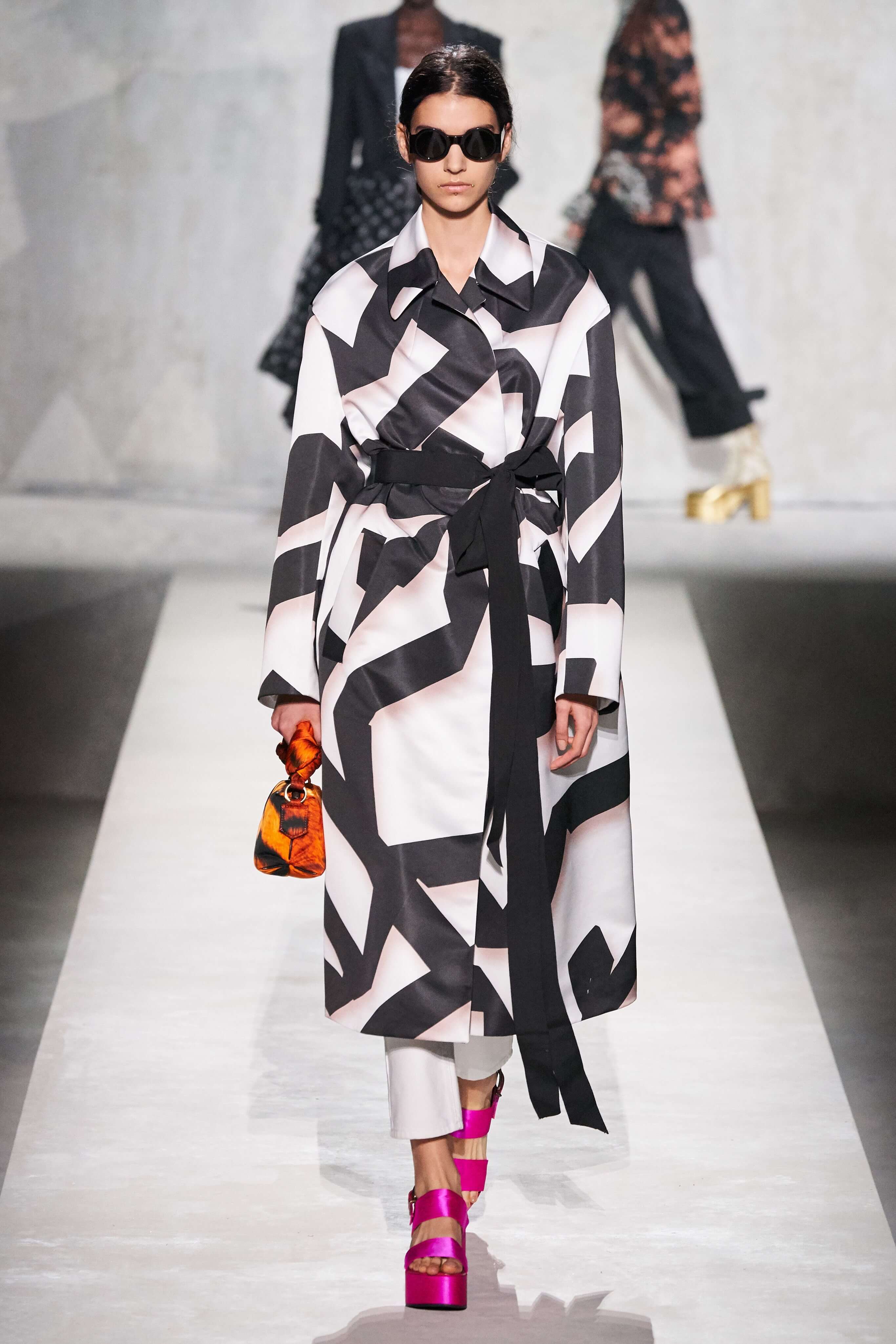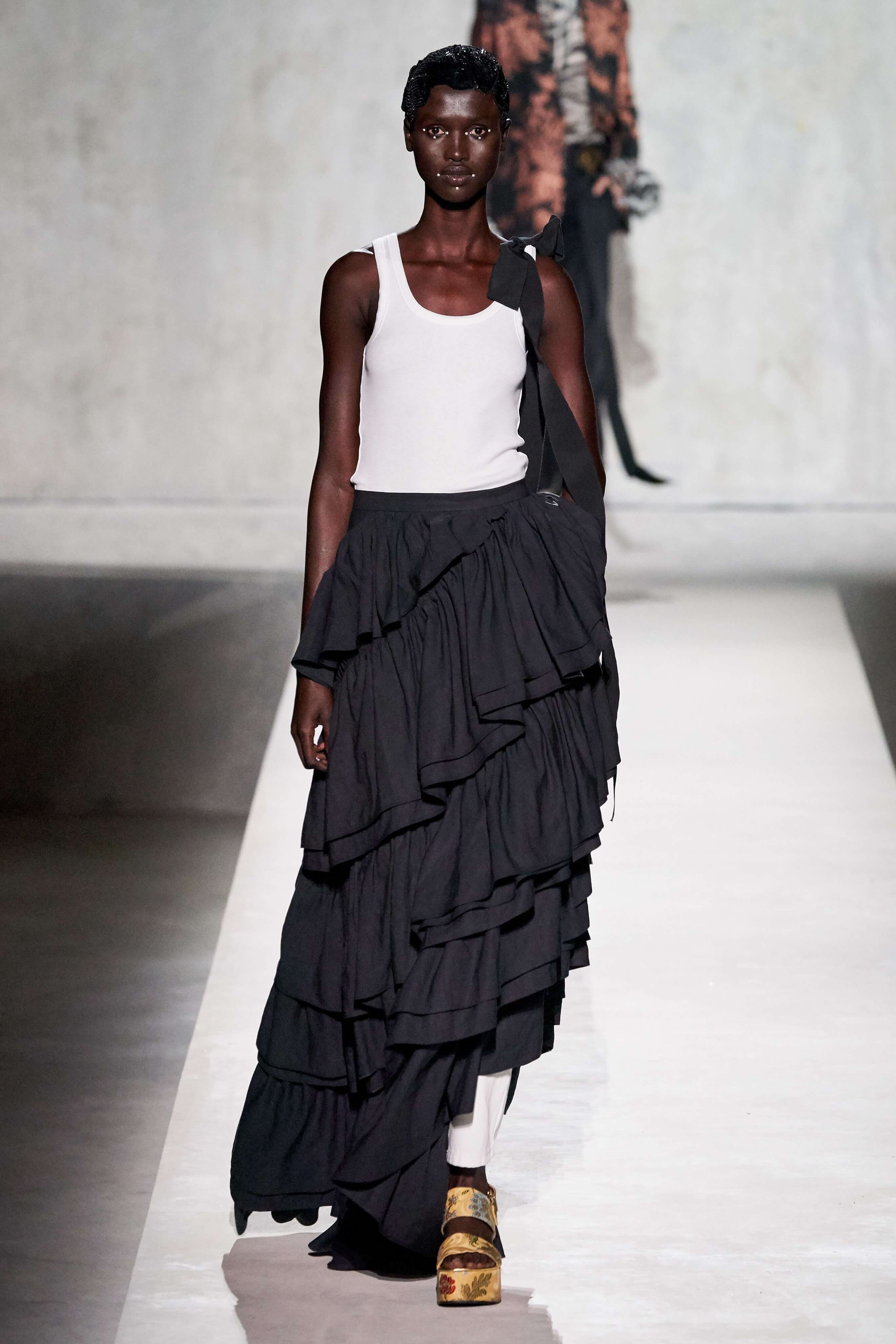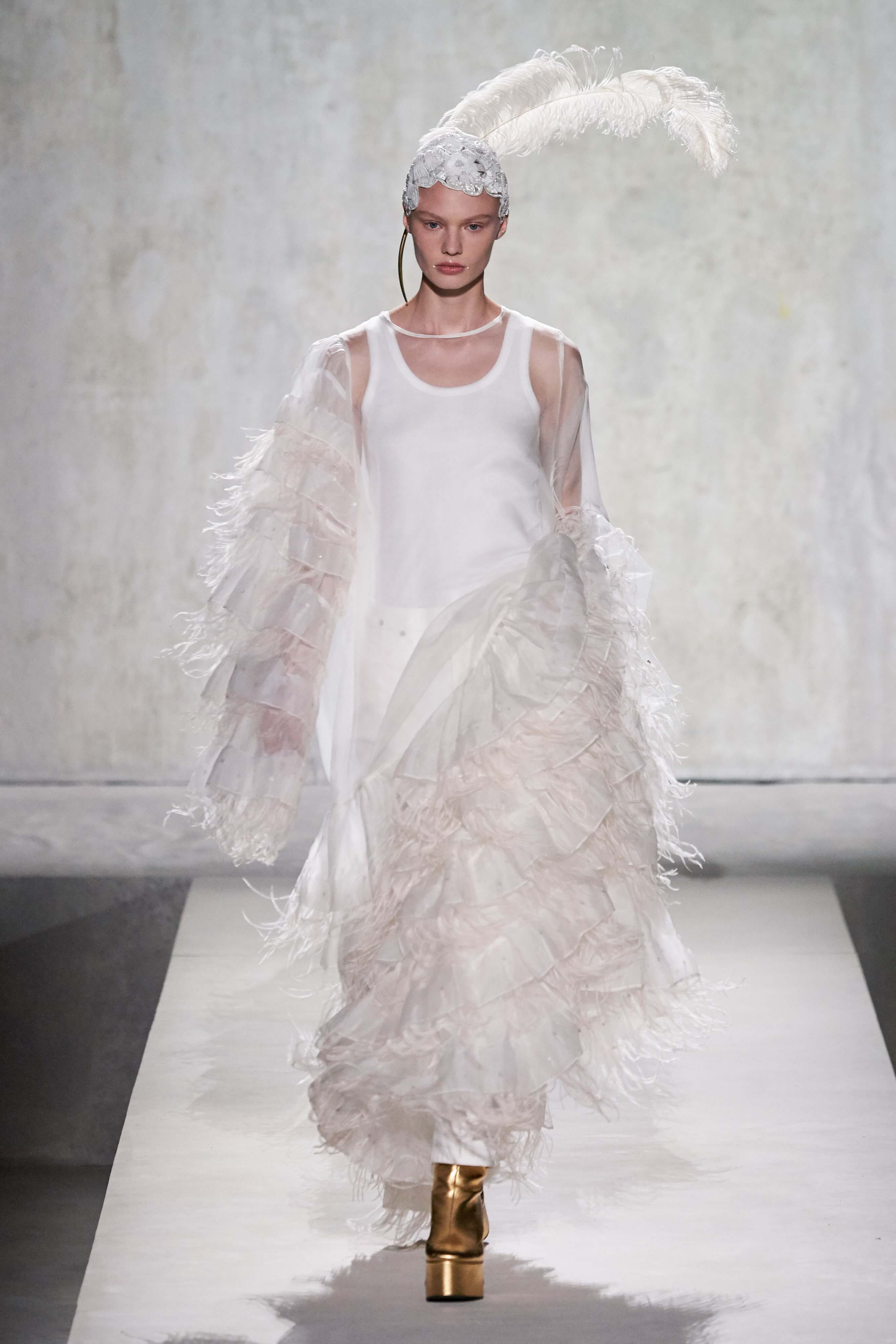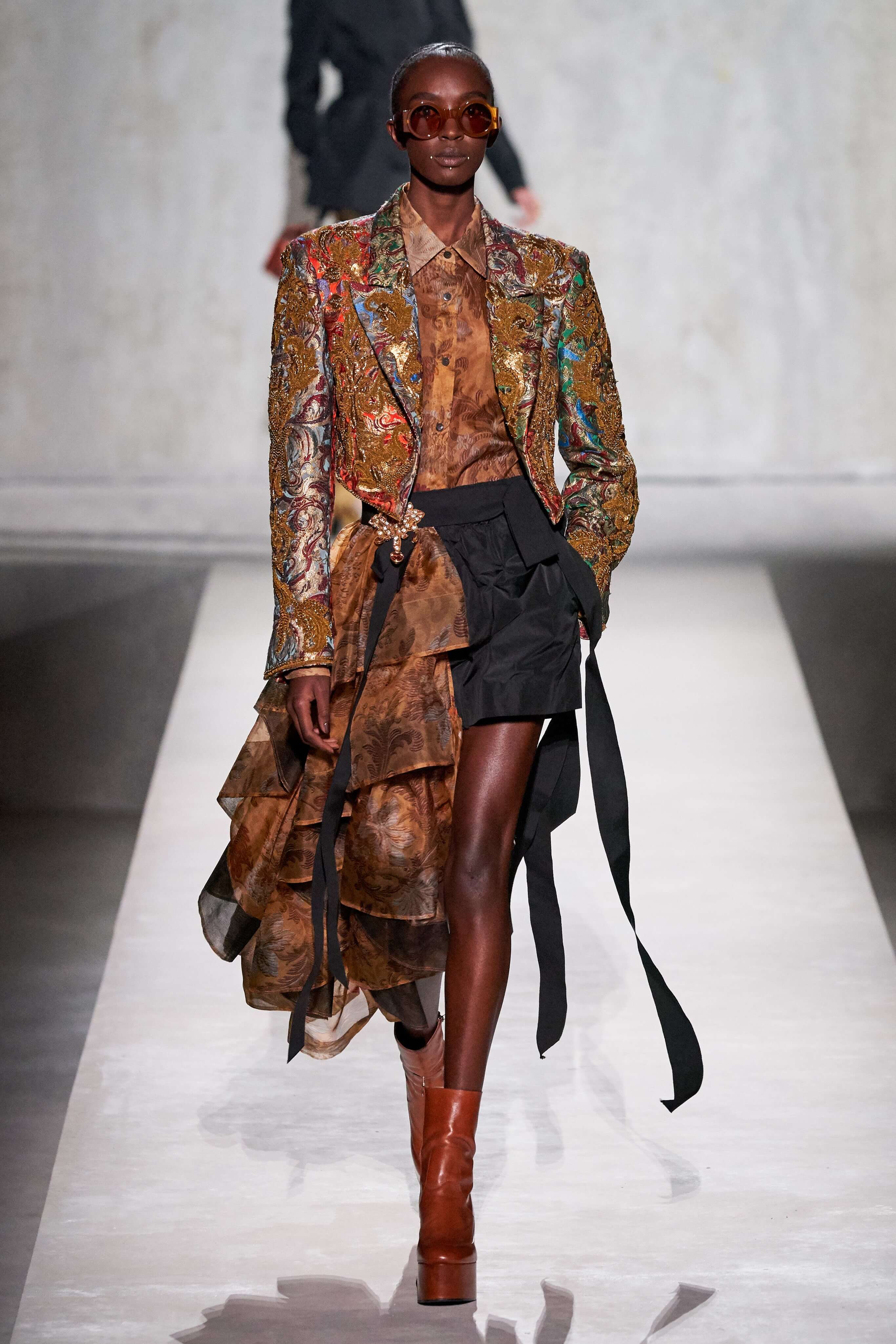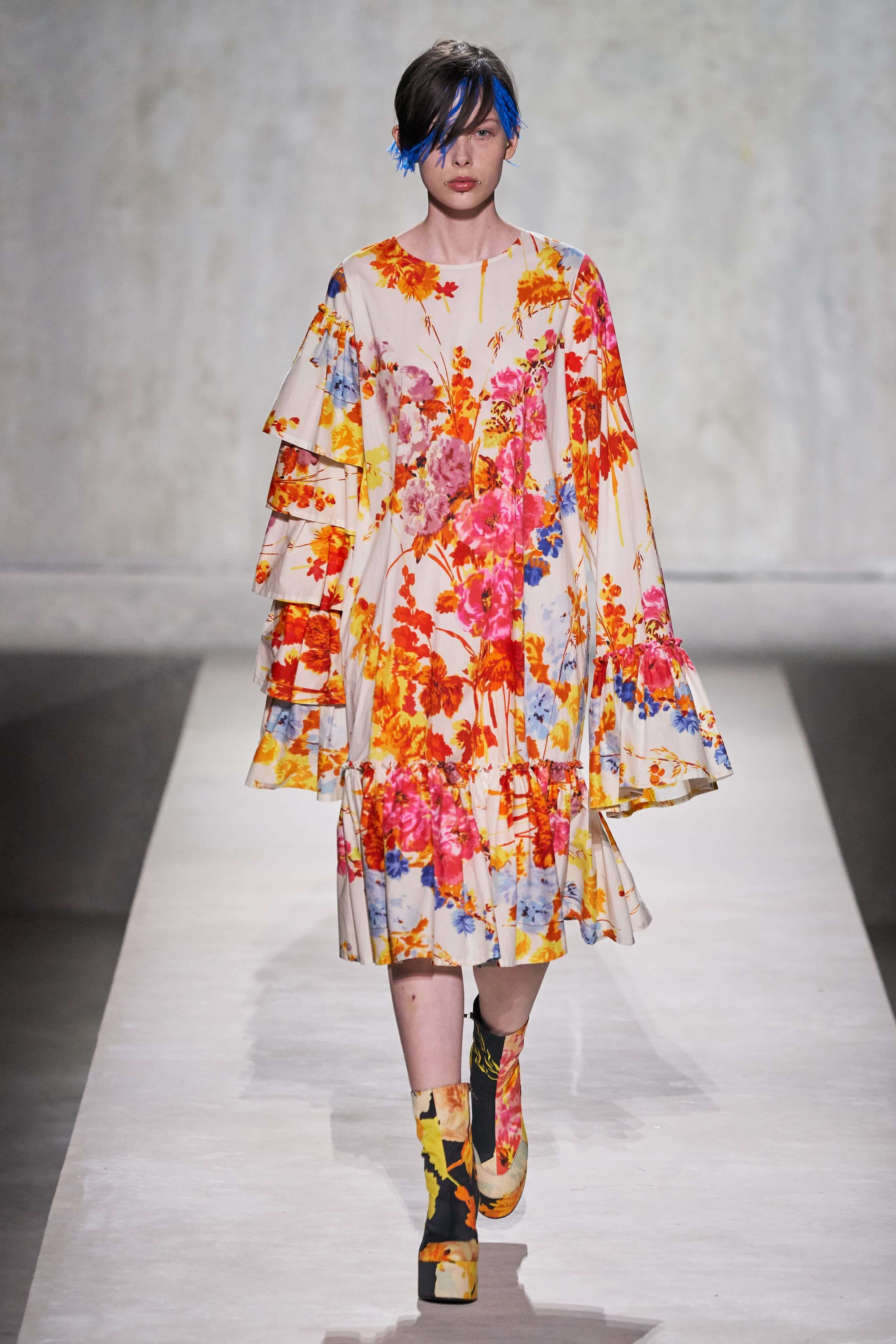 В коллекции есть пышные платья с хищными принтами, жаккардовые пальто в блестящих цветах, юбки в стиле фламенко и топы с одним объёмным рукавом и бантом на плече, многослойные наряды, в которых сочетаются сразу и мелкий гороховый принт, и тигровые узоры, и много, действительно много цветов. А самое главное — выглядит каждая вещь фантастически красиво и современно. Надеть хочется даже тигровый брючный костюм. Прически моделей украшали знаковые для кутюрной моды прошлых десятилетий плюмажи из перьев и шапочки из золотого люрекса, а в руках были маленькие сумочки в узорах под зебру и леопарда.
