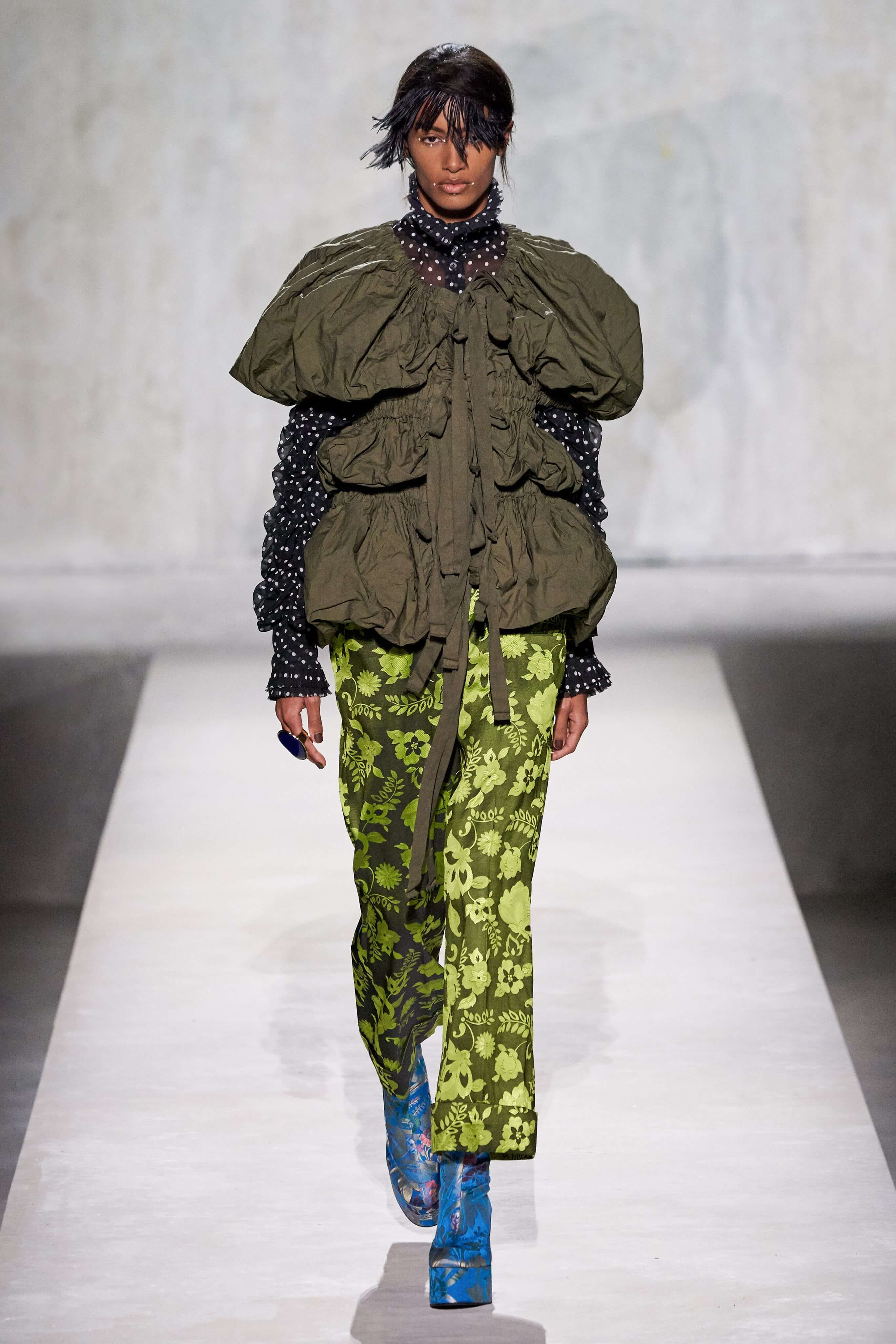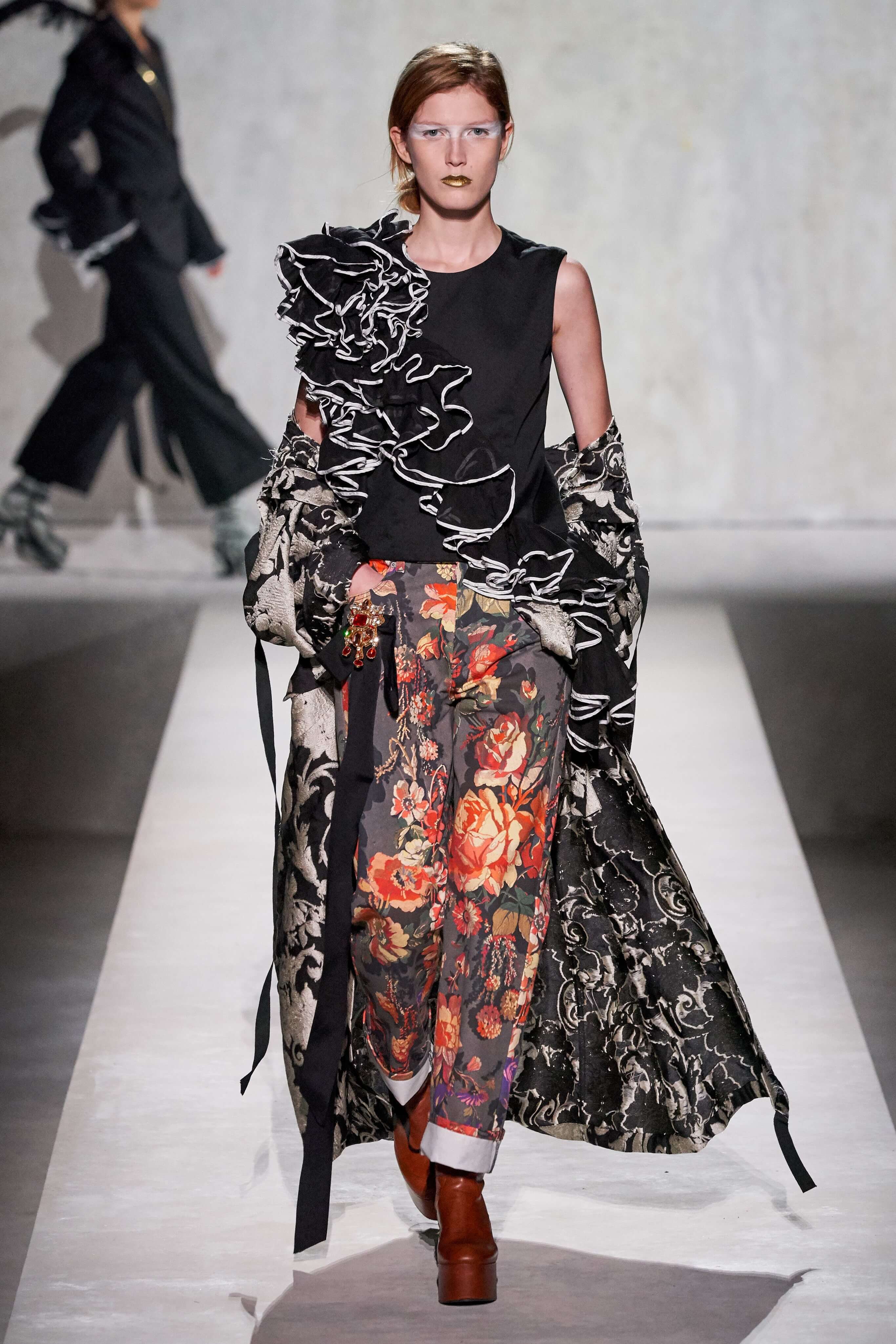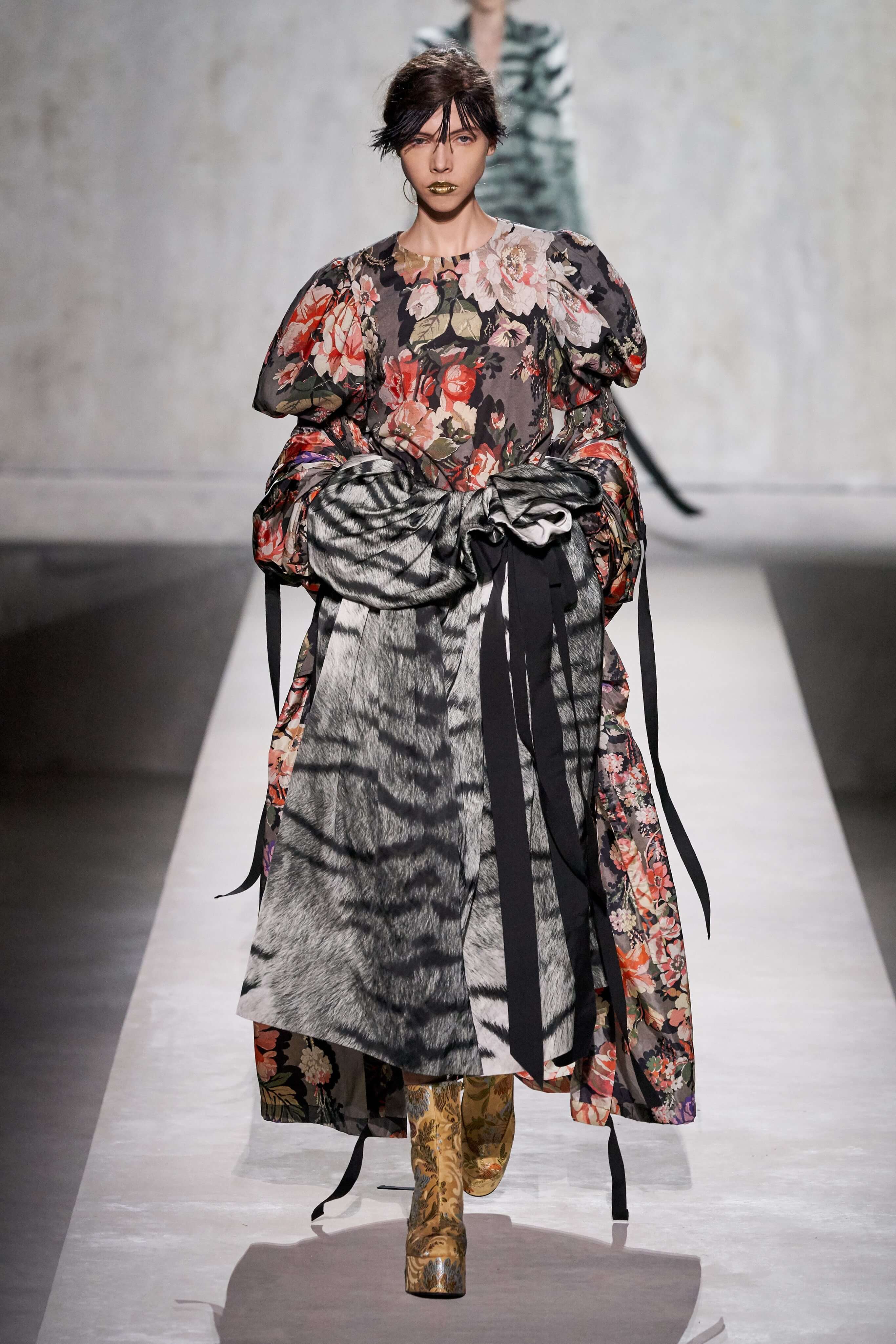 Дрис Ван Нотен пригласил к совместному созданию весенней коллекции знаменитого кутюрье Кристиана Лакруа — это стало настоящим подарком для поклонников модельера и красочной моды тех лет. Пышный максимализм и неуёмный гламур 80-х вдохновили Дриса Ван Нотена на создание коллекции, которая содержала бы и ностальгию по безумному от-кутюр тех лет, и практический, носибельный функционал. И кутюрье, с чьим именем и талантом ассоциируется эпоха 80-90-х, помог сотворить идеальное.