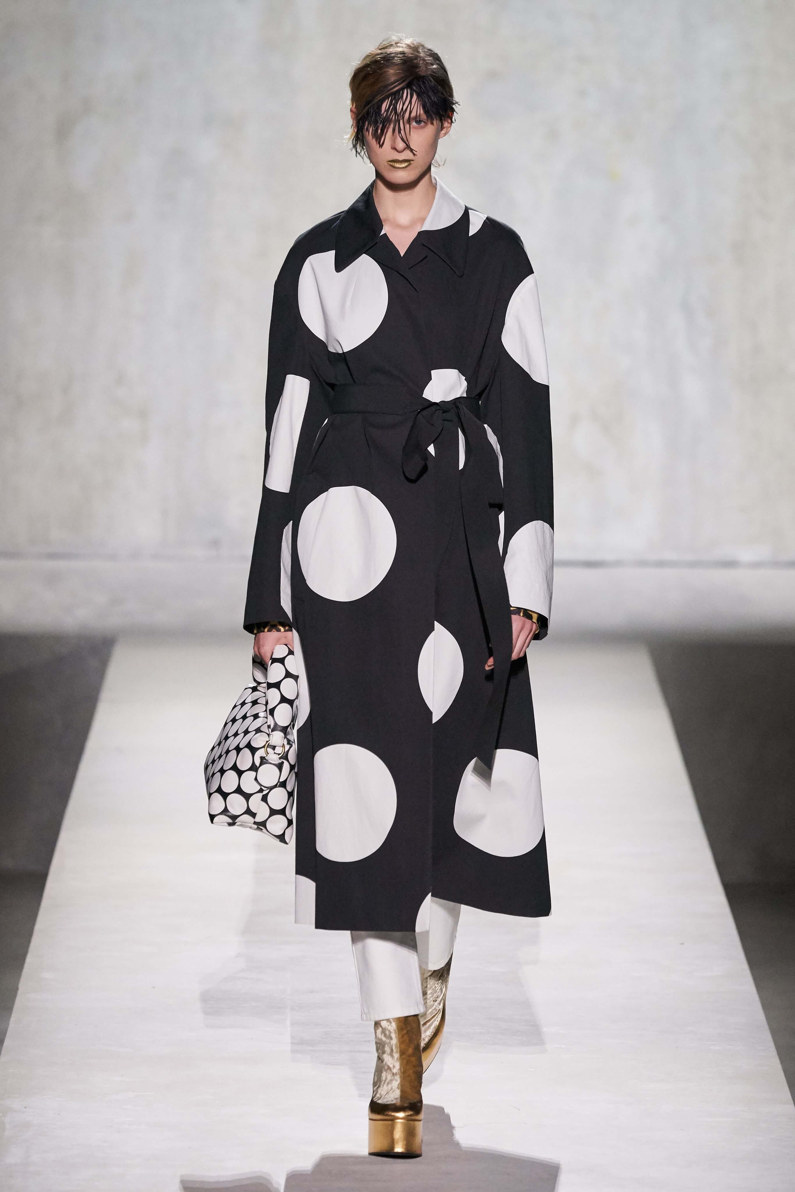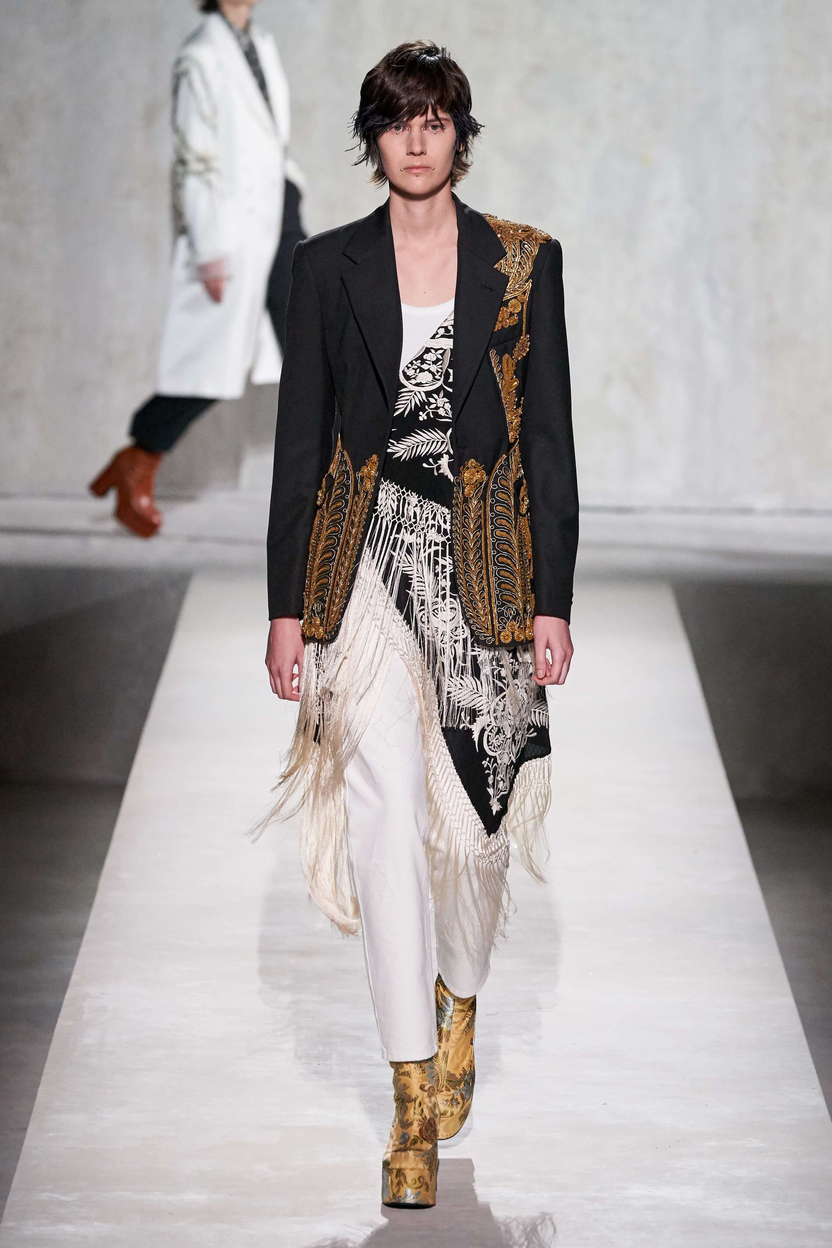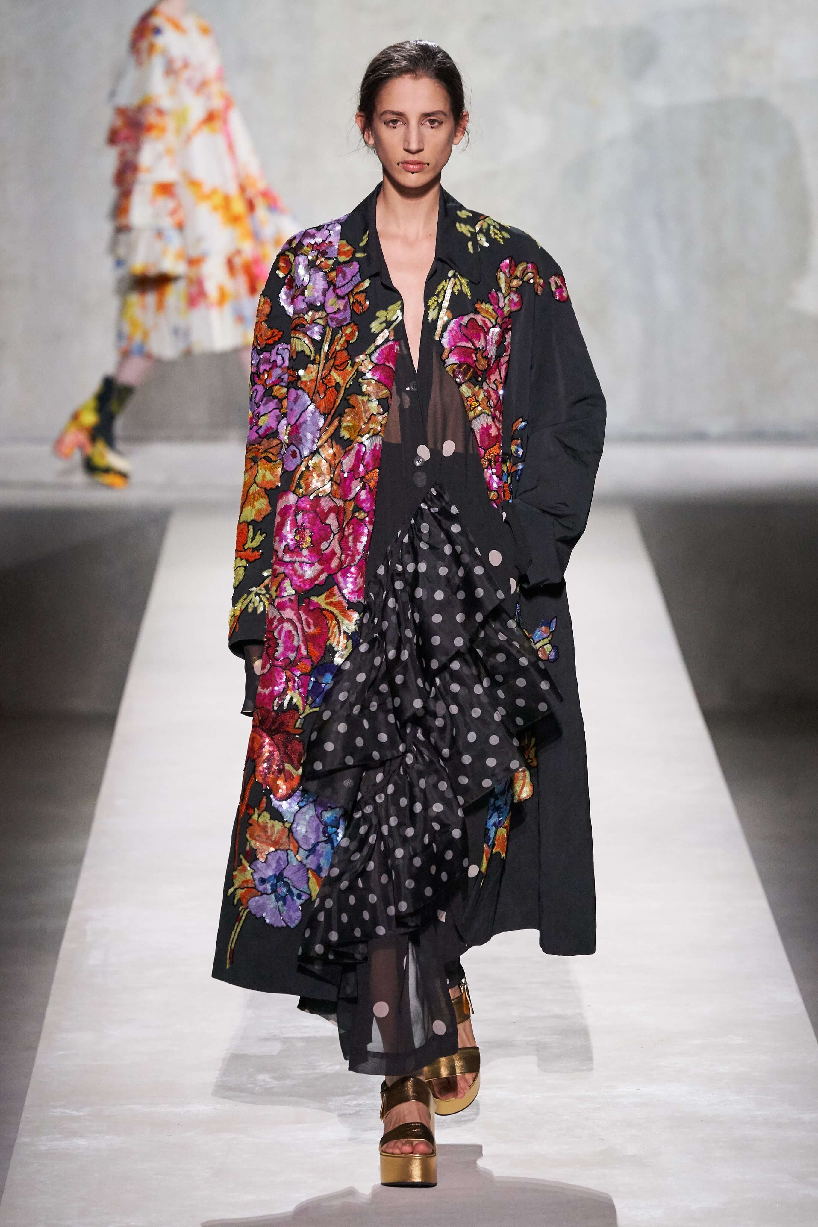 Дрис Ван Нотен пригласил к совместному созданию весенней коллекции знаменитого кутюрье Кристиана Лакруа — это стало настоящим подарком для поклонников модельера и красочной моды тех лет. Пышный максимализм и неуёмный гламур 80-х вдохновили Дриса Ван Нотена на создание коллекции, которая содержала бы и ностальгию по безумному от-кутюр тех лет, и практический, носибельный функционал. И кутюрье, с чьим именем и талантом ассоциируется эпоха 80-90-х, помог сотворить идеальное.