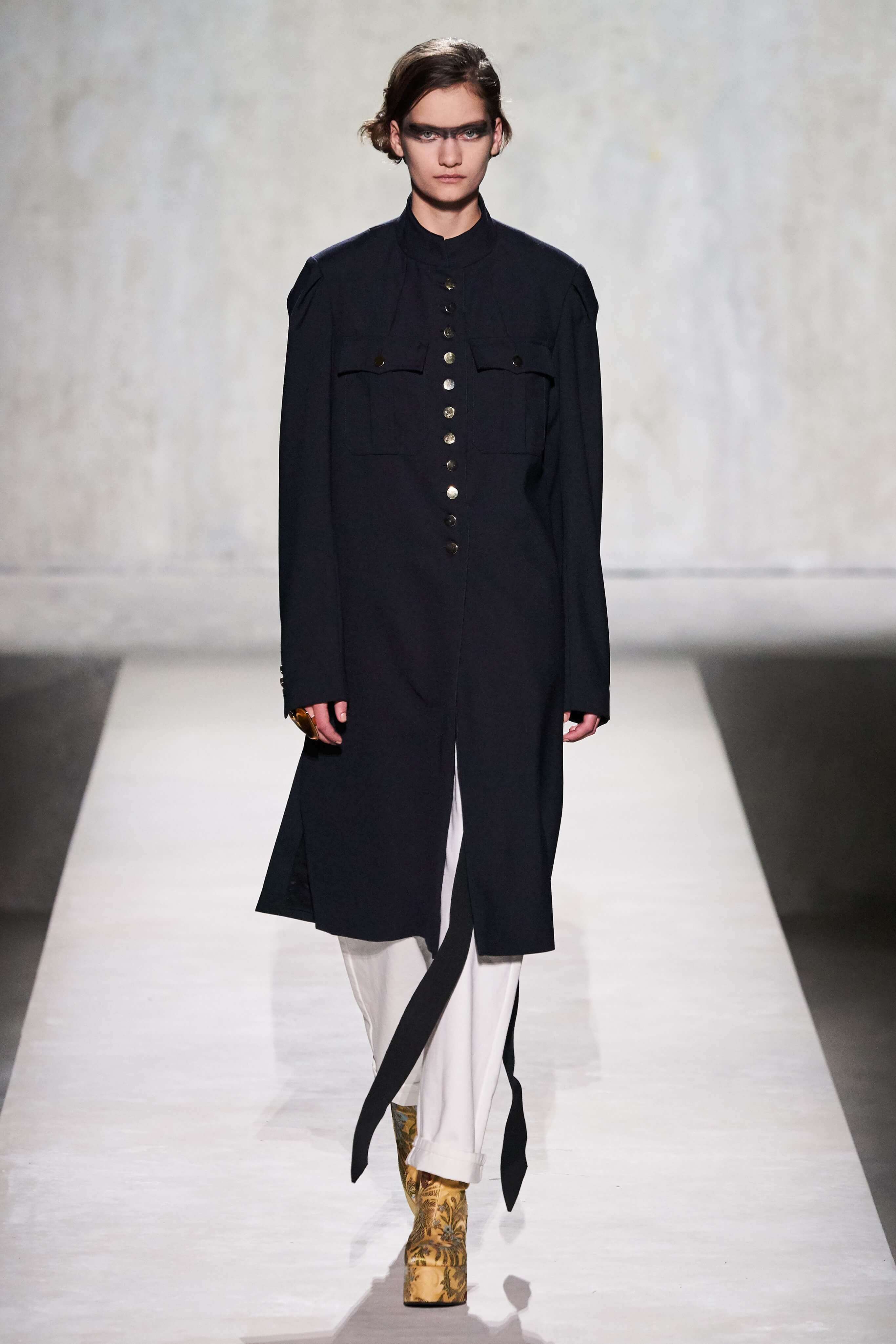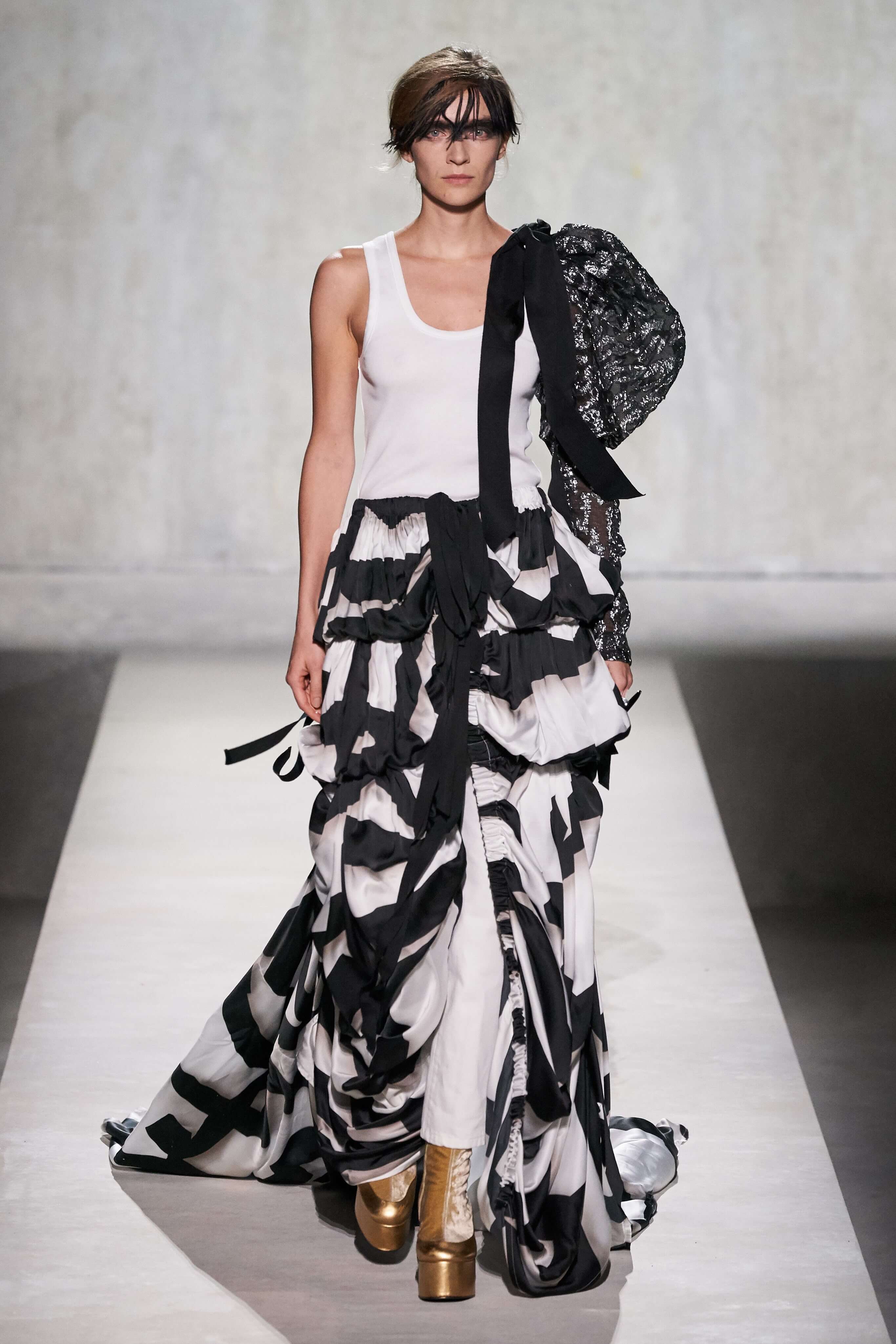 Дрис Ван Нотен с теплом вспоминает те два безумных и неповторимых десятилетия, когда платья носили поверх брюк и надевали по несколько вещей сразу. В коллекции это также нашло воплощение в многослойности. На подиум в опере Бастилии Ван Нотен и Лакруа вышли вместе, и это был один из самых трогательных моментов текущей парижской Недели моды.