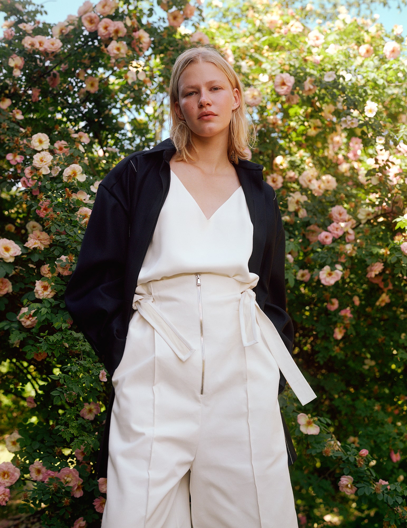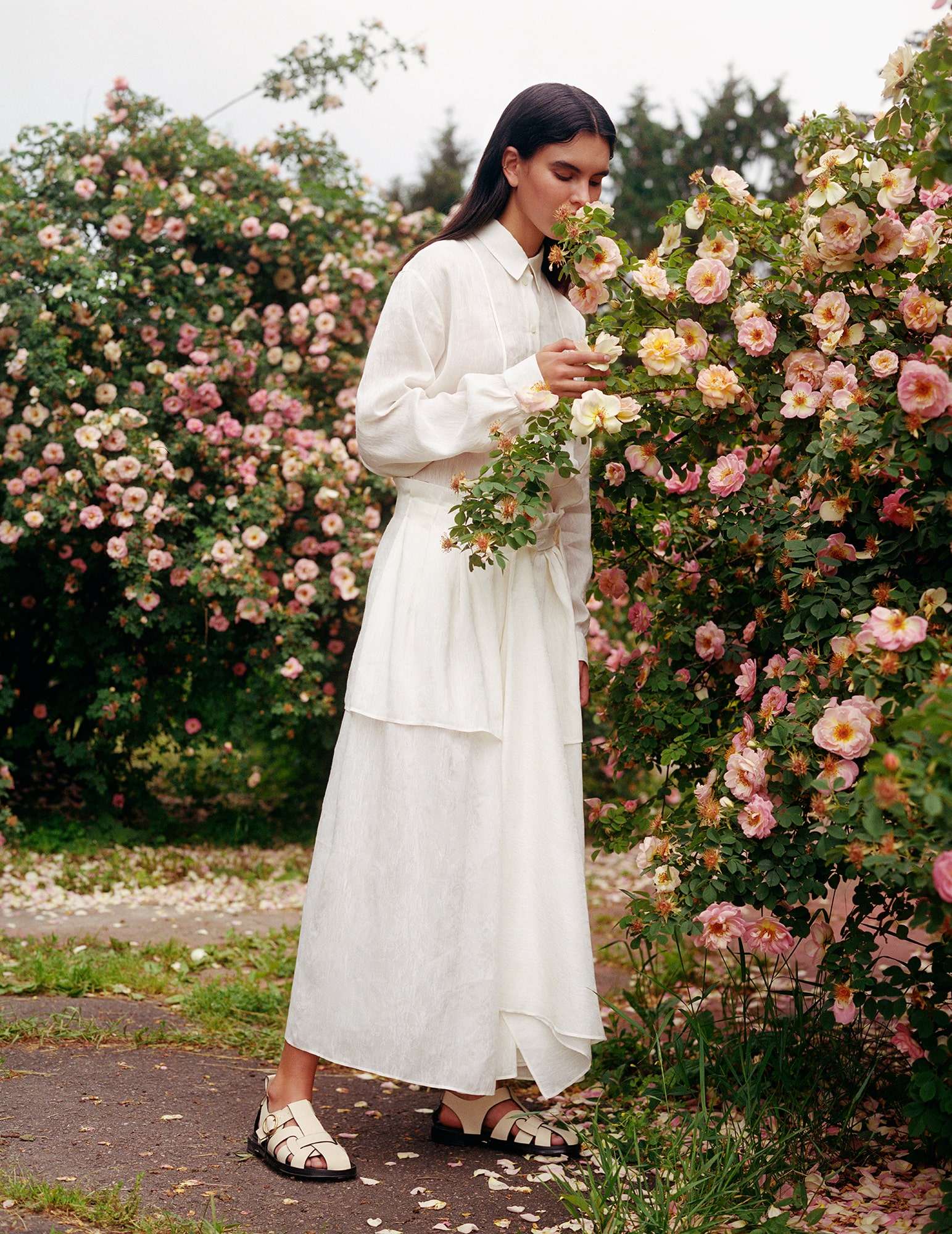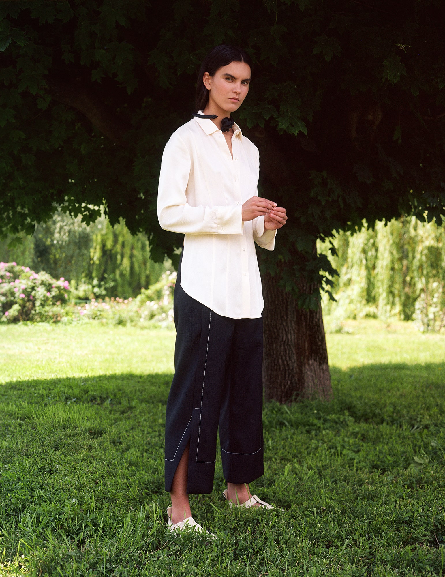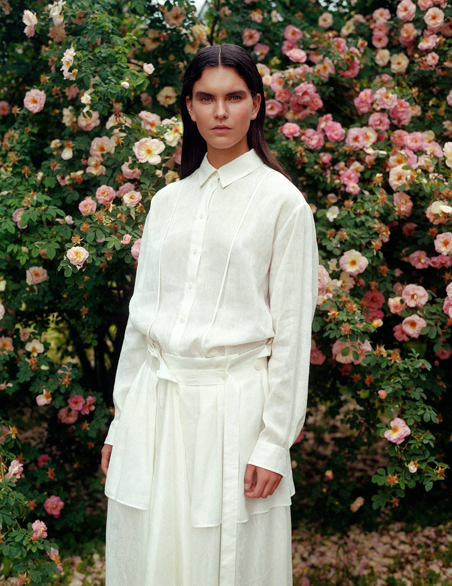 Duality акцентируют внимание на классических единицах гардероба: идеально скроенном костюме, льняной рубашке оверсайз, широких брюках, юбках и платьях летящих силуэтов, декоративных топах. Среди источников вдохновения коллекции – гардероб актрисы Кэтрин Хепберн.