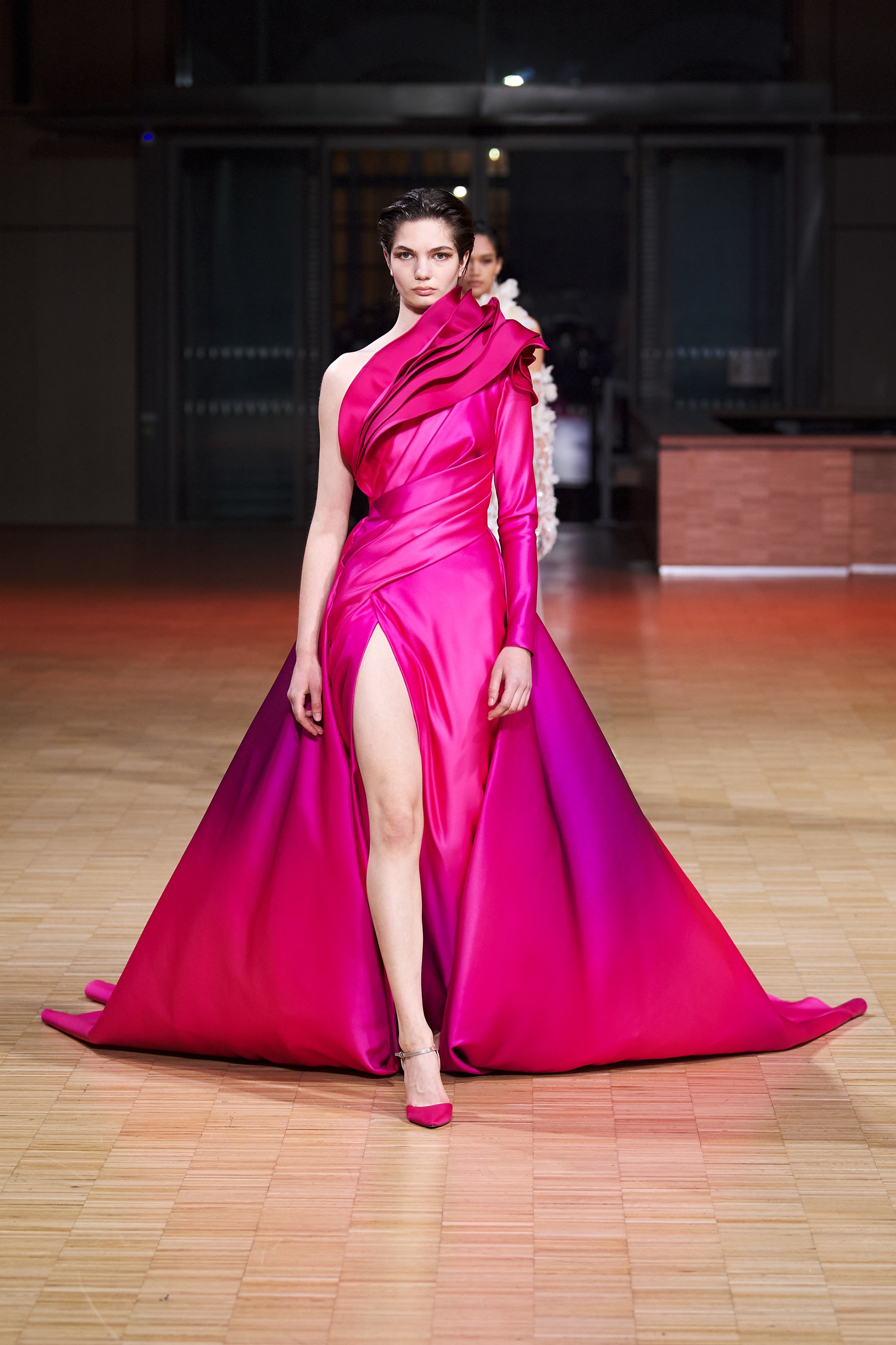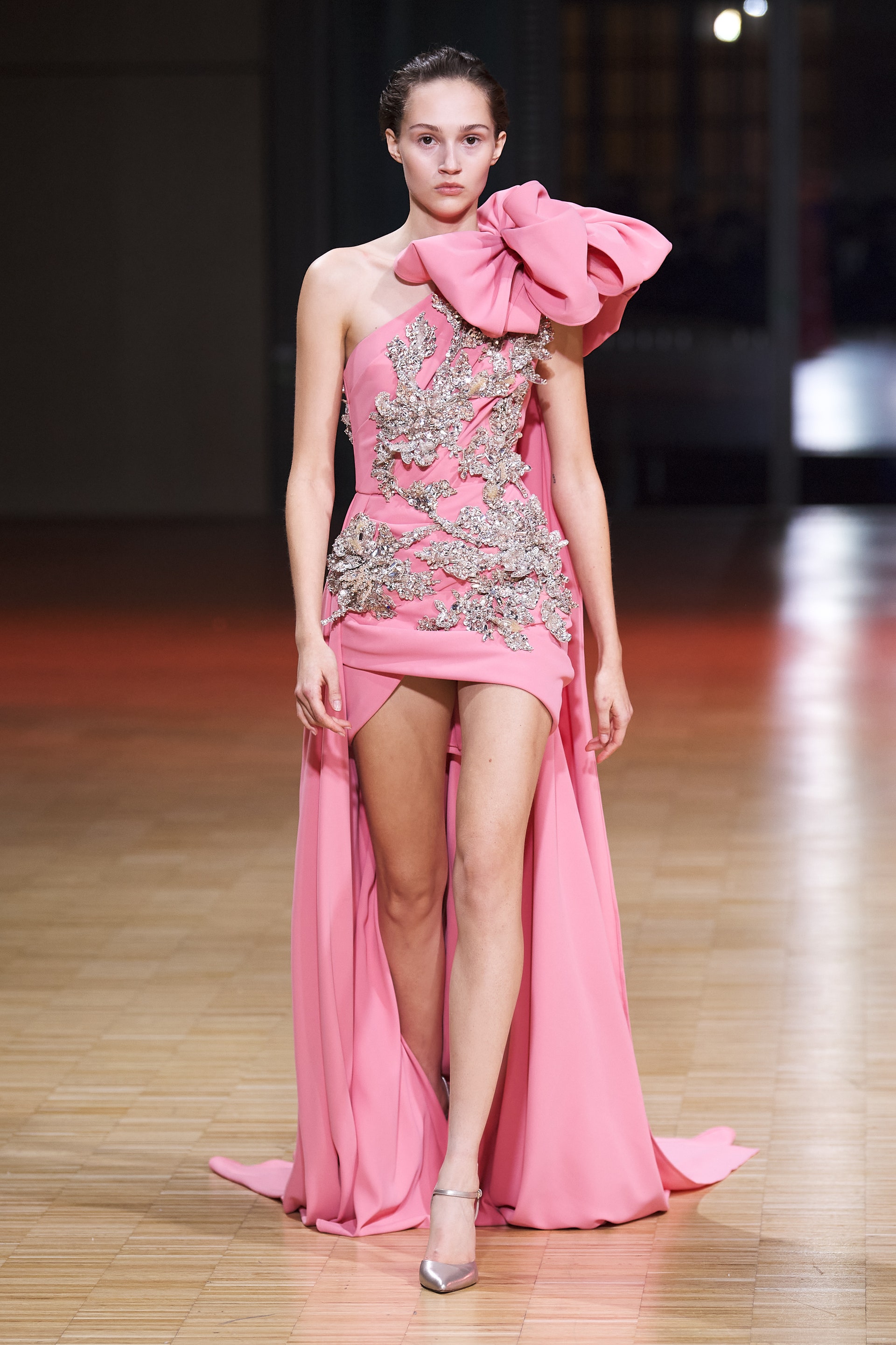 В коллекции Elie Saab прослеживаются черты, схожие с объемными силуэтами Valentinо из громоздящейся тафты, гламурными вечерними нарядами Alexandre Vauthier и деликатными полупрозрачными облачениями Christian Dior. Похоже, в новом сезоне дизайнеры, не сговариваясь, решили дать себе отдохнуть от концепций и строгой идеологии и вдоволь насладиться самим процессом творения. Кутюрные наряды Elie Saab увенчаны атласными цветами, сияющей бахромой, пышными бантами и барочной вышивкой серебром. Всплески ярких красок чередуются с утонченной пастелью, а длина мини — с эффектными шлейфами и басками макси.