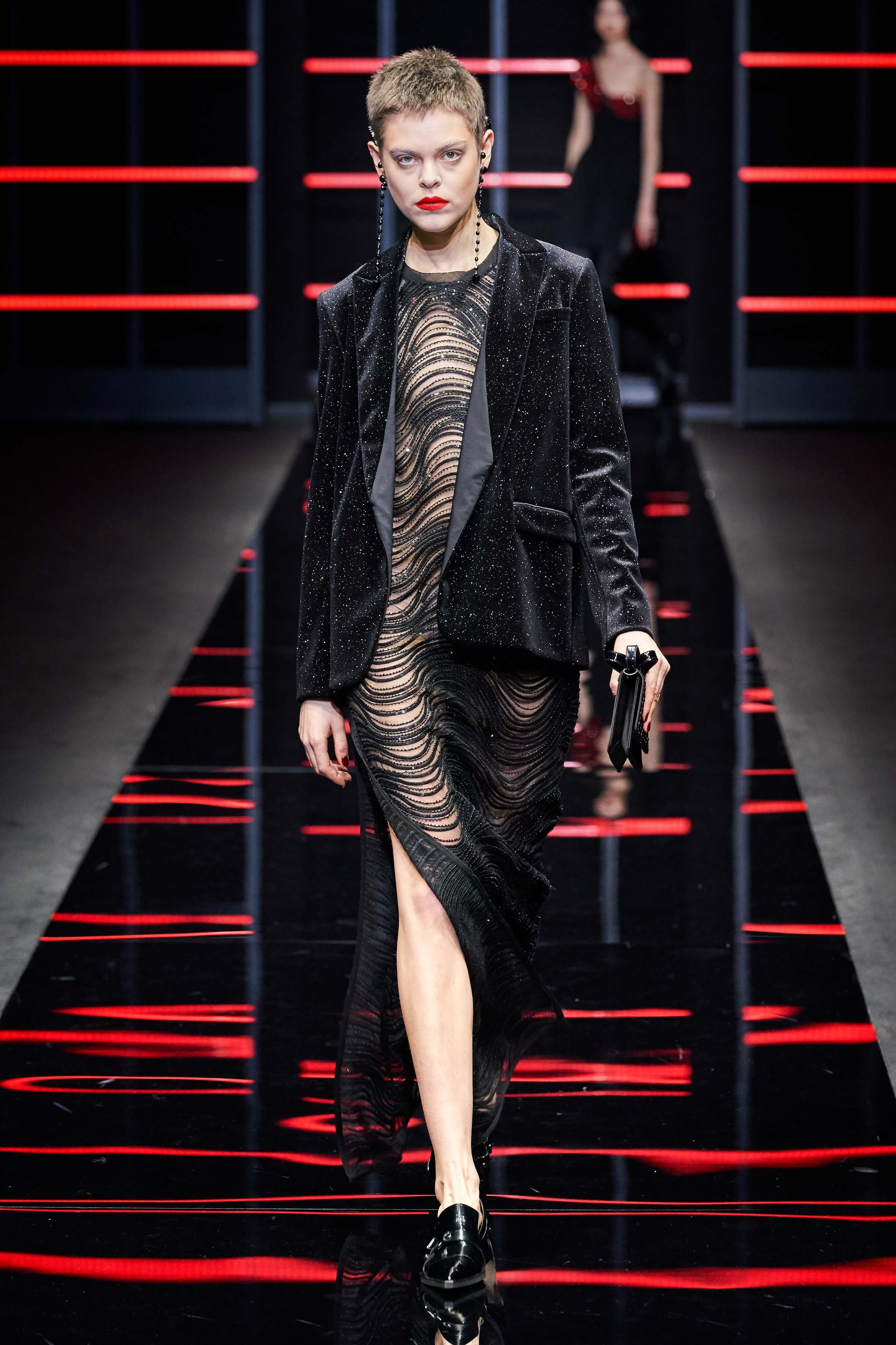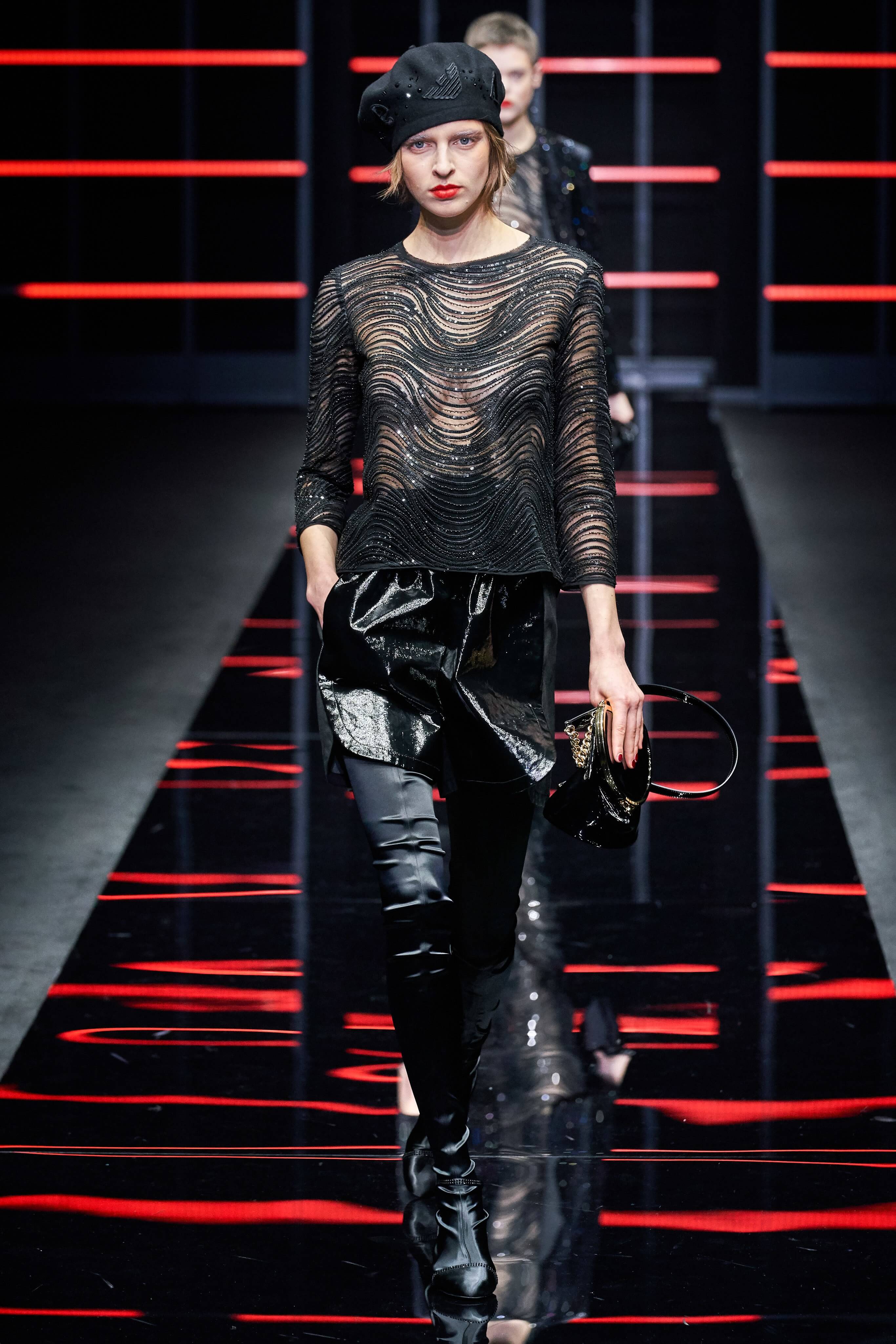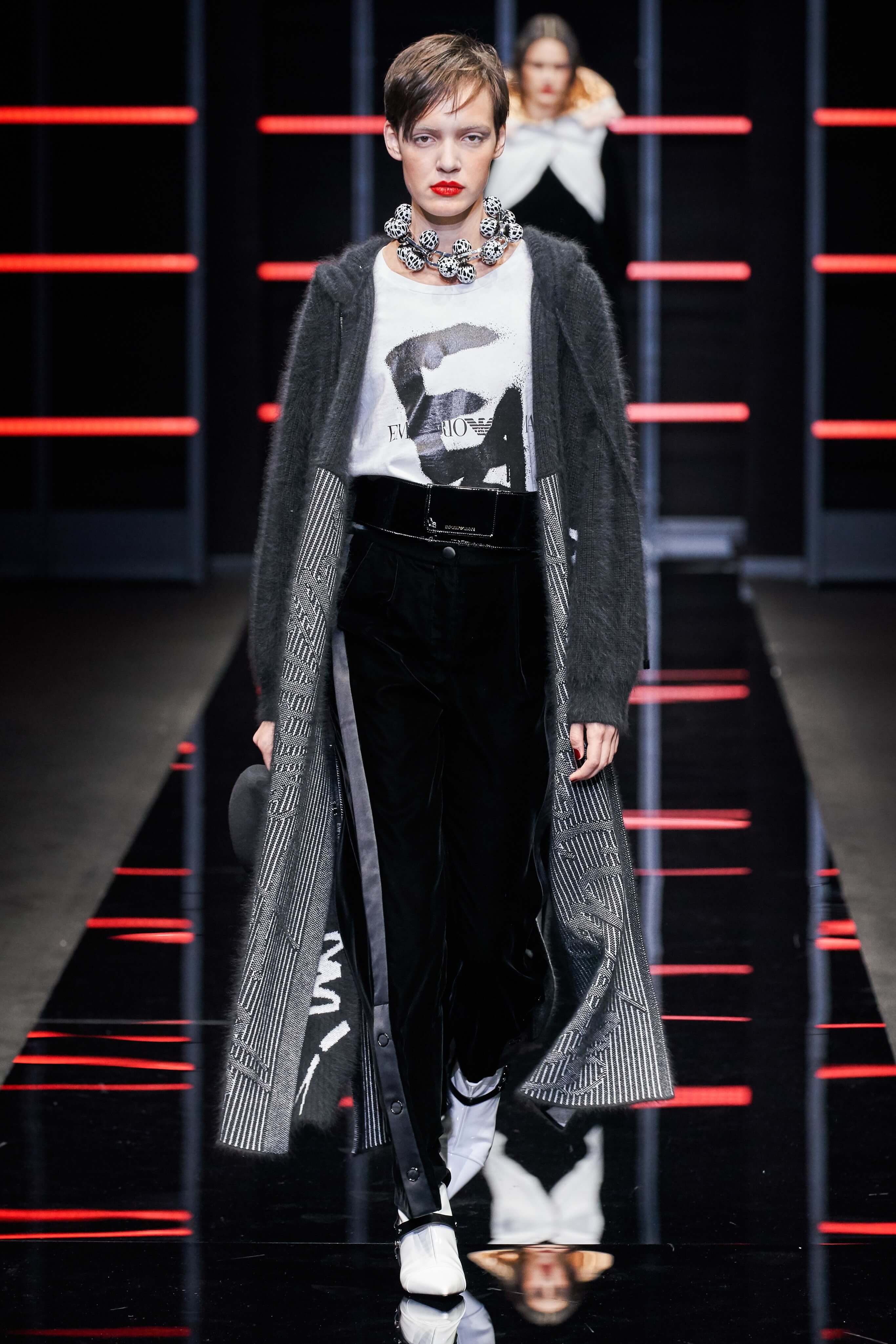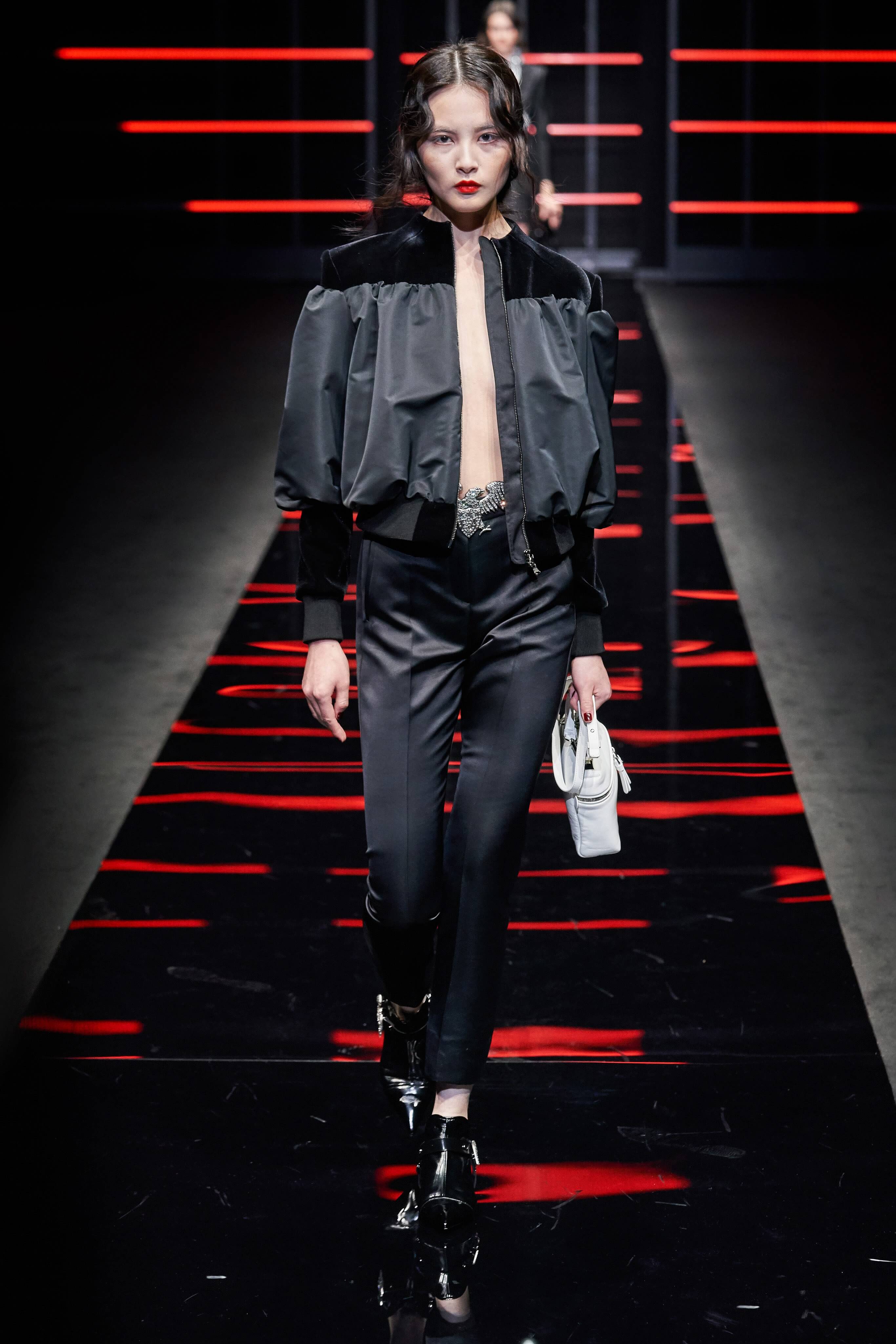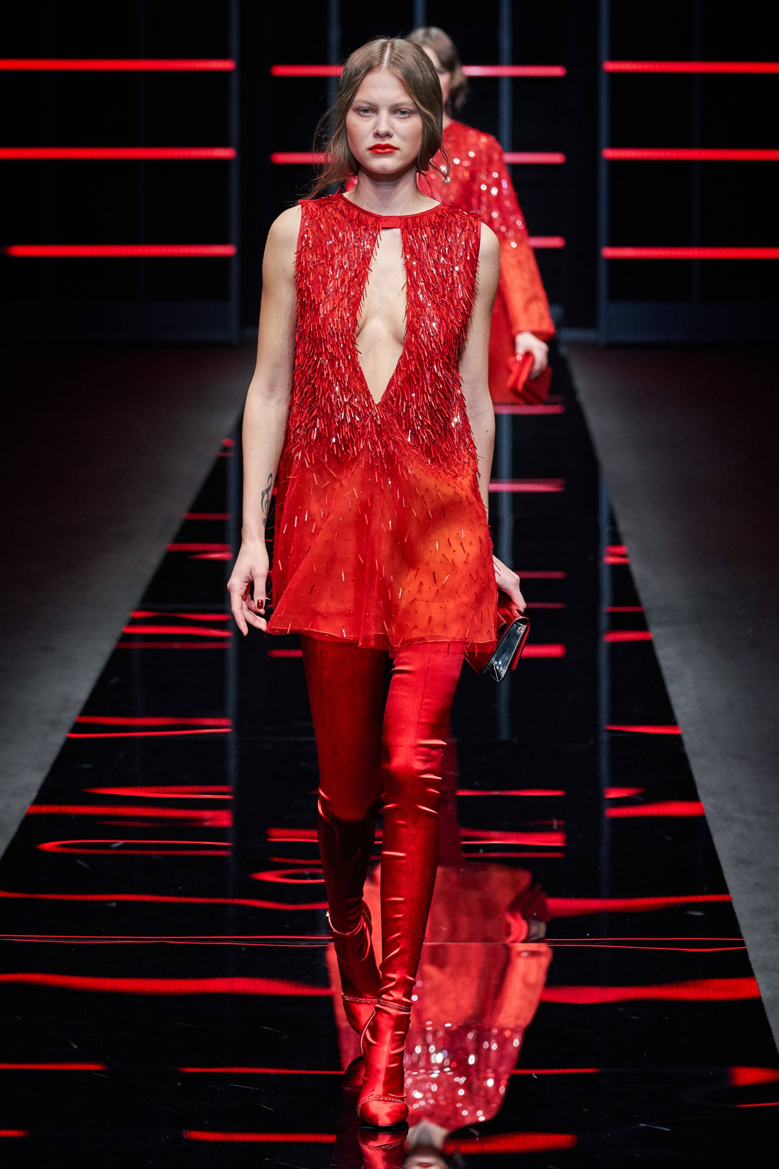 В коллекции винтажный шик легко уживается со свободными худи и харнесс-сумками, как в спортивной линии Emporio Armani 7, а струящиеся брюки, корсетные топы, люрекс и комплекты из жаккарда позаимствованы из кутюрной линии Armani Prive. Ультрасовременными образы коллекции делали чулки-ботфорты, микроскопические мессенджеры и минималистичные чокеры, как из фантастических фильмов.