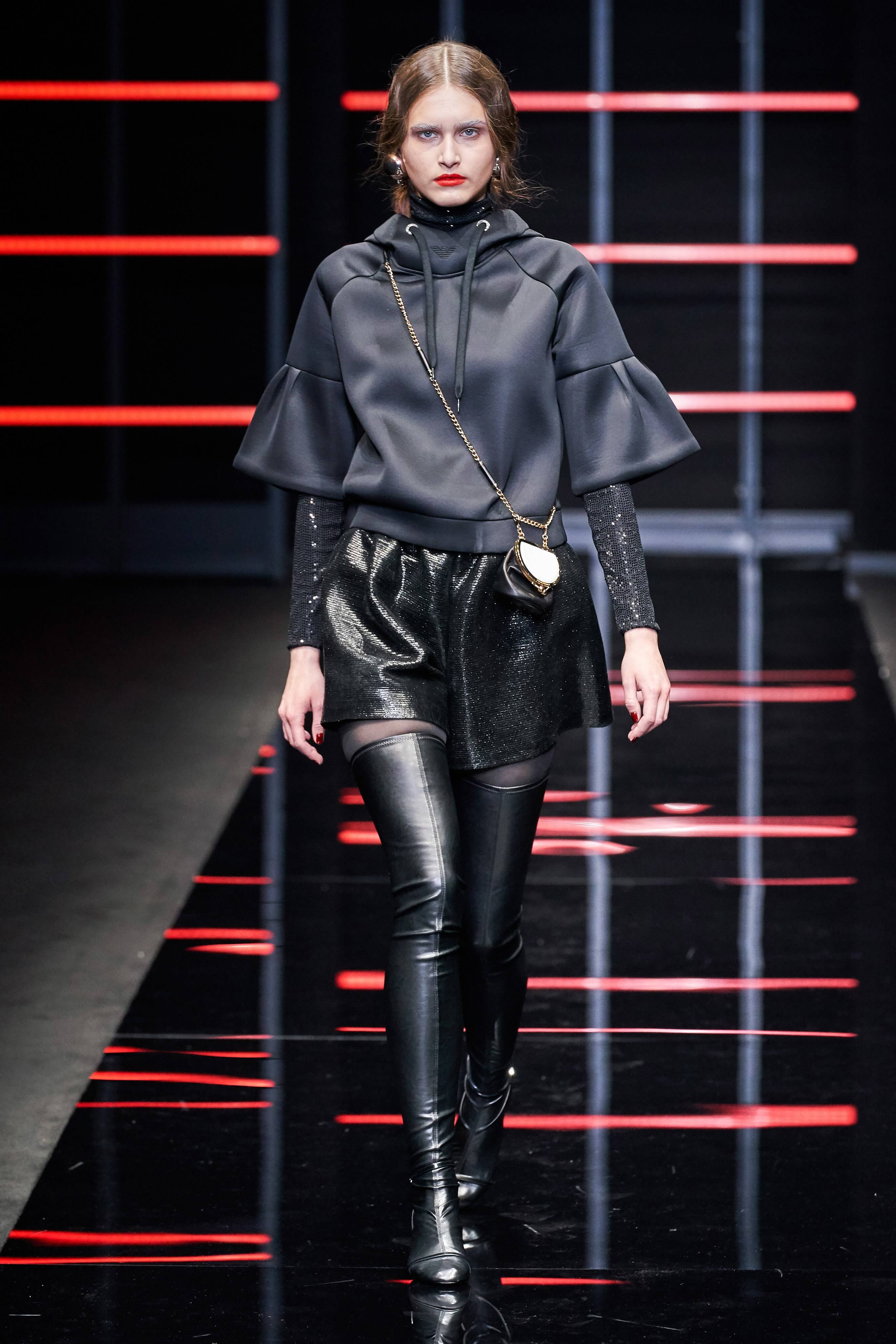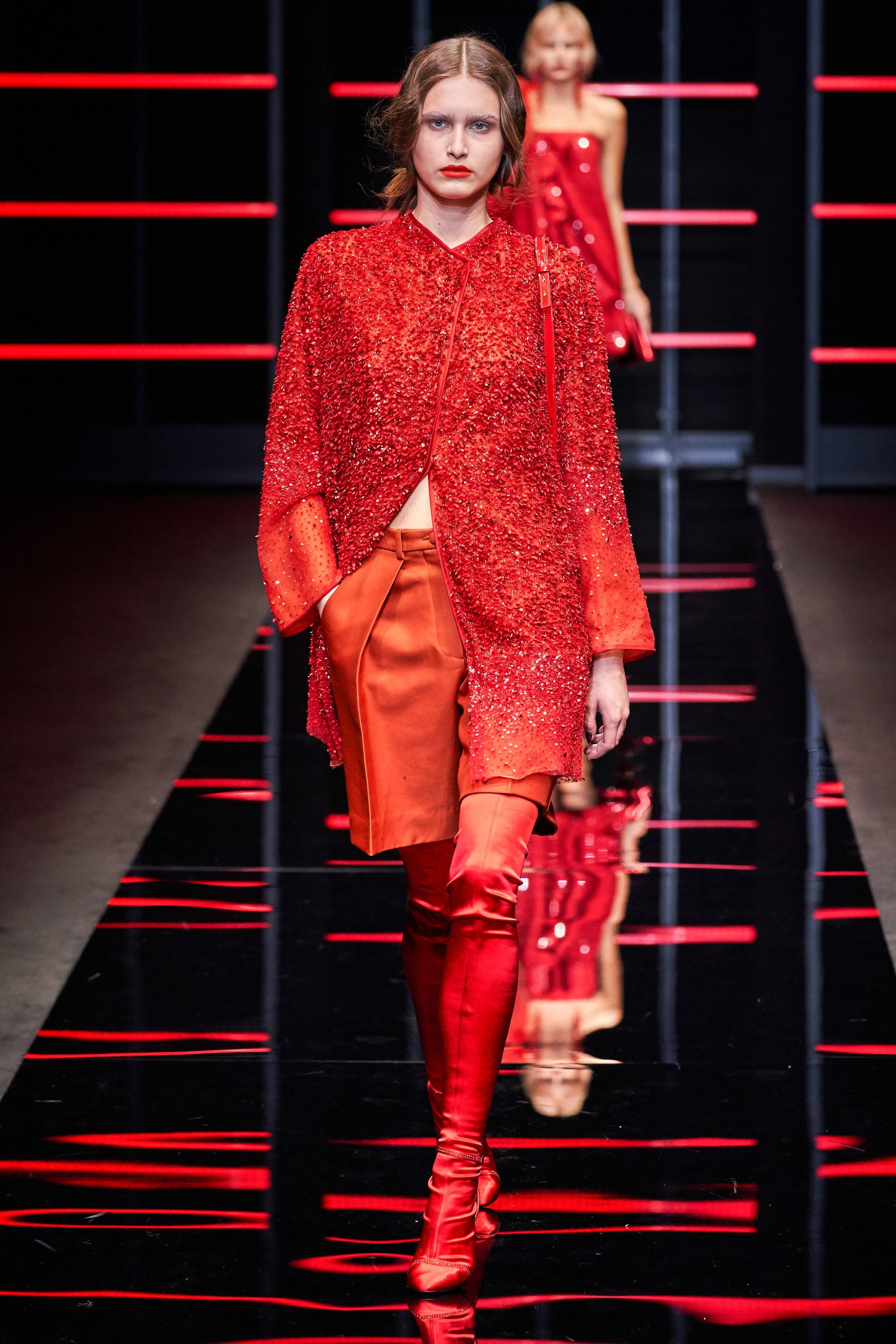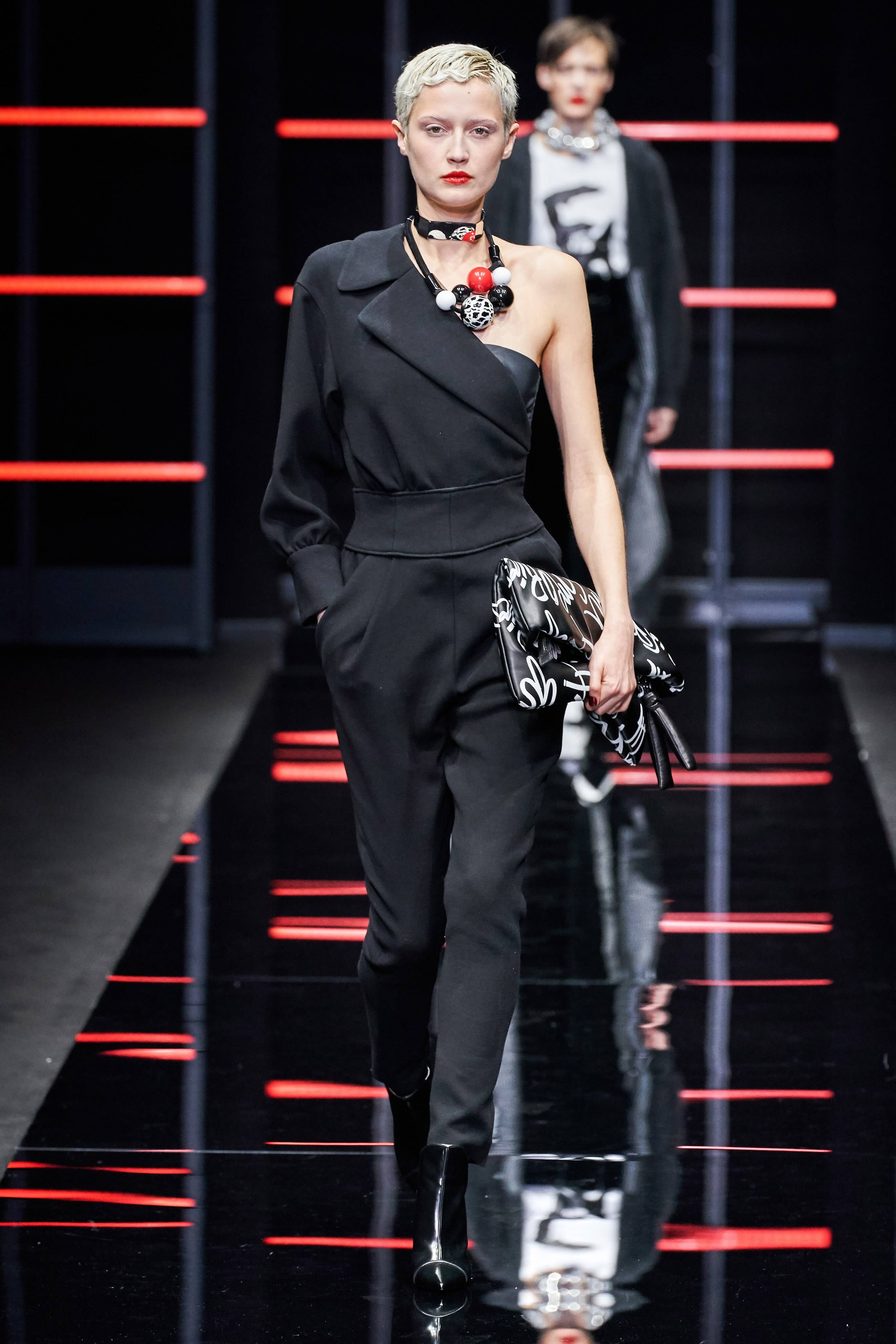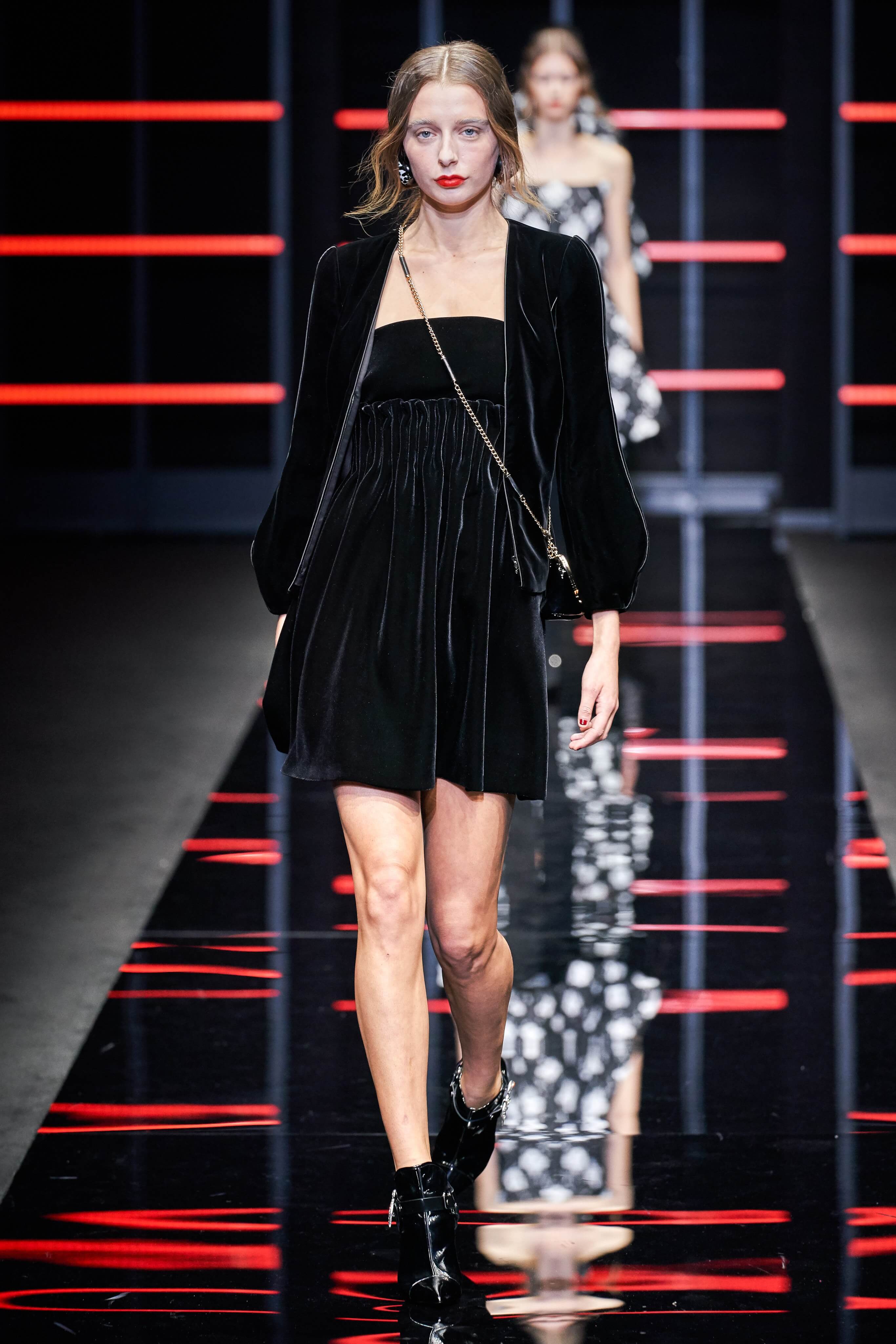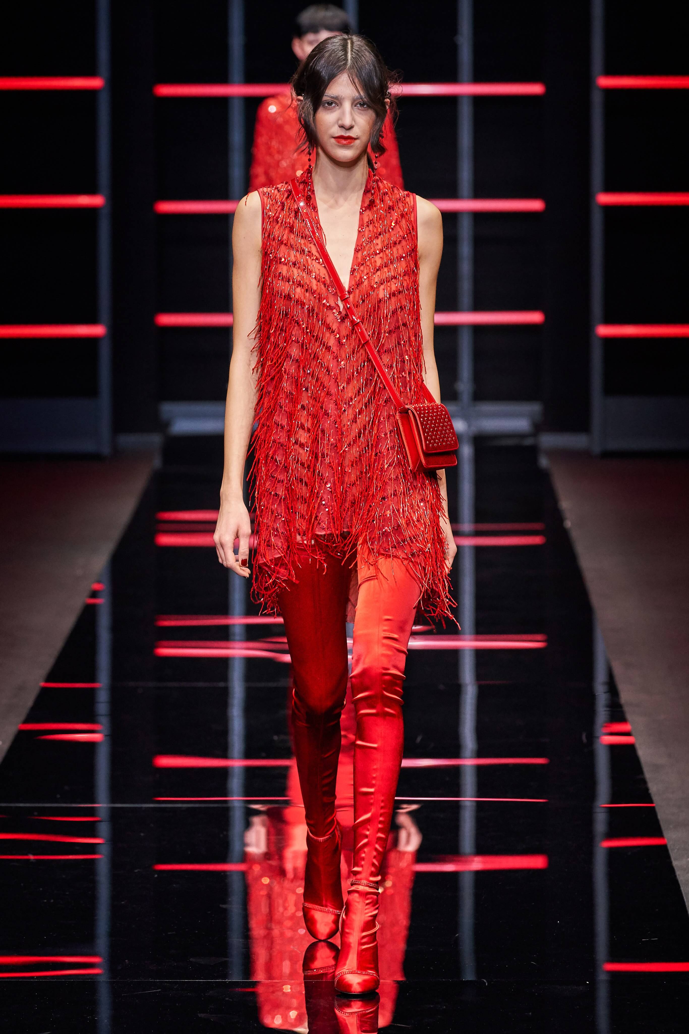 В коллекции винтажный шик легко уживается со свободными худи и харнесс-сумками, как в спортивной линии Emporio Armani 7, а струящиеся брюки, корсетные топы, люрекс и комплекты из жаккарда позаимствованы из кутюрной линии Armani Prive. Ультрасовременными образы коллекции делали чулки-ботфорты, микроскопические мессенджеры и минималистичные чокеры, как из фантастических фильмов.