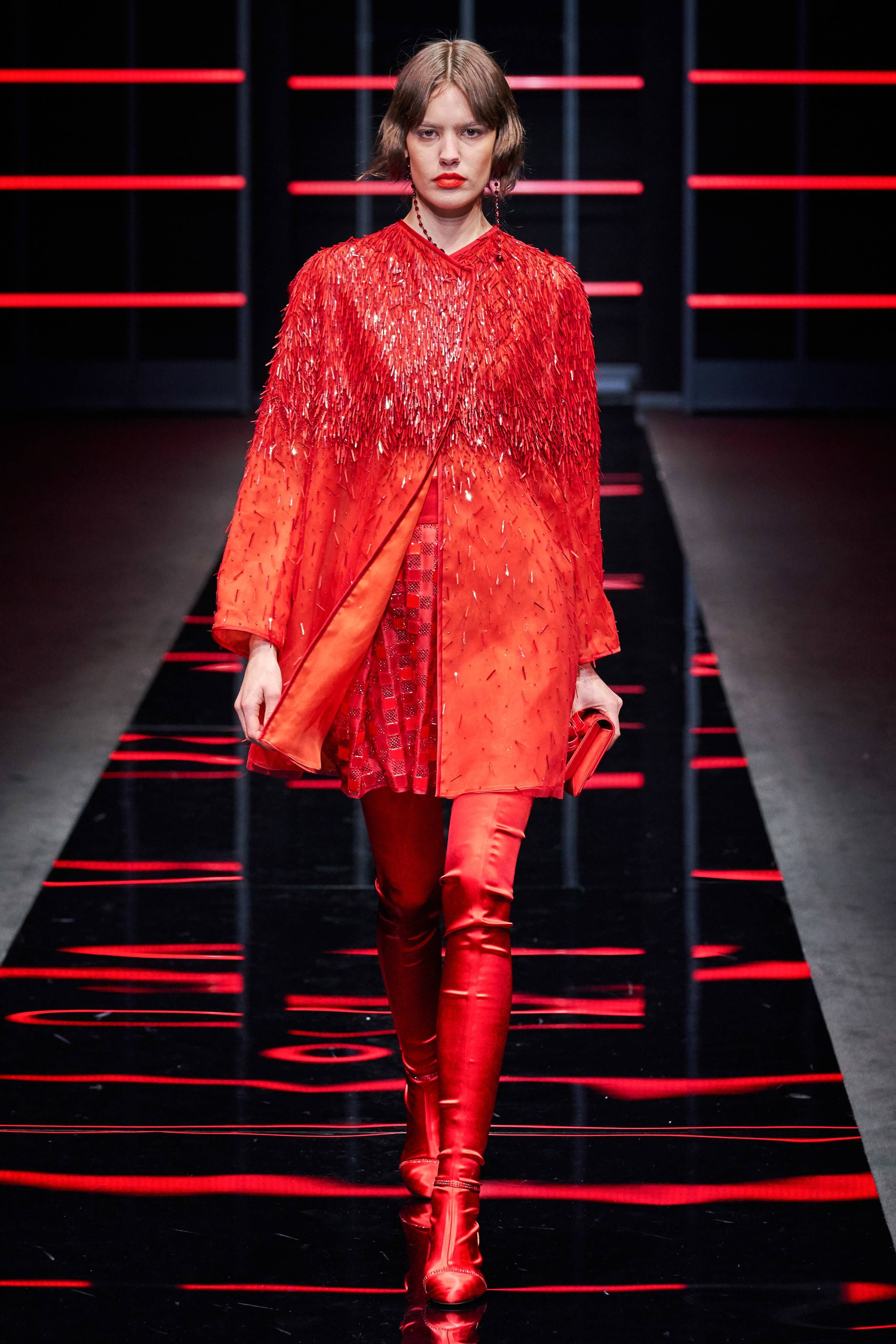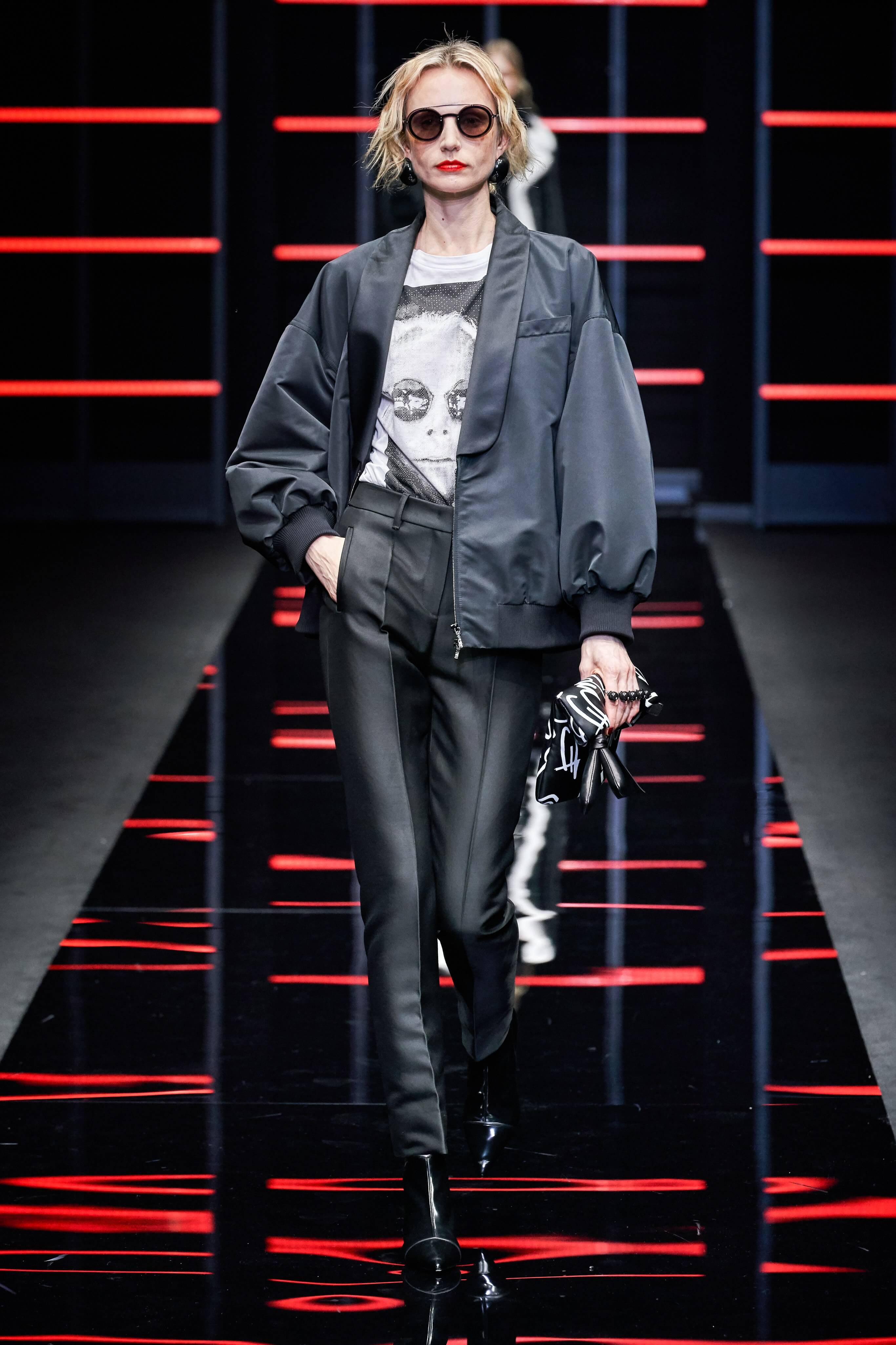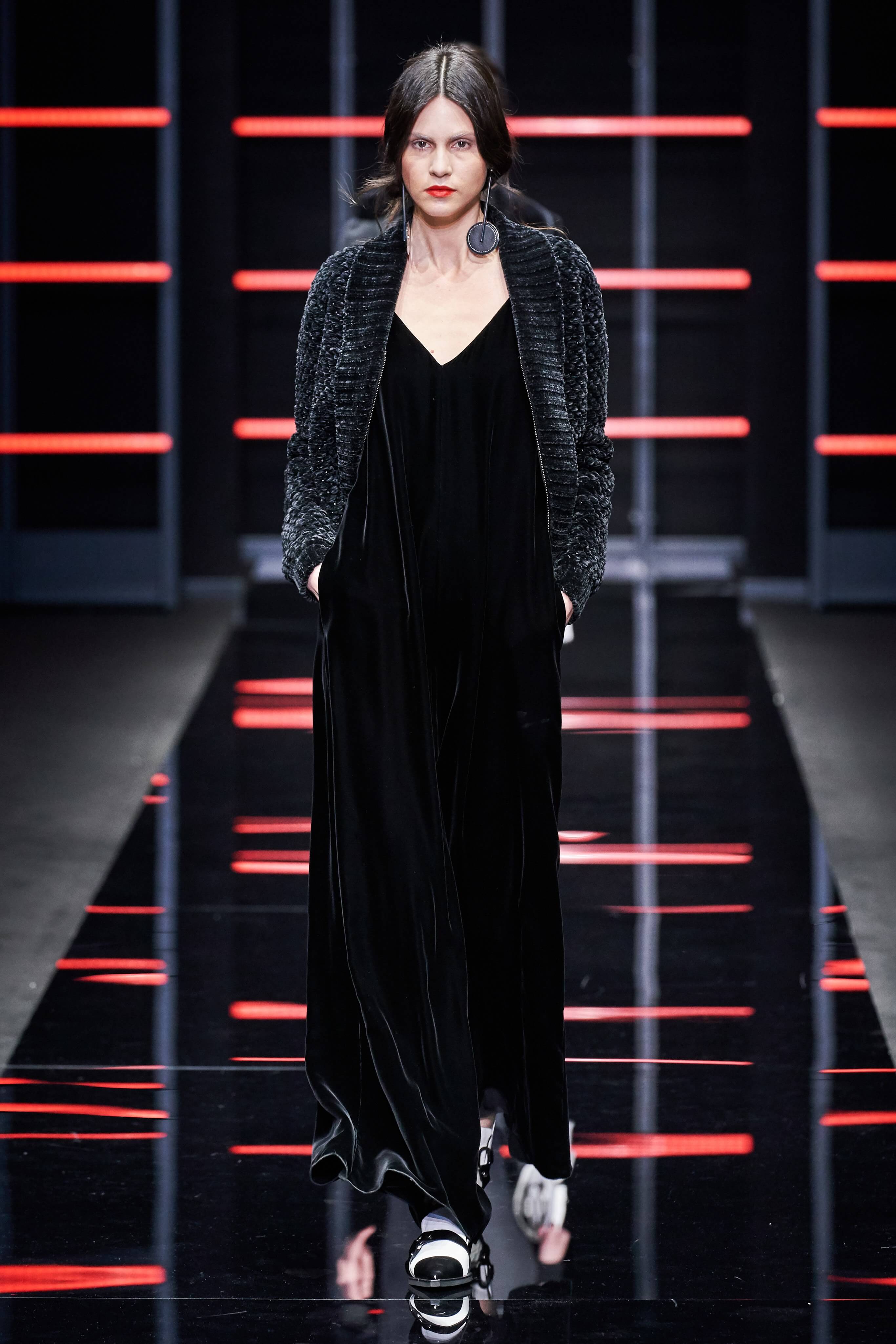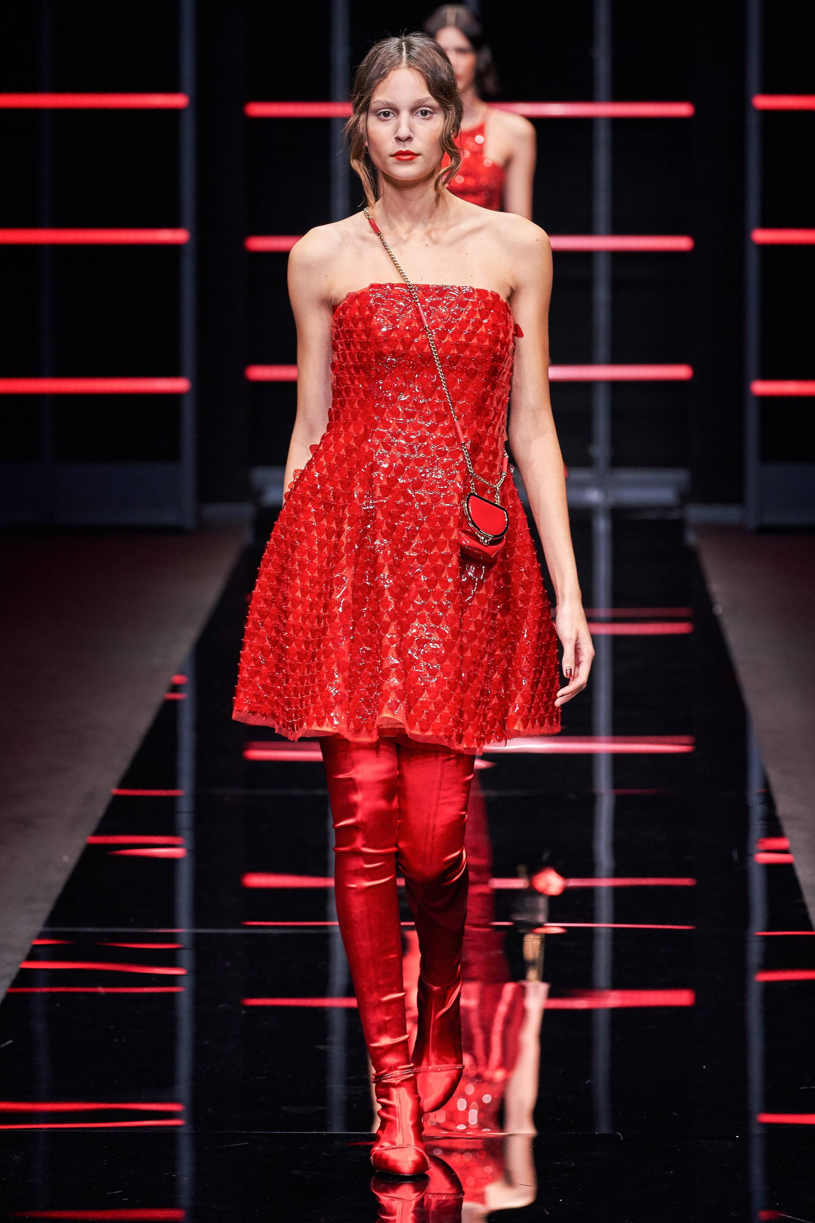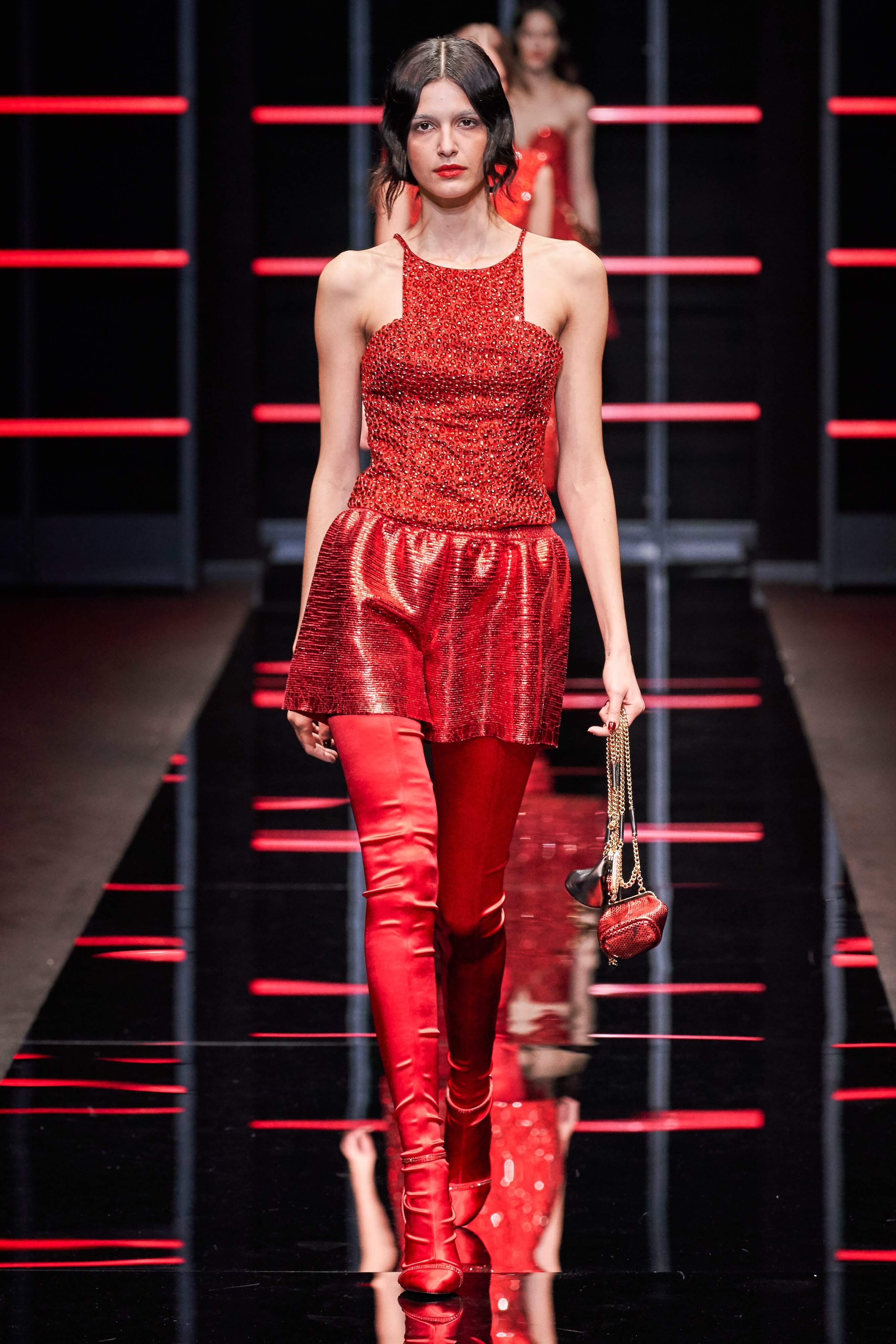 В коллекции винтажный шик легко уживается со свободными худи и харнесс-сумками, как в спортивной линии Emporio Armani 7, а струящиеся брюки, корсетные топы, люрекс и комплекты из жаккарда позаимствованы из кутюрной линии Armani Prive. Ультрасовременными образы коллекции делали чулки-ботфорты, микроскопические мессенджеры и минималистичные чокеры, как из фантастических фильмов.