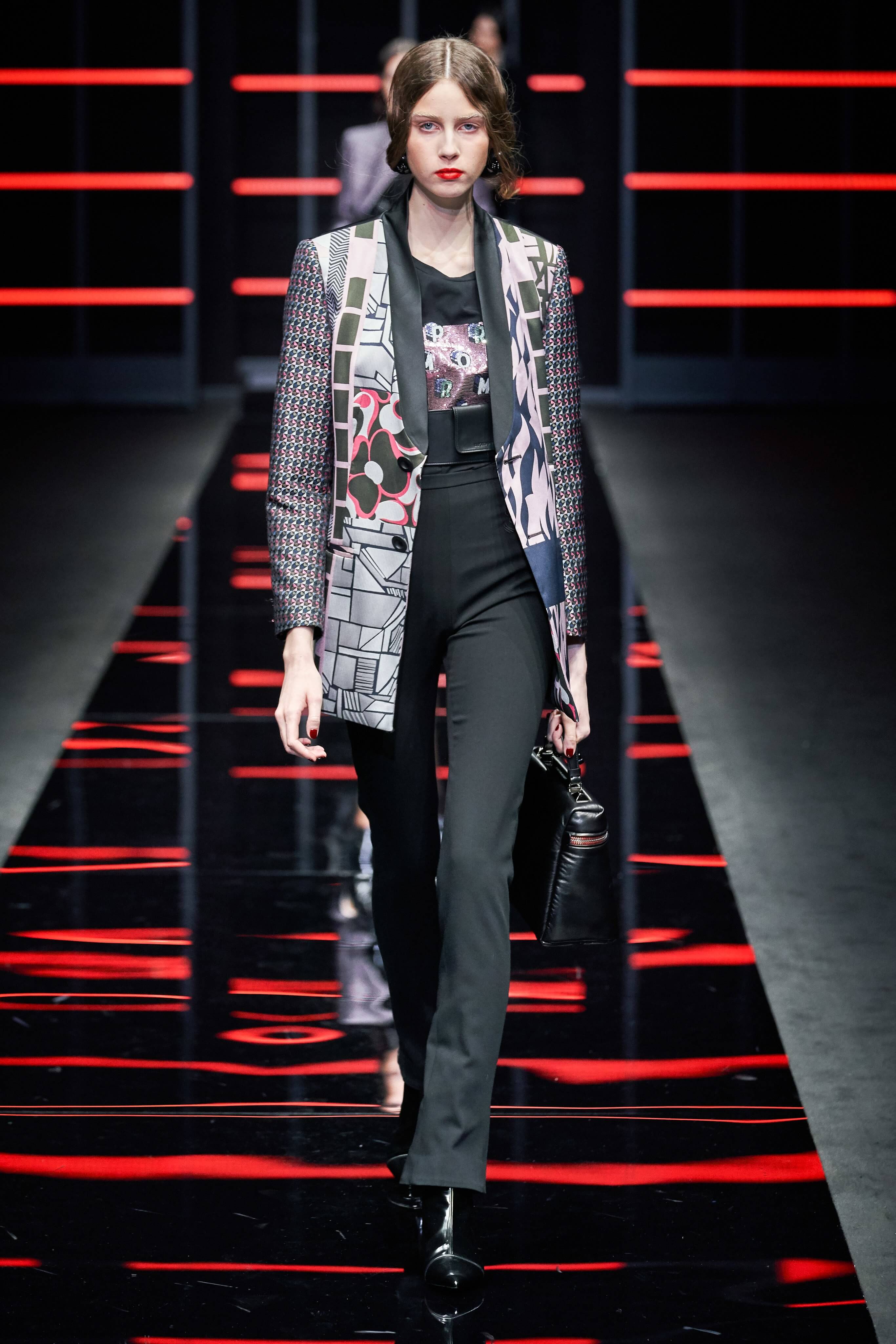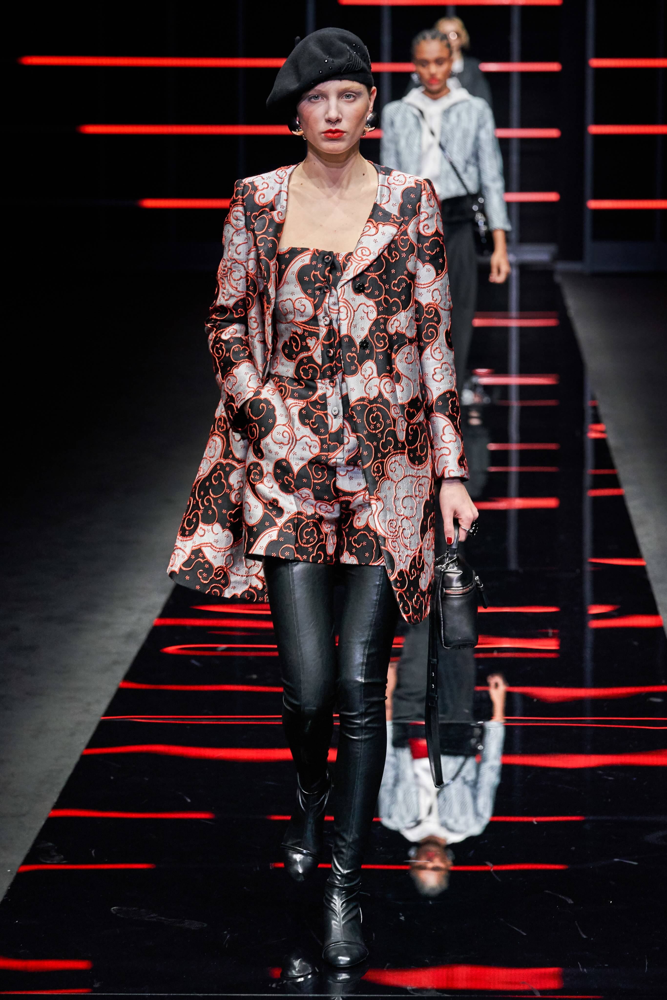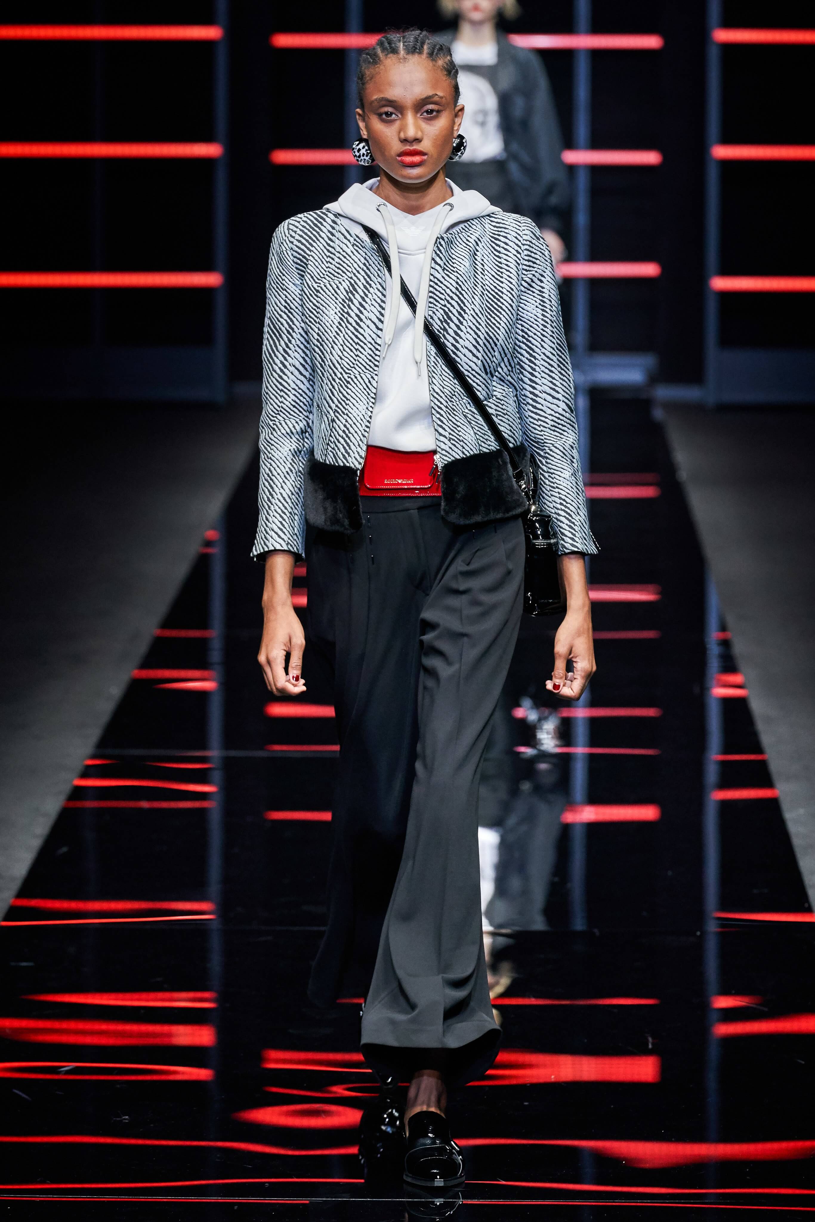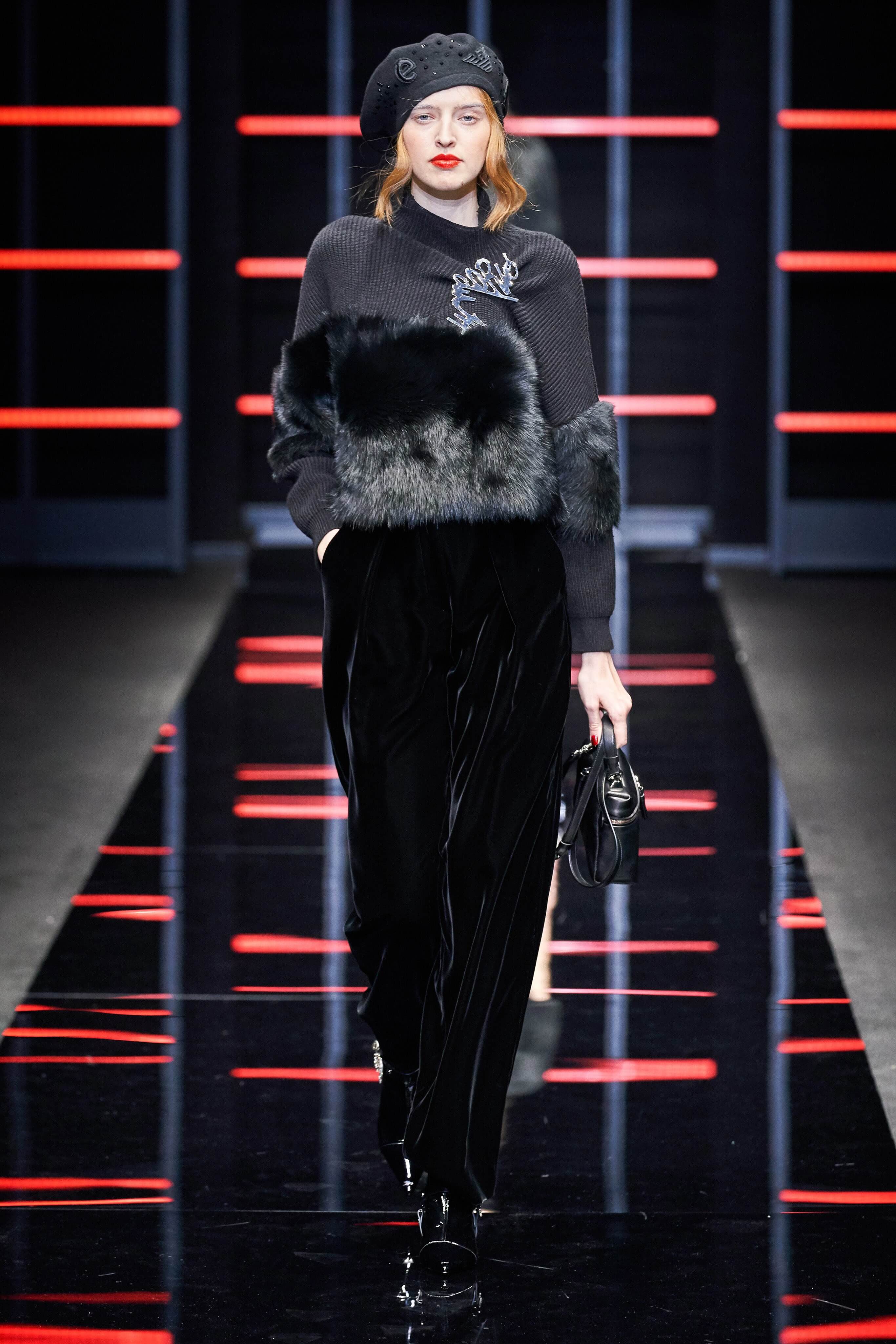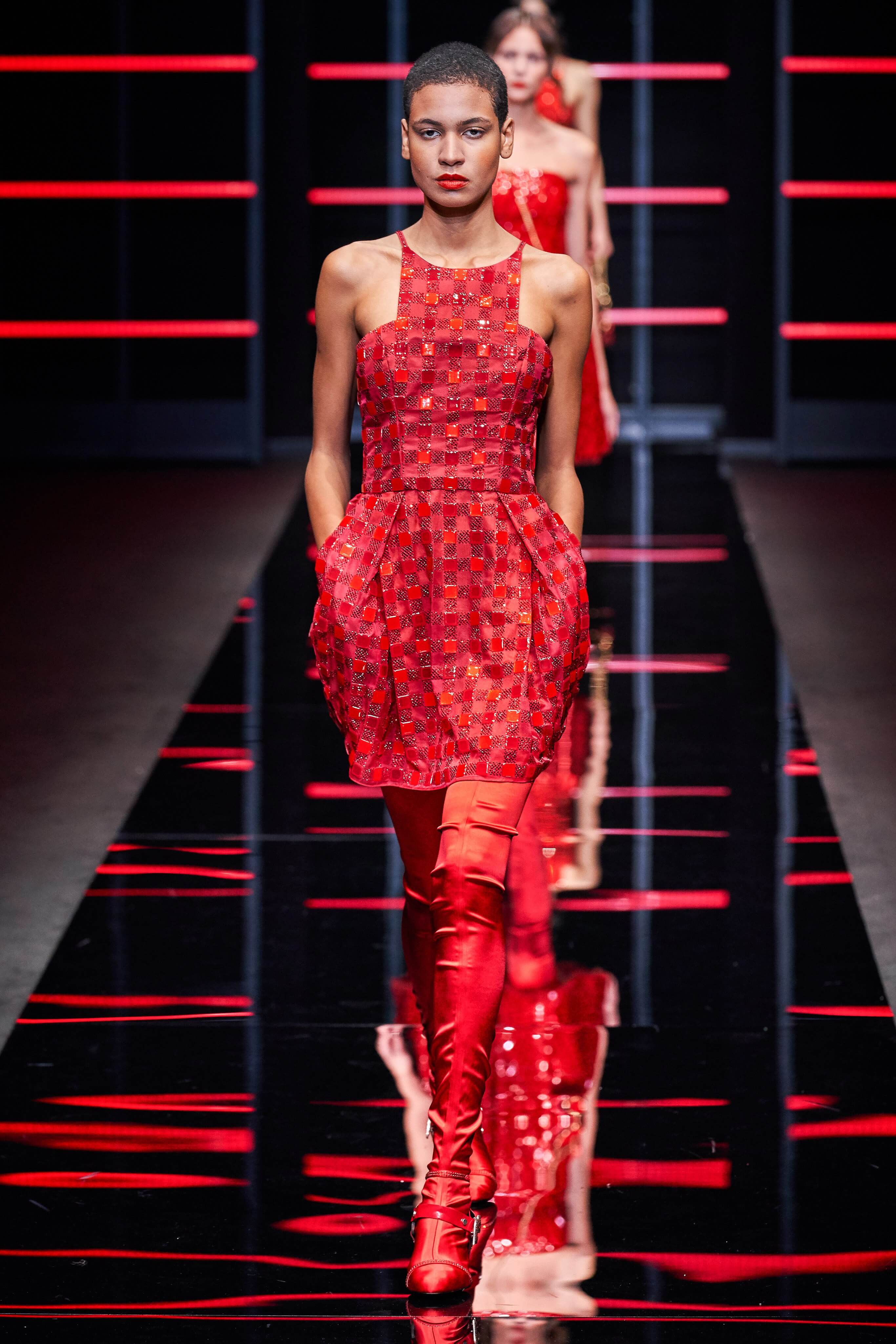 В коллекции винтажный шик легко уживается со свободными худи и харнесс-сумками, как в спортивной линии Emporio Armani 7, а струящиеся брюки, корсетные топы, люрекс и комплекты из жаккарда позаимствованы из кутюрной линии Armani Prive. Ультрасовременными образы коллекции делали чулки-ботфорты, микроскопические мессенджеры и минималистичные чокеры, как из фантастических фильмов.