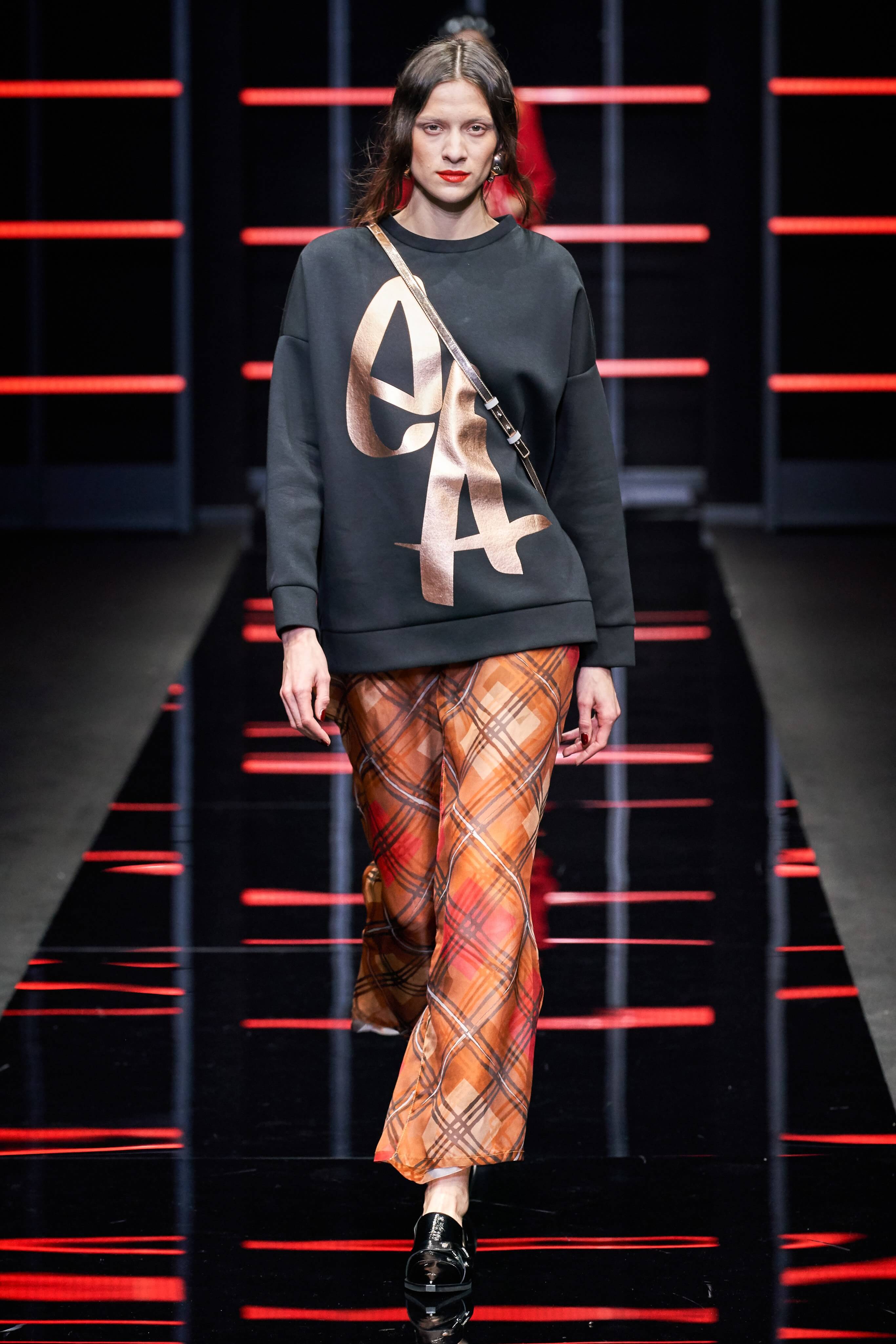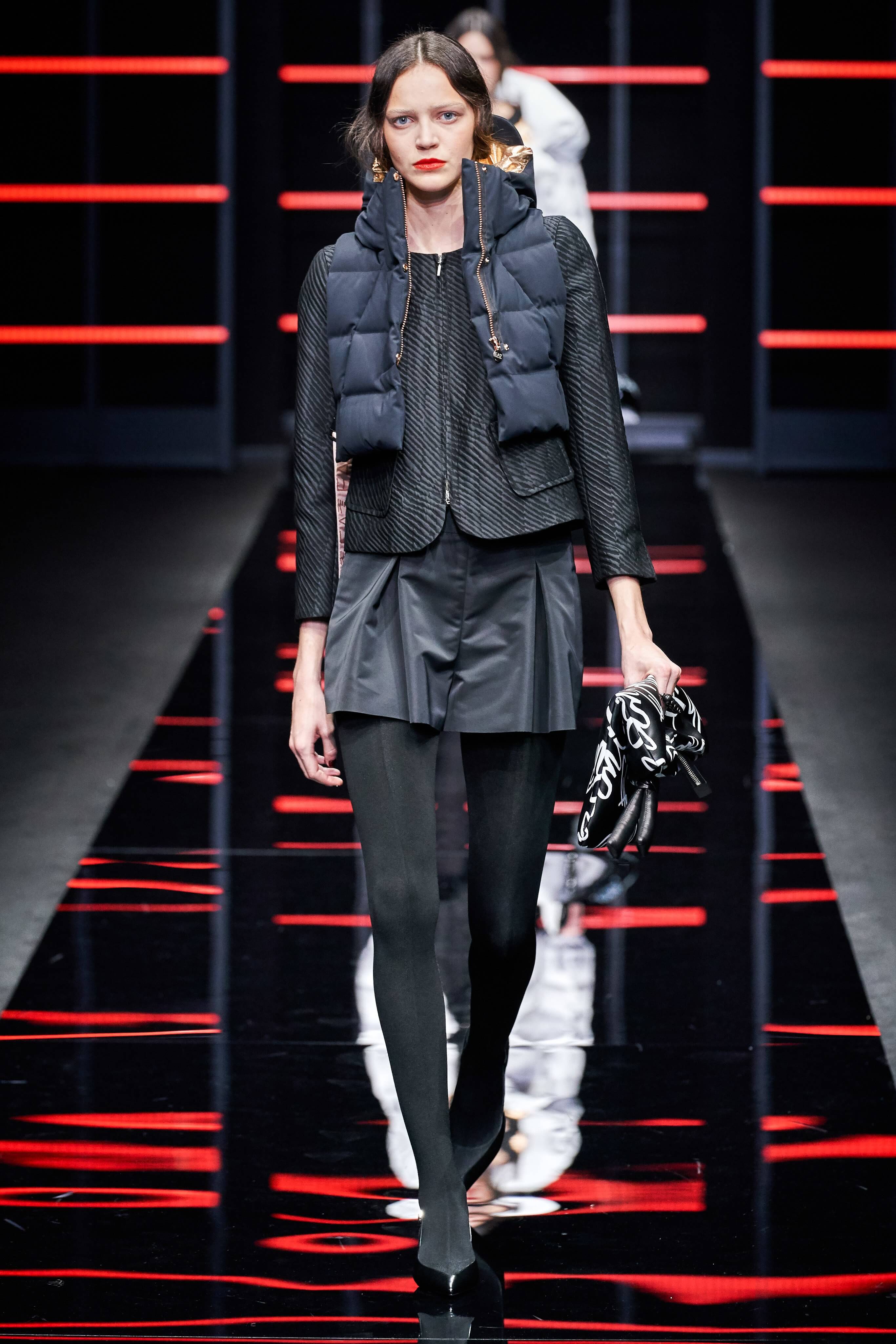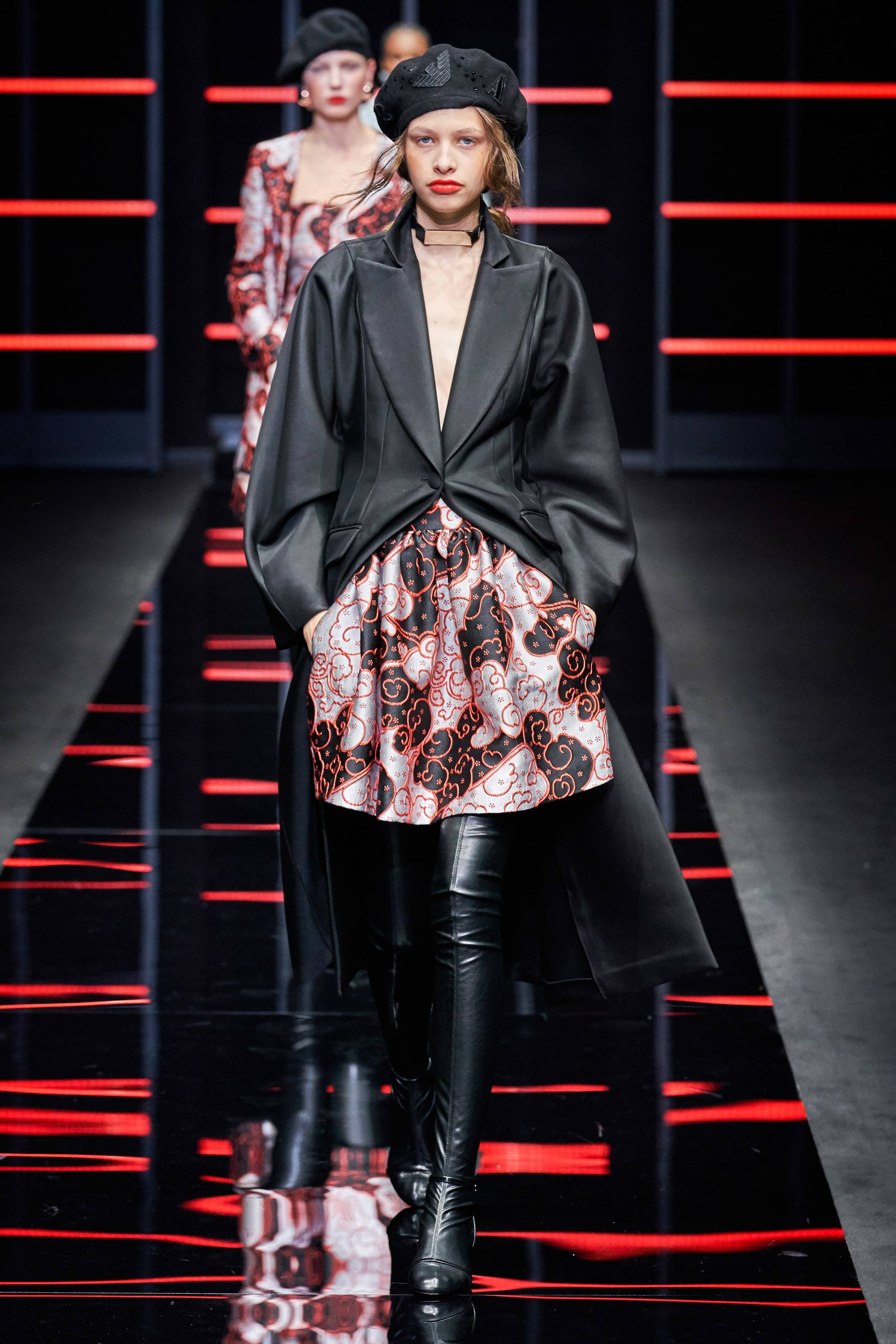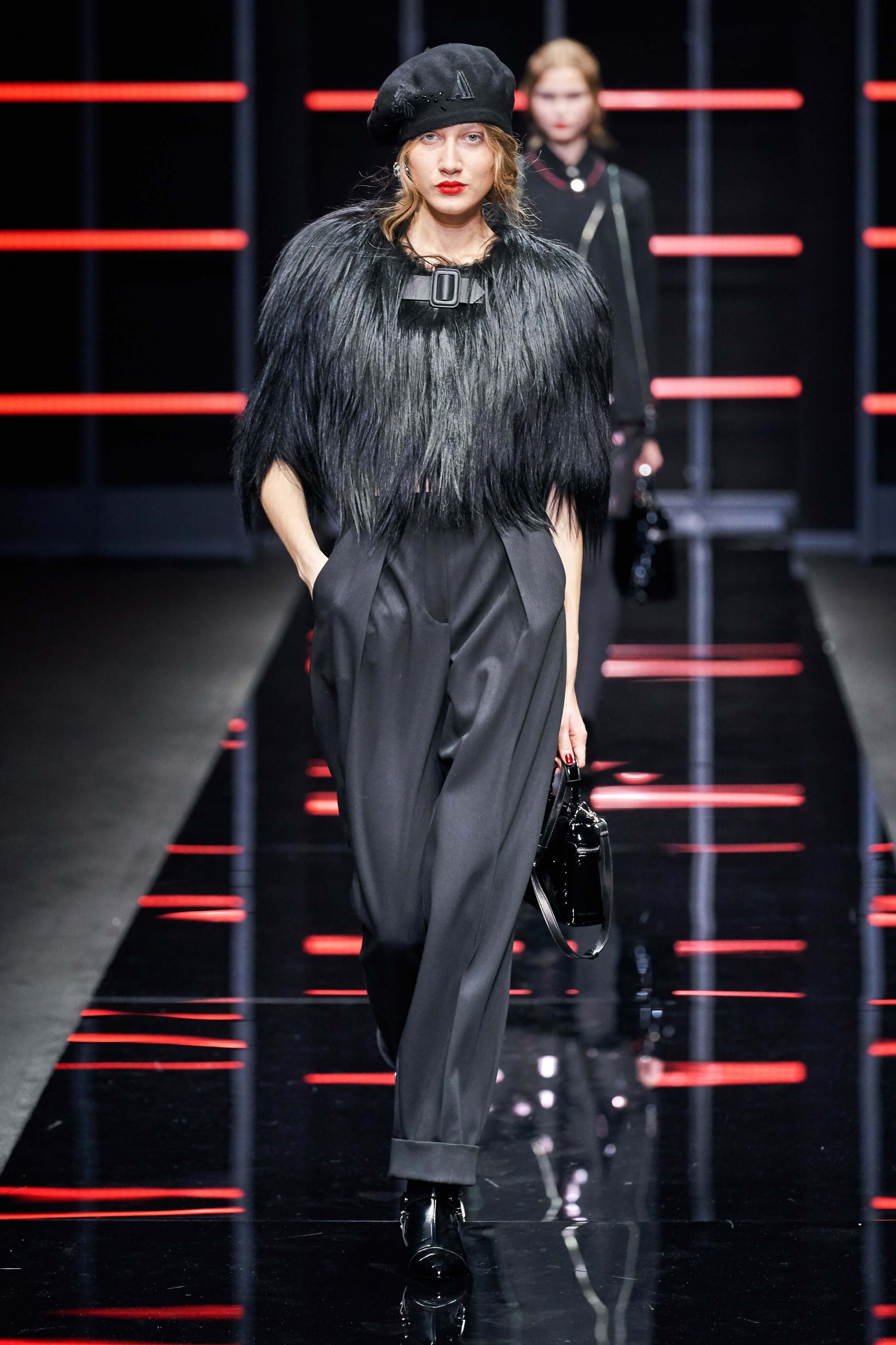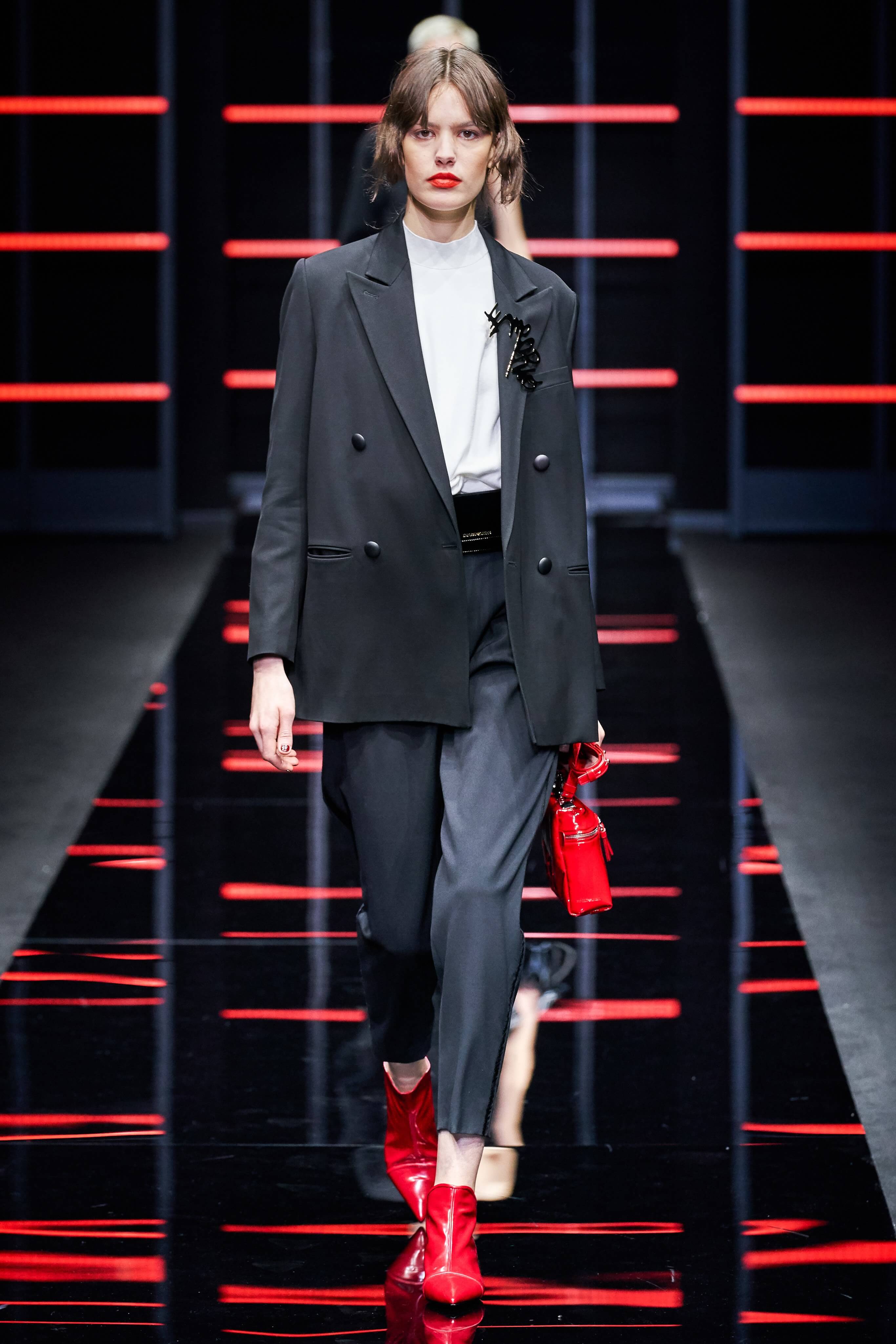 В коллекции винтажный шик легко уживается со свободными худи и харнесс-сумками, как в спортивной линии Emporio Armani 7, а струящиеся брюки, корсетные топы, люрекс и комплекты из жаккарда позаимствованы из кутюрной линии Armani Prive. Ультрасовременными образы коллекции делали чулки-ботфорты, микроскопические мессенджеры и минималистичные чокеры, как из фантастических фильмов.