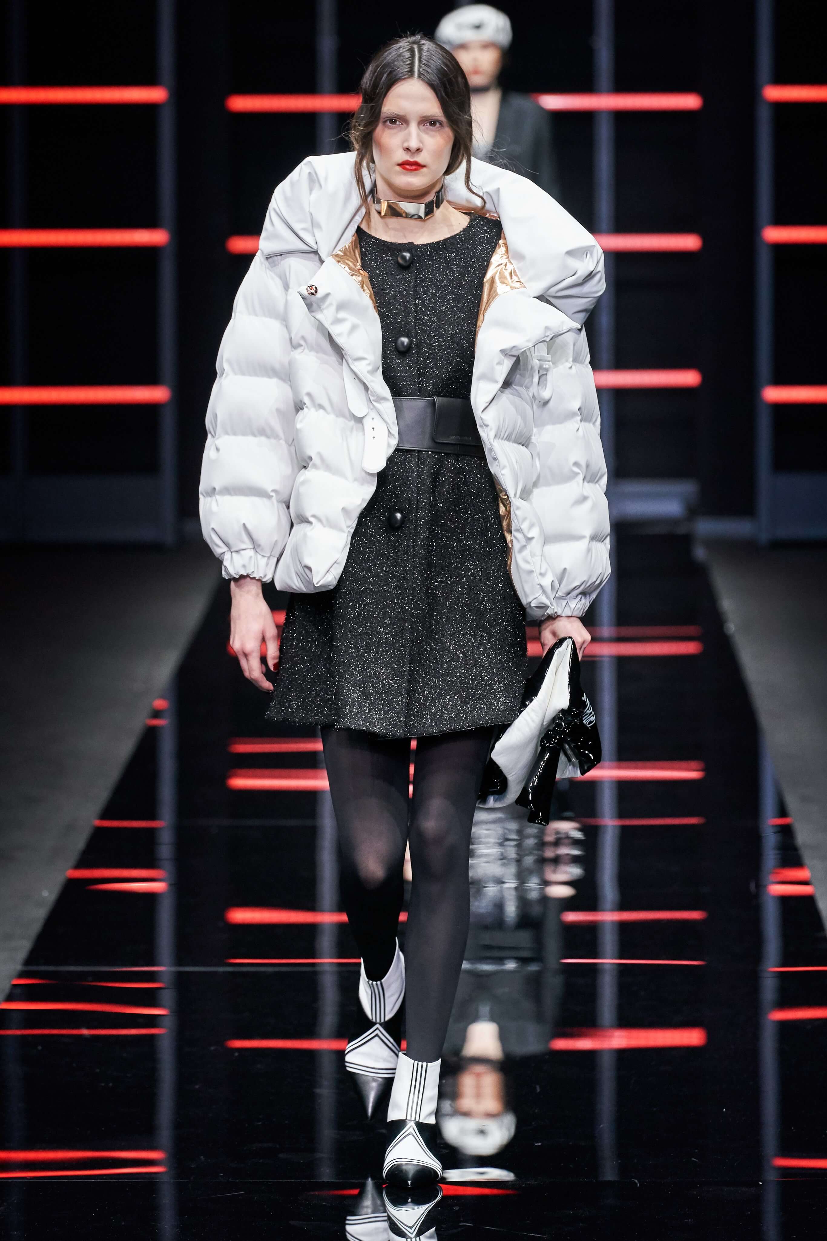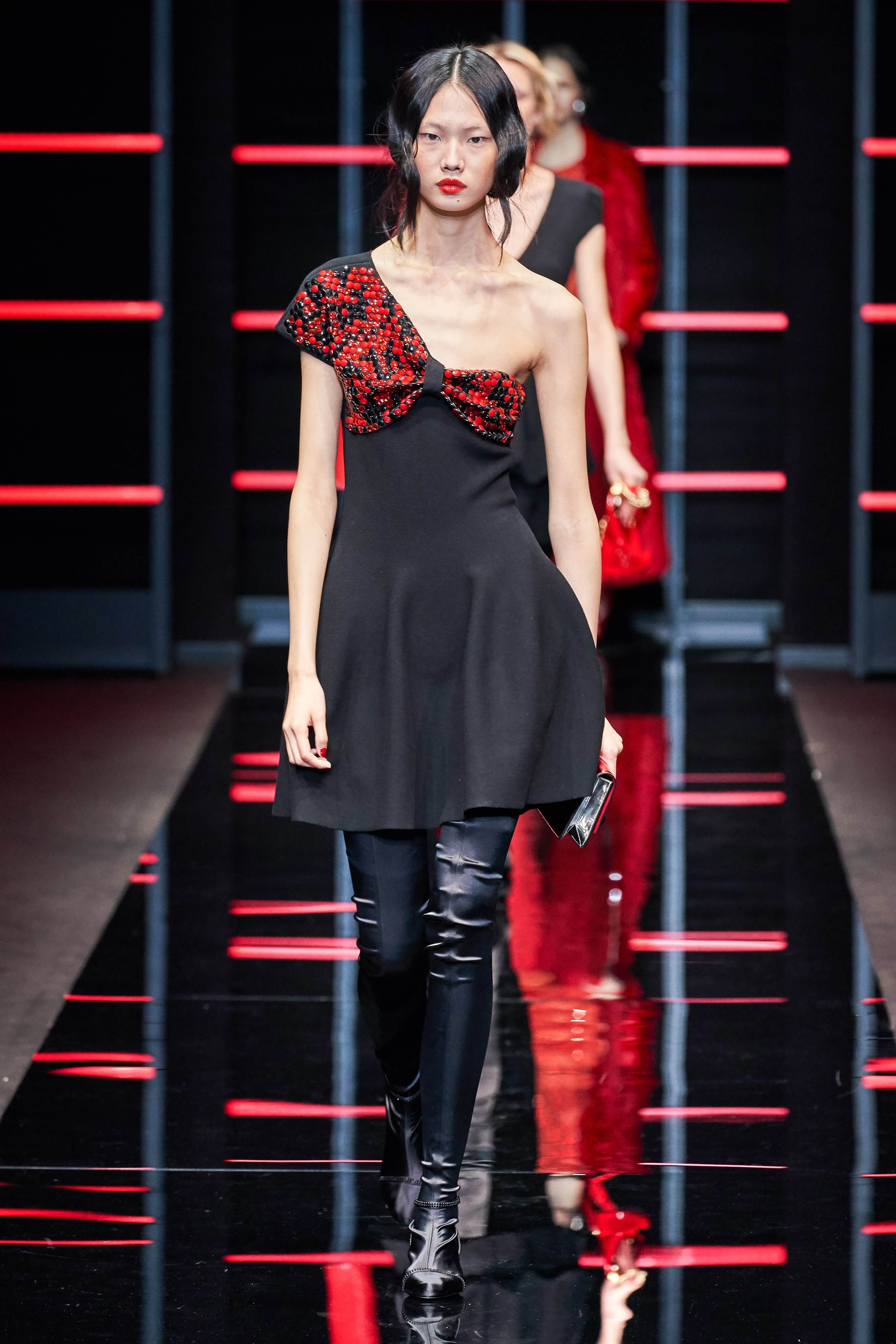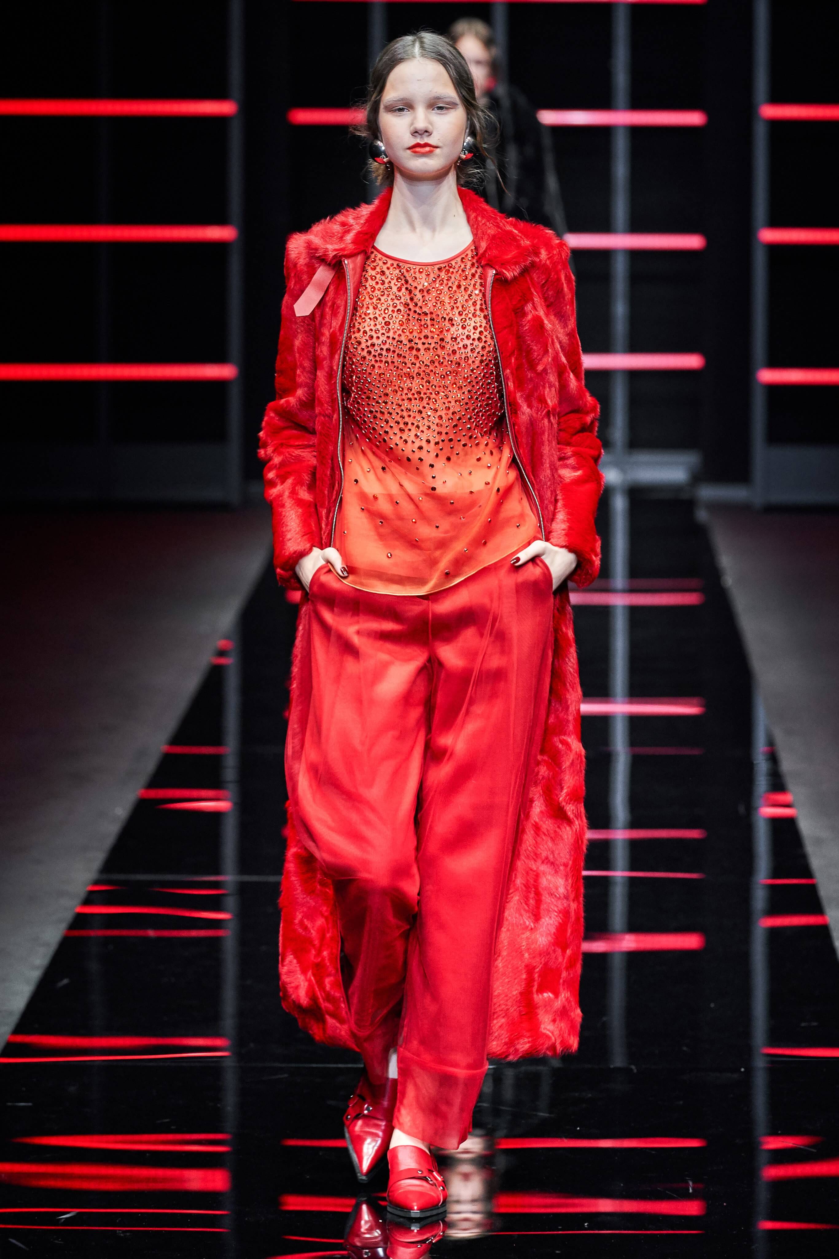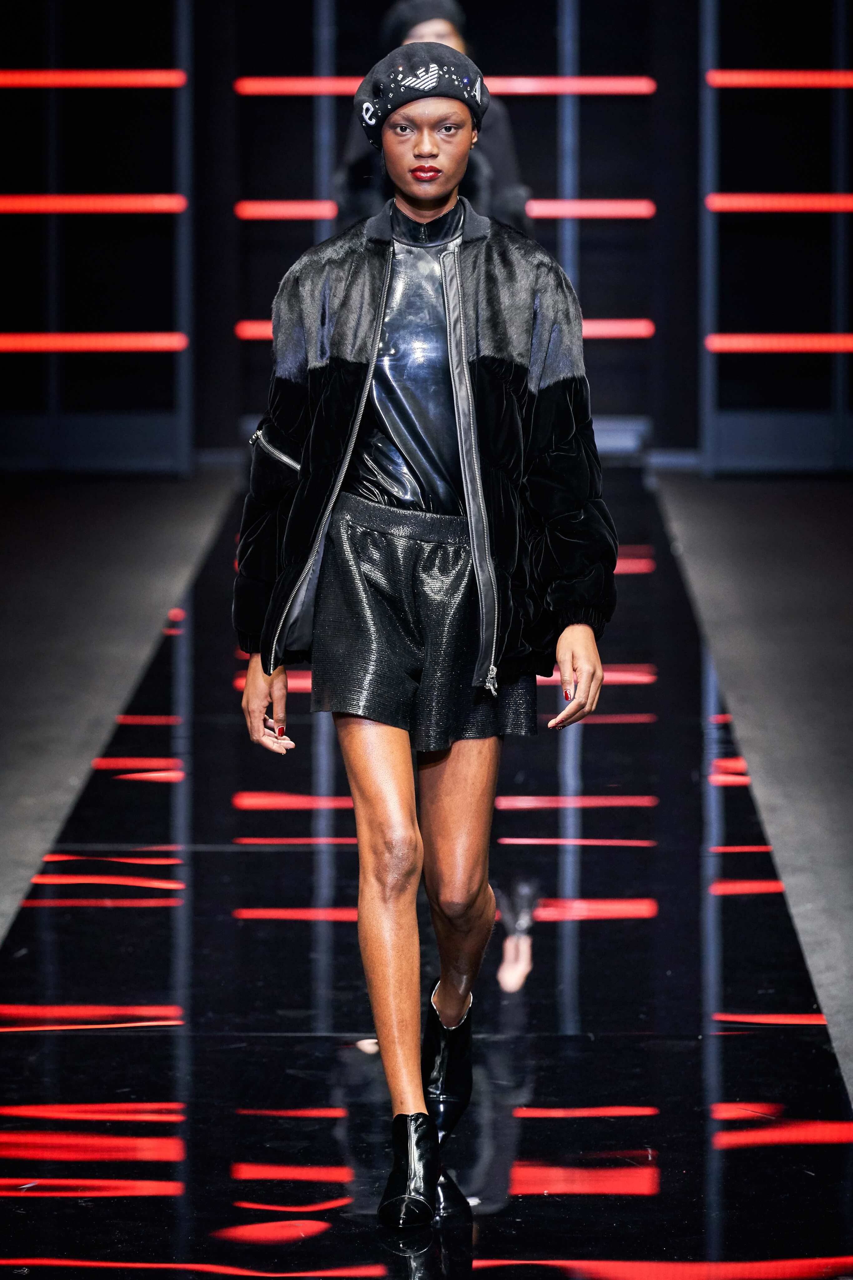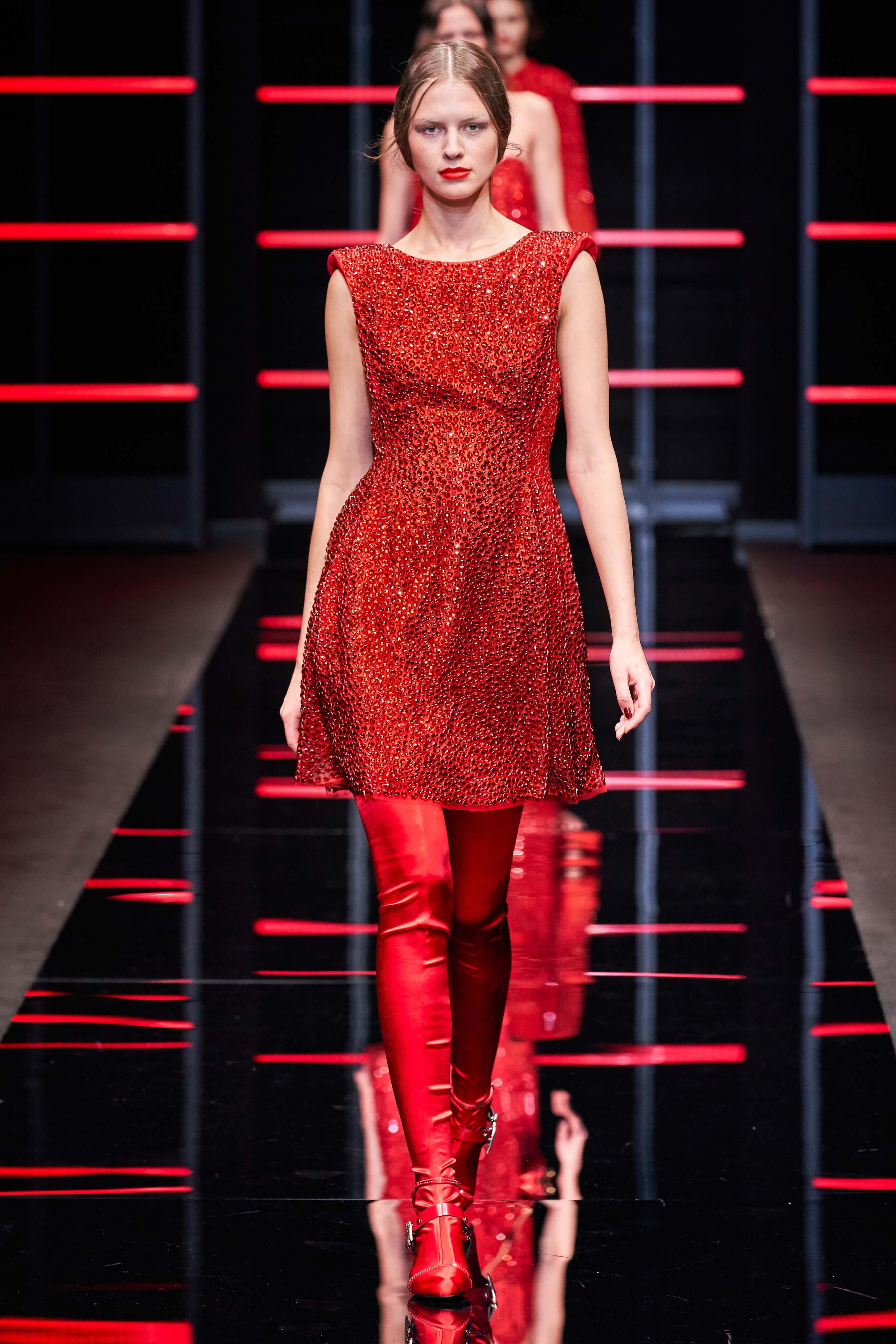 В коллекции винтажный шик легко уживается со свободными худи и харнесс-сумками, как в спортивной линии Emporio Armani 7, а струящиеся брюки, корсетные топы, люрекс и комплекты из жаккарда позаимствованы из кутюрной линии Armani Prive. Ультрасовременными образы коллекции делали чулки-ботфорты, микроскопические мессенджеры и минималистичные чокеры, как из фантастических фильмов.