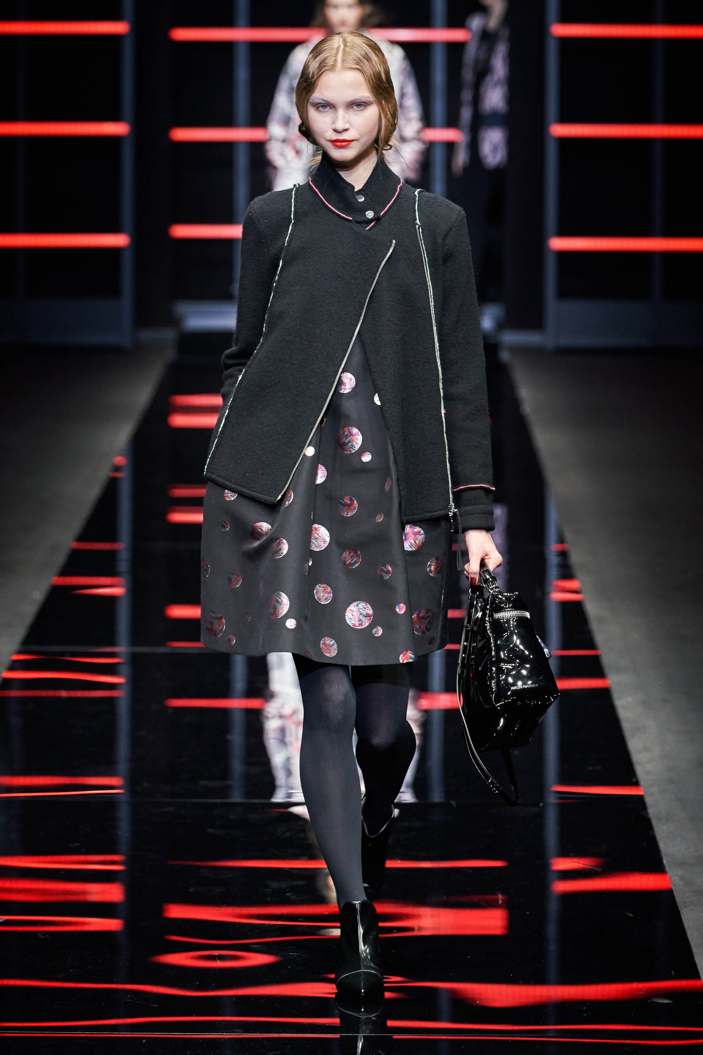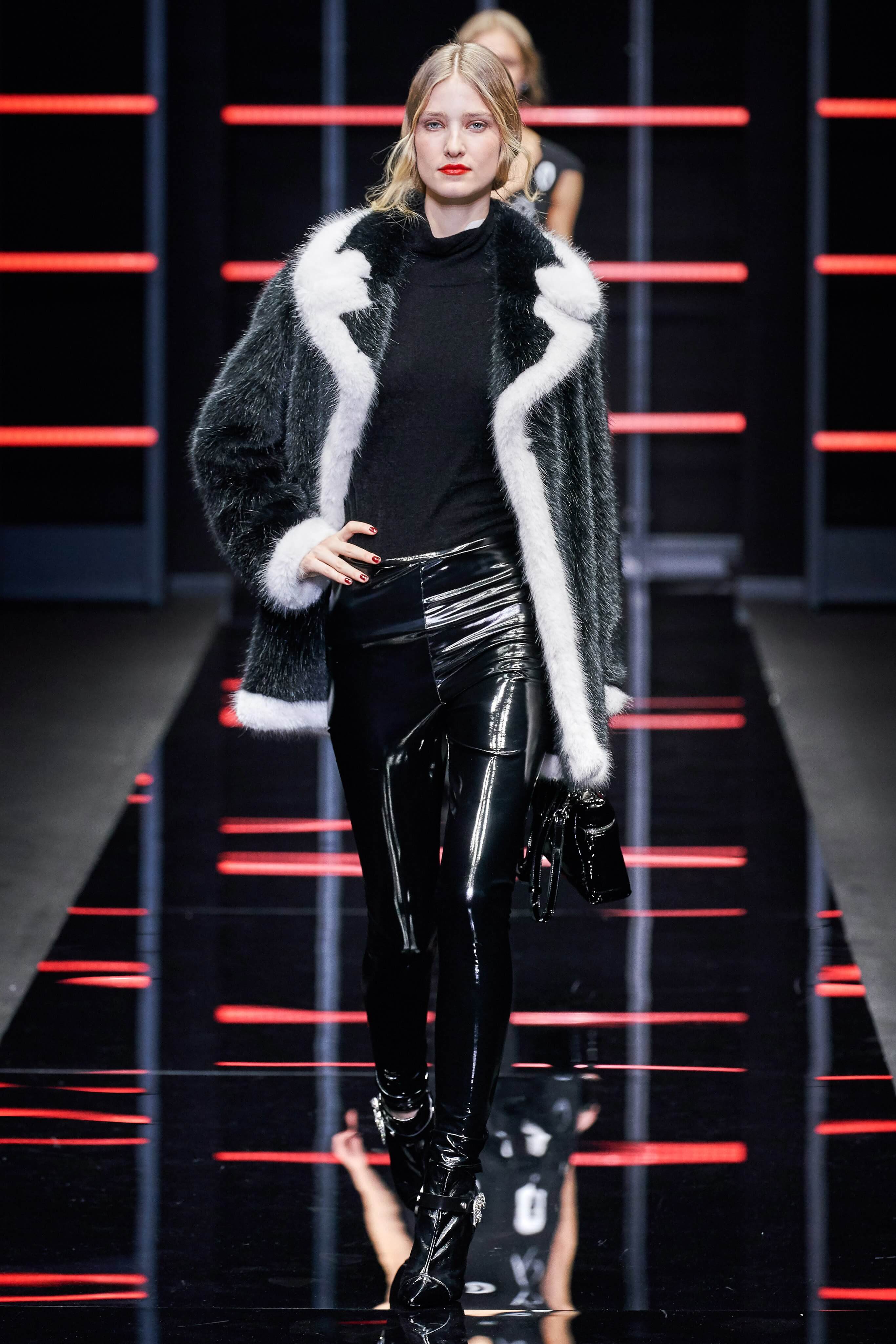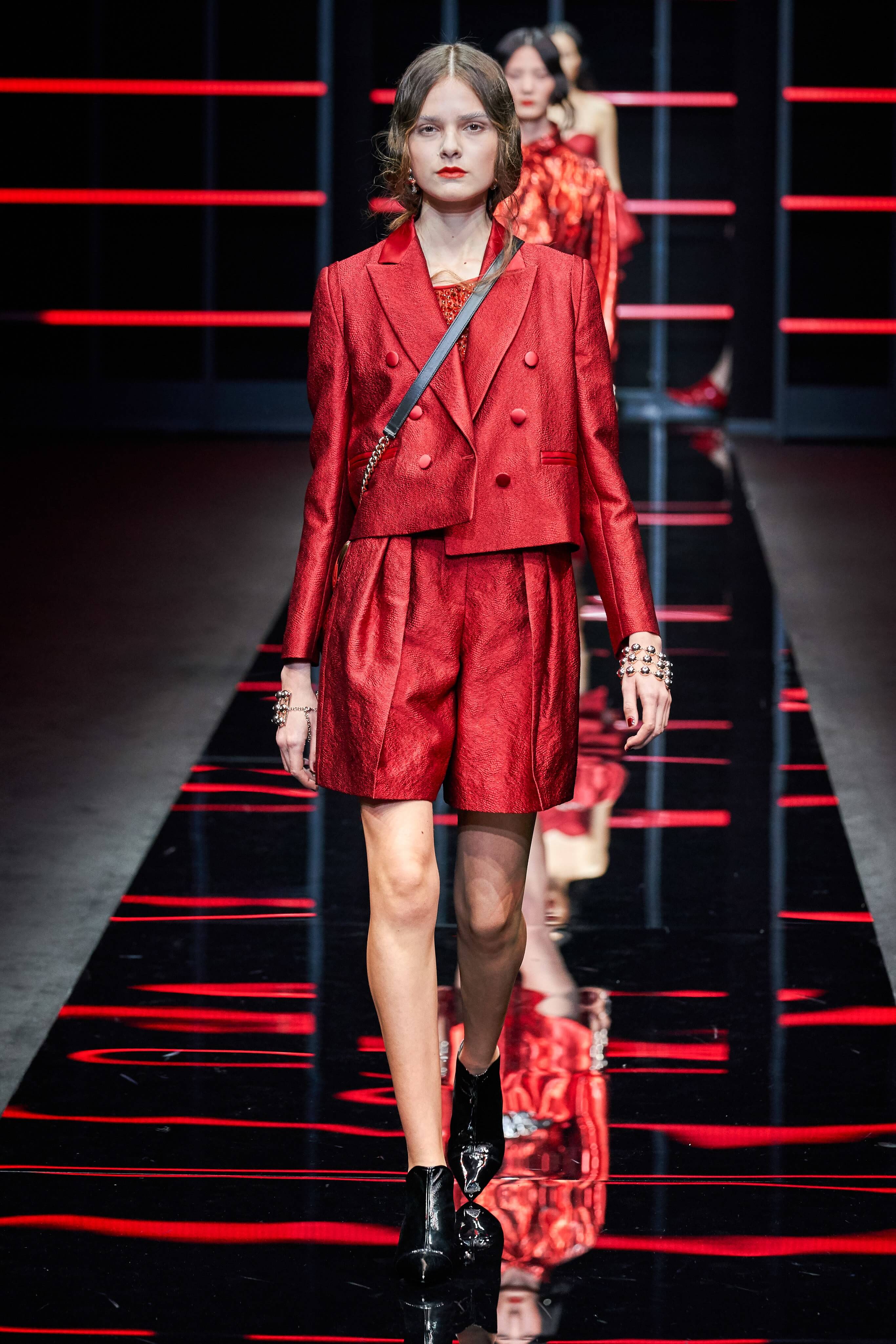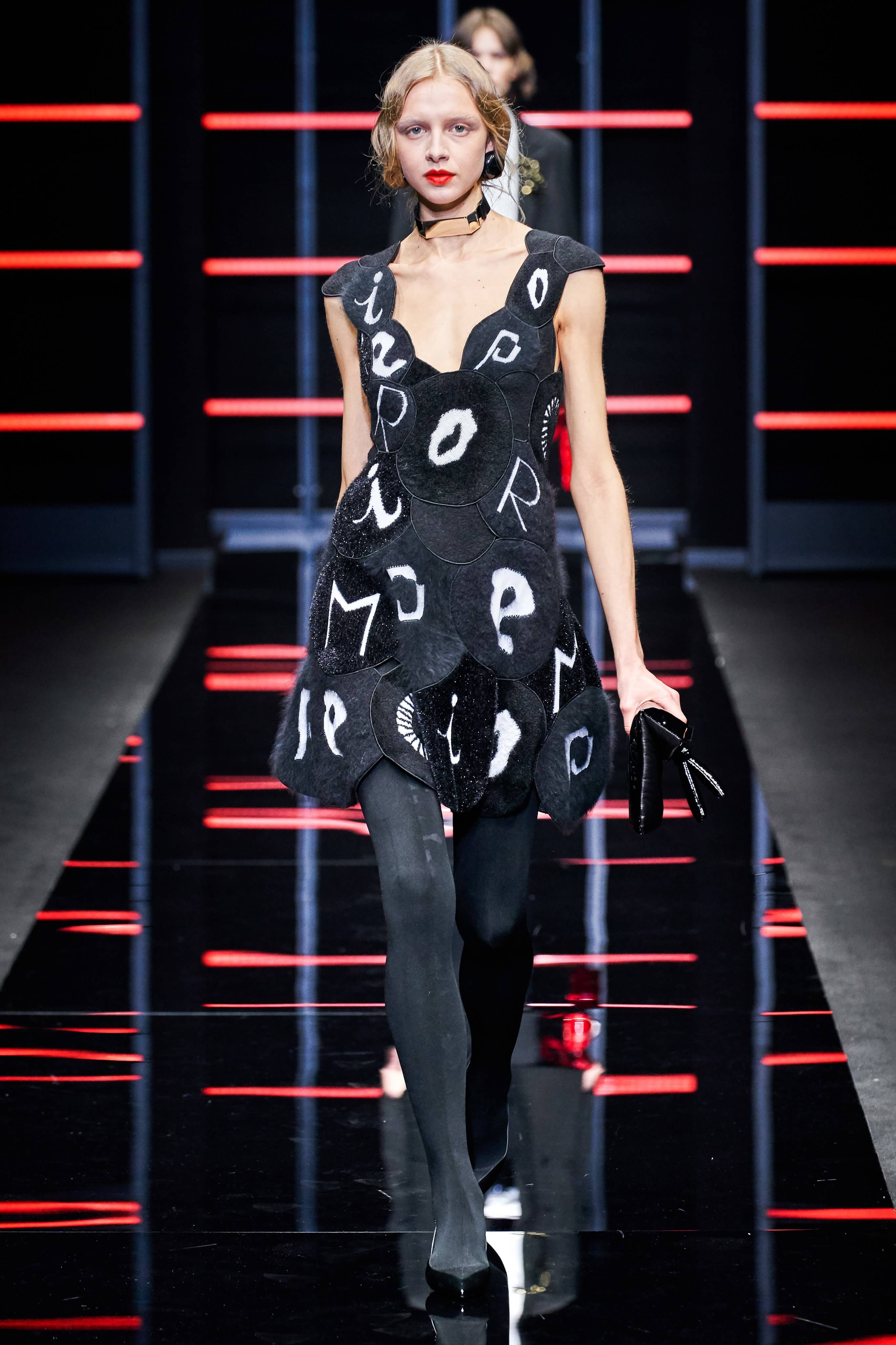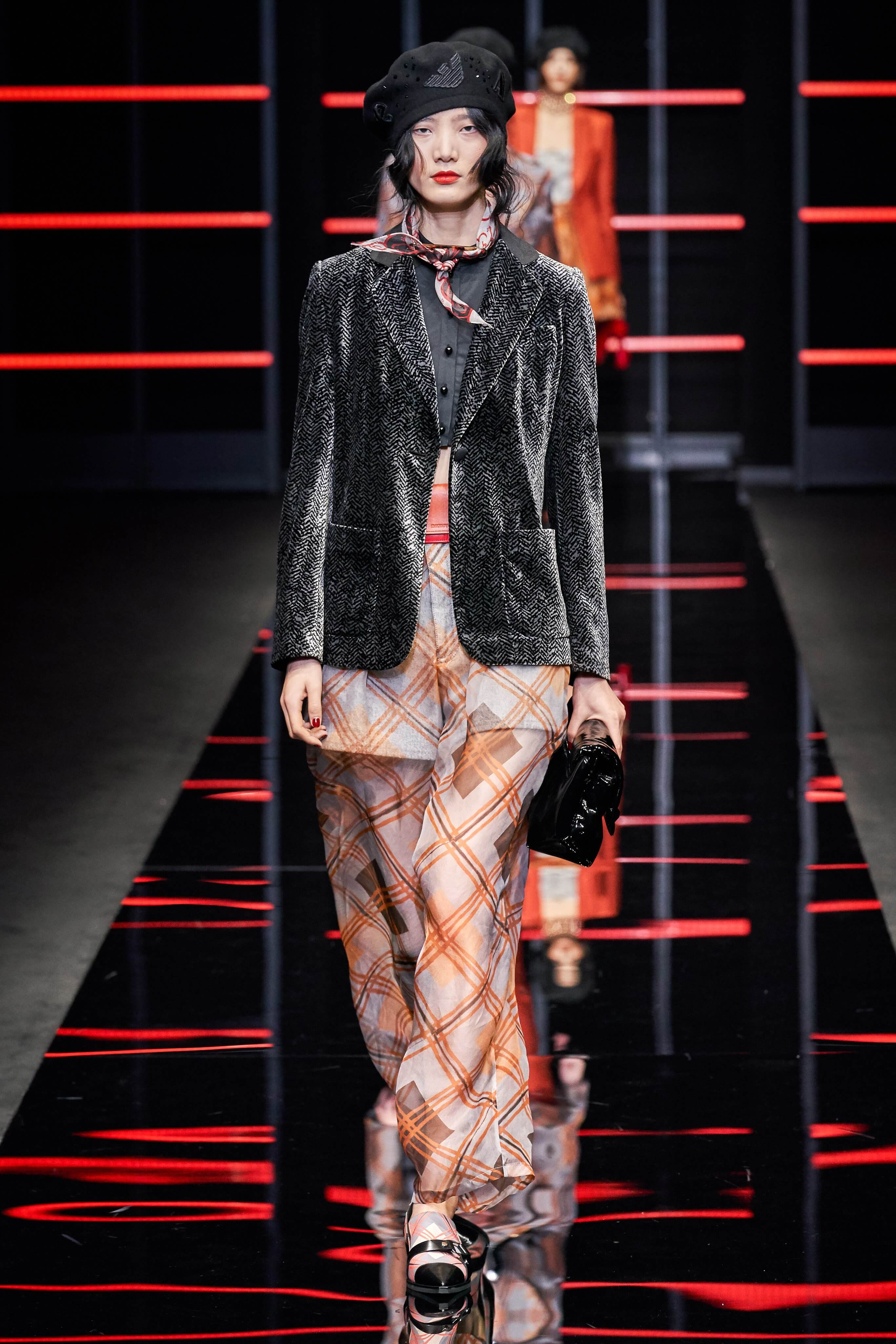 В коллекции винтажный шик легко уживается со свободными худи и харнесс-сумками, как в спортивной линии Emporio Armani 7, а струящиеся брюки, корсетные топы, люрекс и комплекты из жаккарда позаимствованы из кутюрной линии Armani Prive. Ультрасовременными образы коллекции делали чулки-ботфорты, микроскопические мессенджеры и минималистичные чокеры, как из фантастических фильмов.