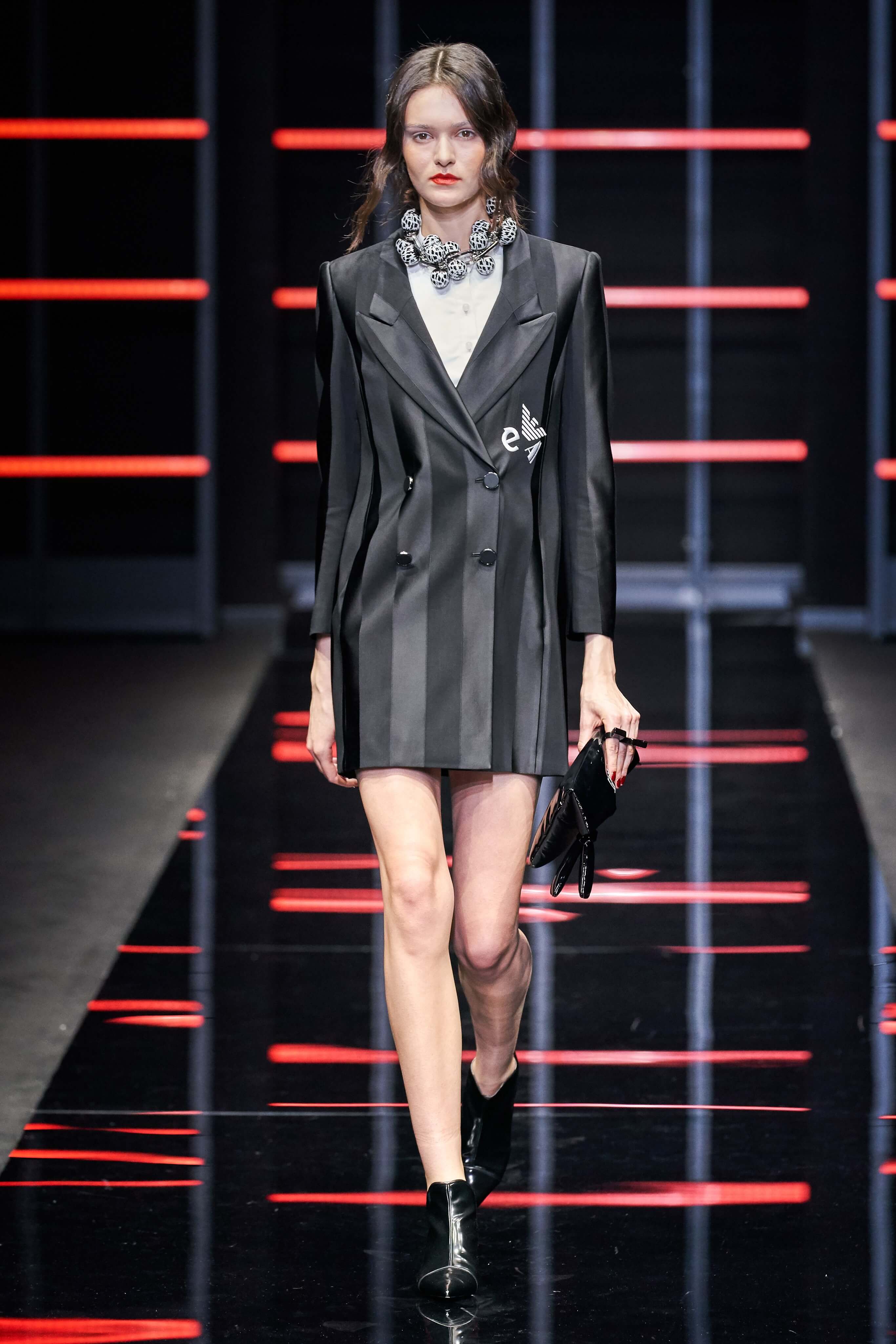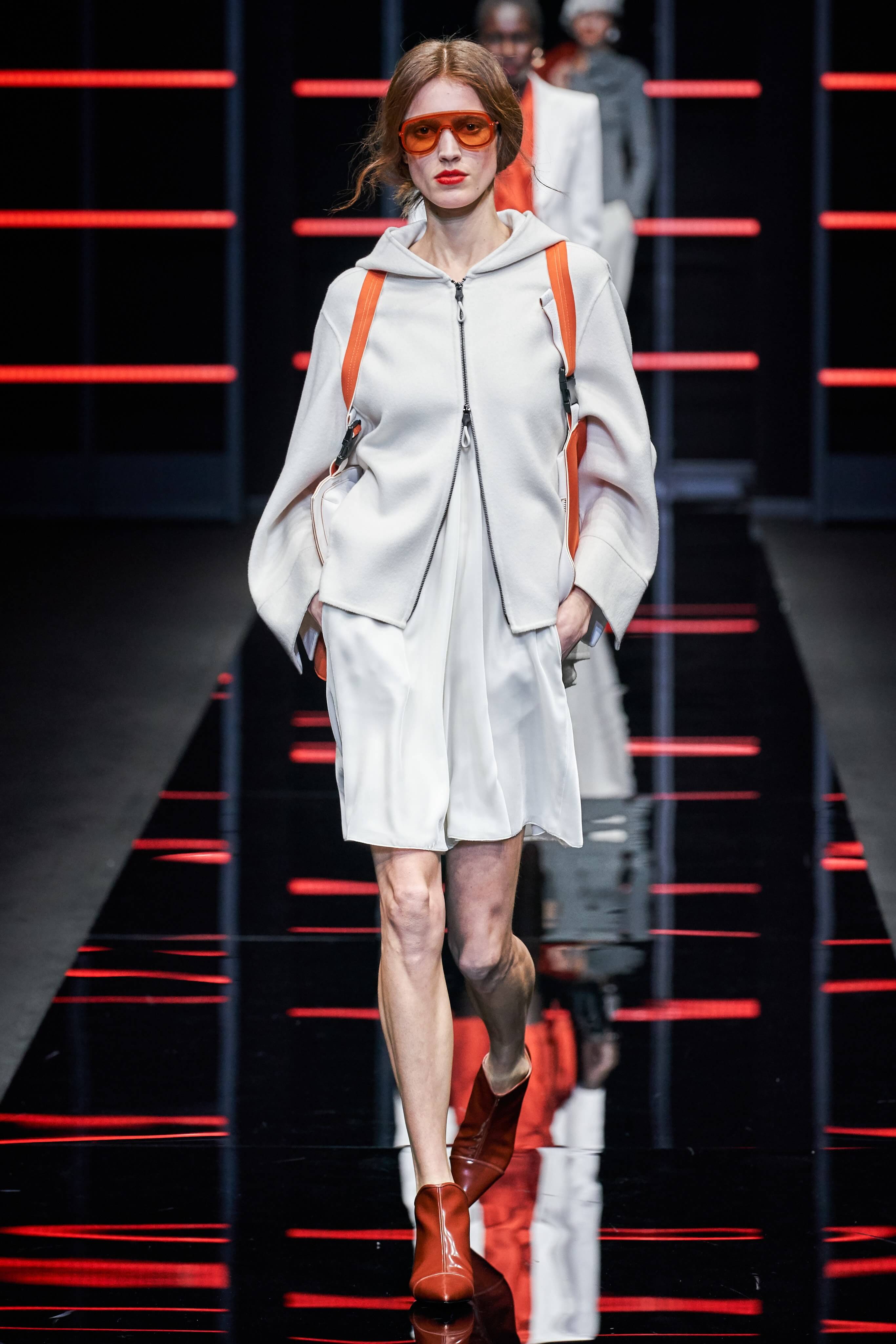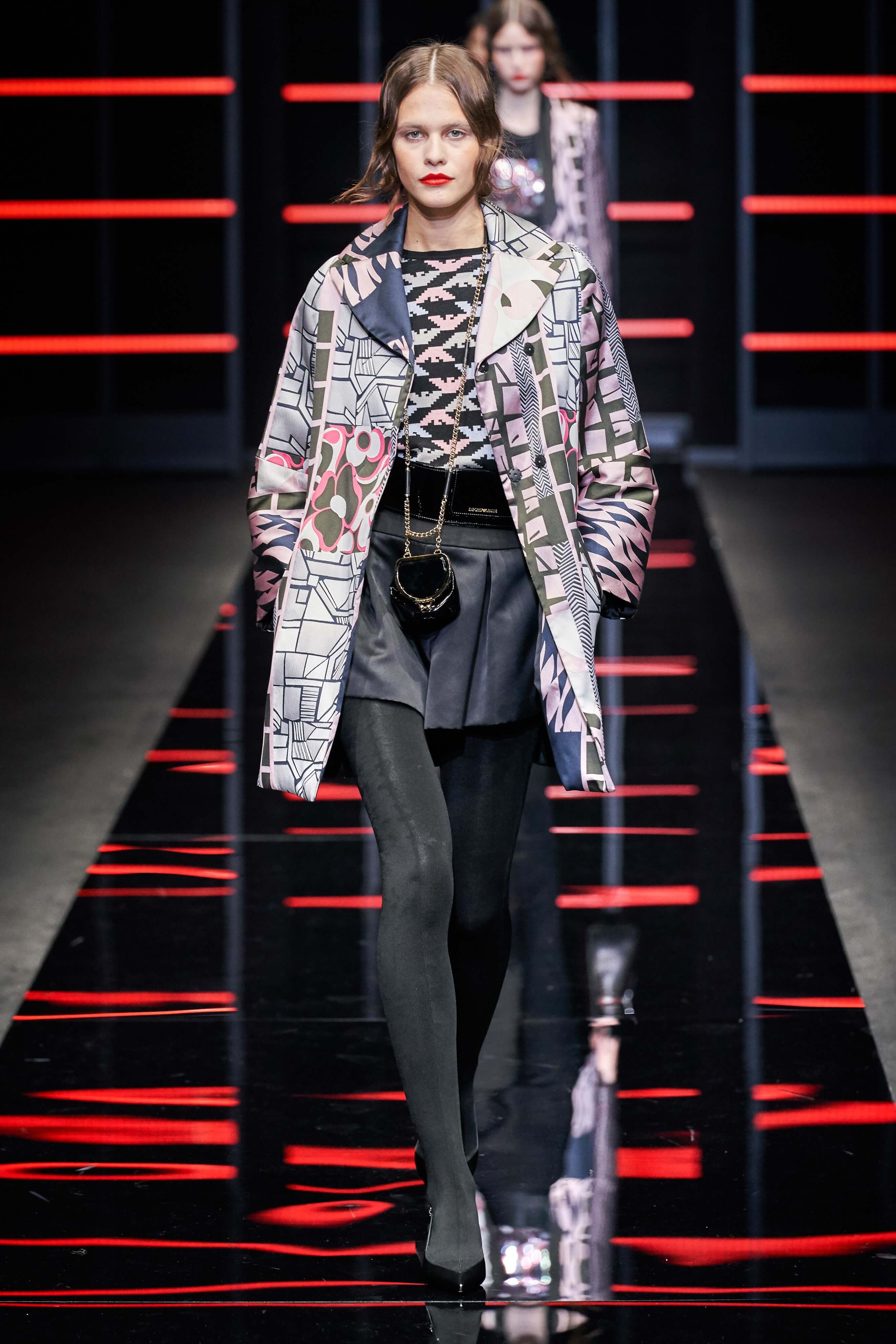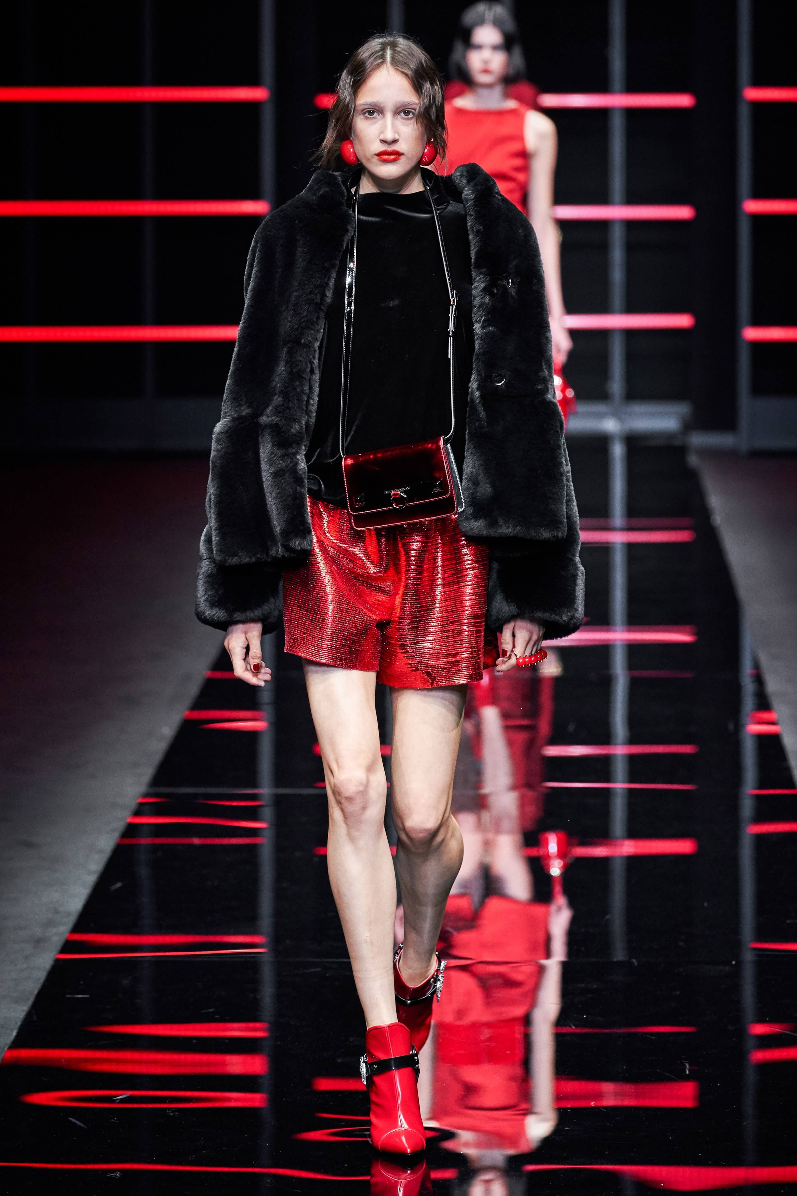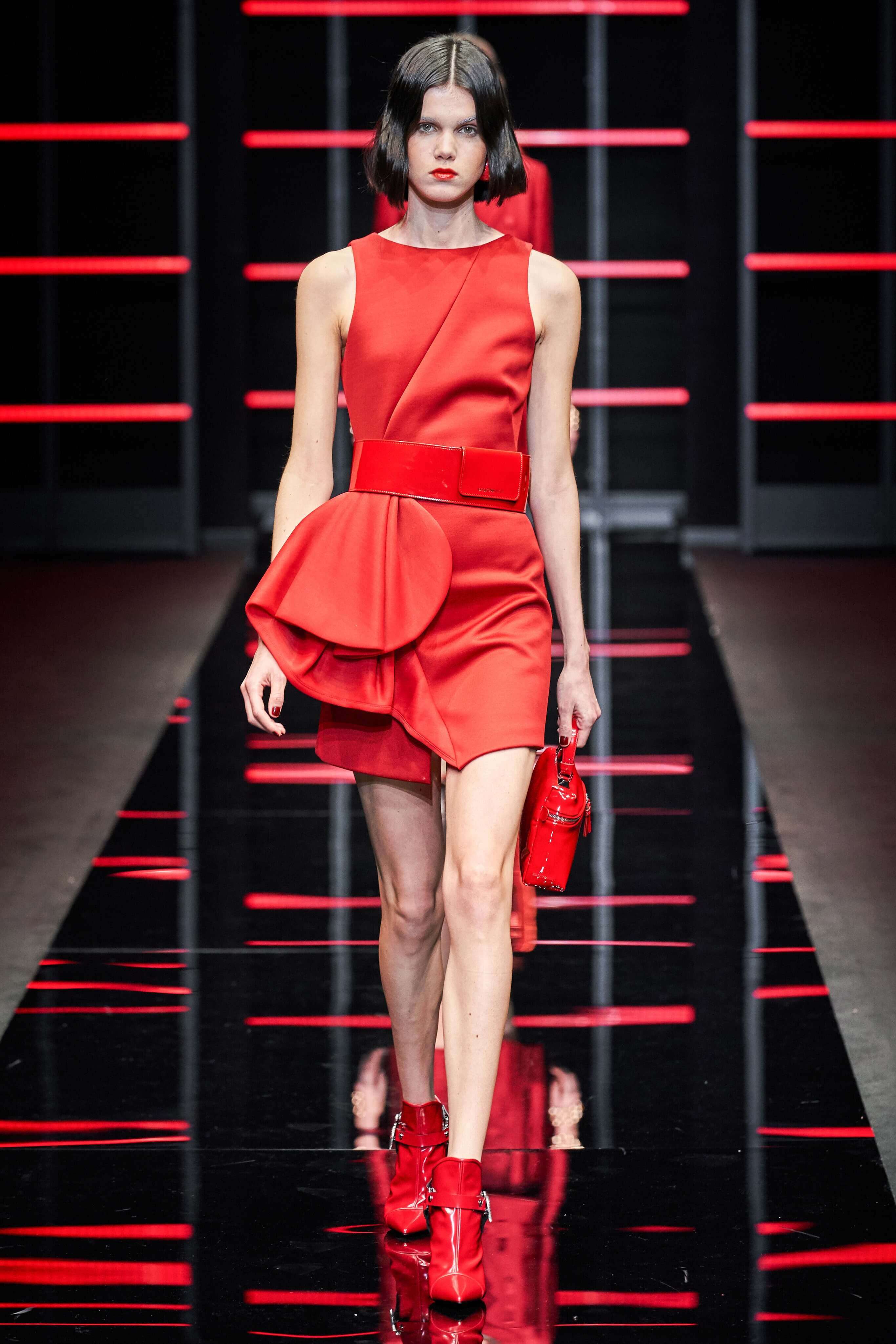 В коллекции винтажный шик легко уживается со свободными худи и харнесс-сумками, как в спортивной линии Emporio Armani 7, а струящиеся брюки, корсетные топы, люрекс и комплекты из жаккарда позаимствованы из кутюрной линии Armani Prive. Ультрасовременными образы коллекции делали чулки-ботфорты, микроскопические мессенджеры и минималистичные чокеры, как из фантастических фильмов.
