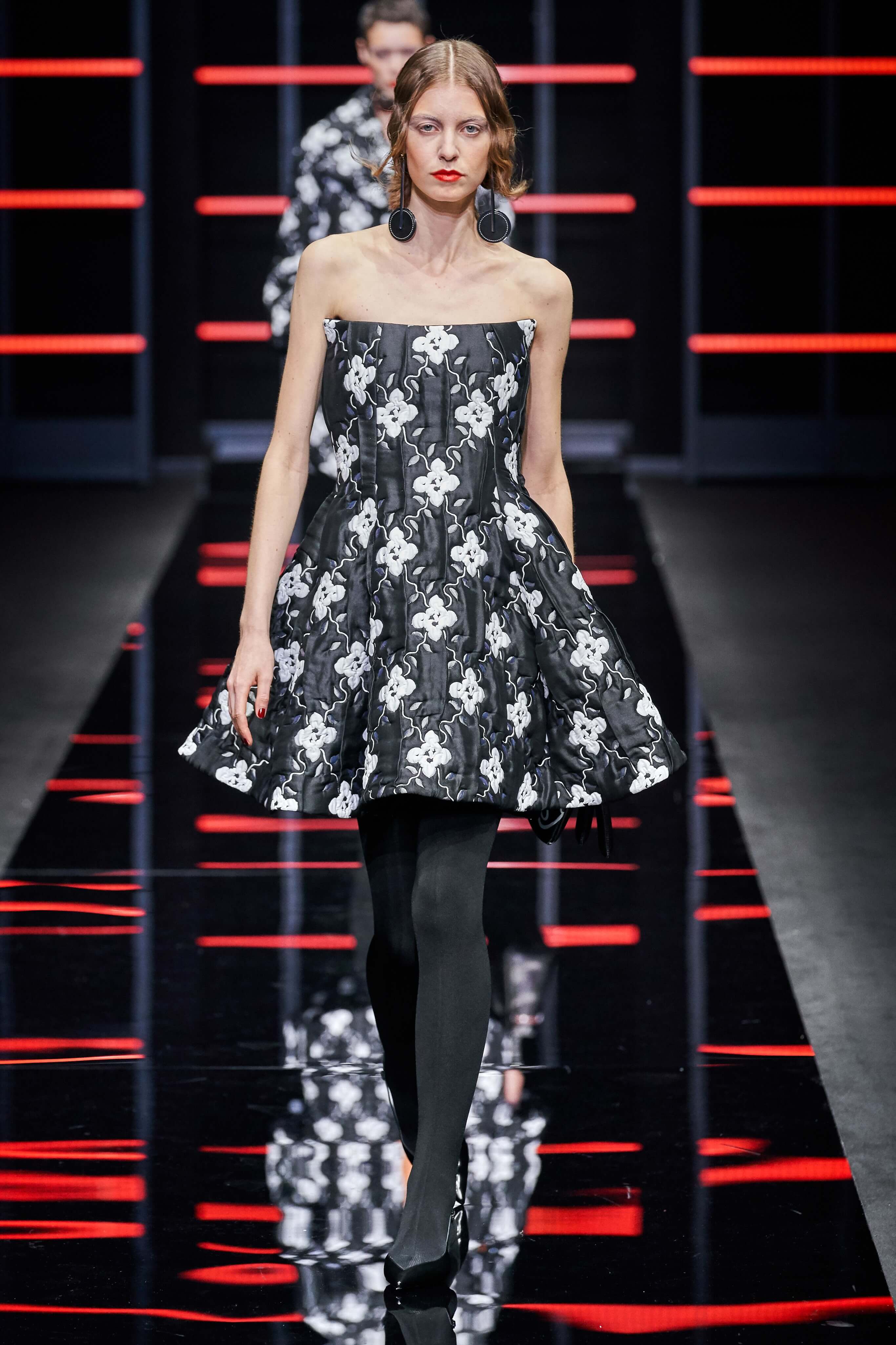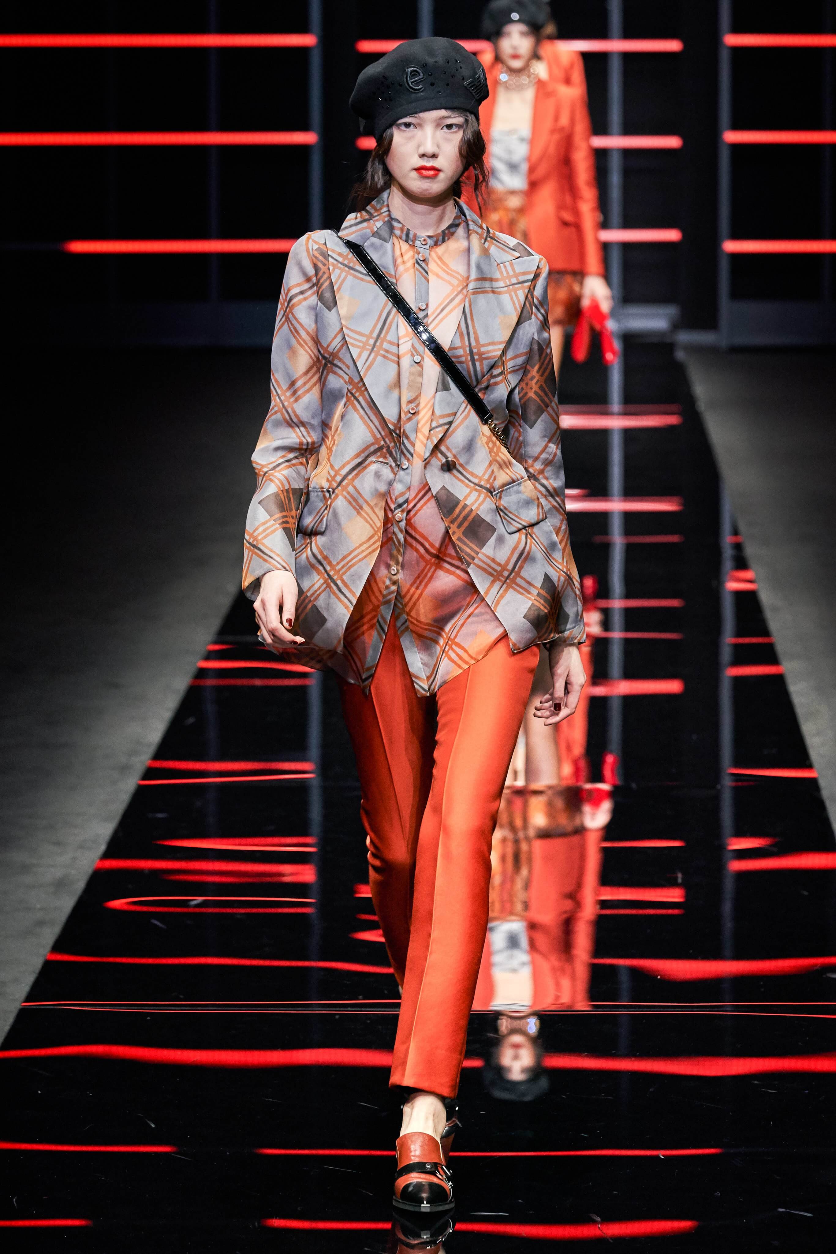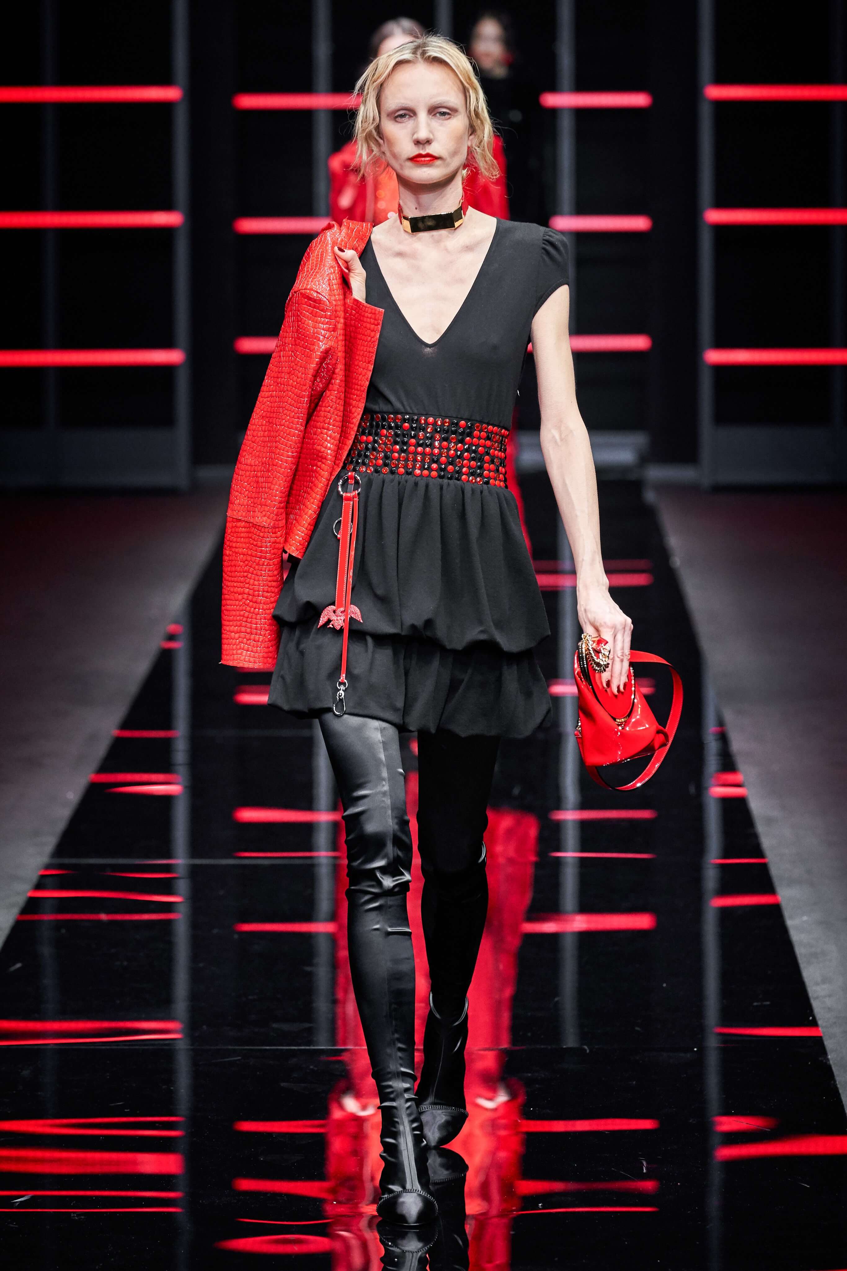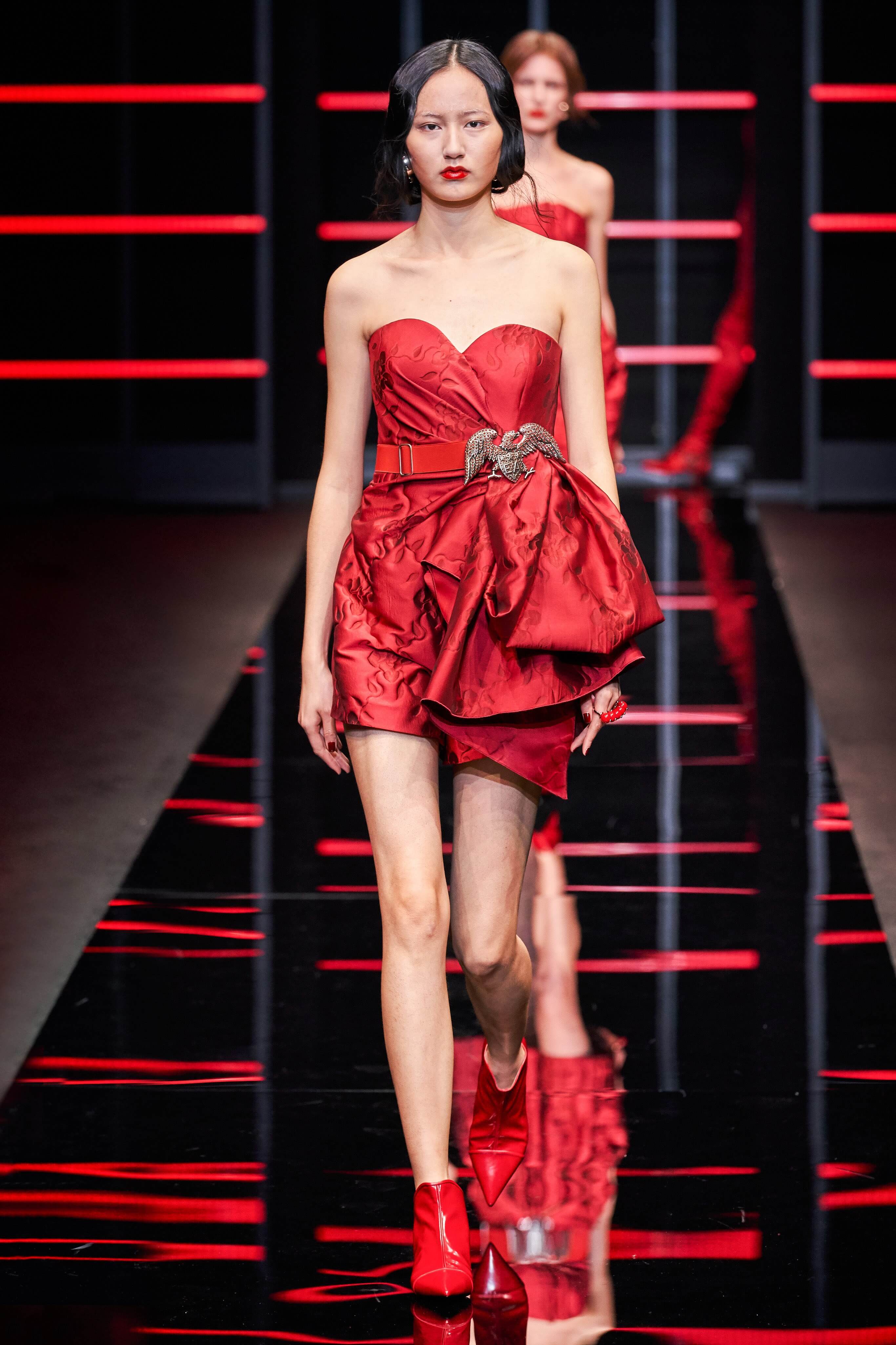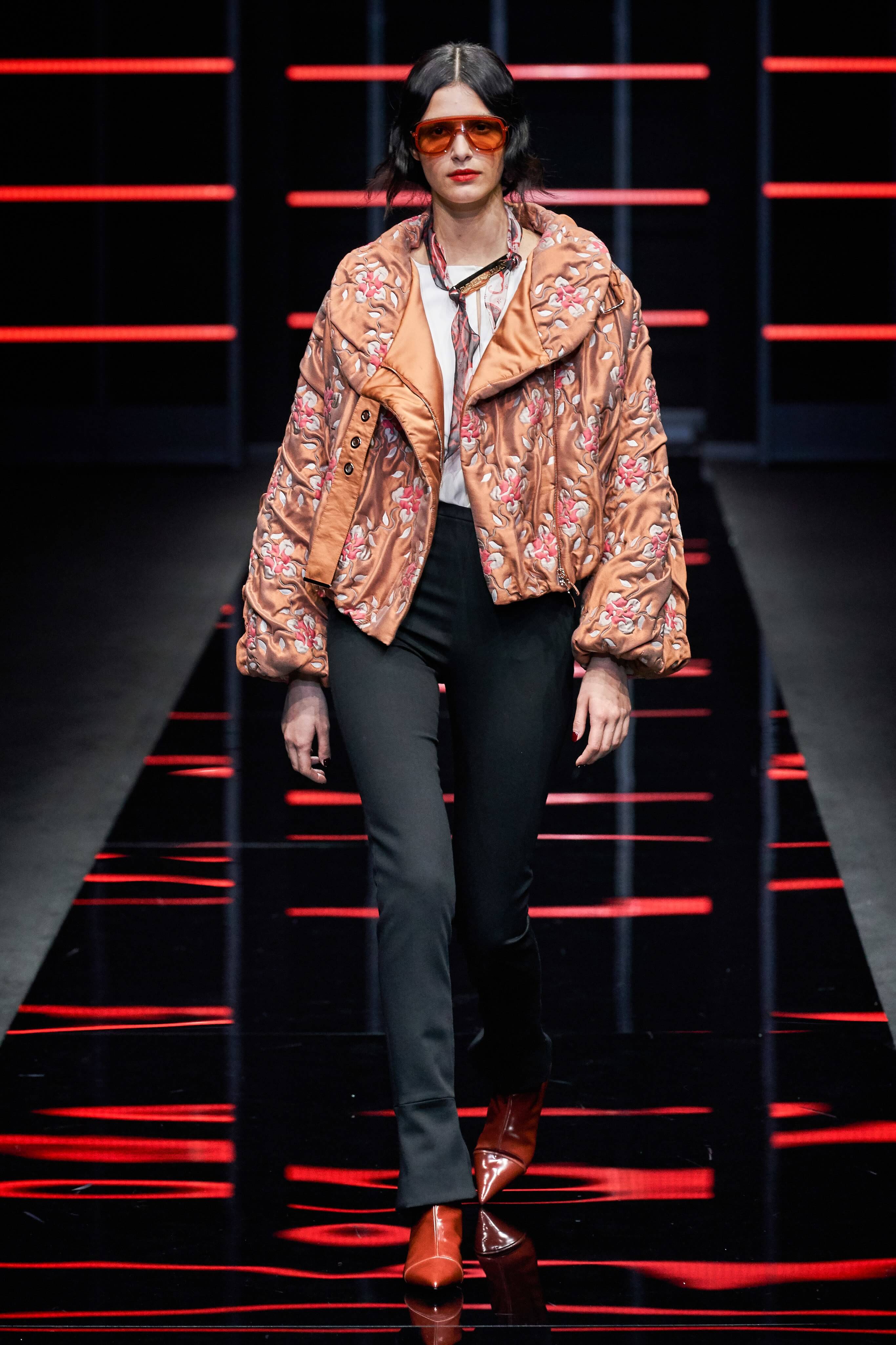 В коллекции винтажный шик легко уживается со свободными худи и харнесс-сумками, как в спортивной линии Emporio Armani 7, а струящиеся брюки, корсетные топы, люрекс и комплекты из жаккарда позаимствованы из кутюрной линии Armani Prive. Ультрасовременными образы коллекции делали чулки-ботфорты, микроскопические мессенджеры и минималистичные чокеры, как из фантастических фильмов.