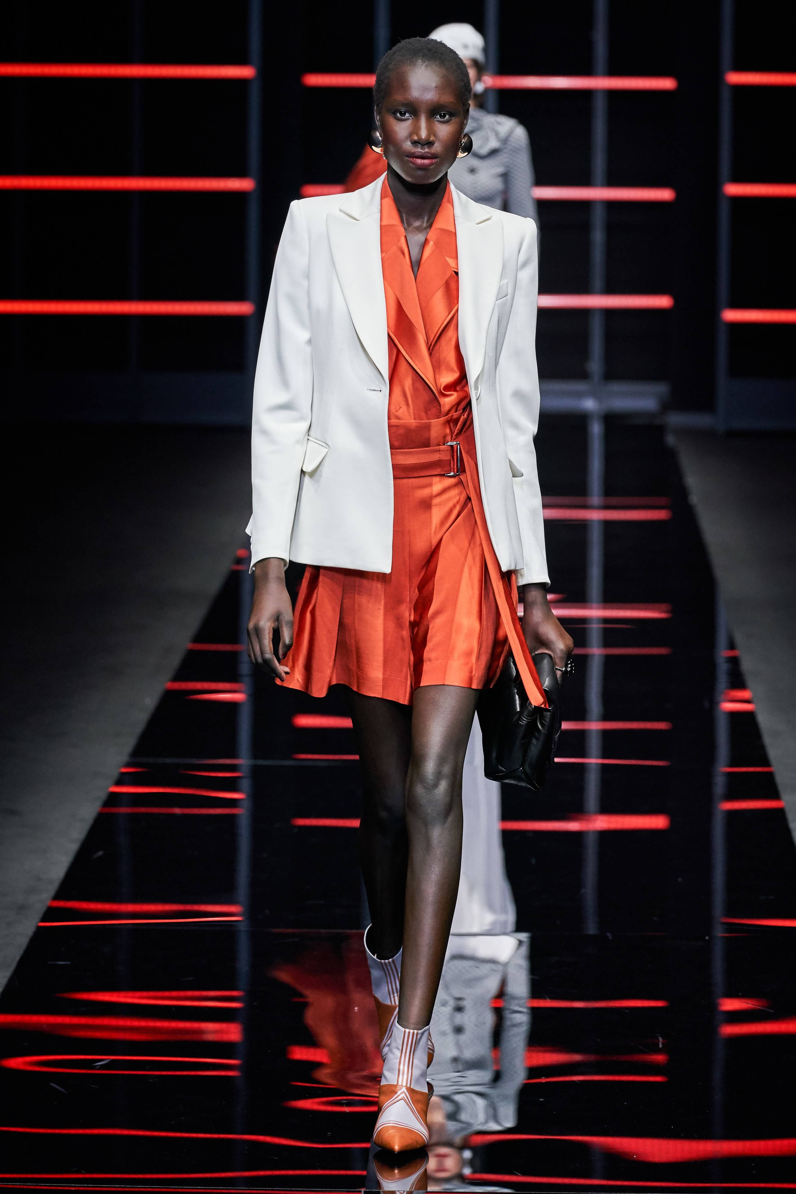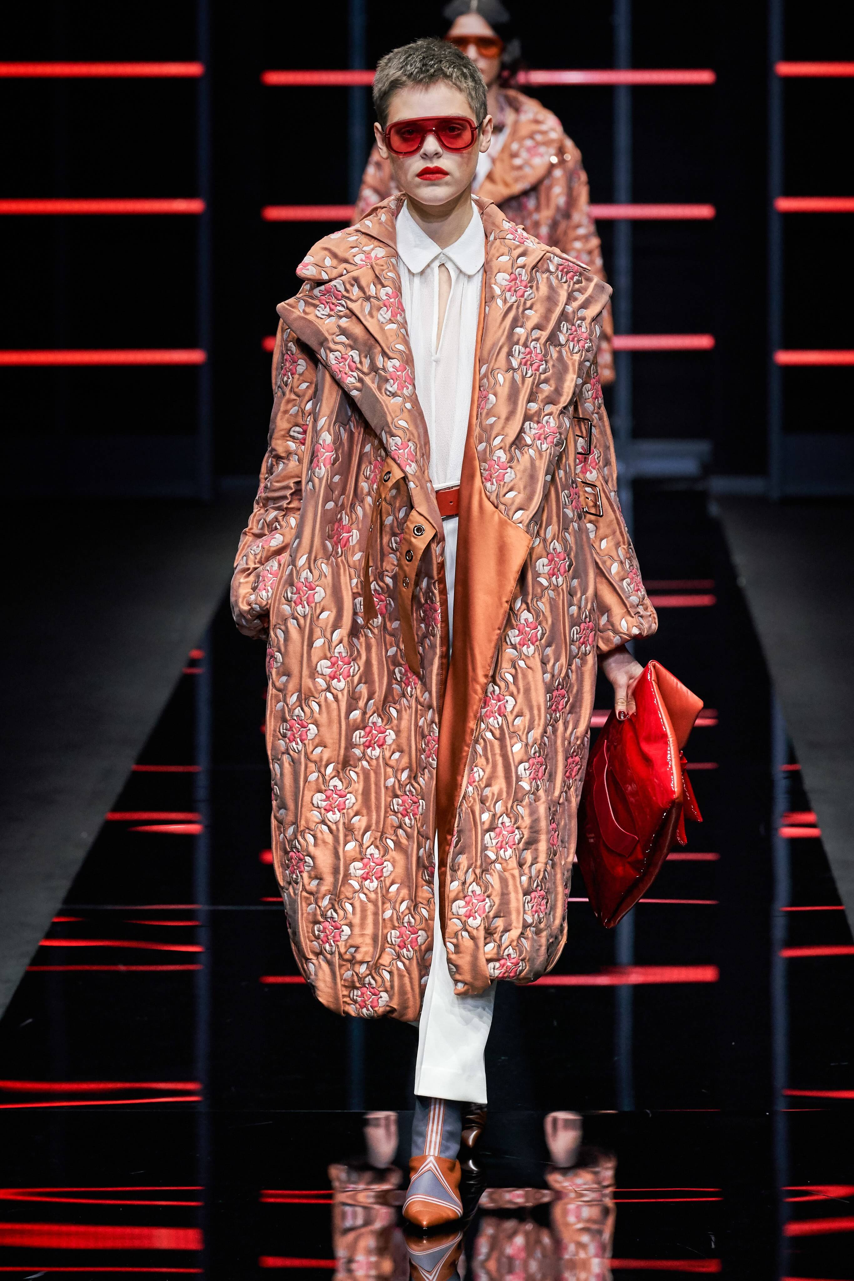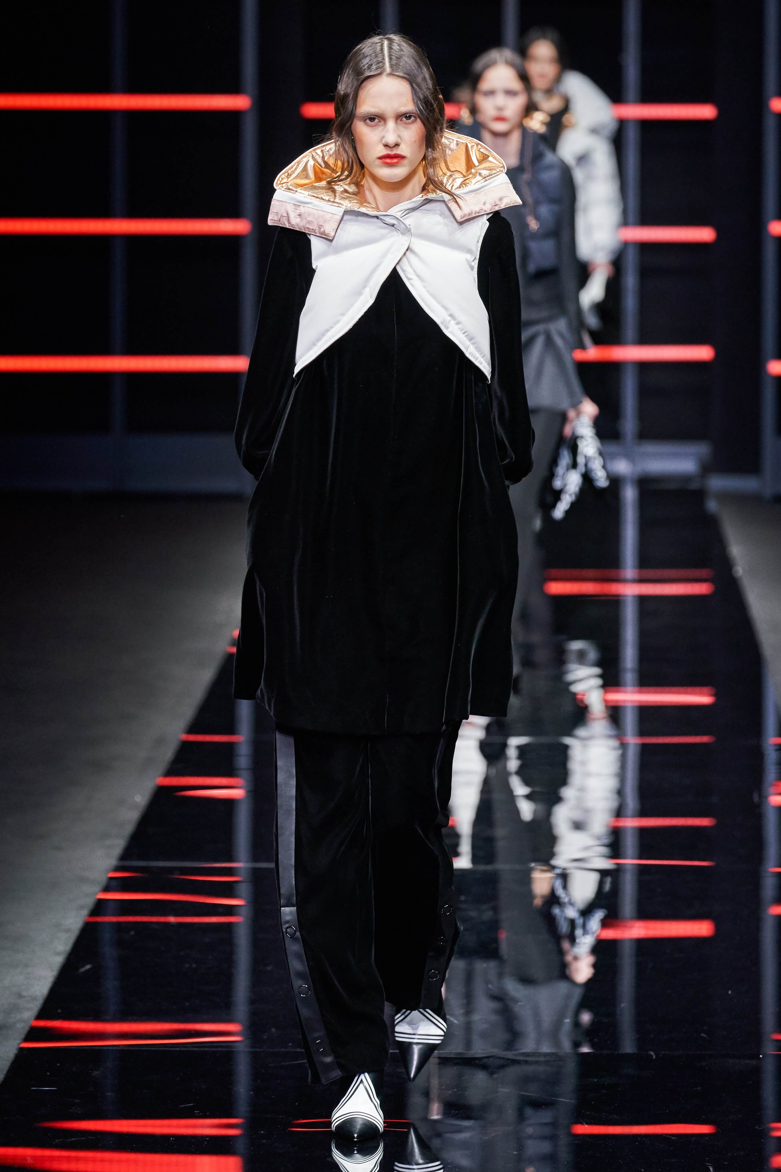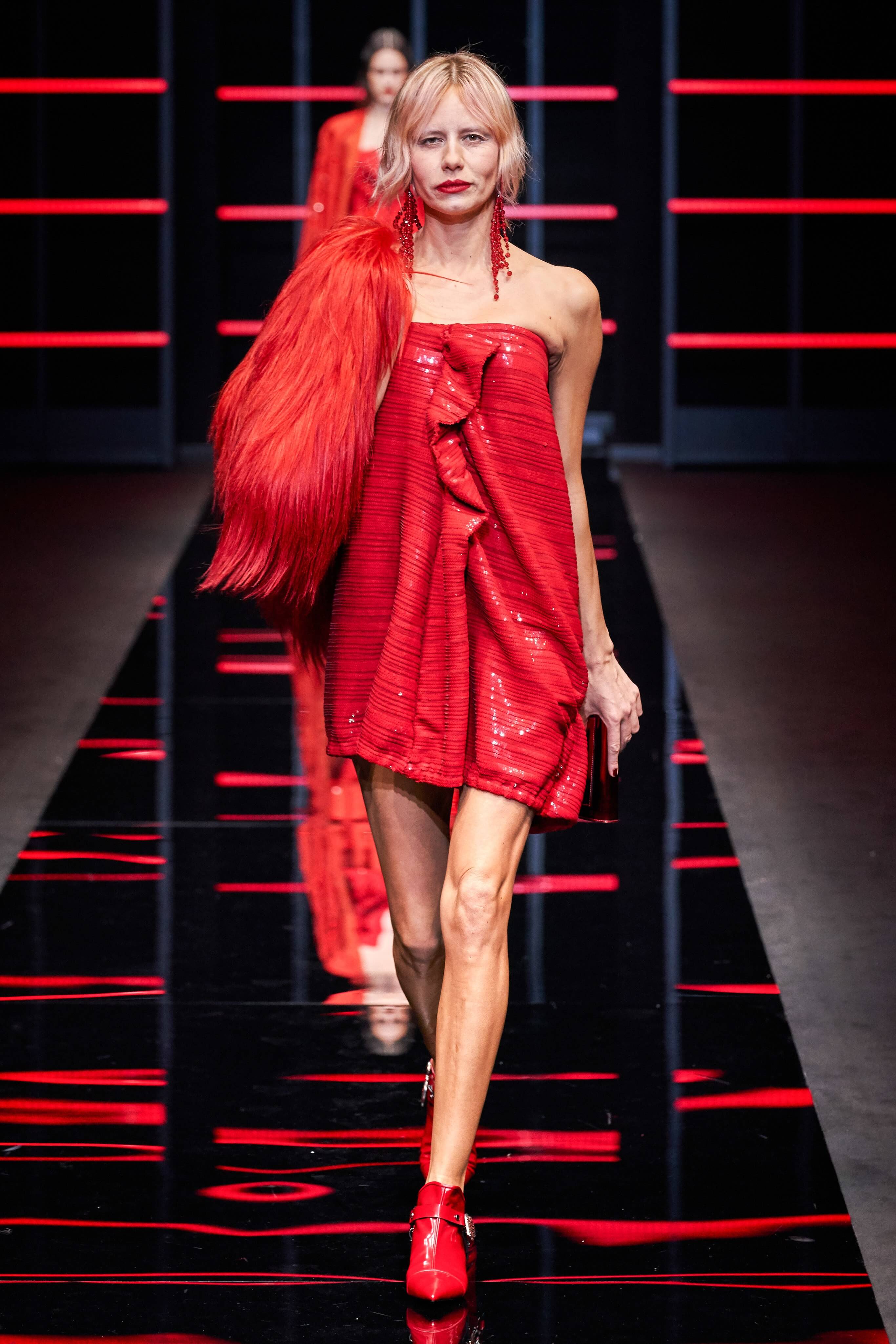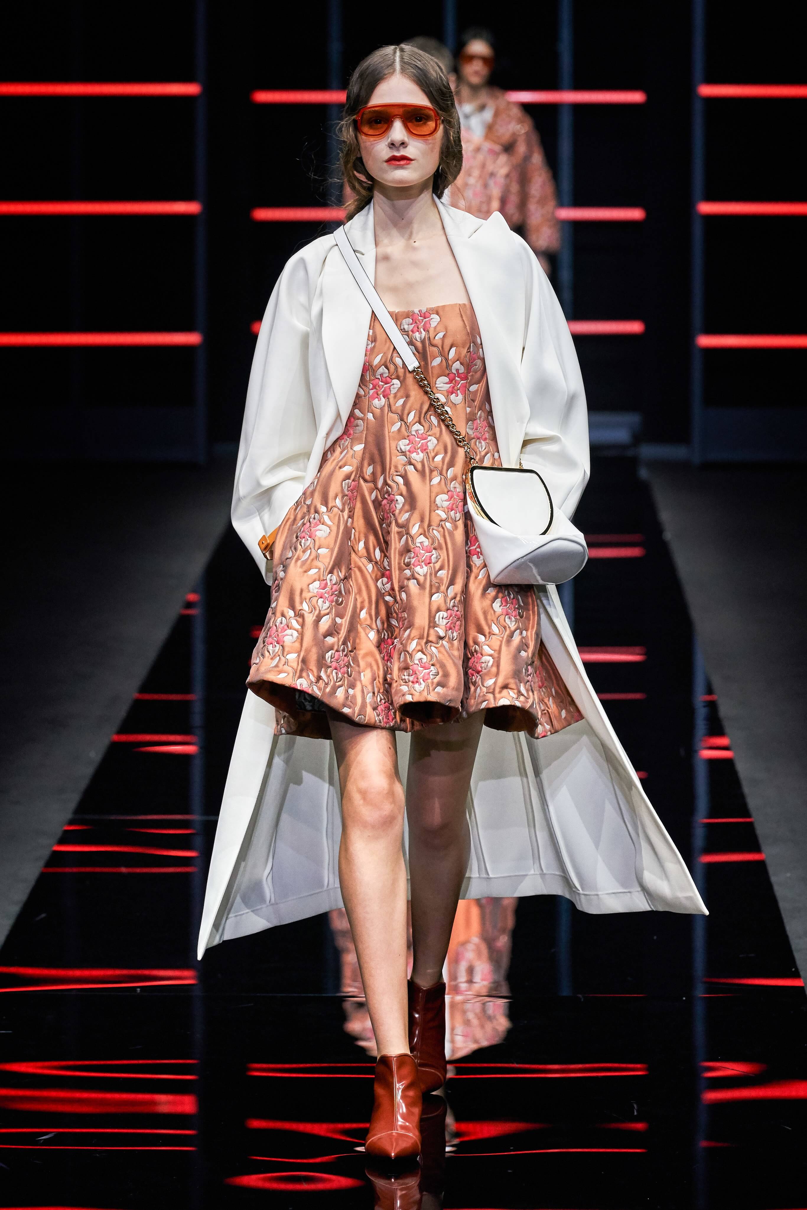 В коллекции винтажный шик легко уживается со свободными худи и харнесс-сумками, как в спортивной линии Emporio Armani 7, а струящиеся брюки, корсетные топы, люрекс и комплекты из жаккарда позаимствованы из кутюрной линии Armani Prive. Ультрасовременными образы коллекции делали чулки-ботфорты, микроскопические мессенджеры и минималистичные чокеры, как из фантастических фильмов.