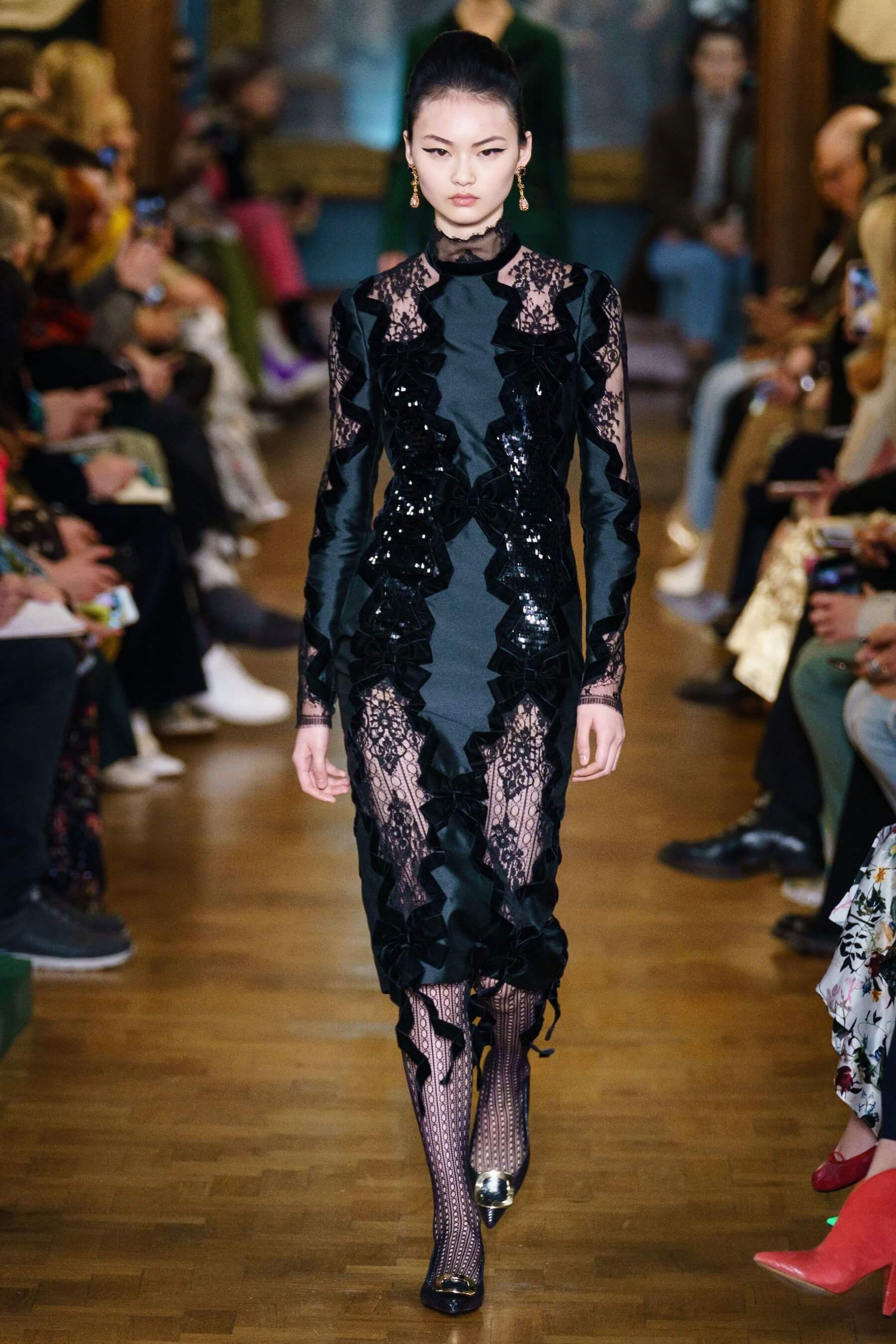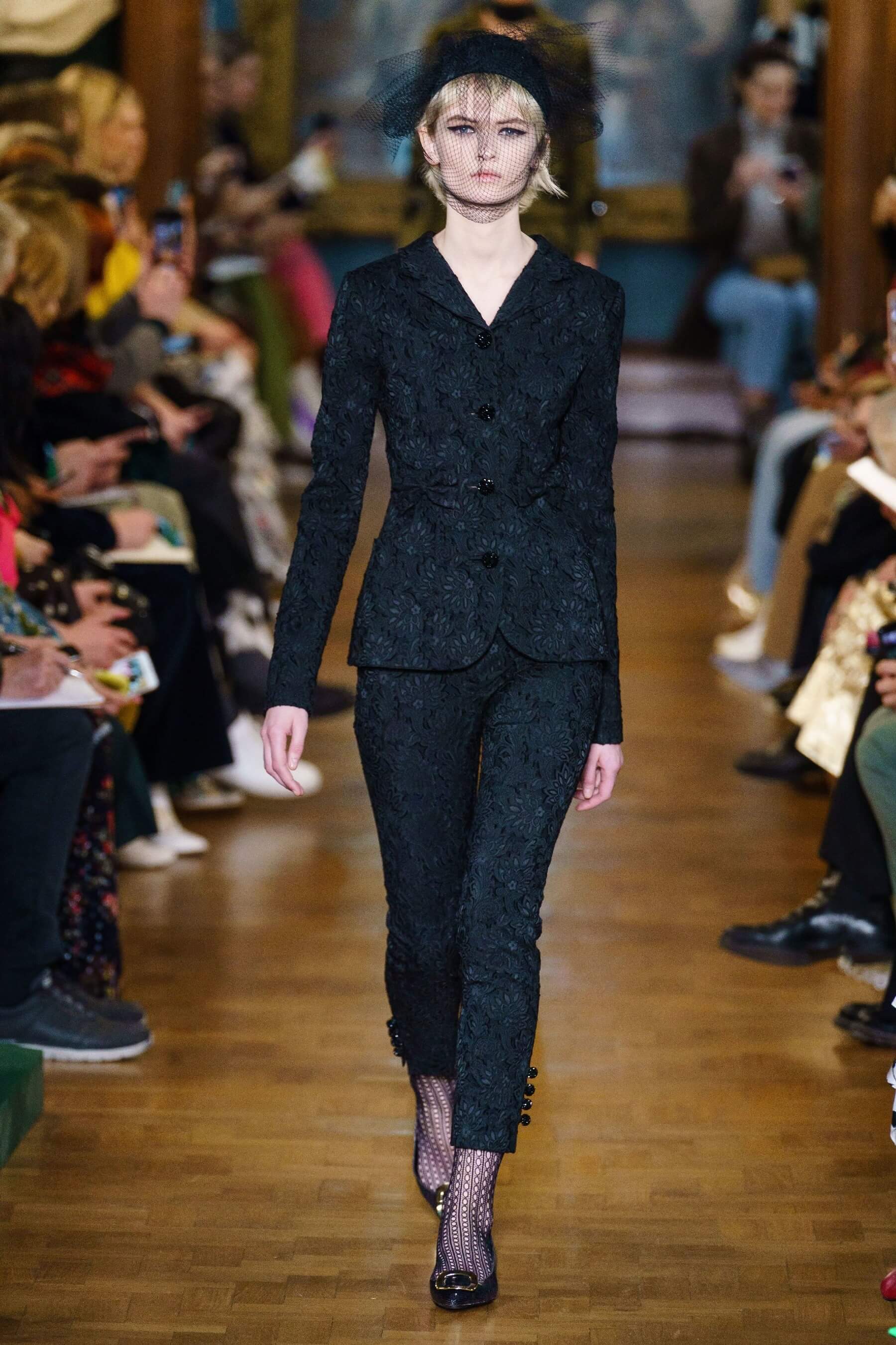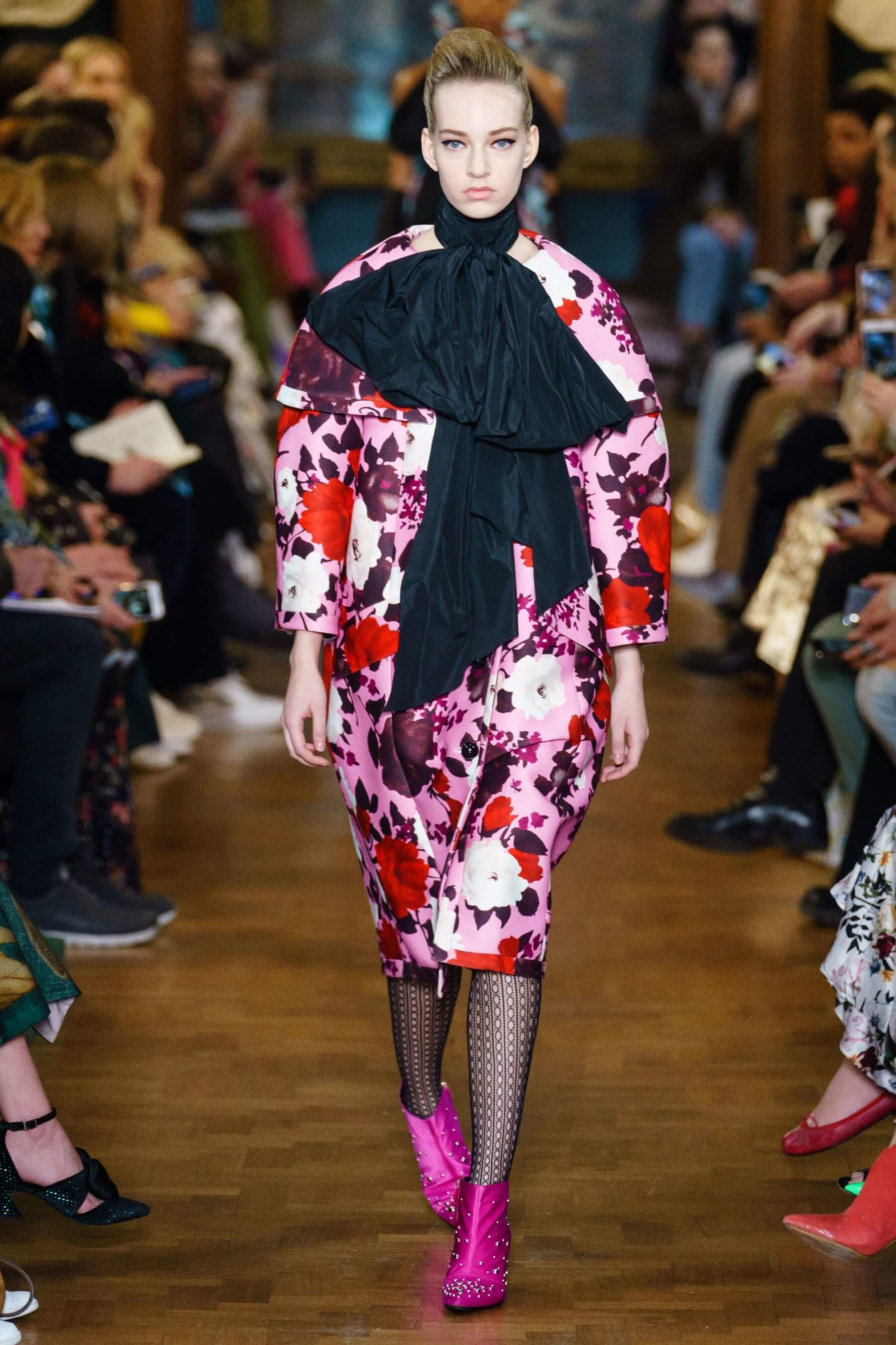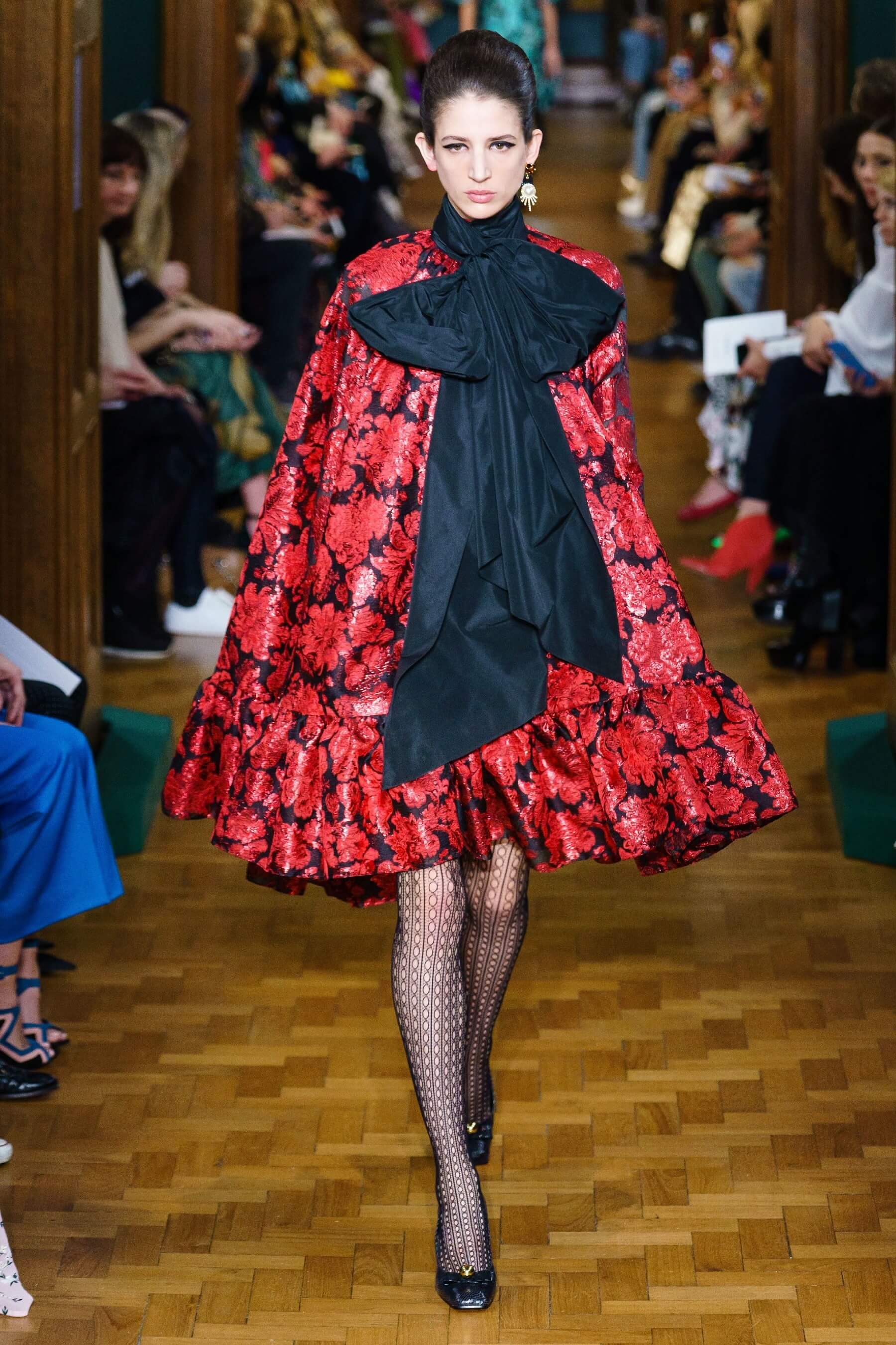 Дизайнер воплотил идею симбиоза английской эксцентрики и итальянской пышности в сложносочиненных нарядах: поверх платьев в крупную клетку были накинуты полупрозрачные тюли и повязаны огромные банты из тафты, силуэтные костюмы в духе фильмов Альфреда Хичкока заполнены барочными черно-красными узорами, чувственные платья из кружева соседствуют с юбками миди и трикотажными кардиганами. Неизменным остаётся флористический мотив в творениях дизайнера.