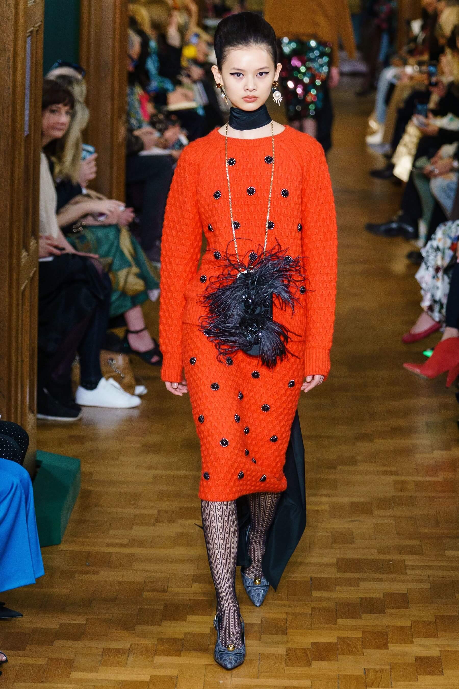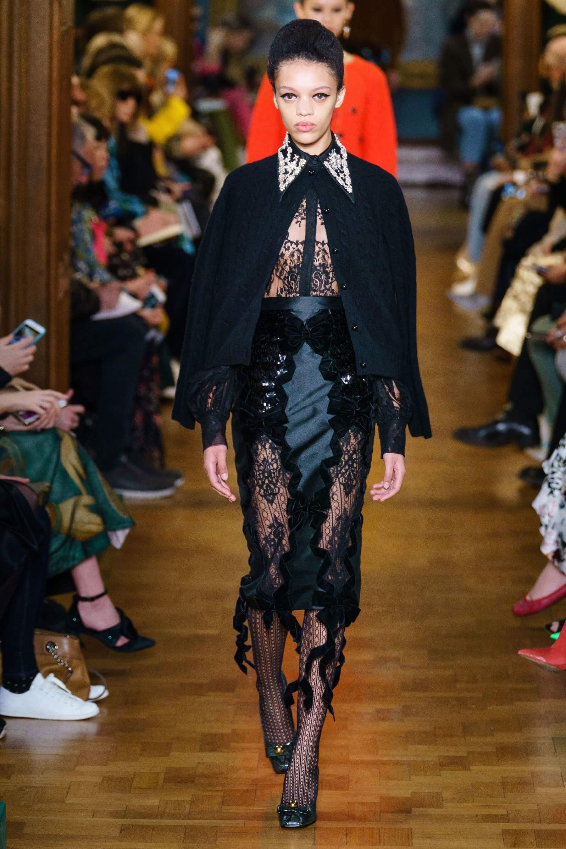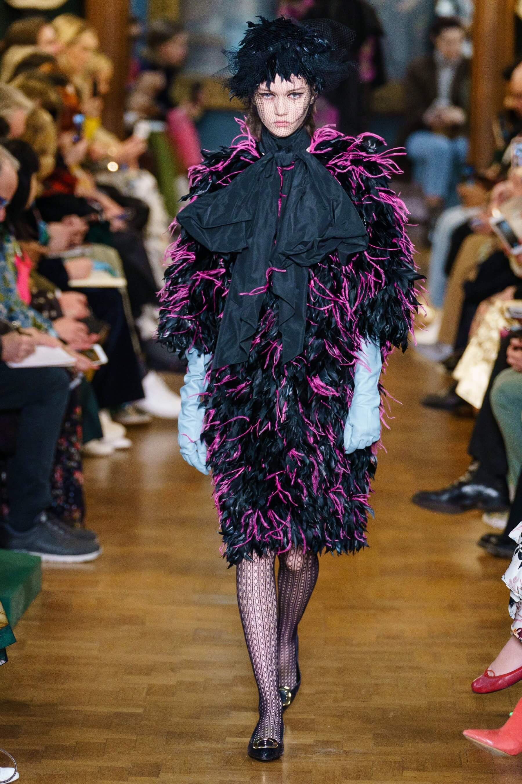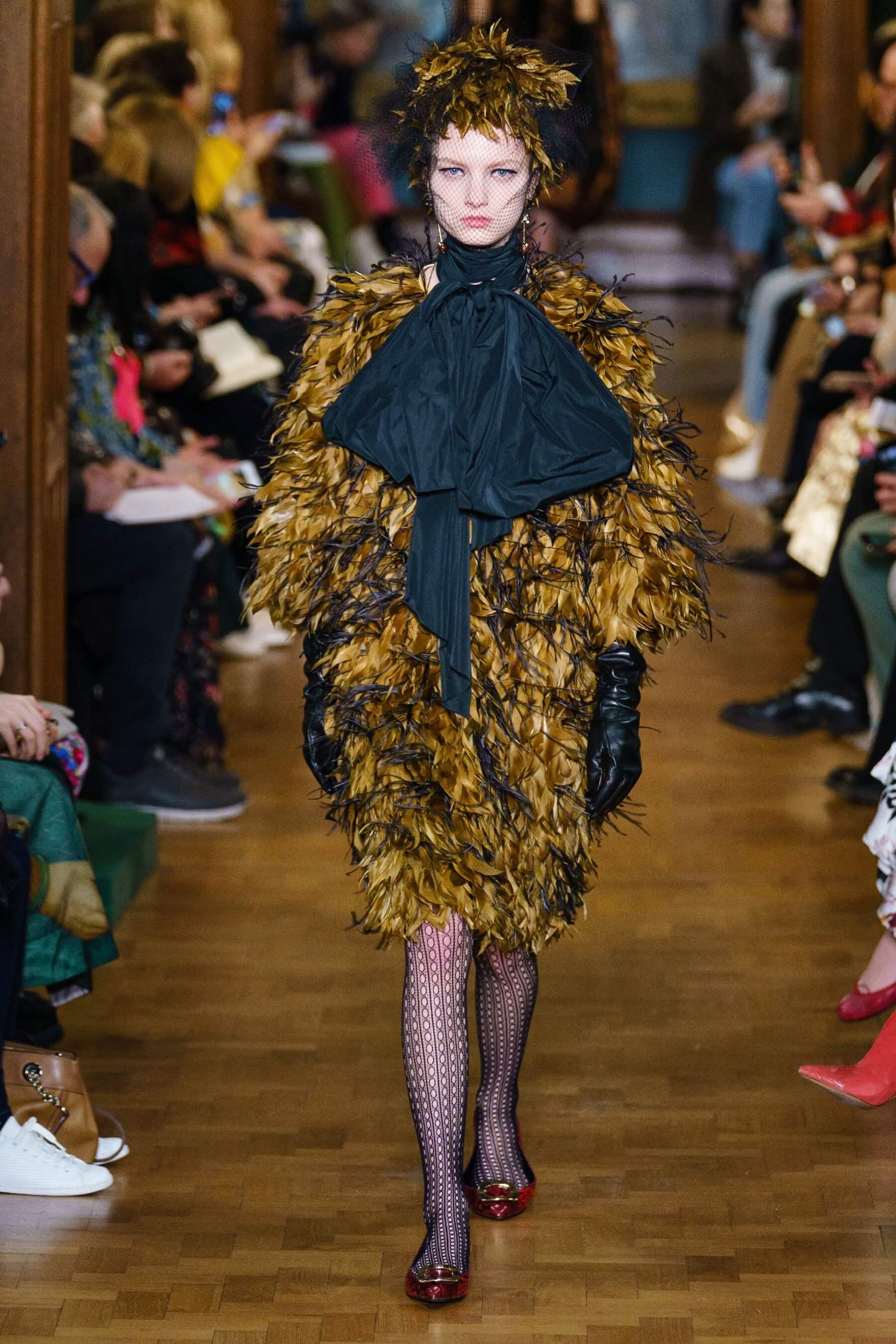 Дизайнер воплотил идею симбиоза английской эксцентрики и итальянской пышности в сложносочиненных нарядах: поверх платьев в крупную клетку были накинуты полупрозрачные тюли и повязаны огромные банты из тафты, силуэтные костюмы в духе фильмов Альфреда Хичкока заполнены барочными черно-красными узорами, чувственные платья из кружева соседствуют с юбками миди и трикотажными кардиганами. Неизменным остаётся флористический мотив в творениях дизайнера.