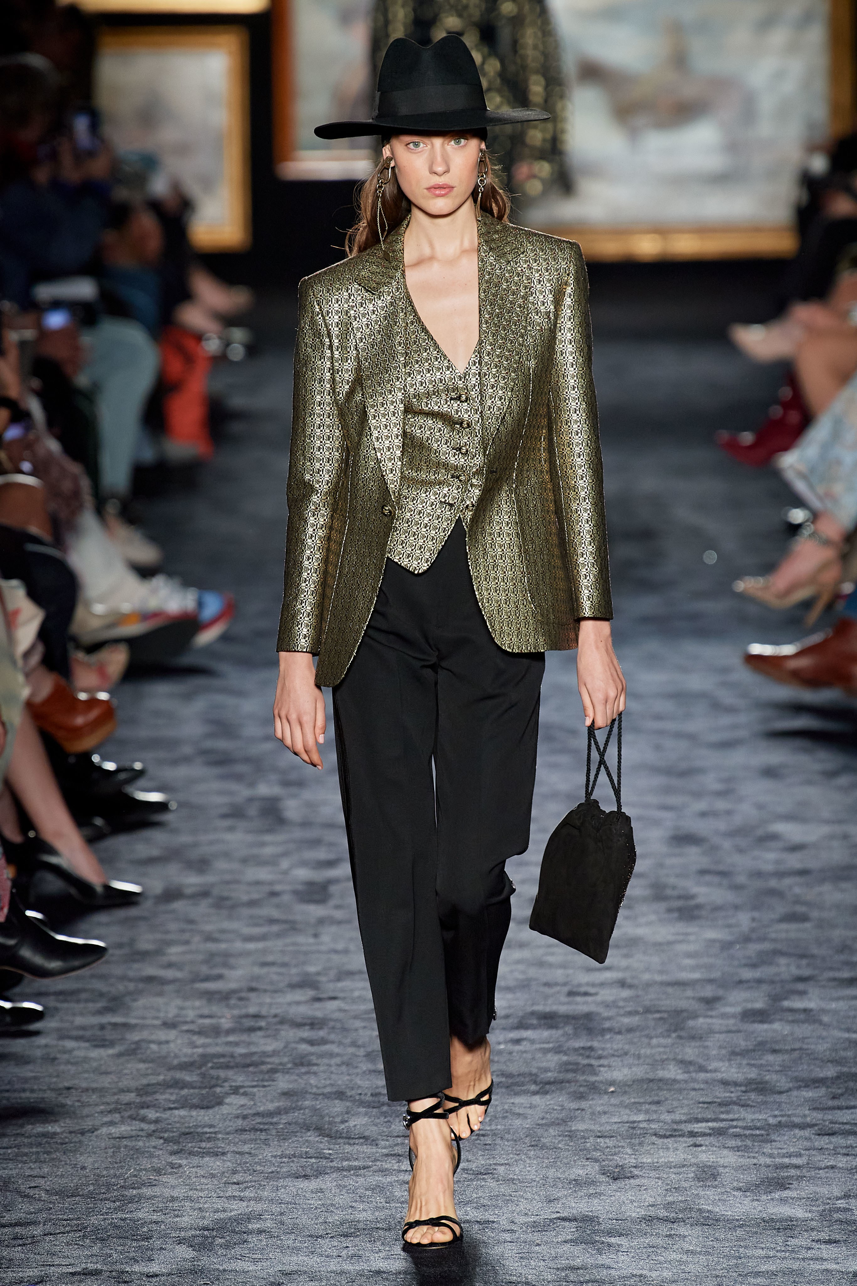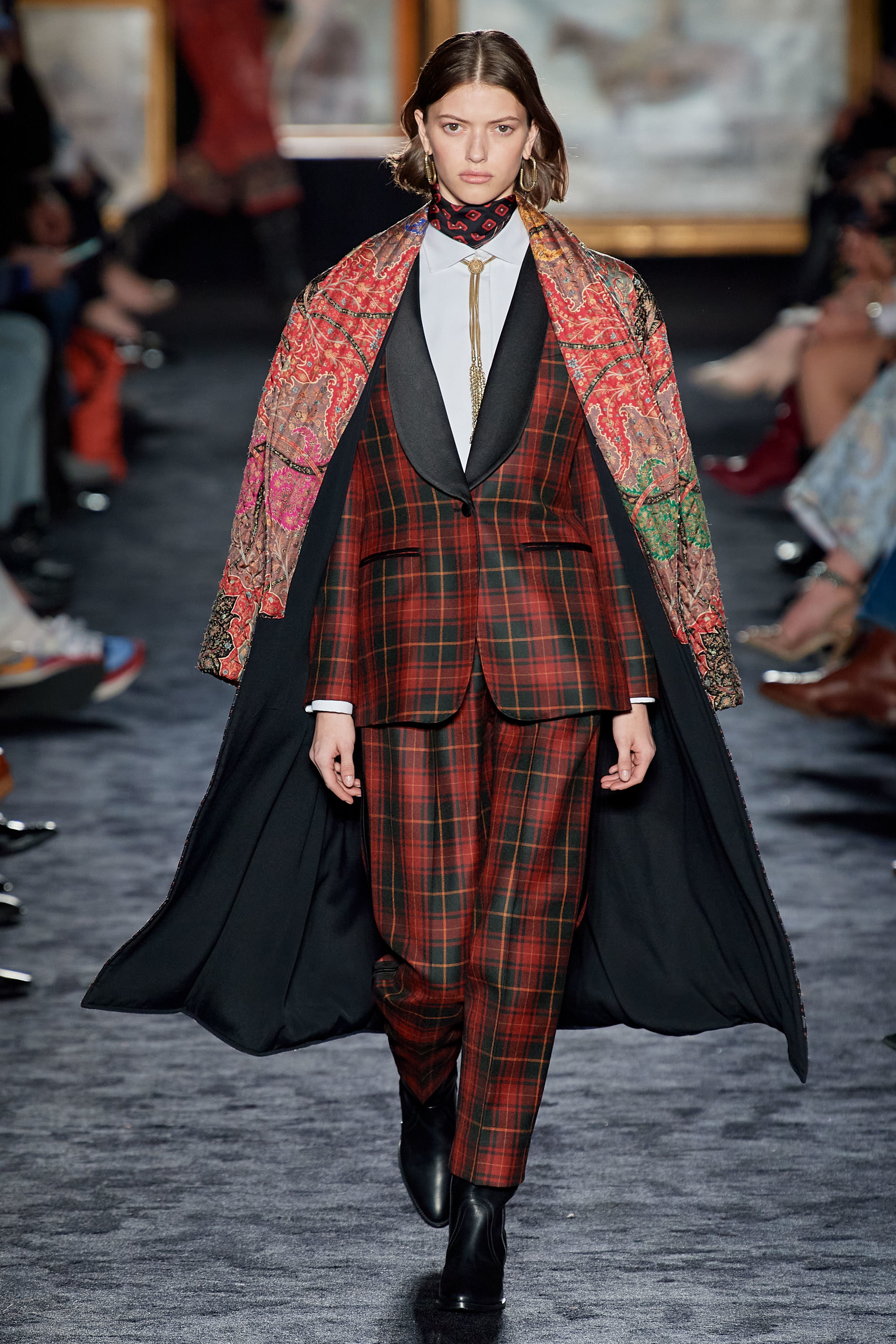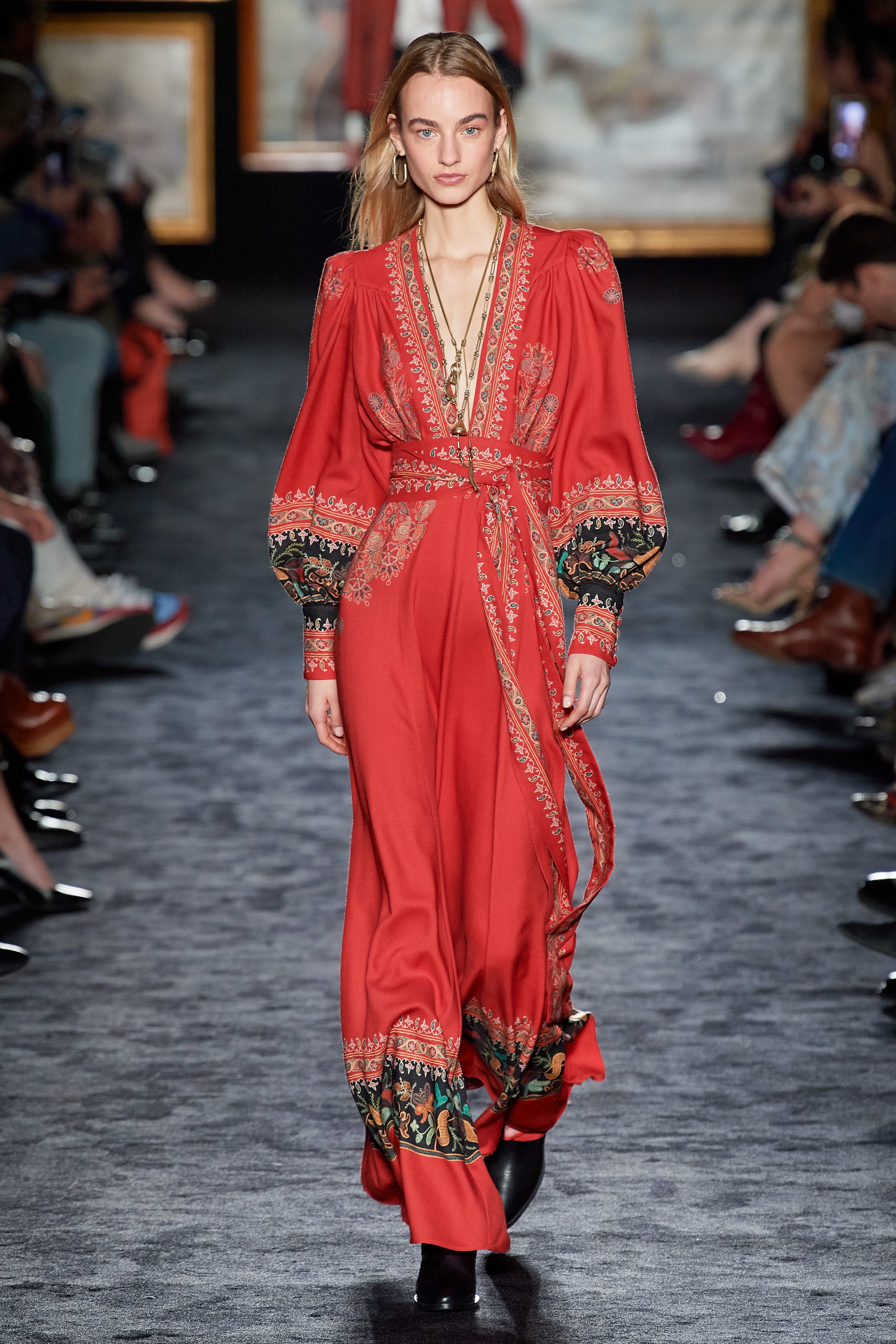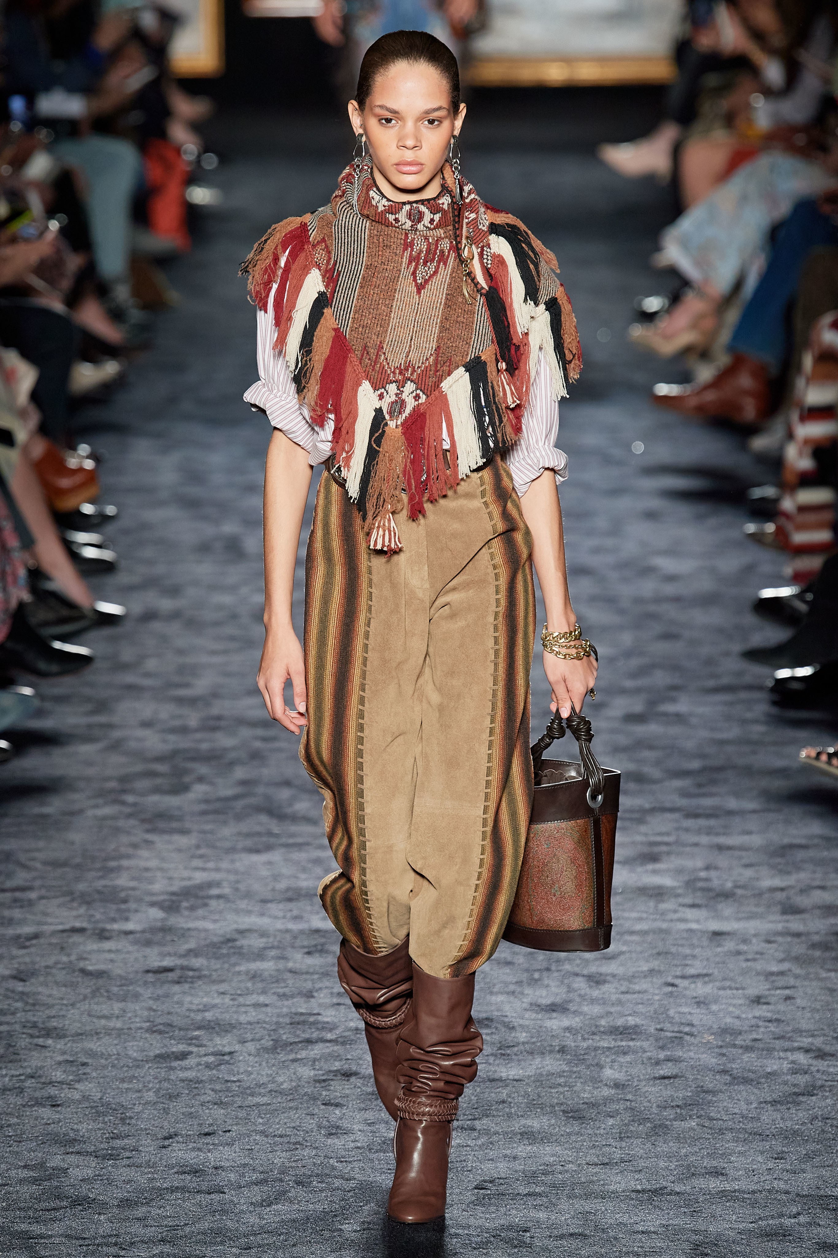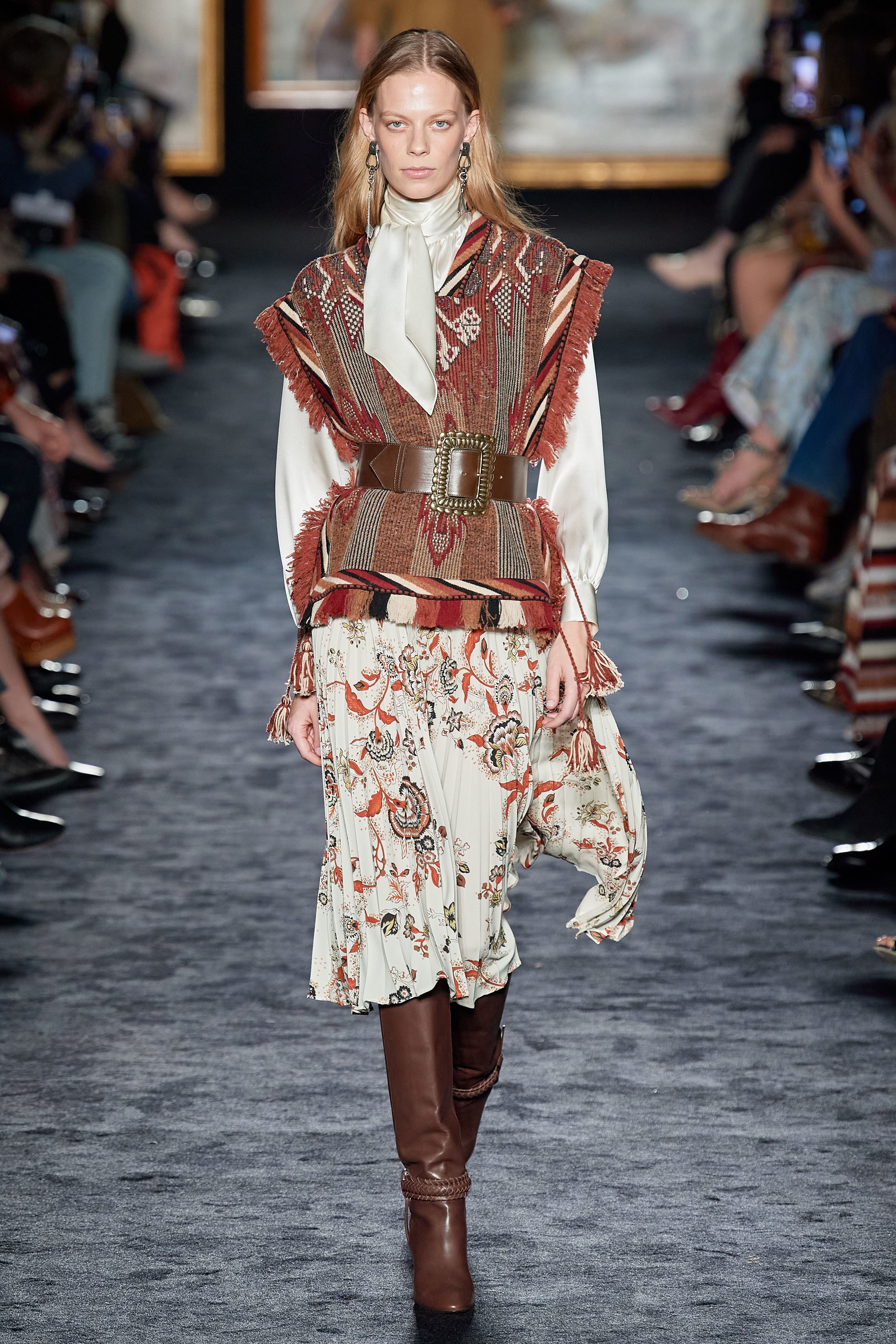 Креативный директор бренда Вероника Этро представила осеннюю коллекцию. Шоу прошло в консерватории Джузеппе Верди. Осень от Etro - это эффектные платья в мексиканском стиле с богатой вышивкой, уютные пончо и элегантные костюмы на манер жокейских. Нежные шёлковые блузы со стойками-бантами можно носить с вязаными жилетами, как показала дизайнер, а брючные костюмы в клетку вместе с нарядным плащом.