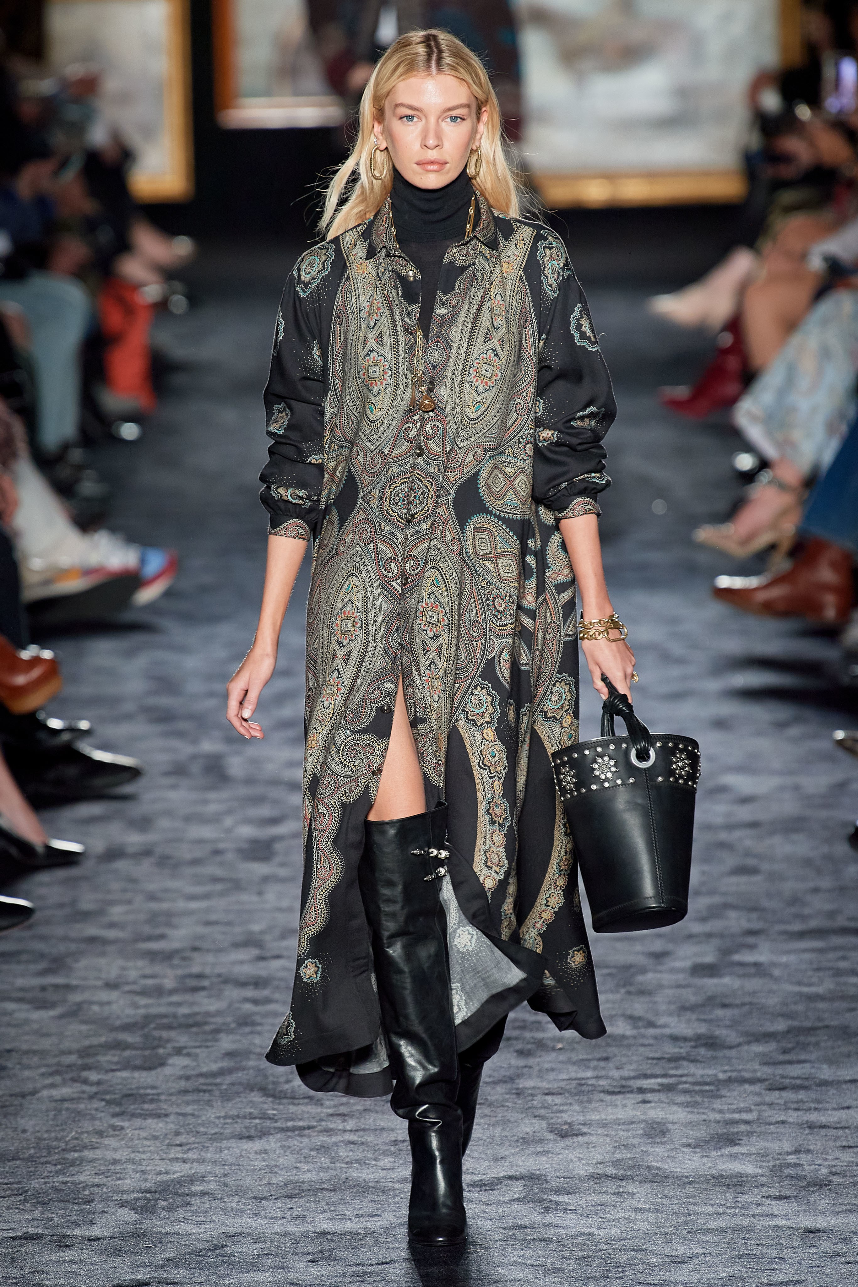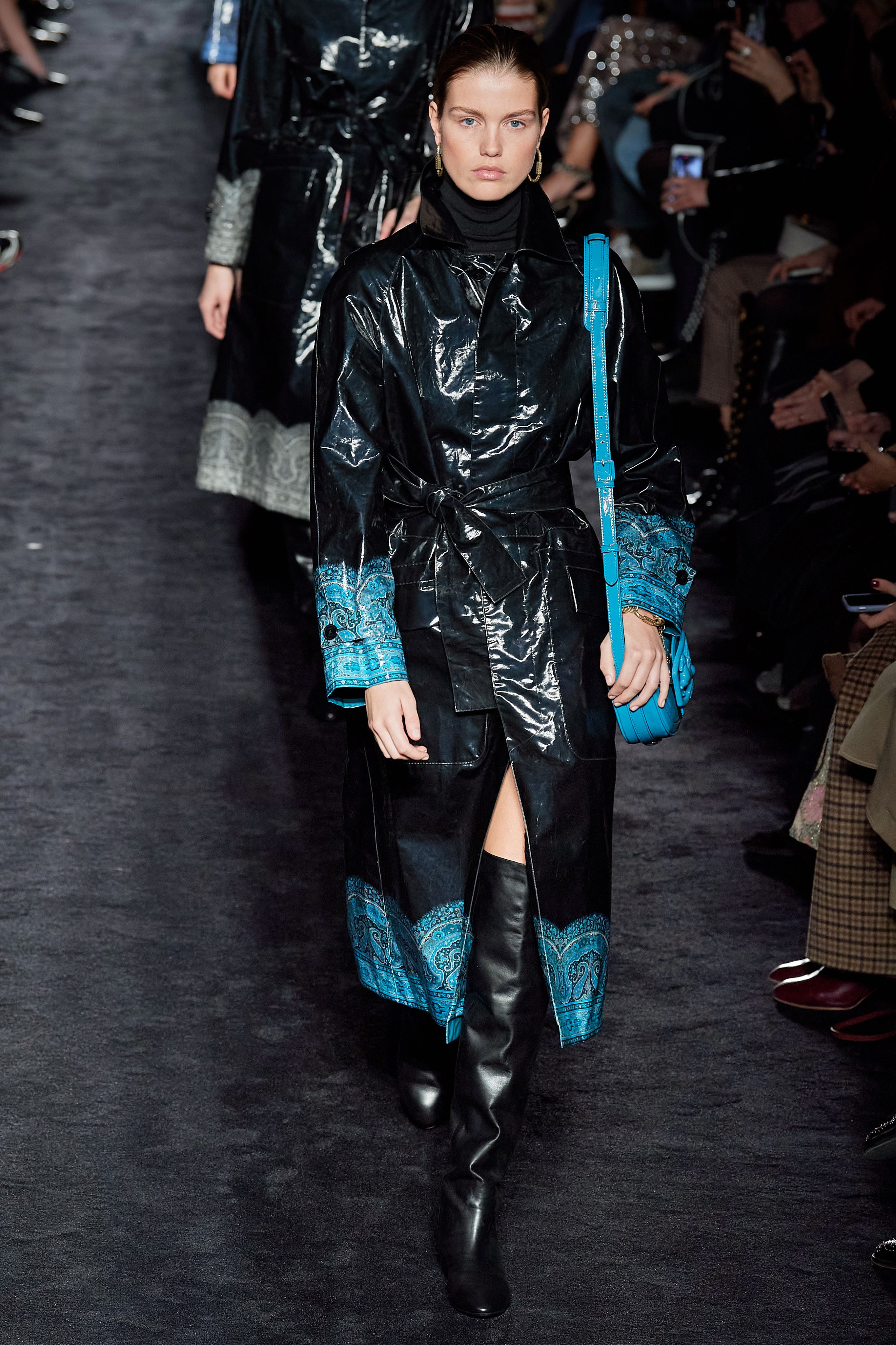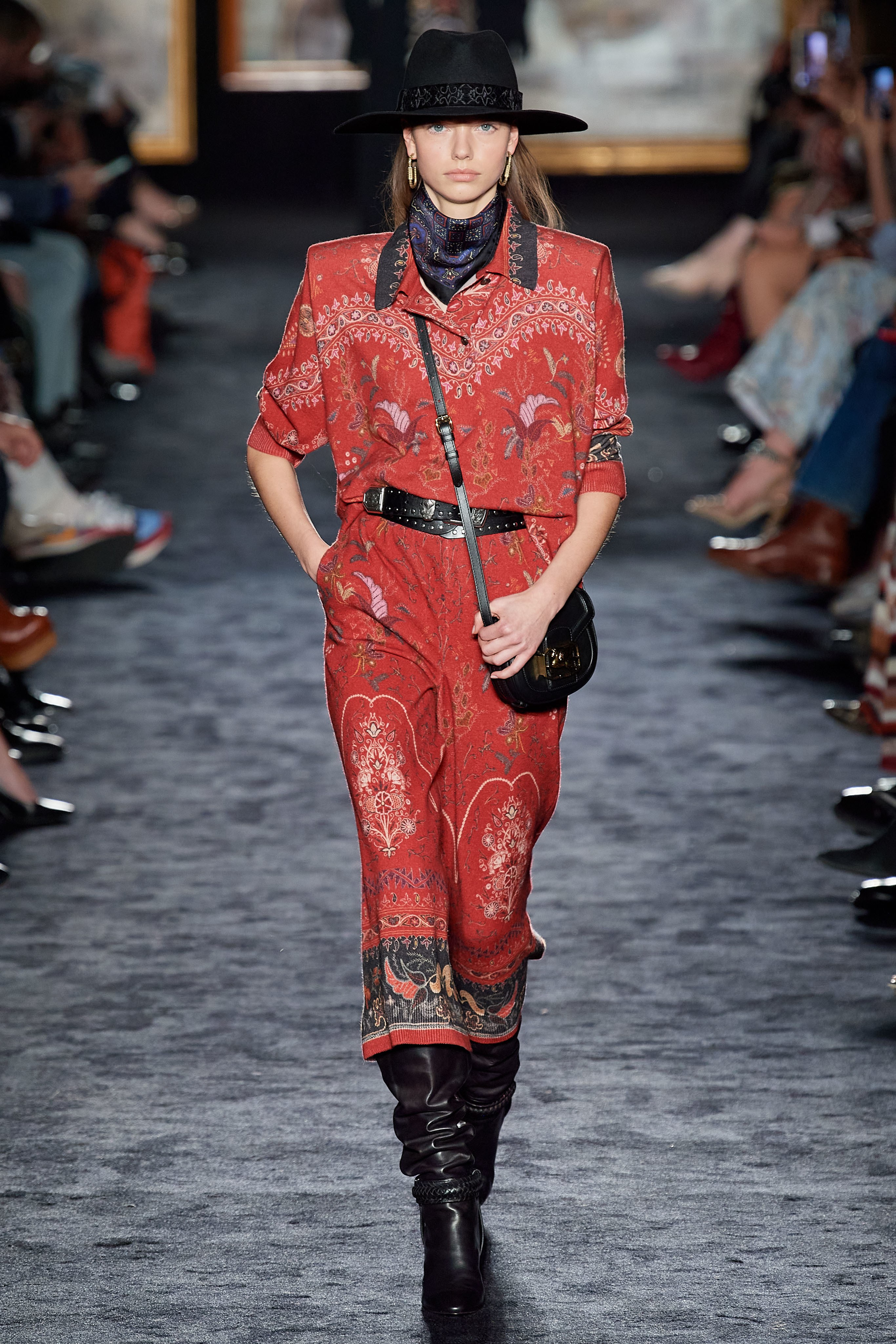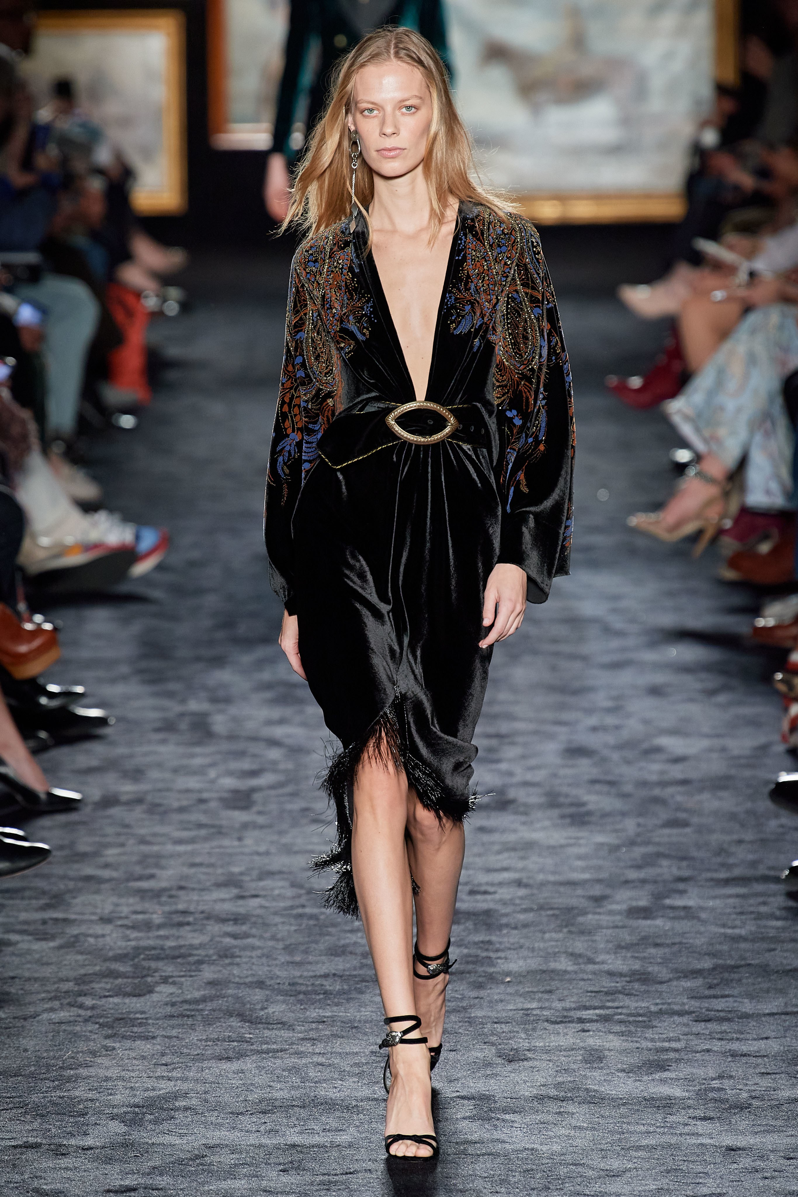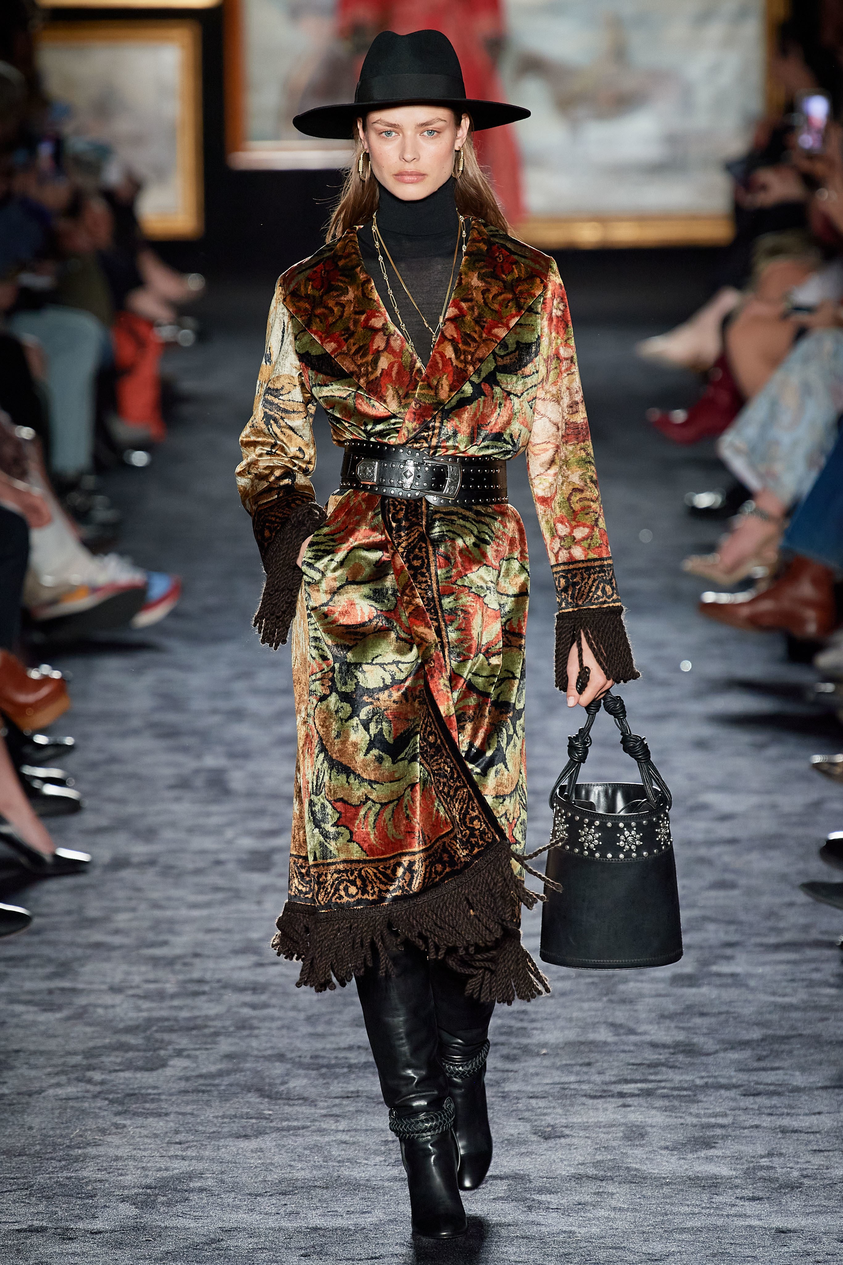 Креативный директор бренда Вероника Этро представила осеннюю коллекцию. Шоу прошло в консерватории Джузеппе Верди. Осень от Etro - это эффектные платья в мексиканском стиле с богатой вышивкой, уютные пончо и элегантные костюмы на манер жокейских. Нежные шёлковые блузы со стойками-бантами можно носить с вязаными жилетами, как показала дизайнер, а брючные костюмы в клетку вместе с нарядным плащом.